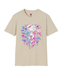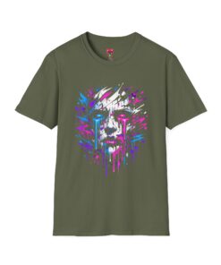 A bold, wearable statement: this lightweight crew tee features a neon-splashed portrait that looks like street-art come alive. Vivid cyan, magenta and purple drips form a haunting face that catches light and attention, printed cleanly on a smooth black canvas. The shirt feels soft against skin and stays comfortable all day thanks to ring-spun cotton and a classic fit. Wear it to show mood, attitude, and a love for urban art — layered under a jacket or on its own for nights out, gallery visits, or late-night walks where color feels electric.