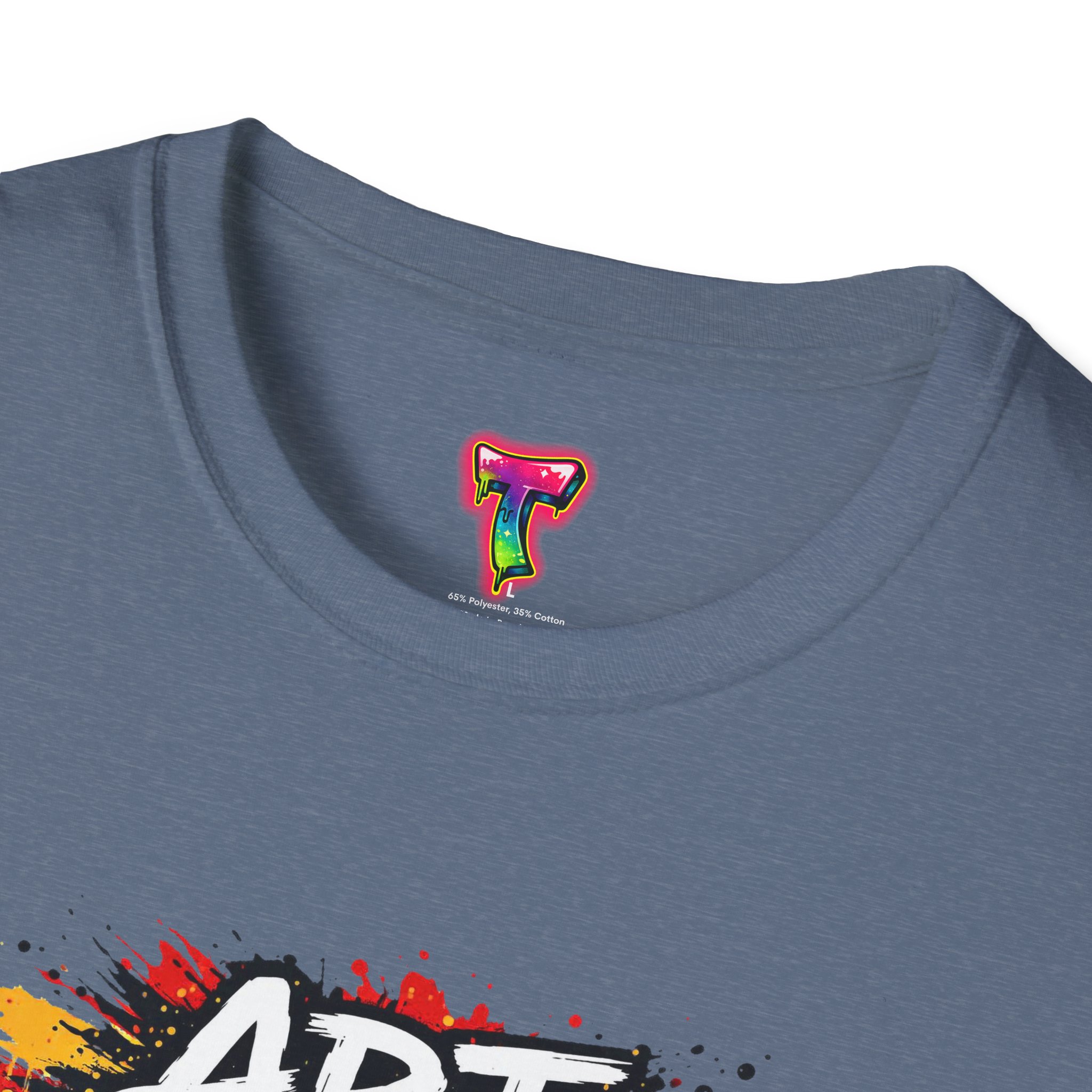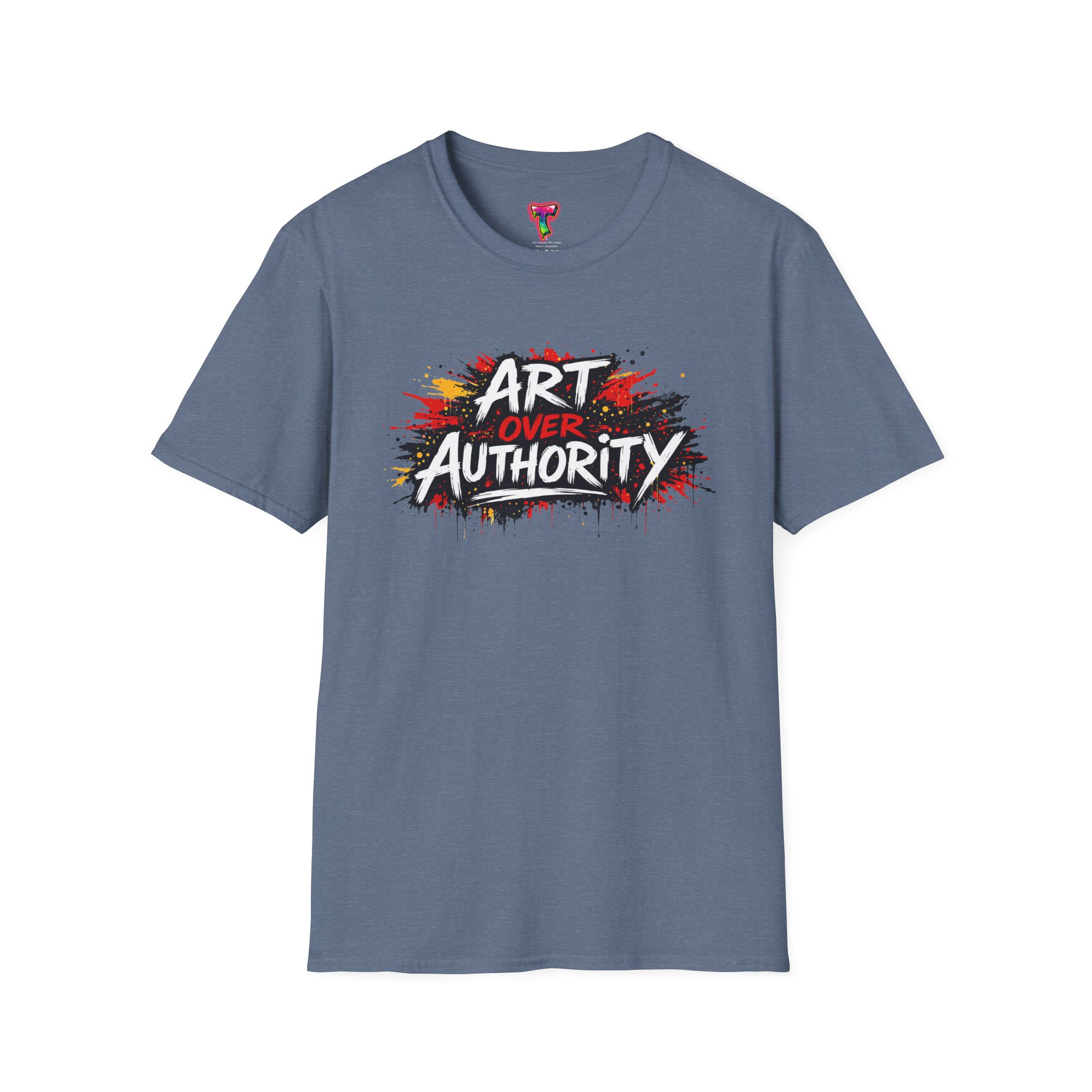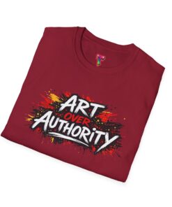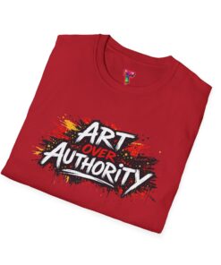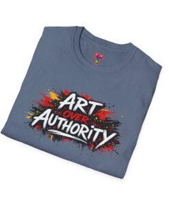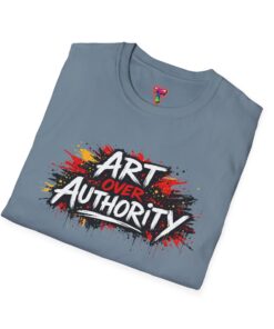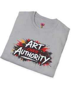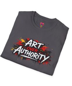 This lightweight crew neck tee carries a bold, streetwise statement — a splash of graffiti-style paint and the words “Art Over Authority” that read like a manifesto. Soft ring-spun cotton drapes easily over the shoulders and keeps the print crisp so the message stays front-and-center. Wear it to shows, protests, studio nights, or wandering the city; it’s built to move with you and age into a lived-in favorite. The stretchy ribbed collar and shoulder tape keep the fit neat after repeat wears, while the tear-away label makes it comfortable for all-day wear. If you live for creative risk and quiet rebellion, this tee speaks your language without saying too much.