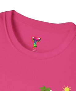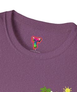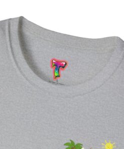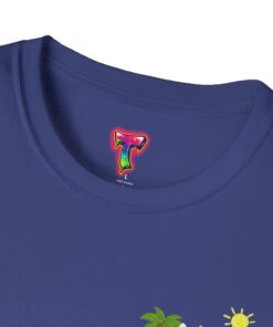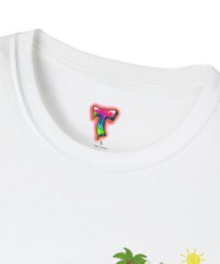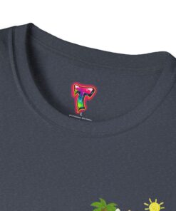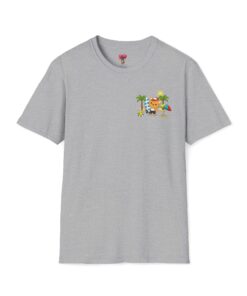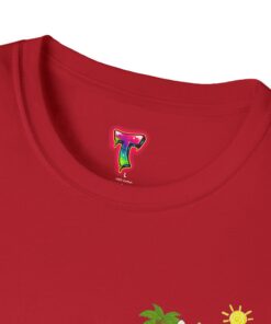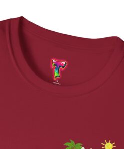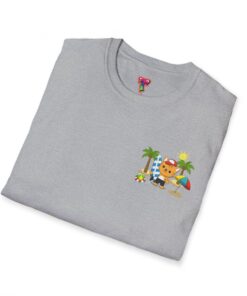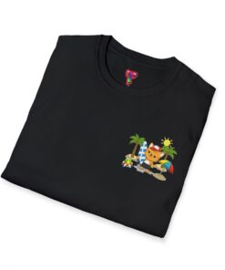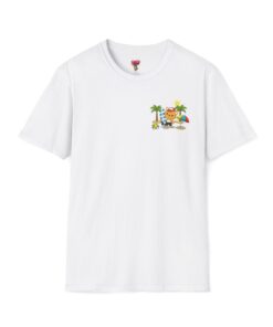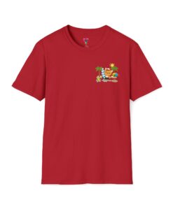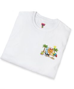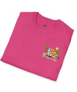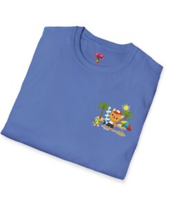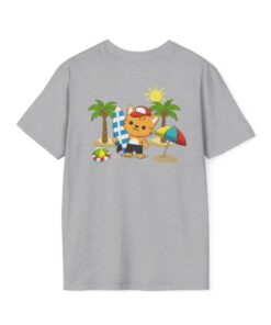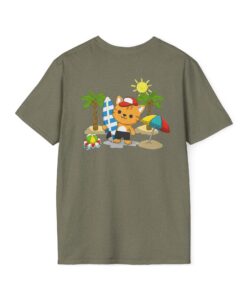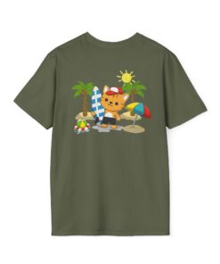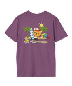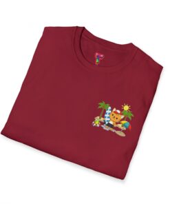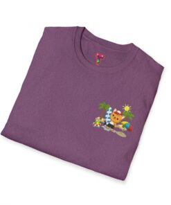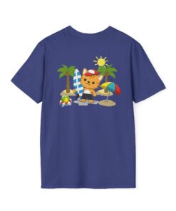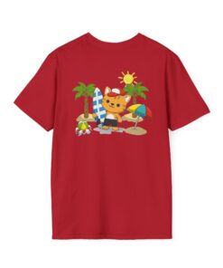 This lightweight crew-neck tee brings warm, playful beach vibes to everyday wear. A small chest print and a larger back illustration feature a sunny, cartoon-style tiger lounging with a surfboard, palm trees, umbrella and colorful beach accessories—bright, cheerful details that pop against the shirt’s rich base color. The soft, ring-spun cotton feels gentle on skin while the tubular knit and ribbed collar hold shape wash after wash. Wear it on laid-back summer days, casual surf trips, or whenever you want to carry a bit of sunshine with you.