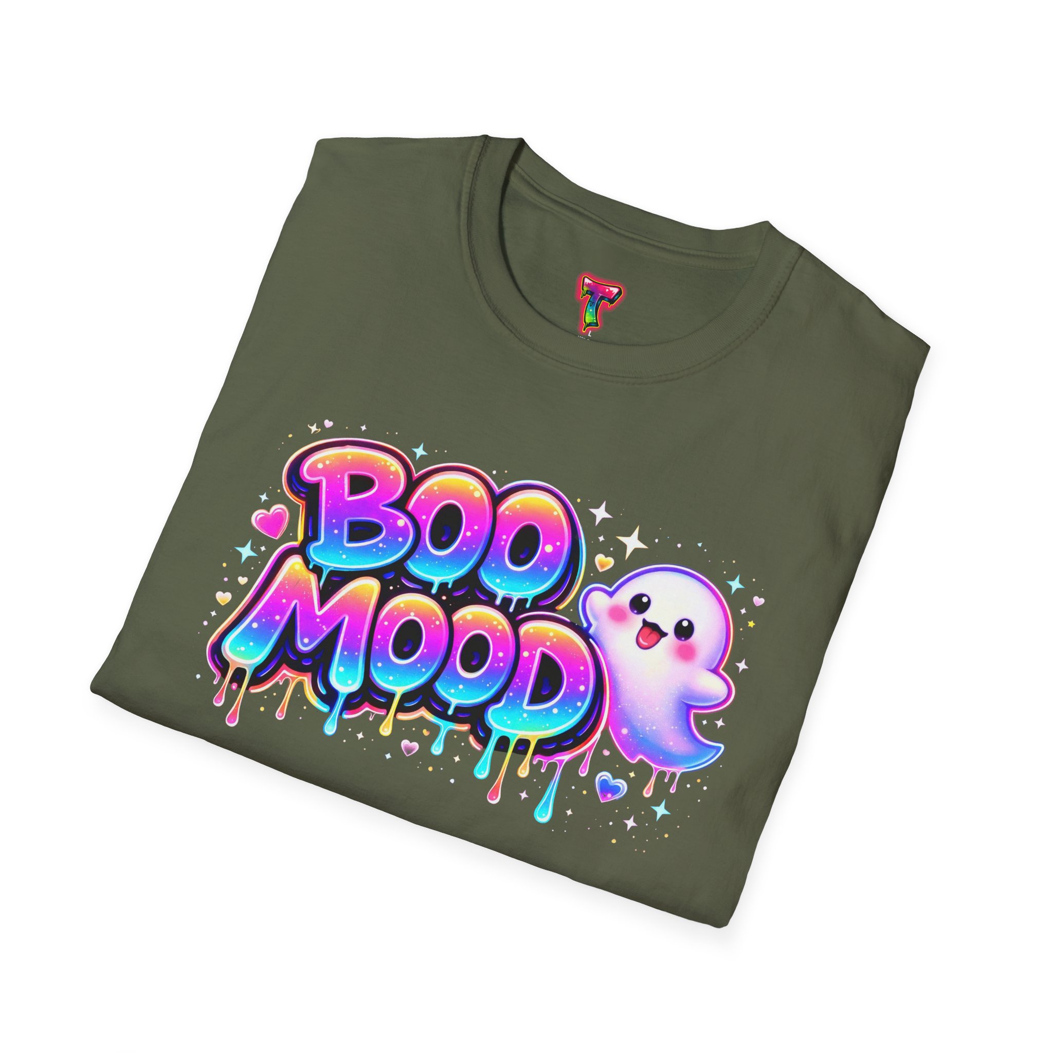 Bright, playful, and a little spooky — this lightweight cotton tee puts a colorful twist on Halloween vibes. A bubbly “Boo Mood” graffiti-style print pops across the chest in neon gradients with cheerful drips and a smiling ghost, bringing whimsy without heaviness. Wear it on crisp fall nights, at casual Halloween hangouts, or whenever you want to lean into a fun, slightly mischievous mood. The classic crew silhouette keeps the look clean while the soft ring-spun cotton feels gentle on the skin, so the design becomes part of your everyday rotation rather than a one-night outfit. This shirt speaks to those who love cute, street-art energy and seasonal flair — easy to layer under a jacket or pair with jeans for low-effort charm.