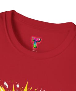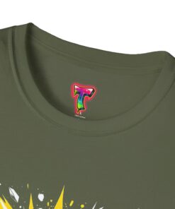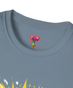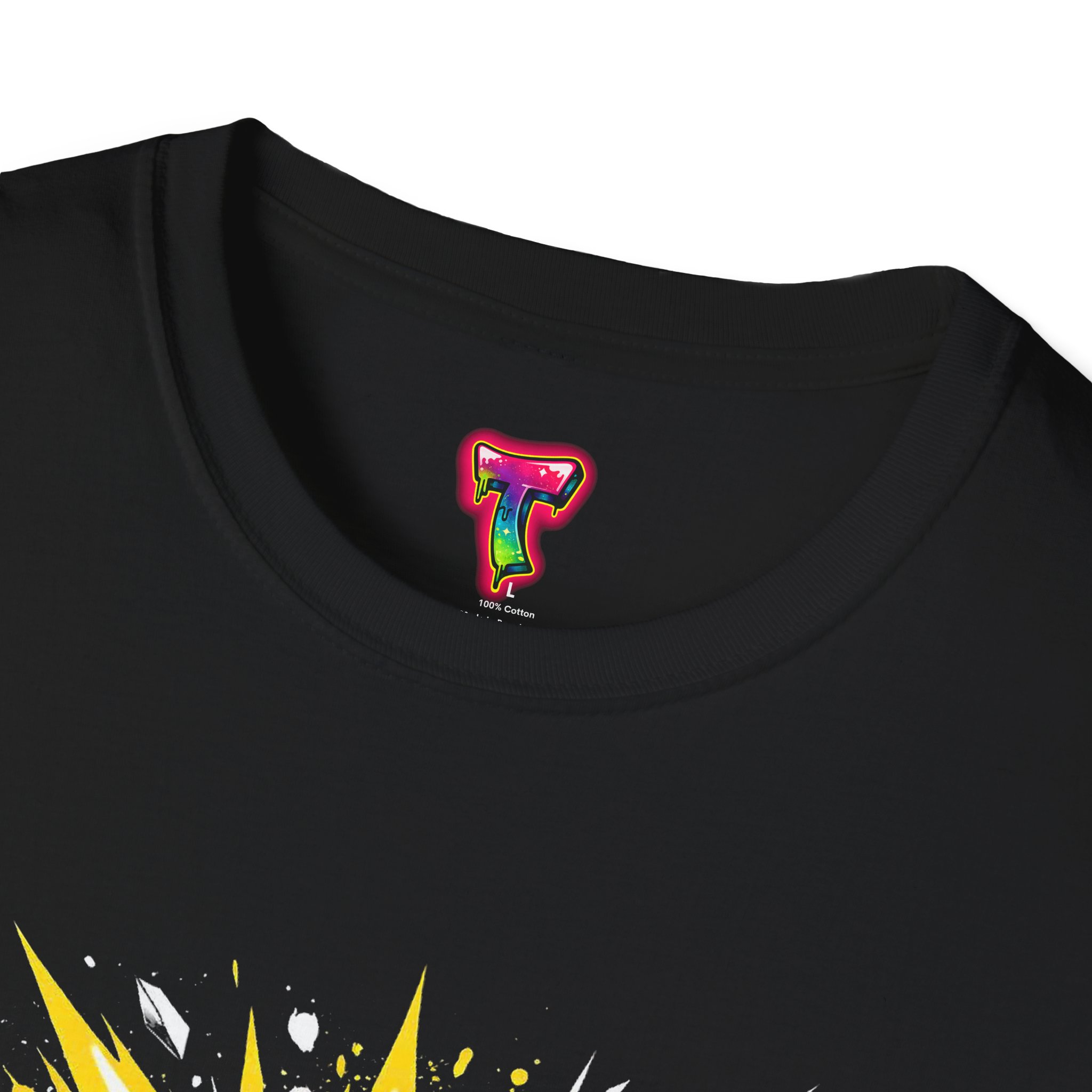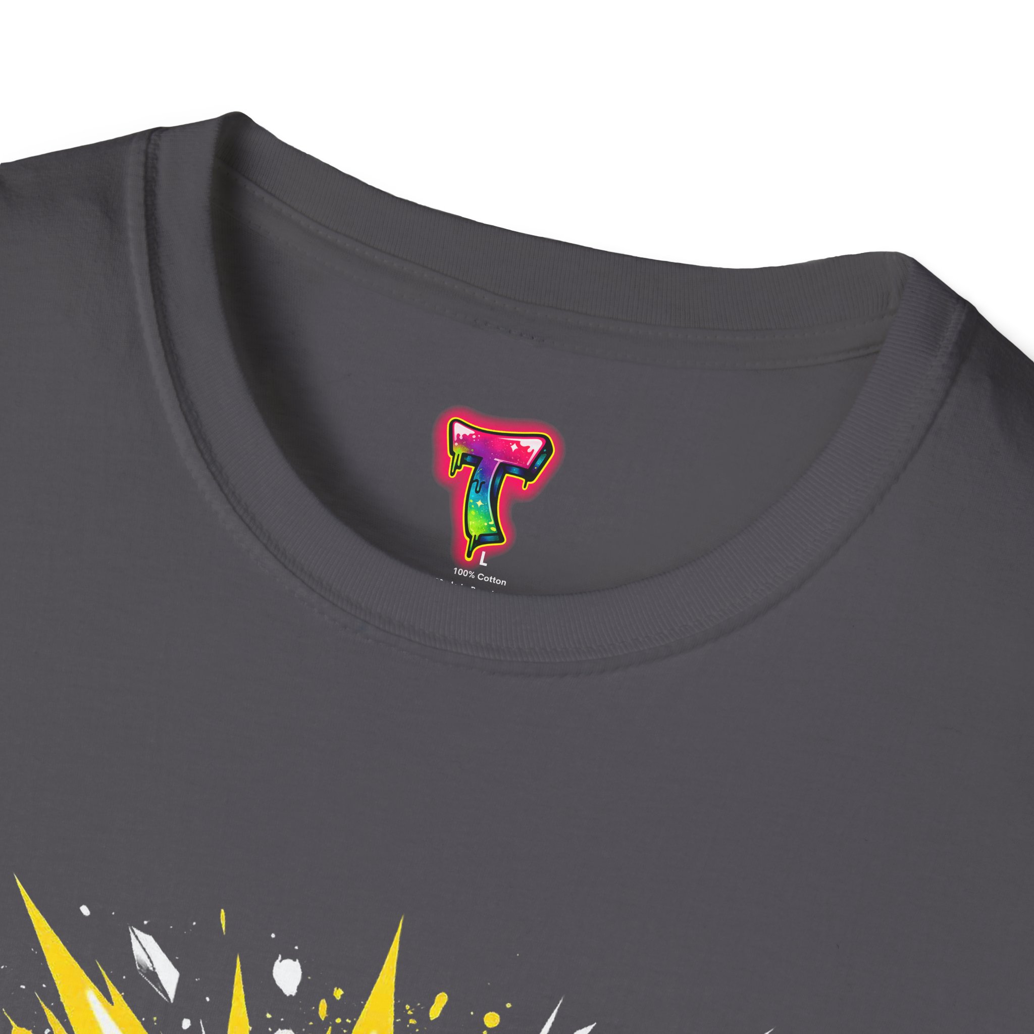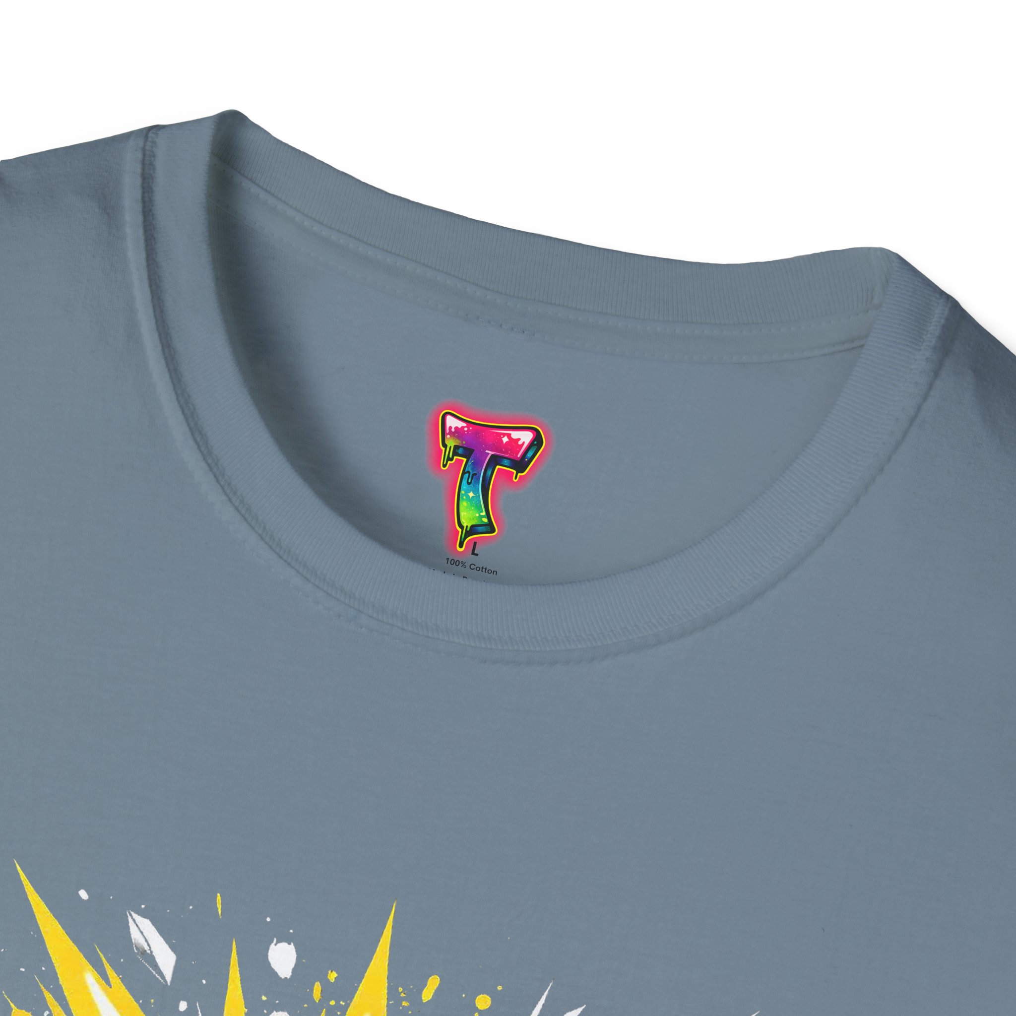 This lightweight cotton tee carries attitude in every stitch. Bold, comic-book style lettering explodes across the chest in high-contrast yellow and white, announcing confidence without saying a word. The crew neckline and classic fit keep the silhouette clean and wearable — a go-to top for days when you want to stand out but stay comfortable. Wear it under a jacket for an edge at a gig, pair it with jeans for a weekend of meetups, or throw it on after a workout to keep the energy up. The soft, ring-spun cotton feels lived-in from the first wear, while neat construction details — like shoulder tape and a ribbed collar — keep the shirt looking sharp wash after wash.
