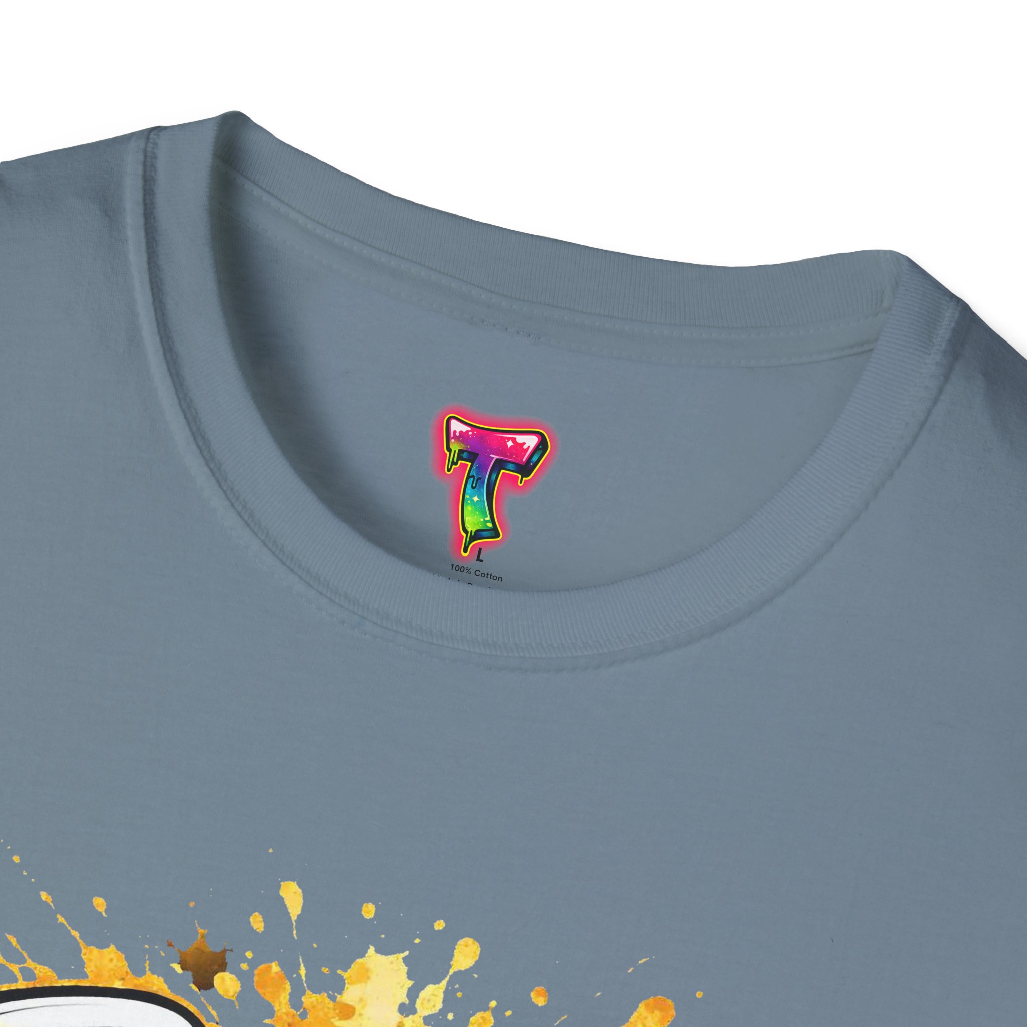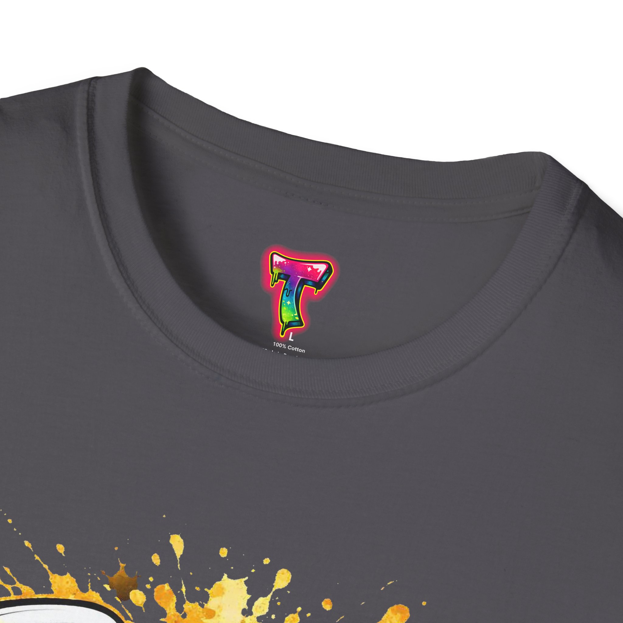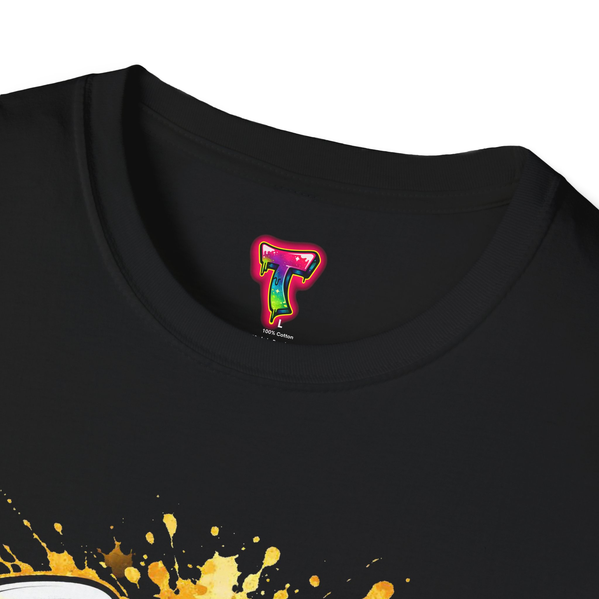 – DTG/DTF printed artwork with bold, multi-tone detail and paint-splatter effects