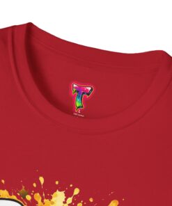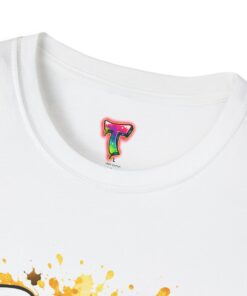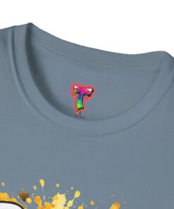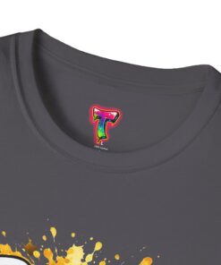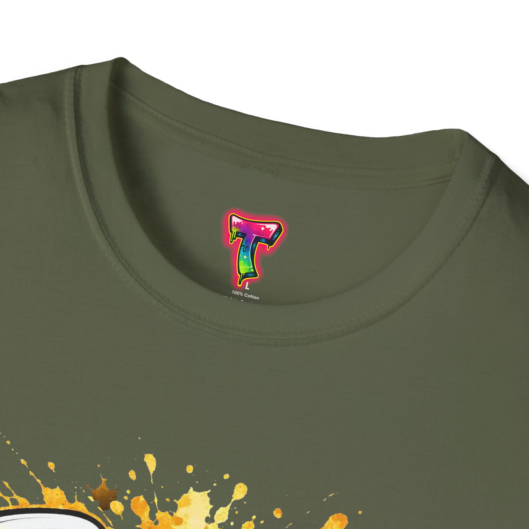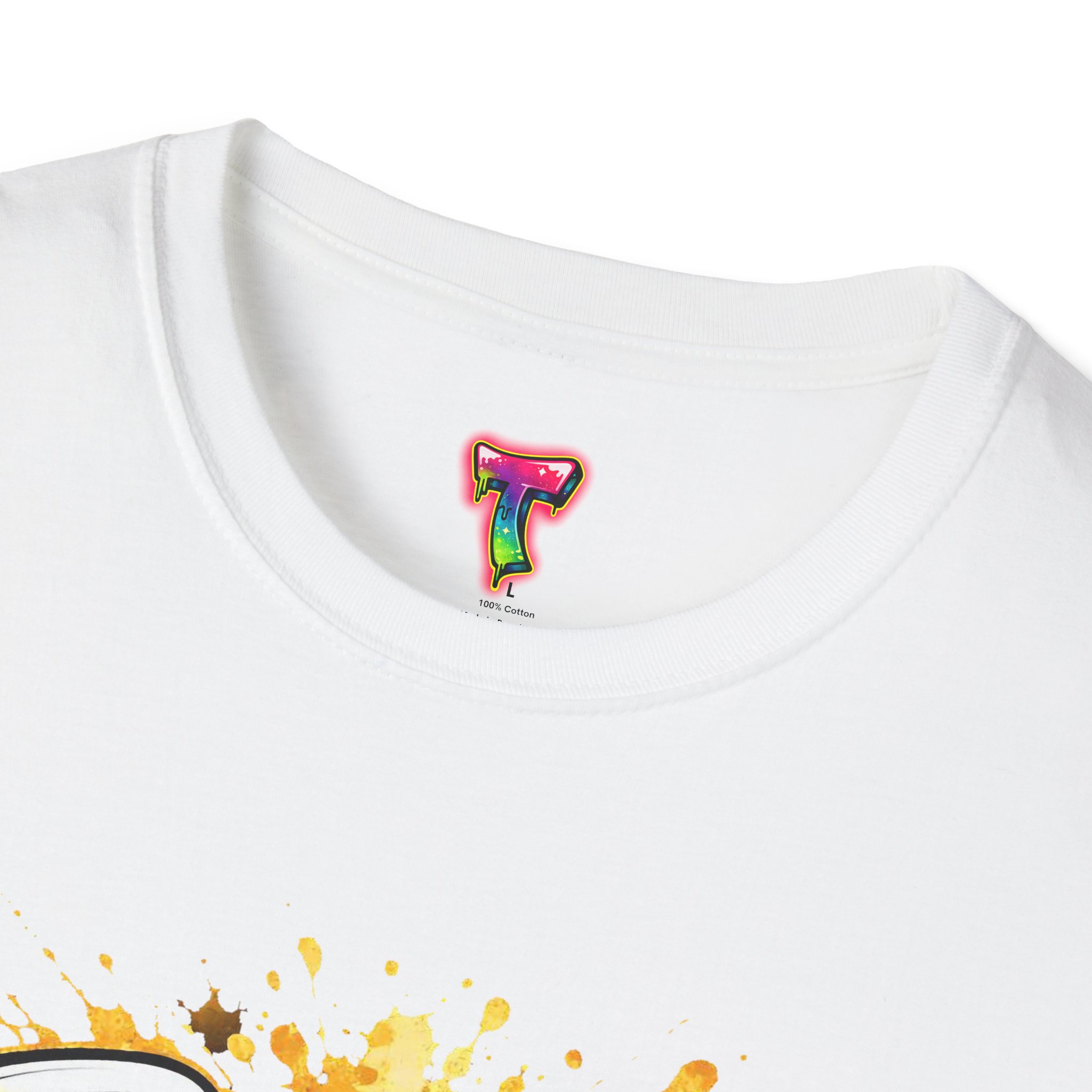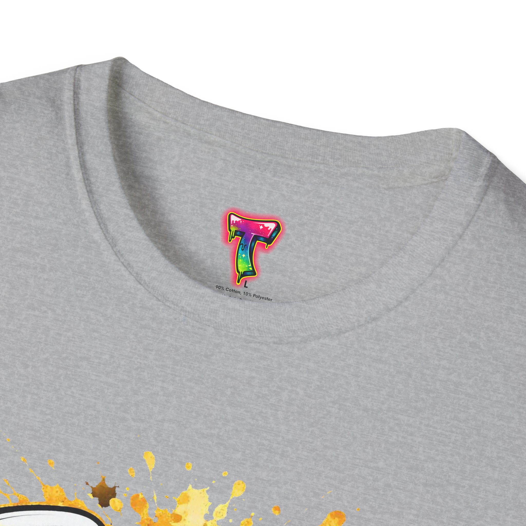 – DTG/DTF printed artwork with bold, multi-tone detail and paint-splatter effects
