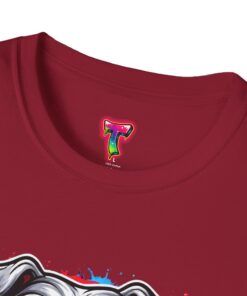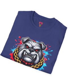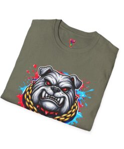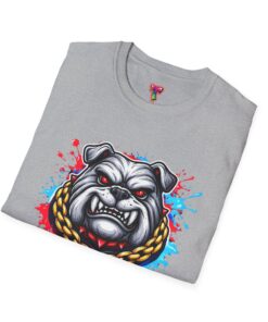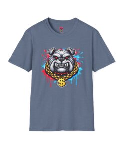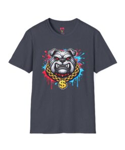 This heavyweight-feel tee brings street attitude and bold color into everyday wear. A snarling bulldog illustration sits center chest, ringed by a thick gold chain and dollar-sign pendant, with paint-splash accents that pop against the clean background. The shirt drapes easily and holds shape through wear thanks to ribbed collar and shoulder tape. Wear it to add a hard-edged, artful layer to skate sessions, music nights, or city runs — it behaves like a favorite band tee while standing out with fresh, graphic energy.