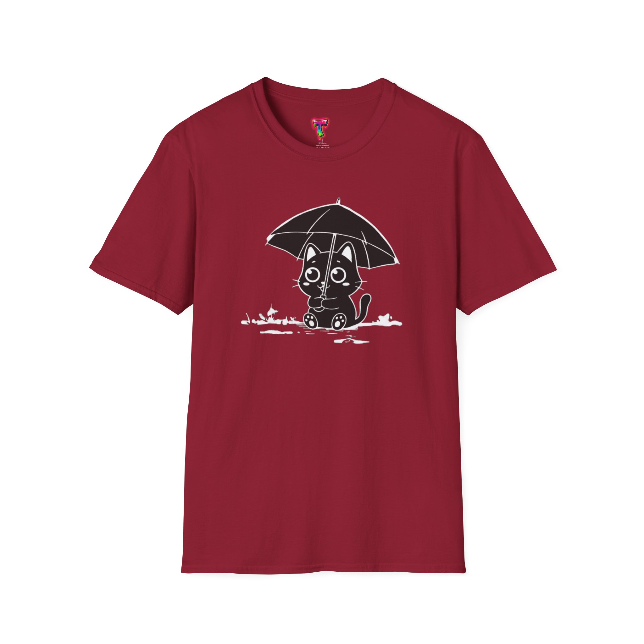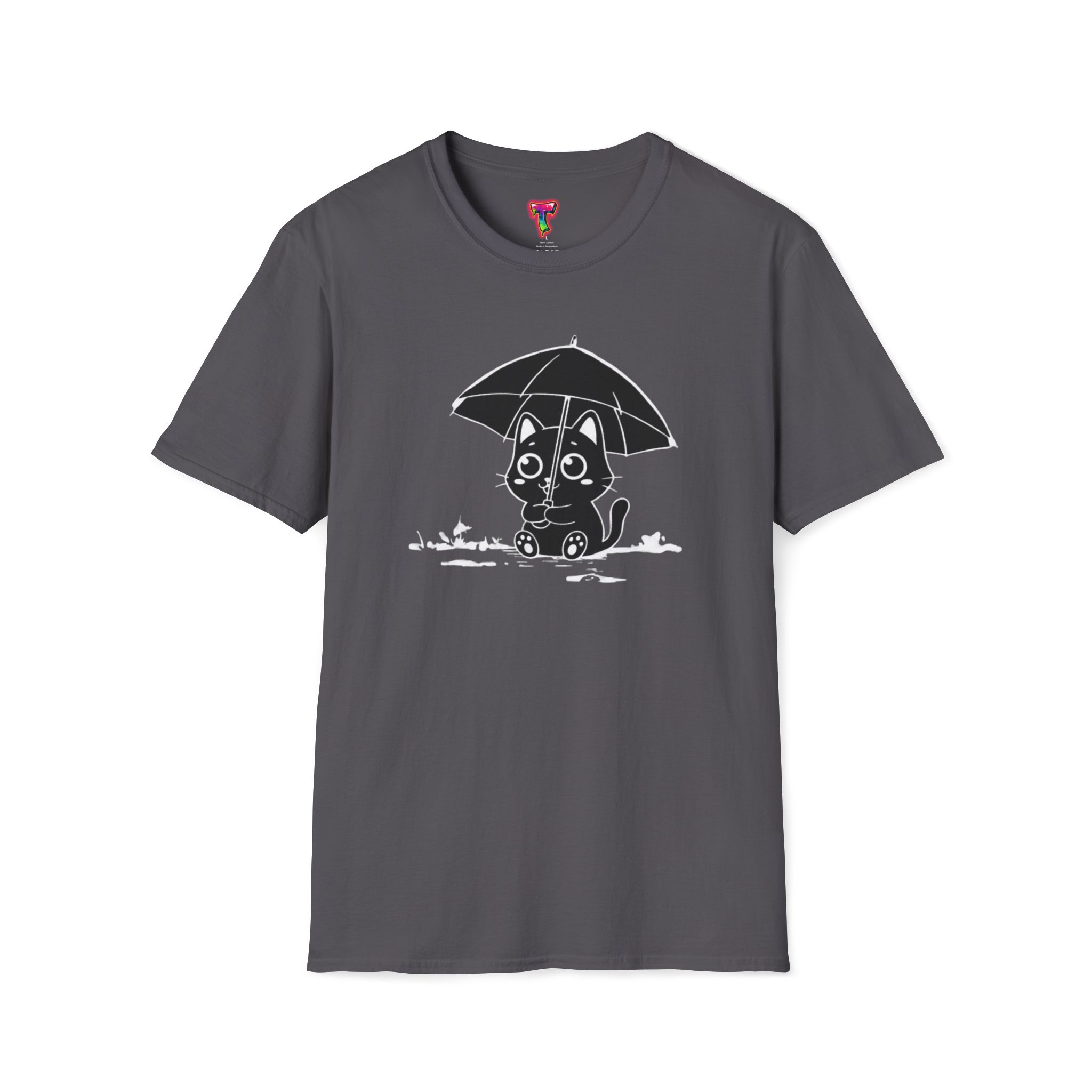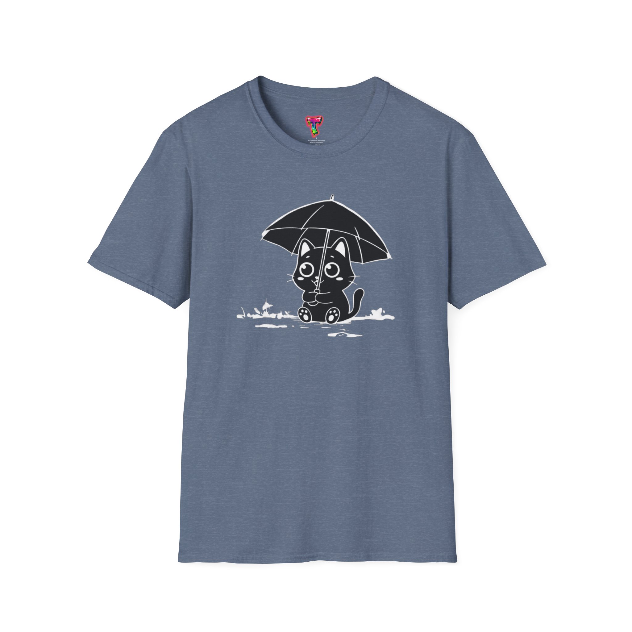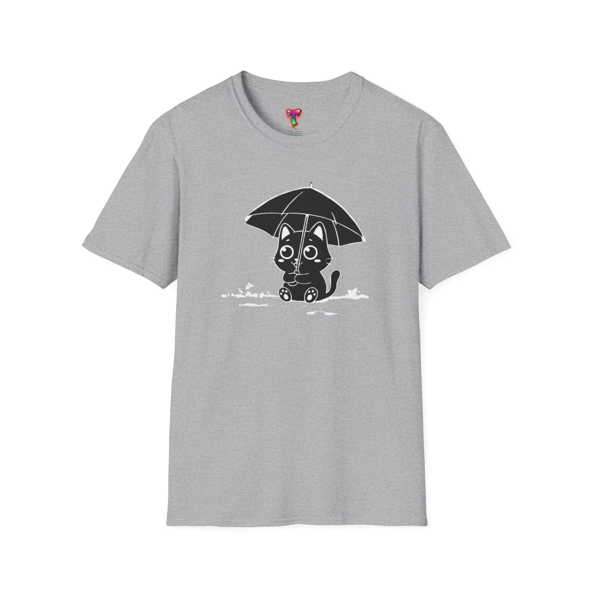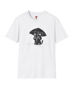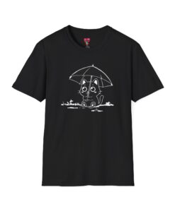Soft, cozy, and quietly playful — this lightweight crew tee brings a gentle smile to rainy days. A small, wide-eyed black kitten shelters beneath an umbrella, its wet paws splashing in tiny puddles rendered in crisp white ink. The design sits slightly above center for a handcrafted look, while the smooth, ring-spun cotton body feels breathable and lived-in from the first wear. Wear it on slow mornings with jeans, layered under a cardigan for commuter weather, or to brighten a casual night out — it’s the kind of shirt that turns ordinary days into little stories.