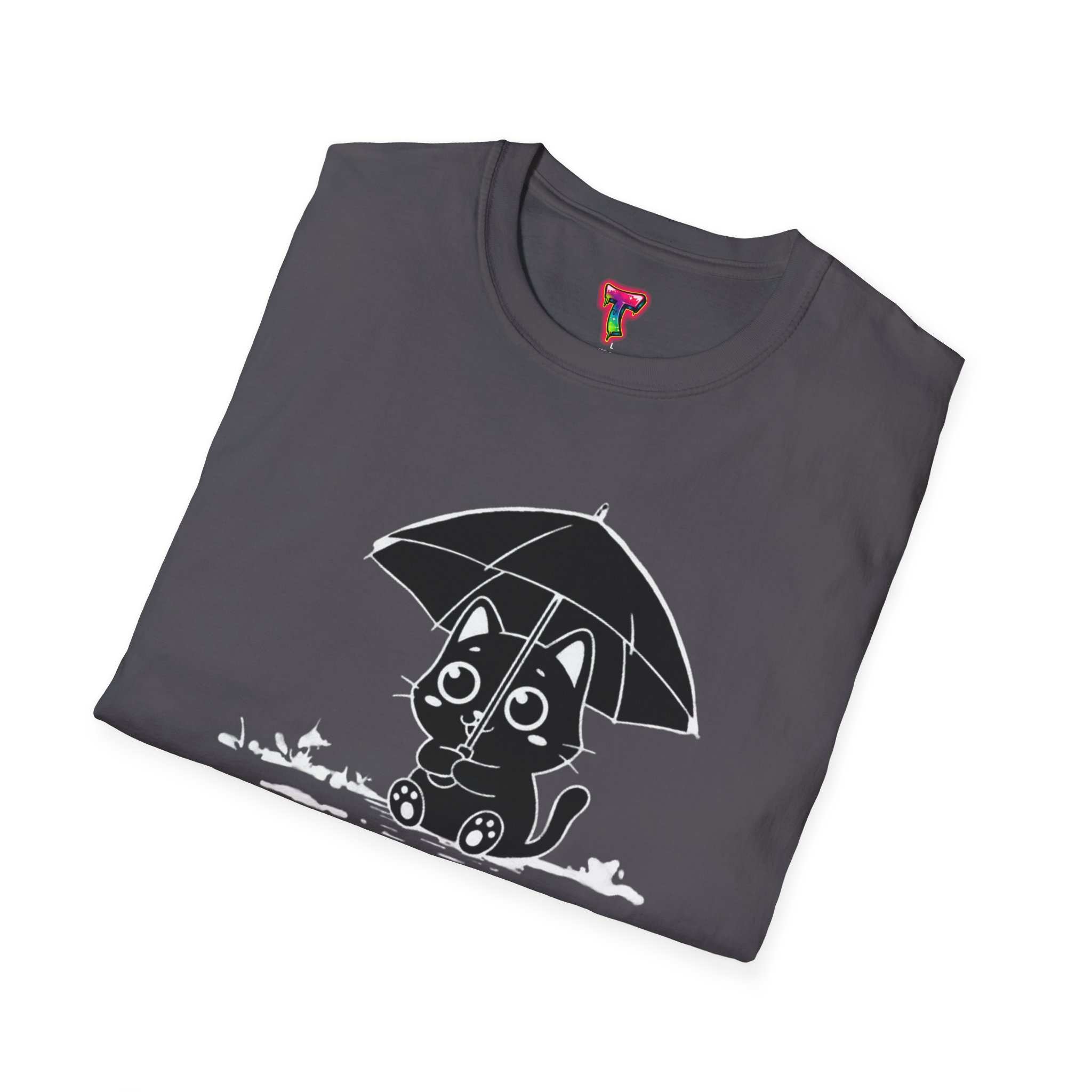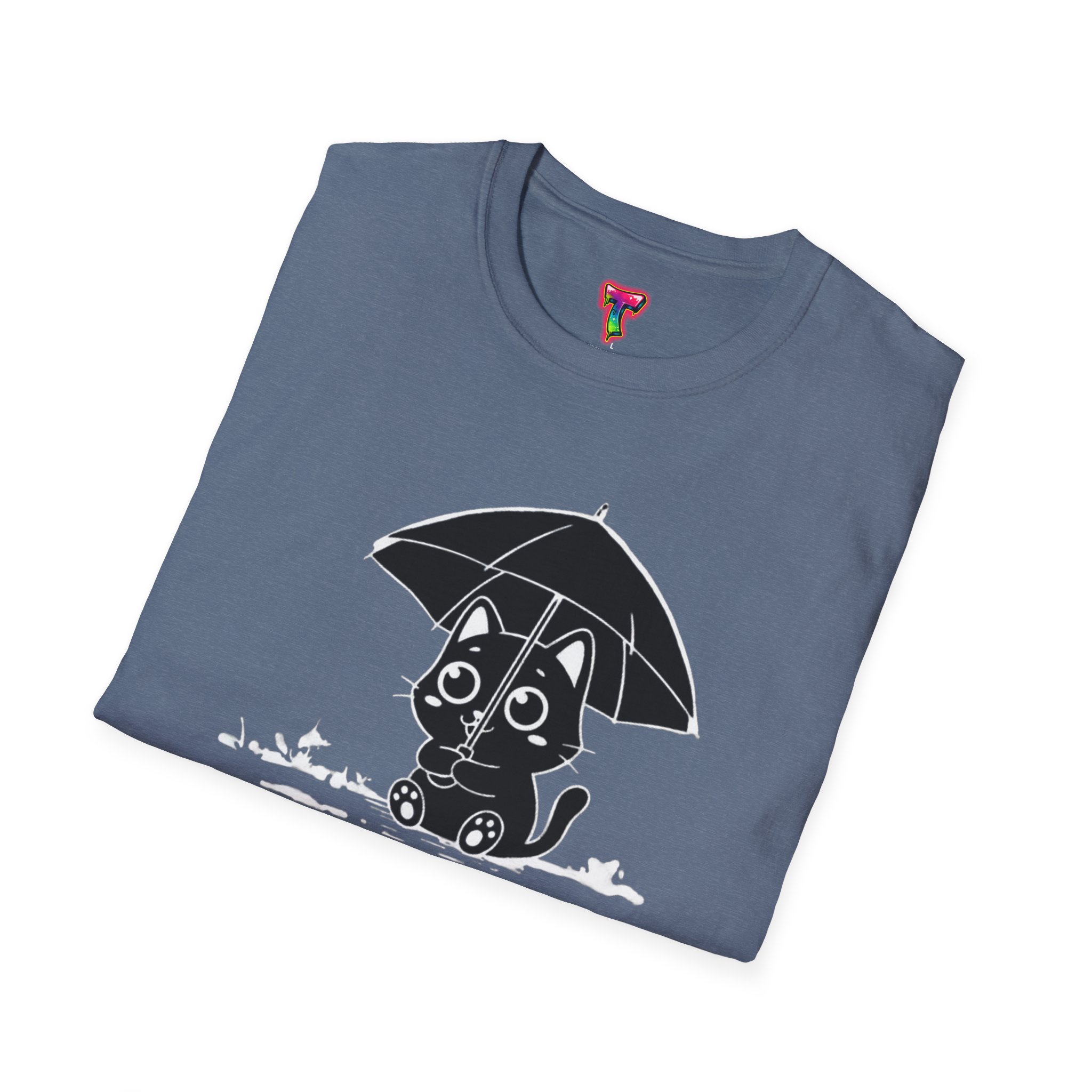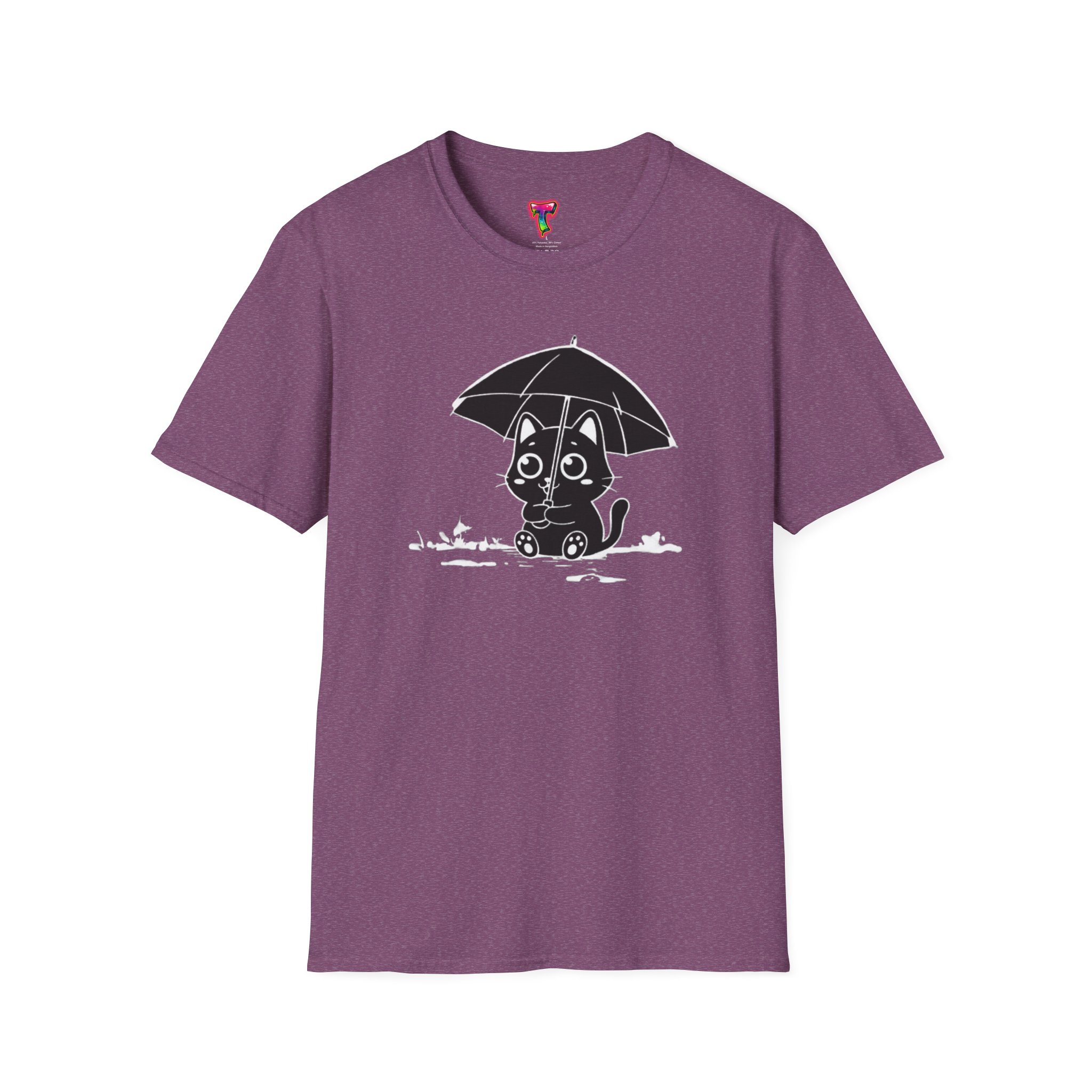 Soft, cozy, and quietly playful — this lightweight crew tee brings a gentle smile to rainy days. A small, wide-eyed black kitten shelters beneath an umbrella, its wet paws splashing in tiny puddles rendered in crisp white ink. The design sits slightly above center for a handcrafted look, while the smooth, ring-spun cotton body feels breathable and lived-in from the first wear. Wear it on slow mornings with jeans, layered under a cardigan for commuter weather, or to brighten a casual night out — it’s the kind of shirt that turns ordinary days into little stories.