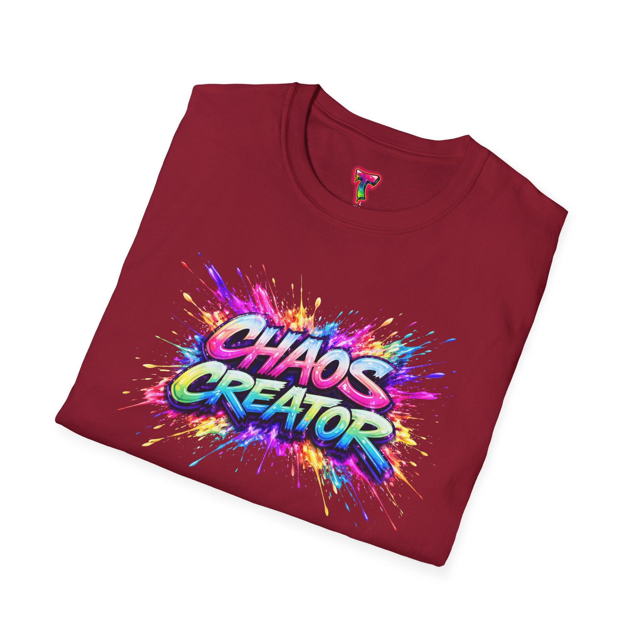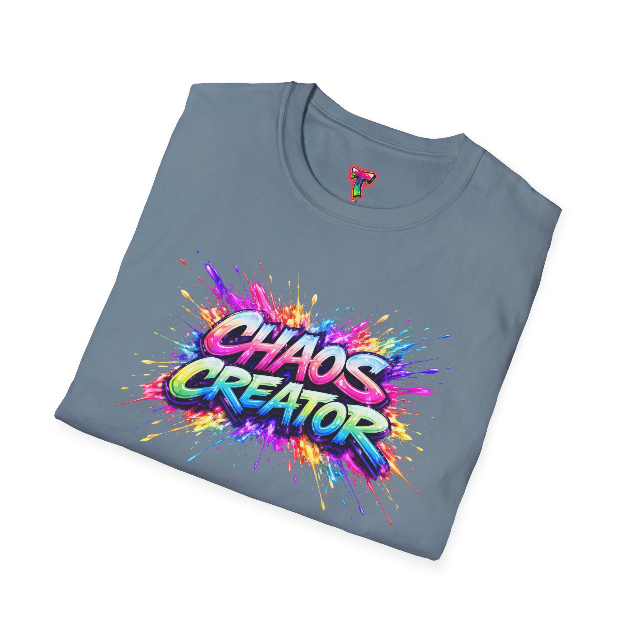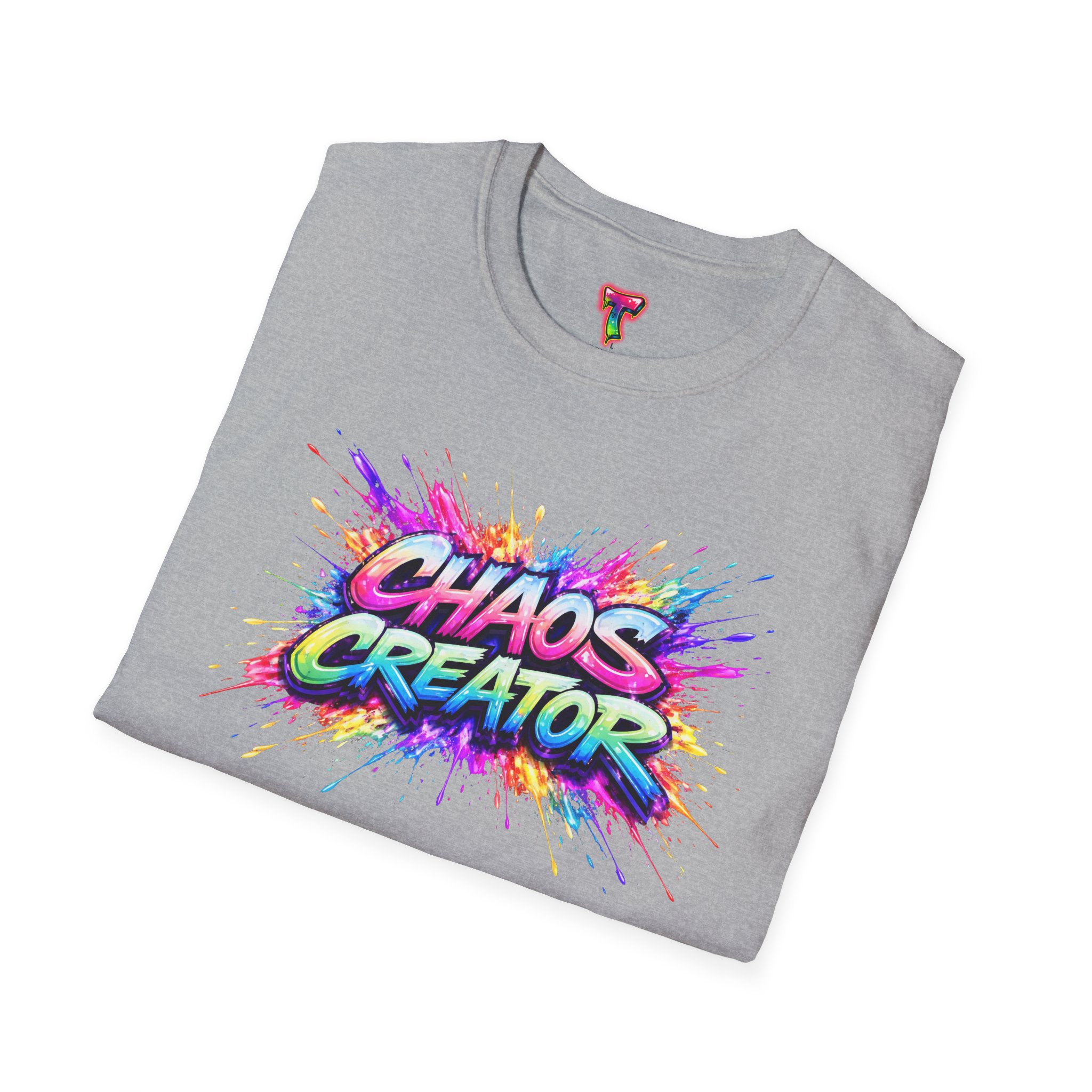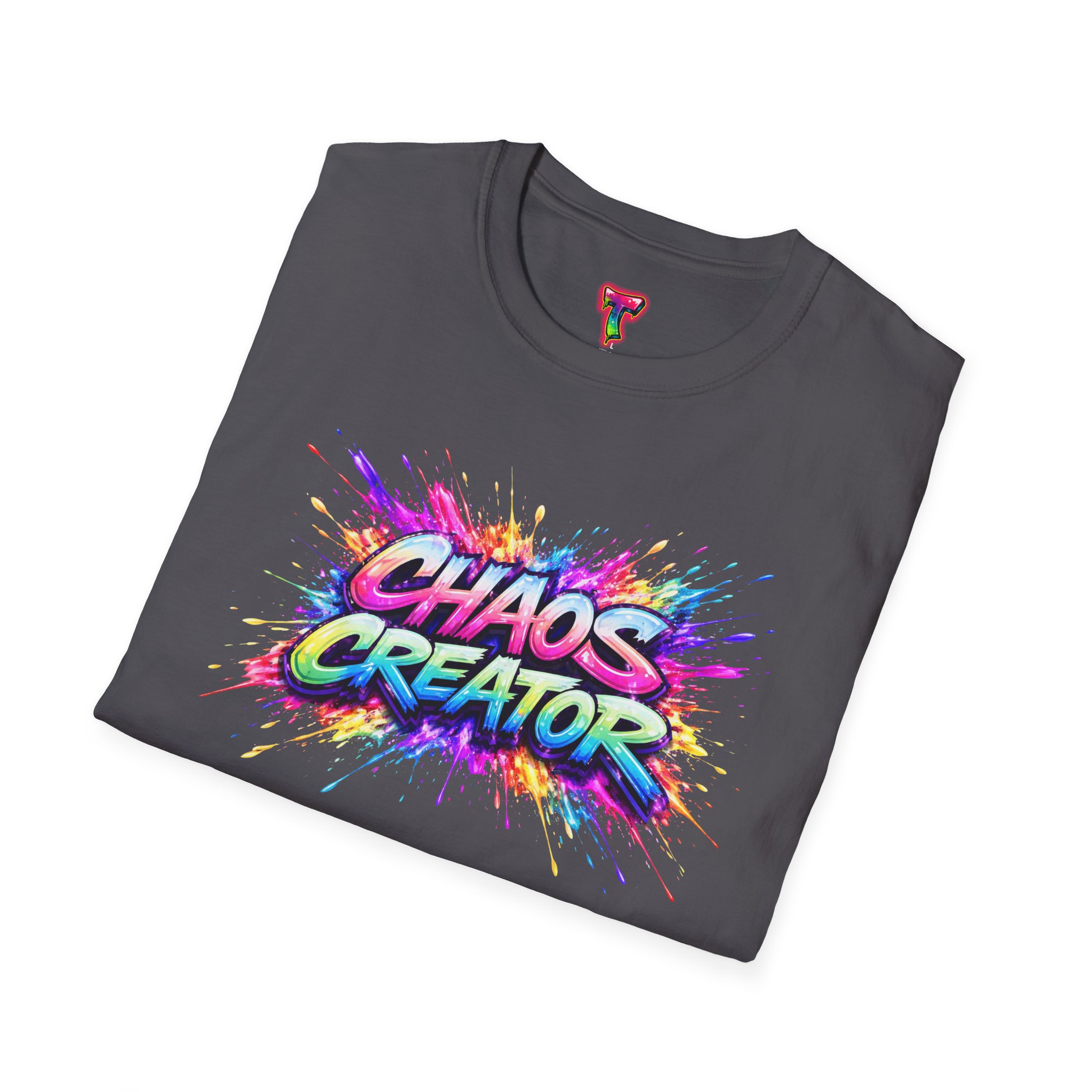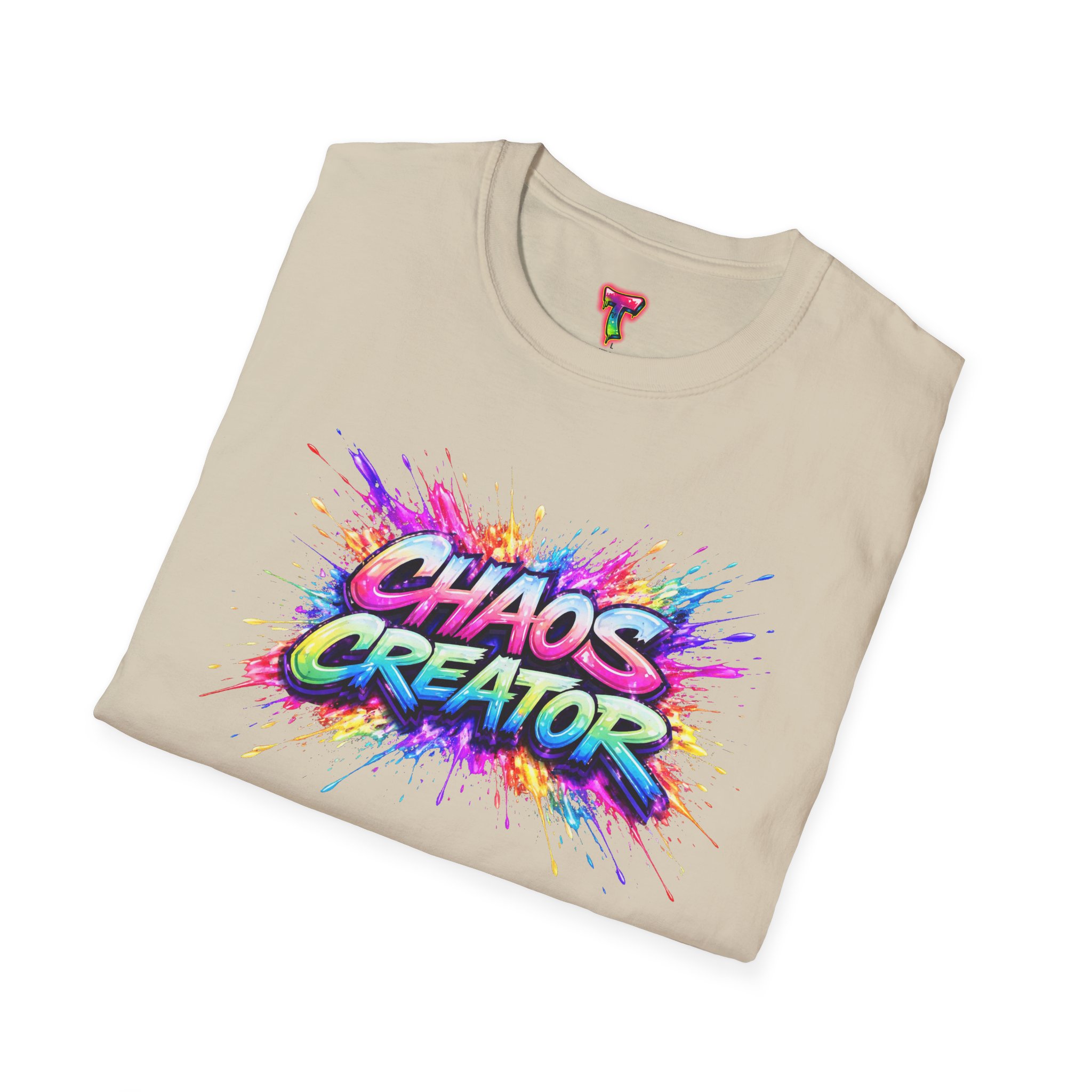 A vibrant streetwear graphic featuring the bold phrase “CHAOS CREATOR” in colorful graffiti-style typography. Surrounded by explosive paint splashes and dynamic neon accents, the design captures raw creative energy and fearless expression. The layered composition and high-contrast colors make it visually striking and full of movement. Perfect for those who thrive on creativity, break rules, and turn chaos into art.