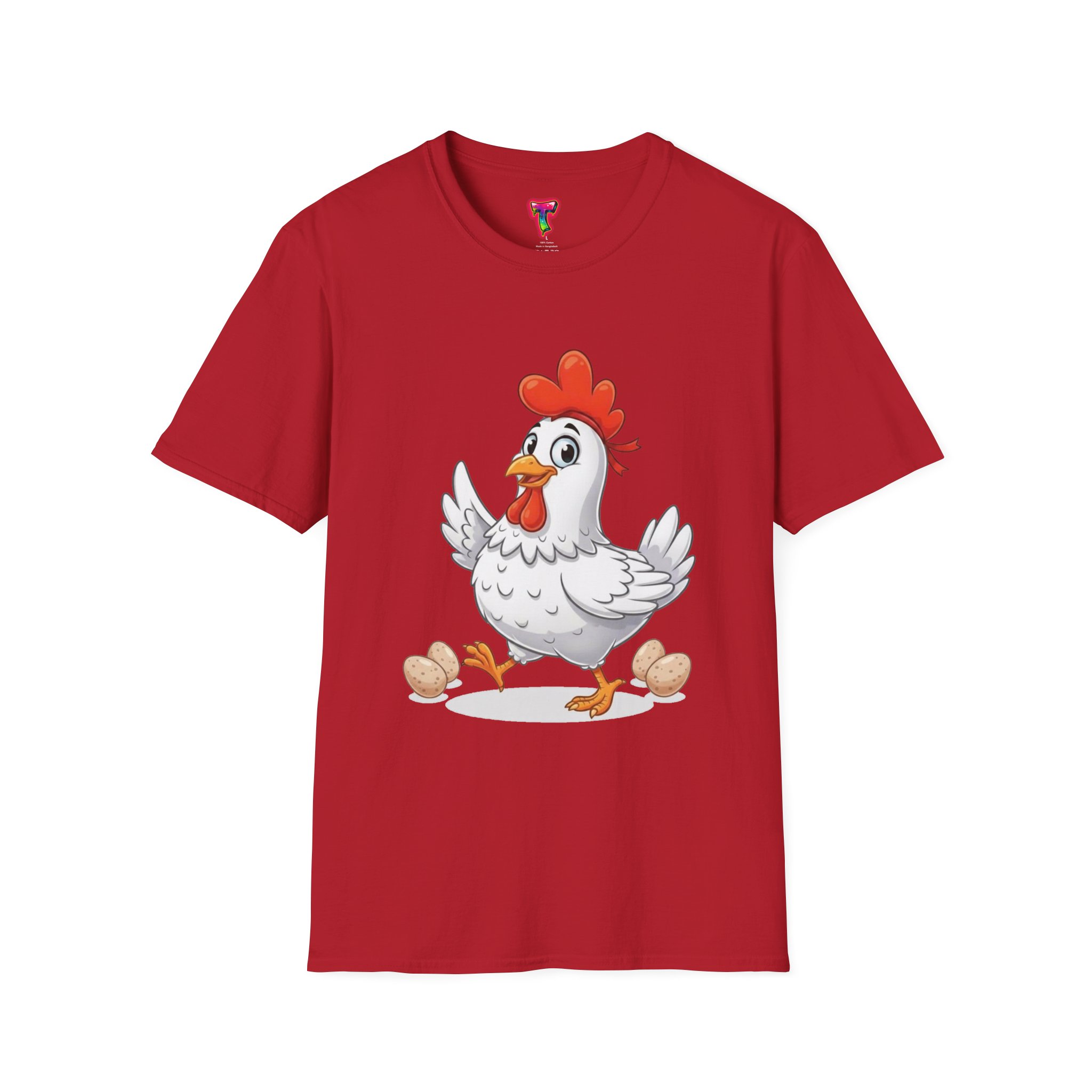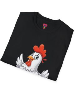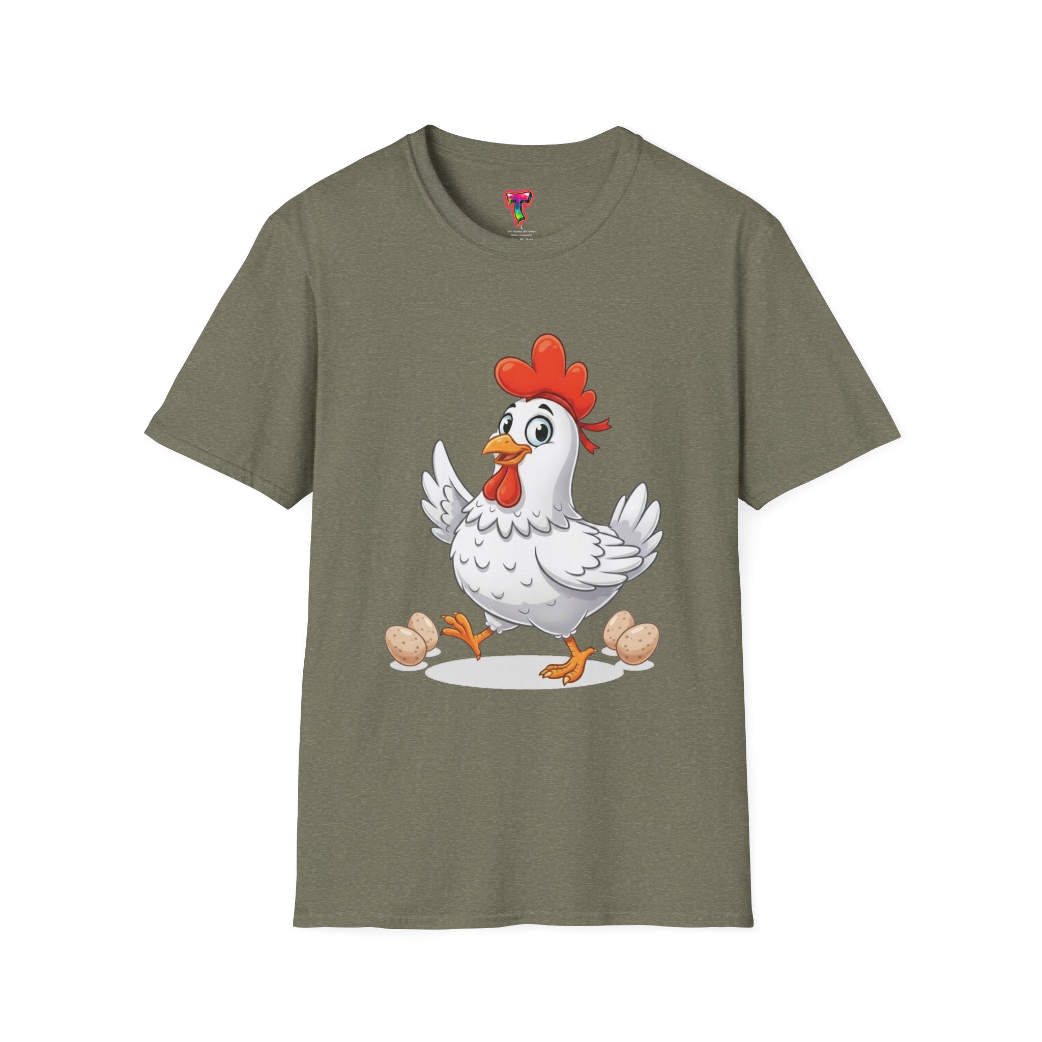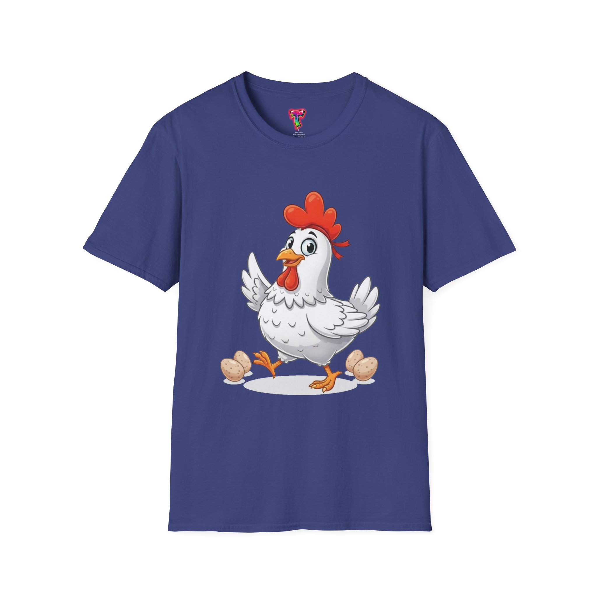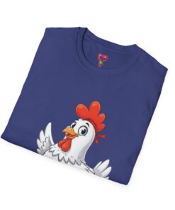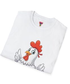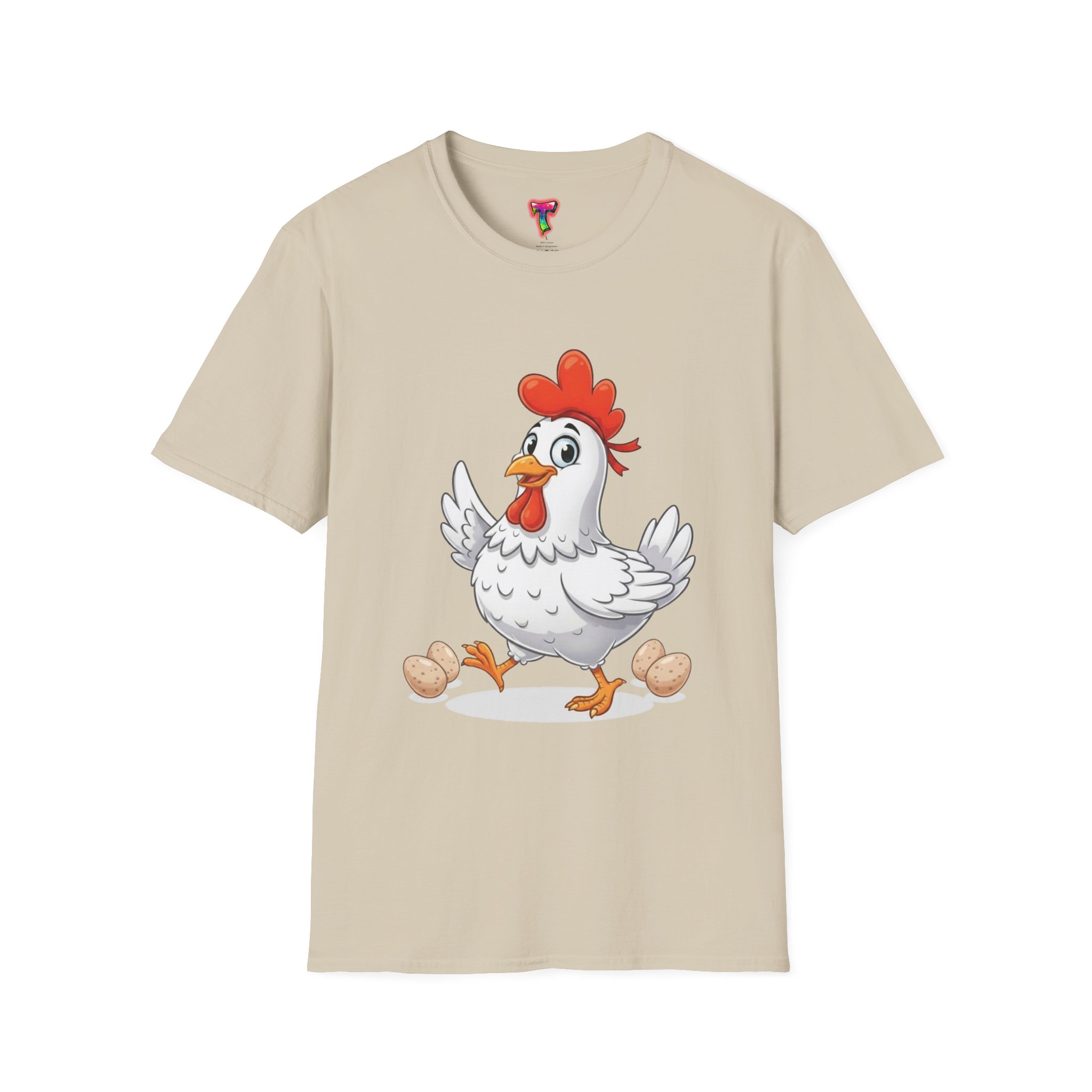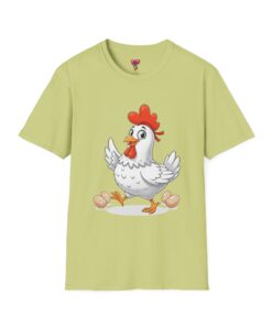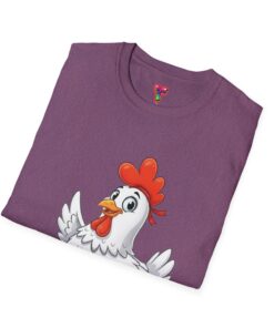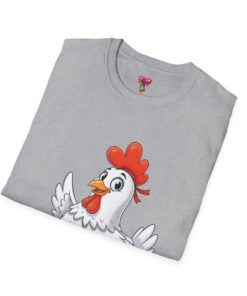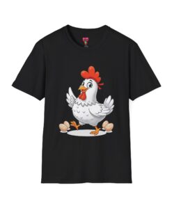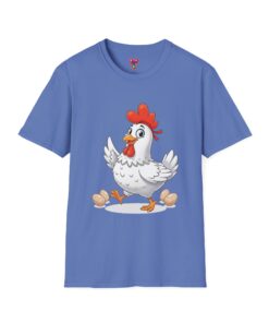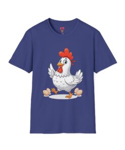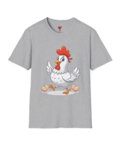 This lightweight cotton tee carries a cheerful chicken illustration that brings playful countryside energy to everyday wear. The friendly hen, bright comb, and scattered eggs sit cleanly on the chest in a bold, cartoon style that reads well from a distance. Wear it on mornings in the coop, while running errands, or when you want to add a bit of farmyard personality to jeans and boots. The shirt’s soft hand and classic crew silhouette keep the focus on comfort—perfect for folks who appreciate simple, honest designs and a little rural humor in their wardrobe.