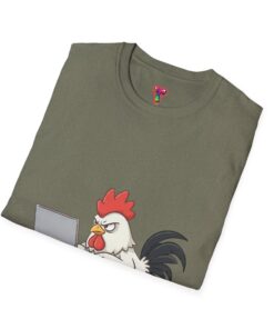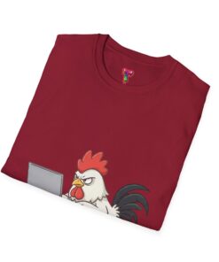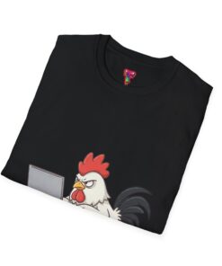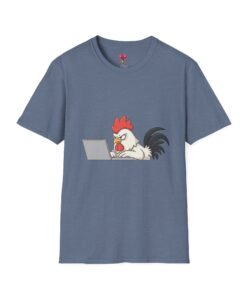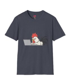 A lightweight, smooth cotton tee with a playful chicken-at-the-laptop illustration that brings a wink of humor to everyday wear. The classic crew neck and clean, tubular knit give a neat silhouette that layers easily under jackets or stands alone with jeans. Soft ring-spun cotton keeps the shirt breathable and comfortable through long work-from-home days or casual weekends on the porch. The small, centered graphic reads as witty and understated—great for people who appreciate subtle animal humor and clever, low-key designs. Built with reinforced shoulder tape and a ribbed collar that holds its shape after washing. Safety- and eco-conscious finishing: Oeko-Tex certification and ethical sourcing details included.