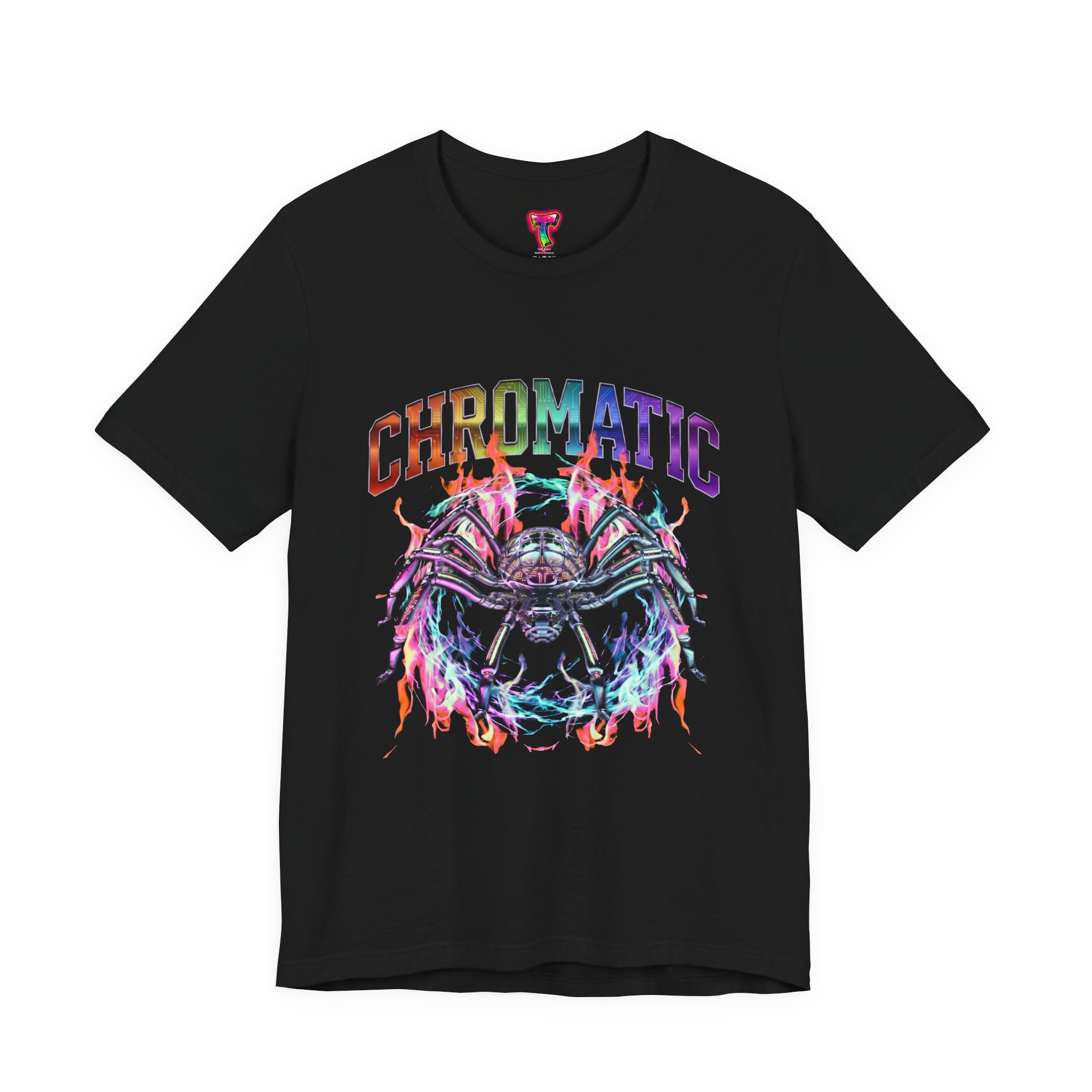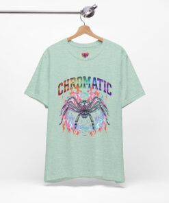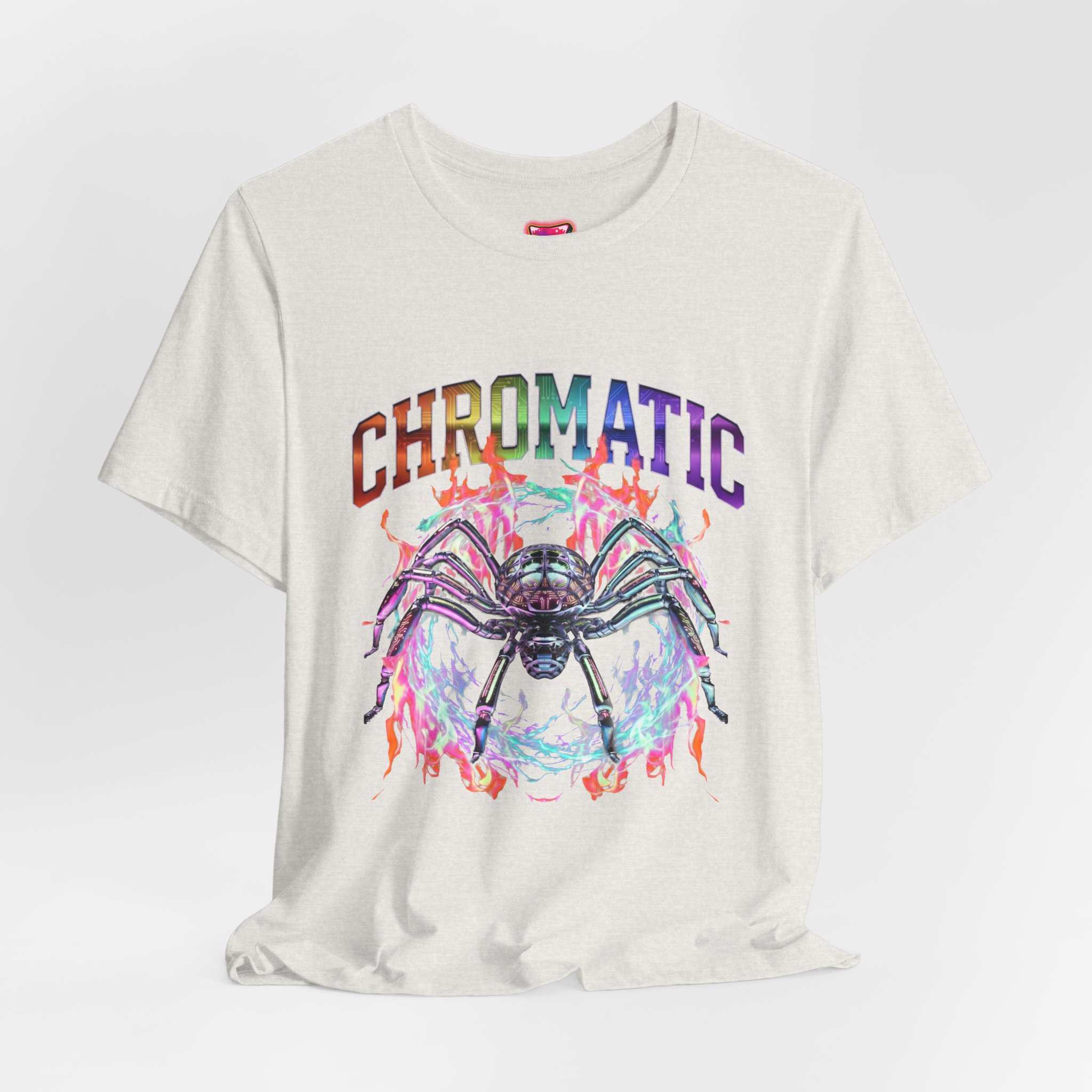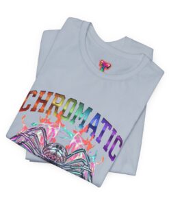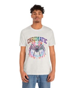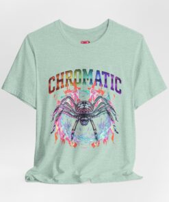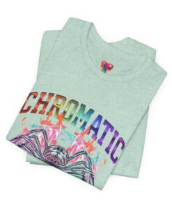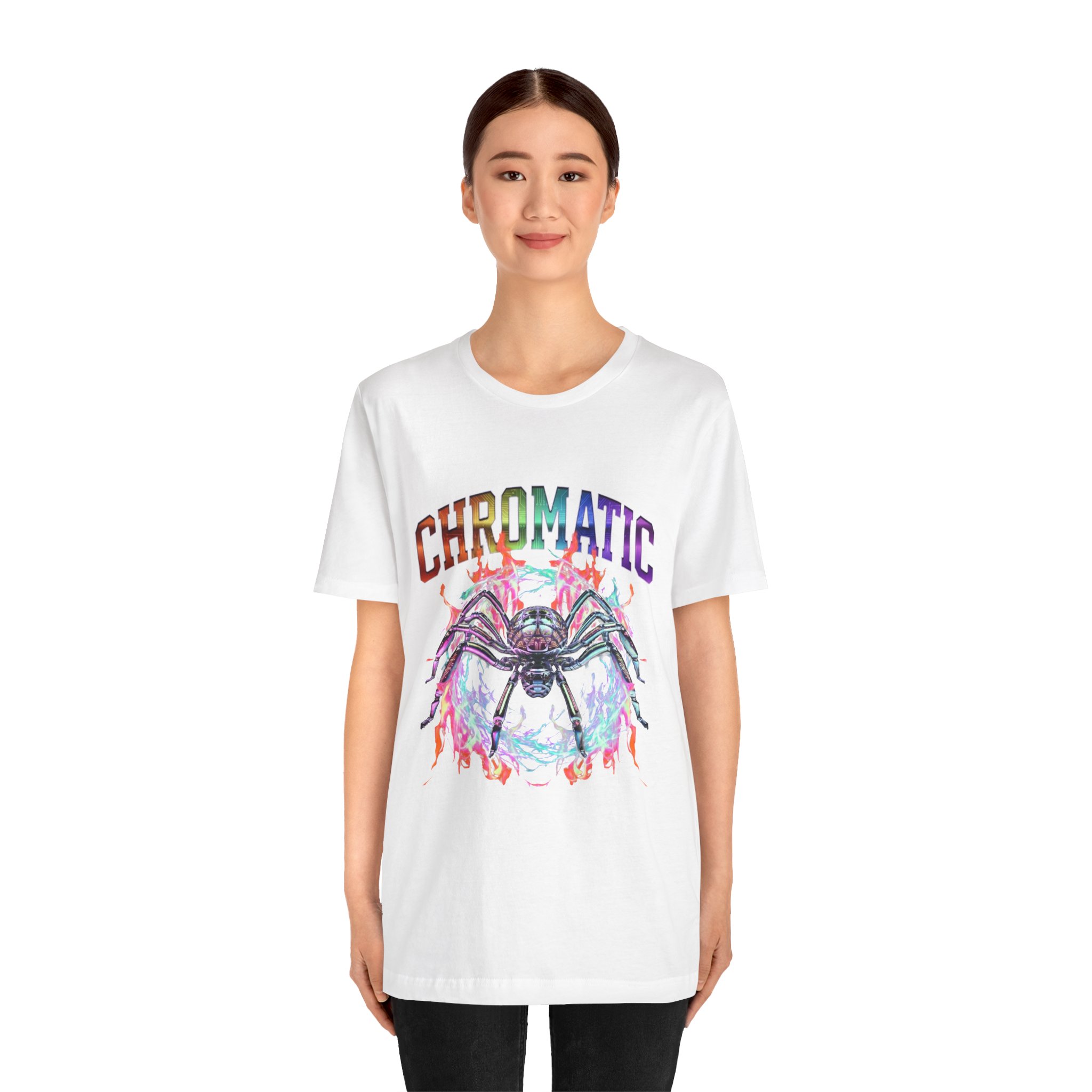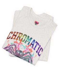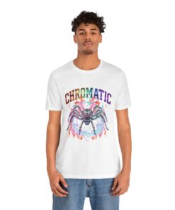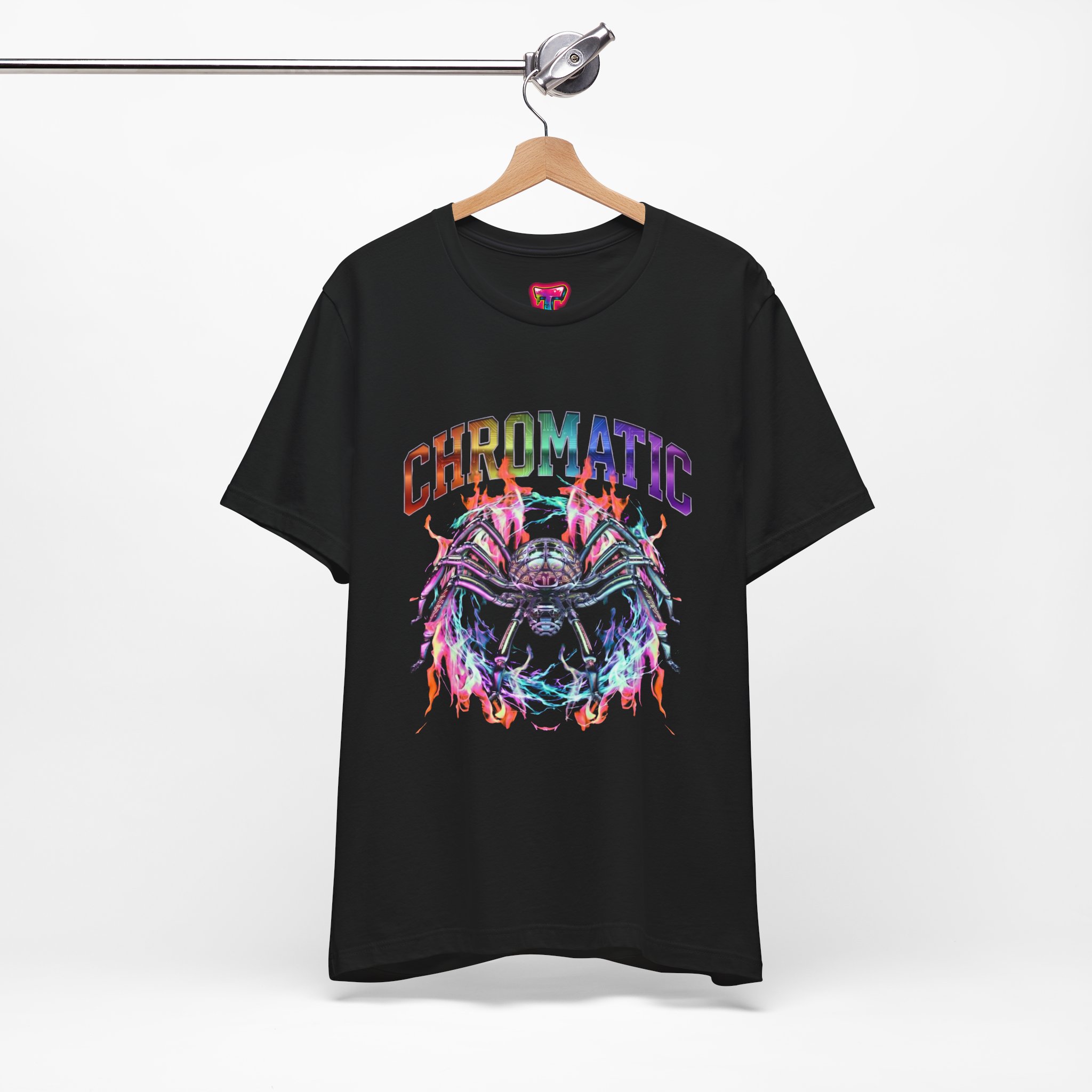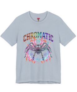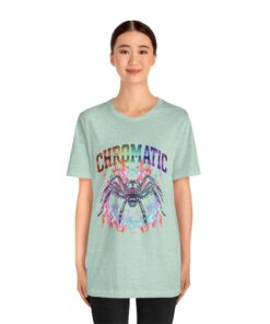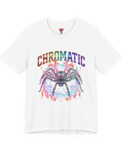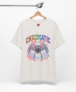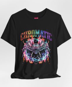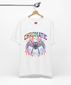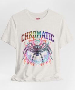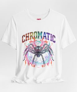 Striking graphic t-shirt design featuring a vibrant spider illustration with colorful glitch effects and bold typography that reads Chromatic. A perfect blend of edgy nature art, neon energy, and modern streetwear style for those who love unique statement fashion. Great for spider fans, alternative style lovers, and standout casual collections.