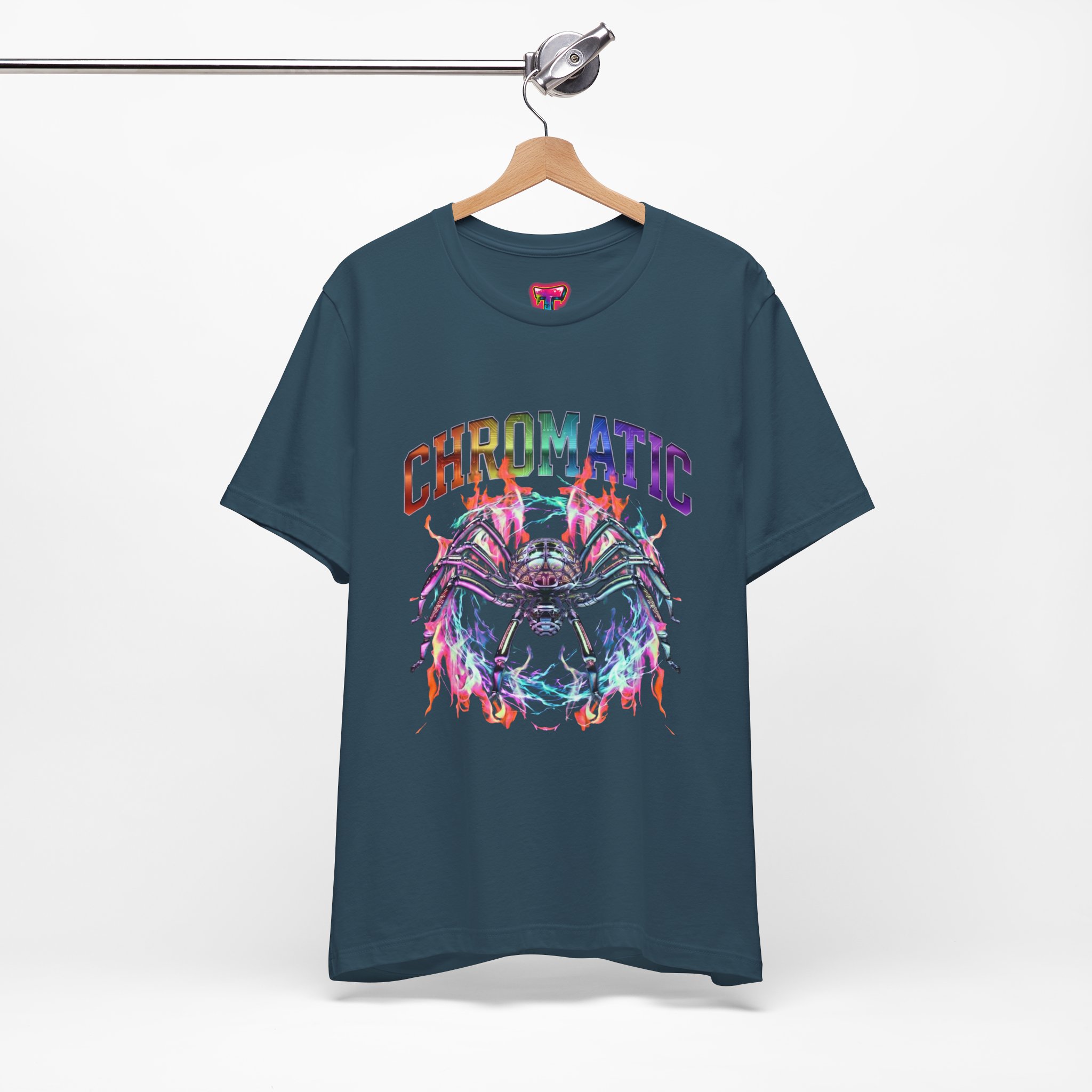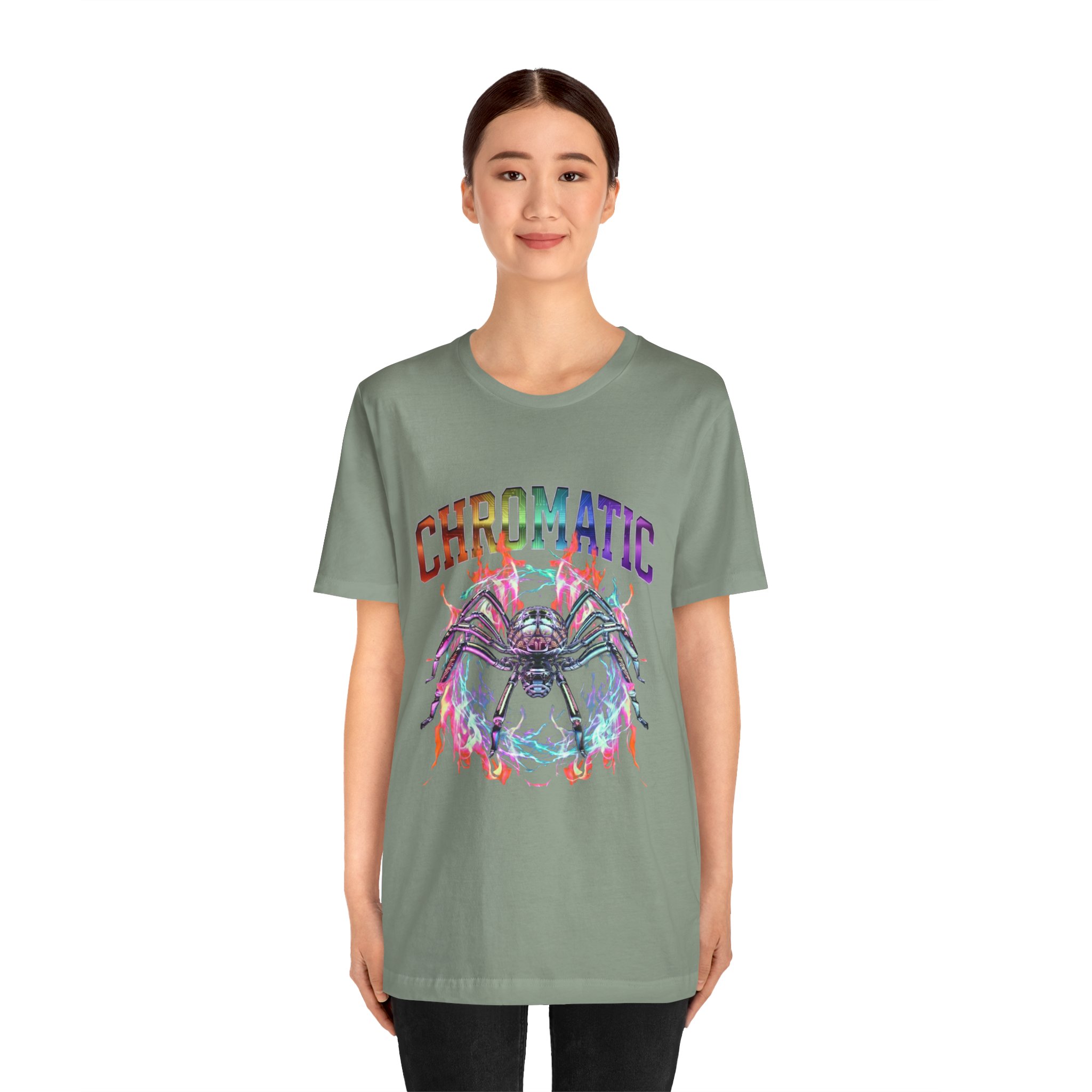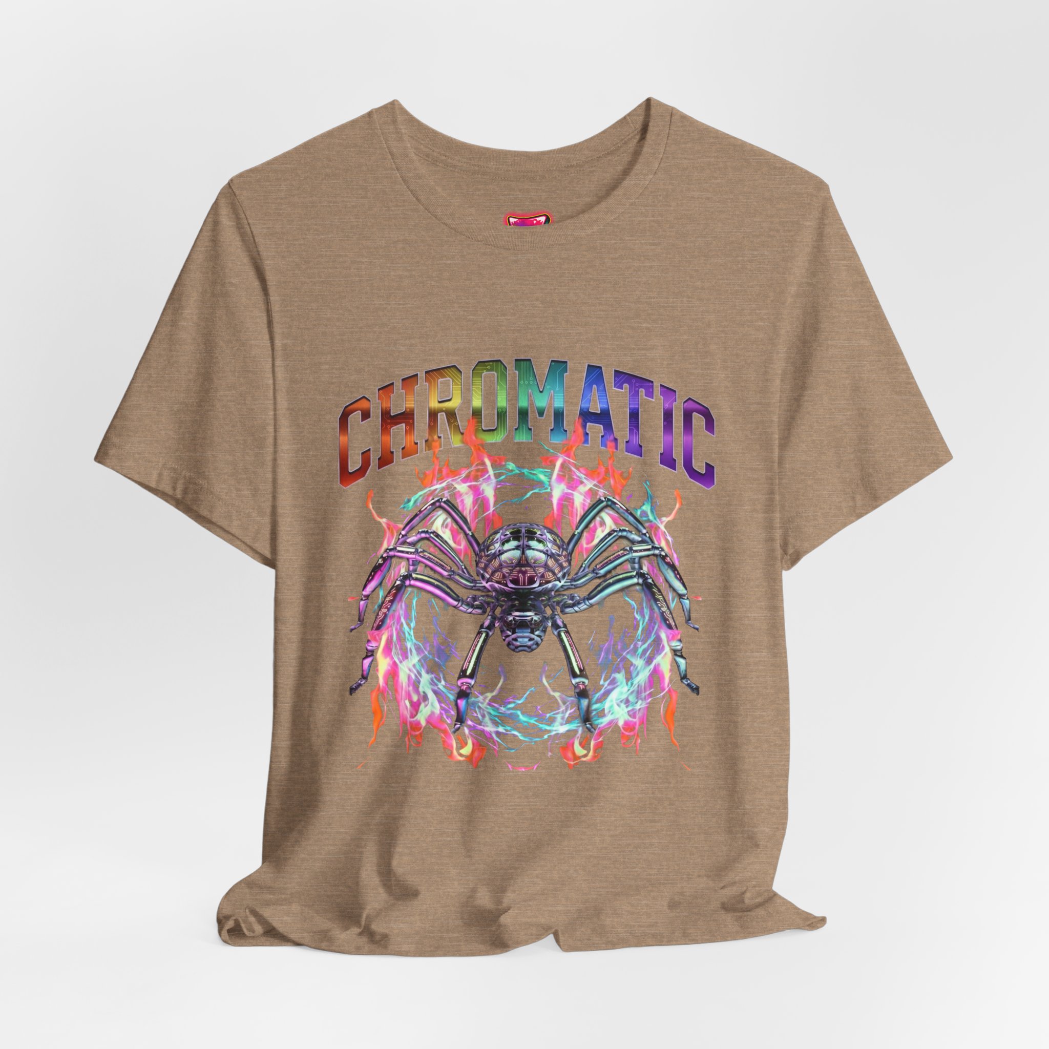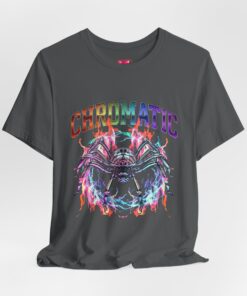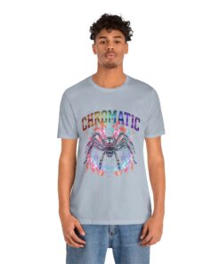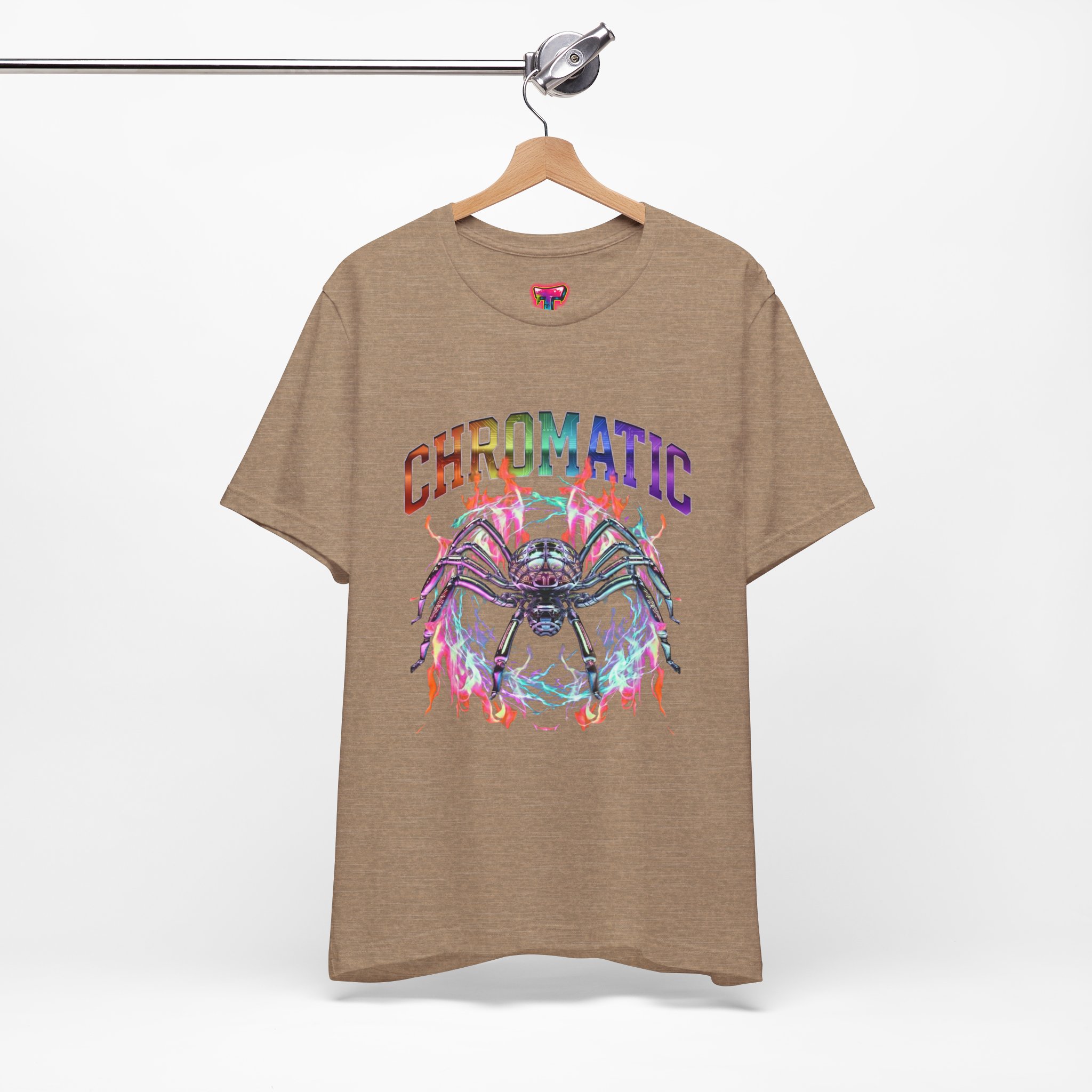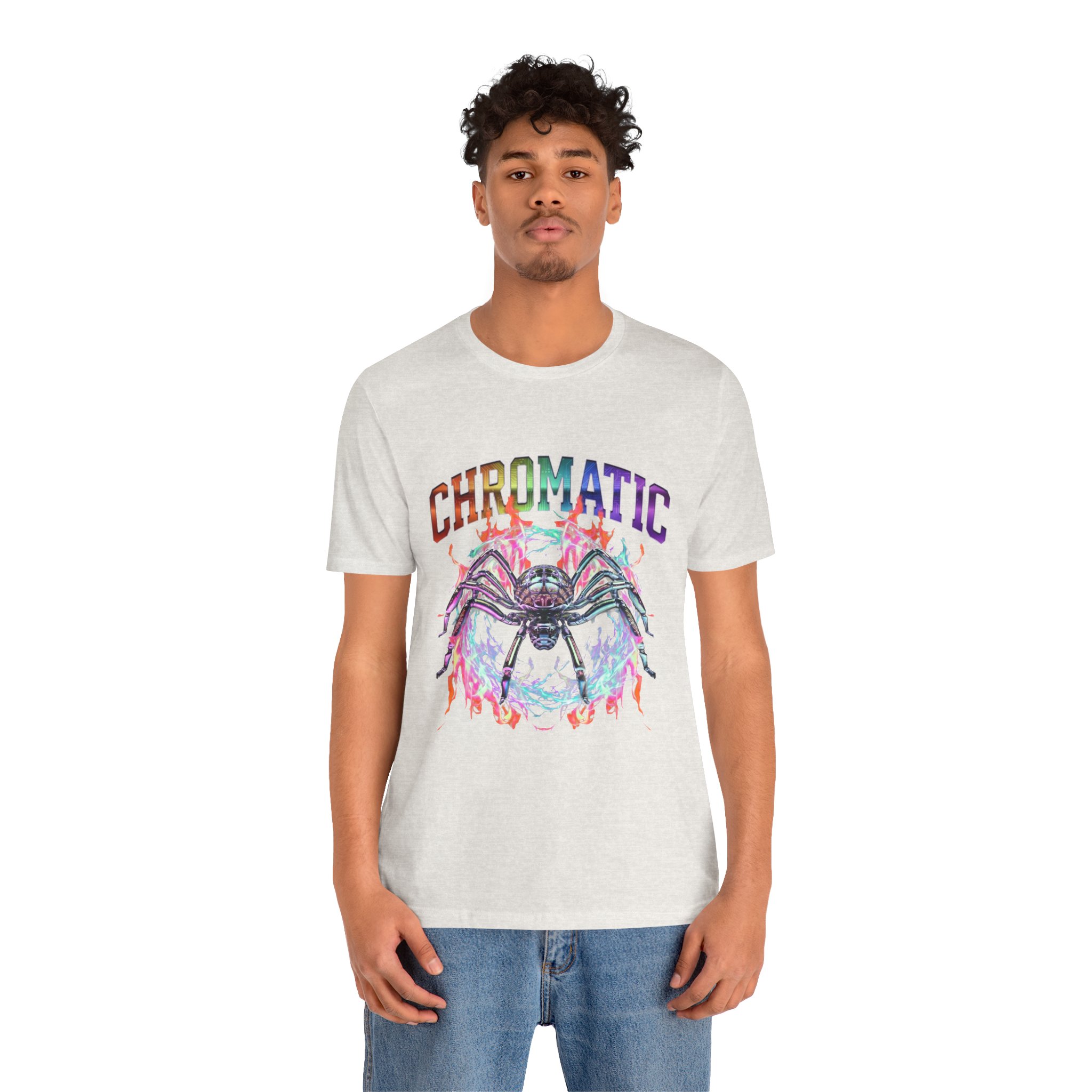 Striking graphic t-shirt design featuring a vibrant spider illustration with colorful glitch effects and bold typography that reads Chromatic. A perfect blend of edgy nature art, neon energy, and modern streetwear style for those who love unique statement fashion. Great for spider fans, alternative style lovers, and standout casual collections.