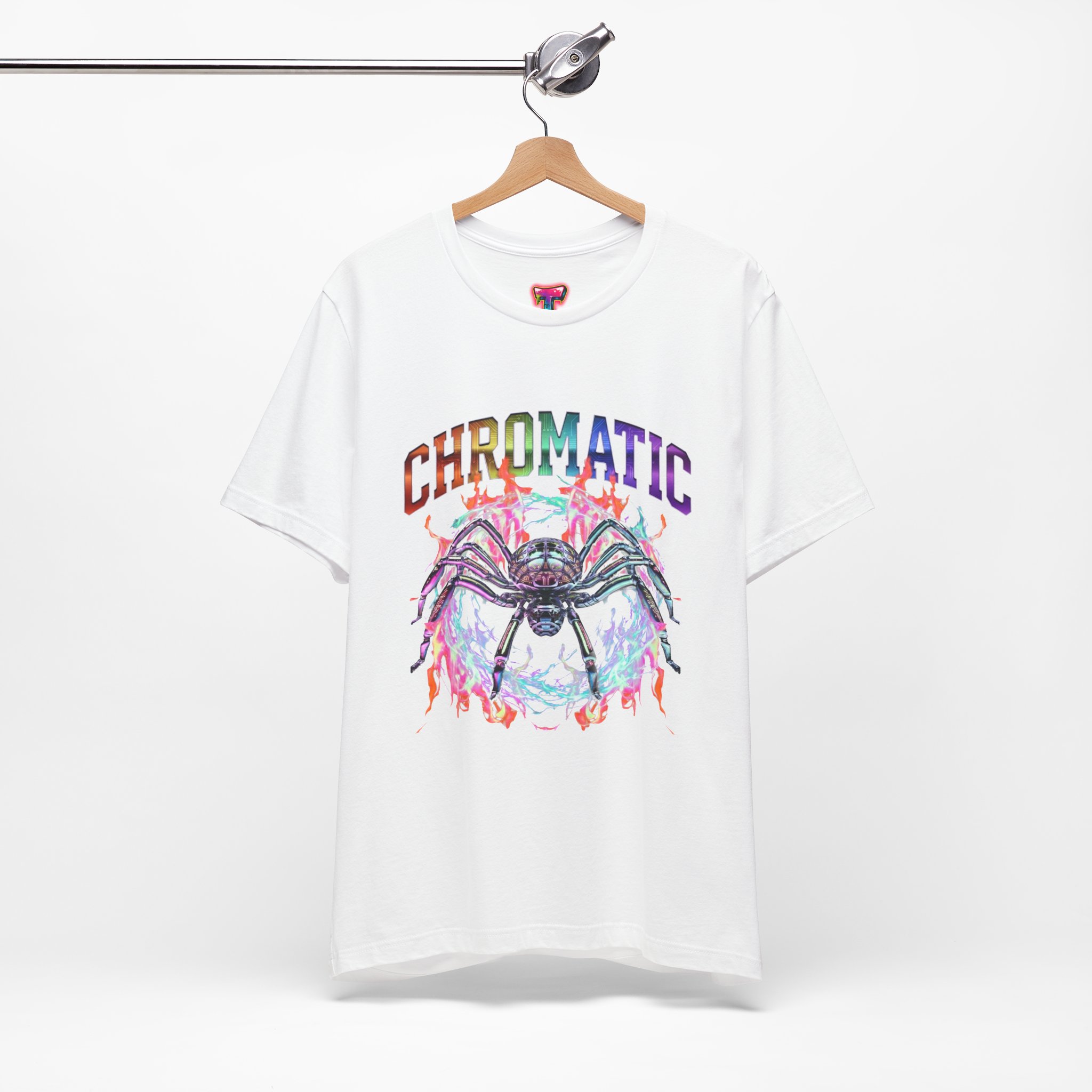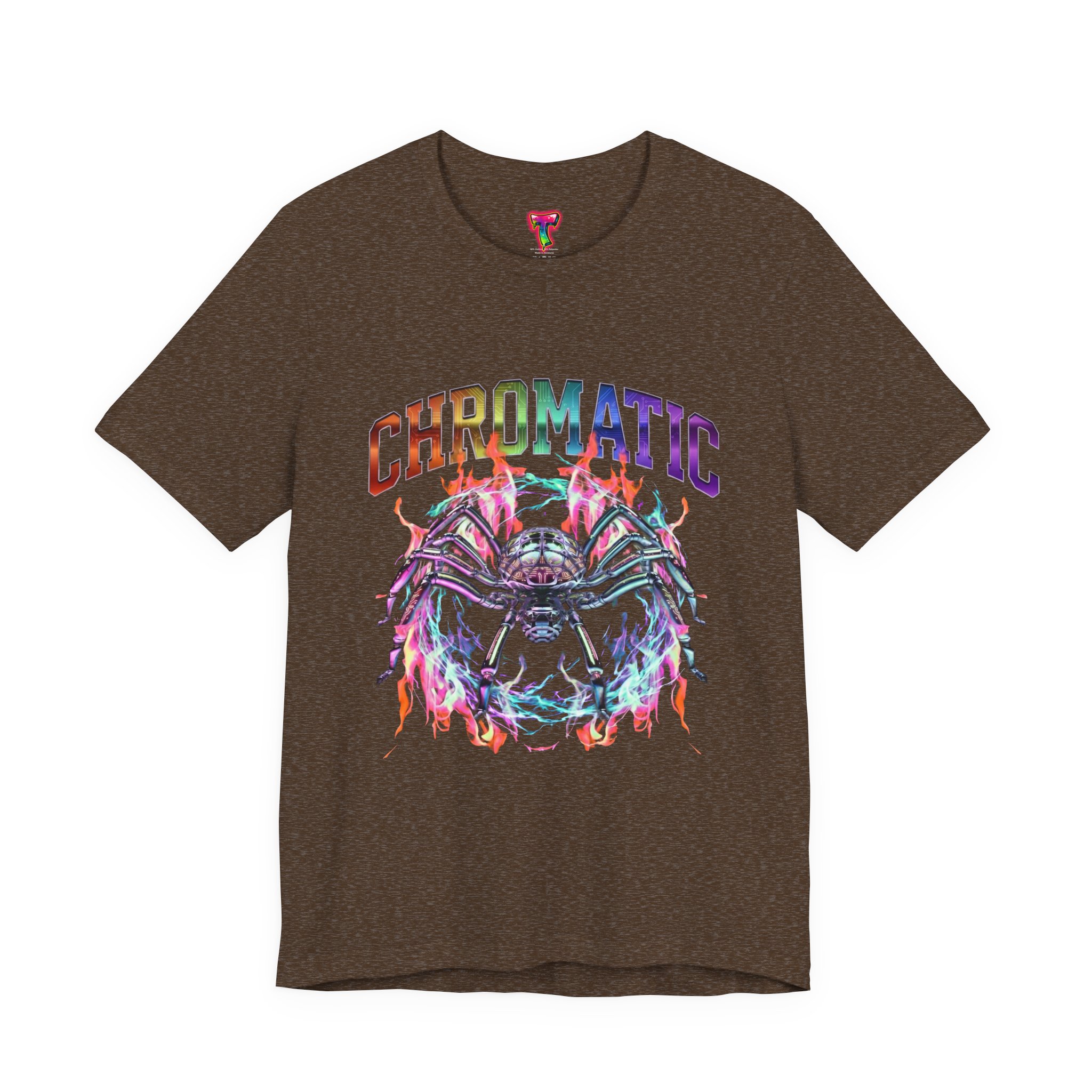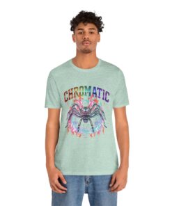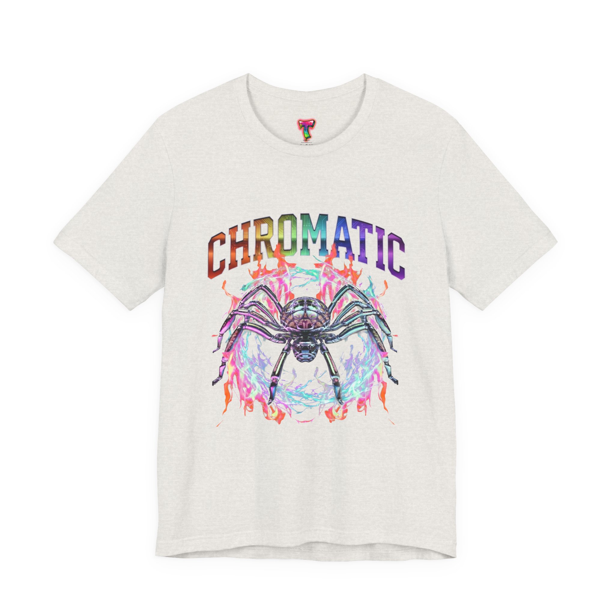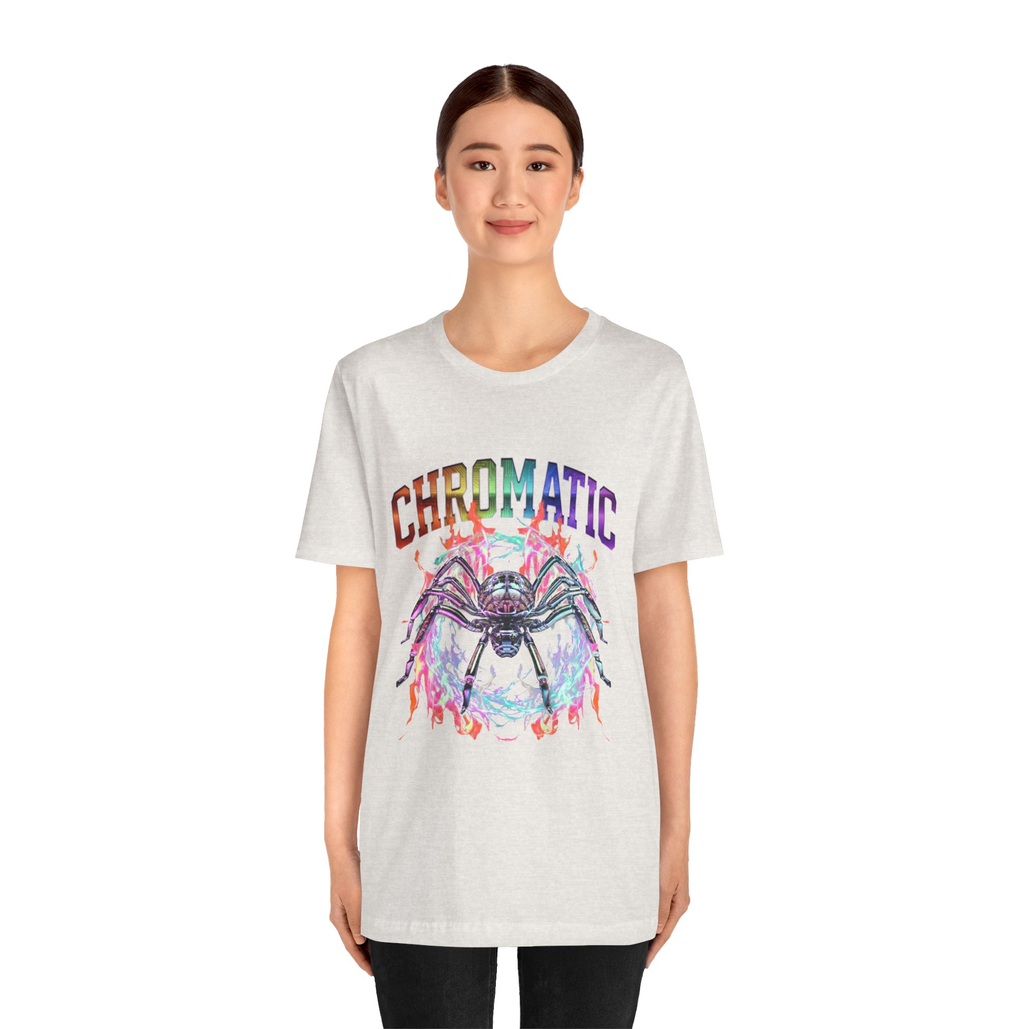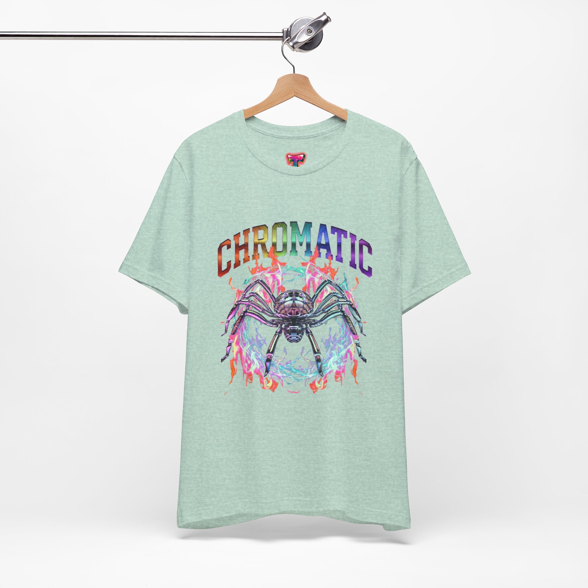 Striking graphic t-shirt design featuring a vibrant spider illustration with colorful glitch effects and bold typography that reads Chromatic. A perfect blend of edgy nature art, neon energy, and modern streetwear style for those who love unique statement fashion. Great for spider fans, alternative style lovers, and standout casual collections.