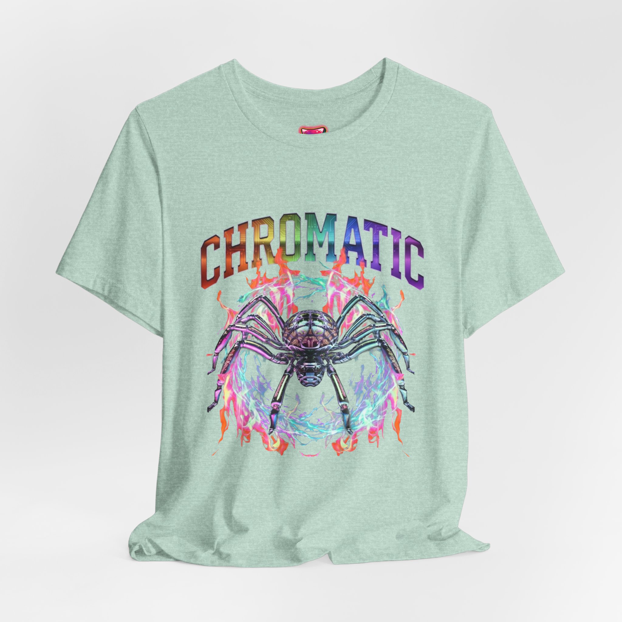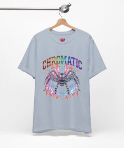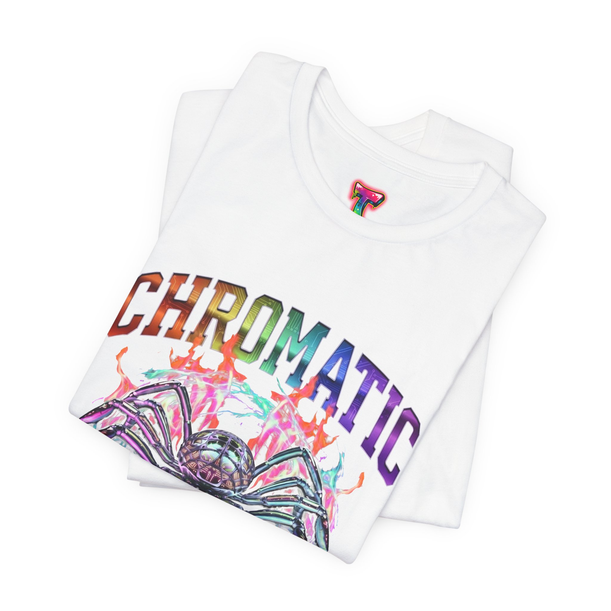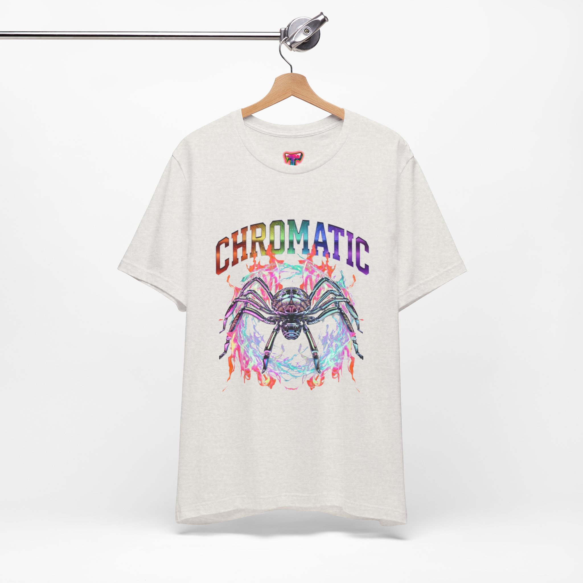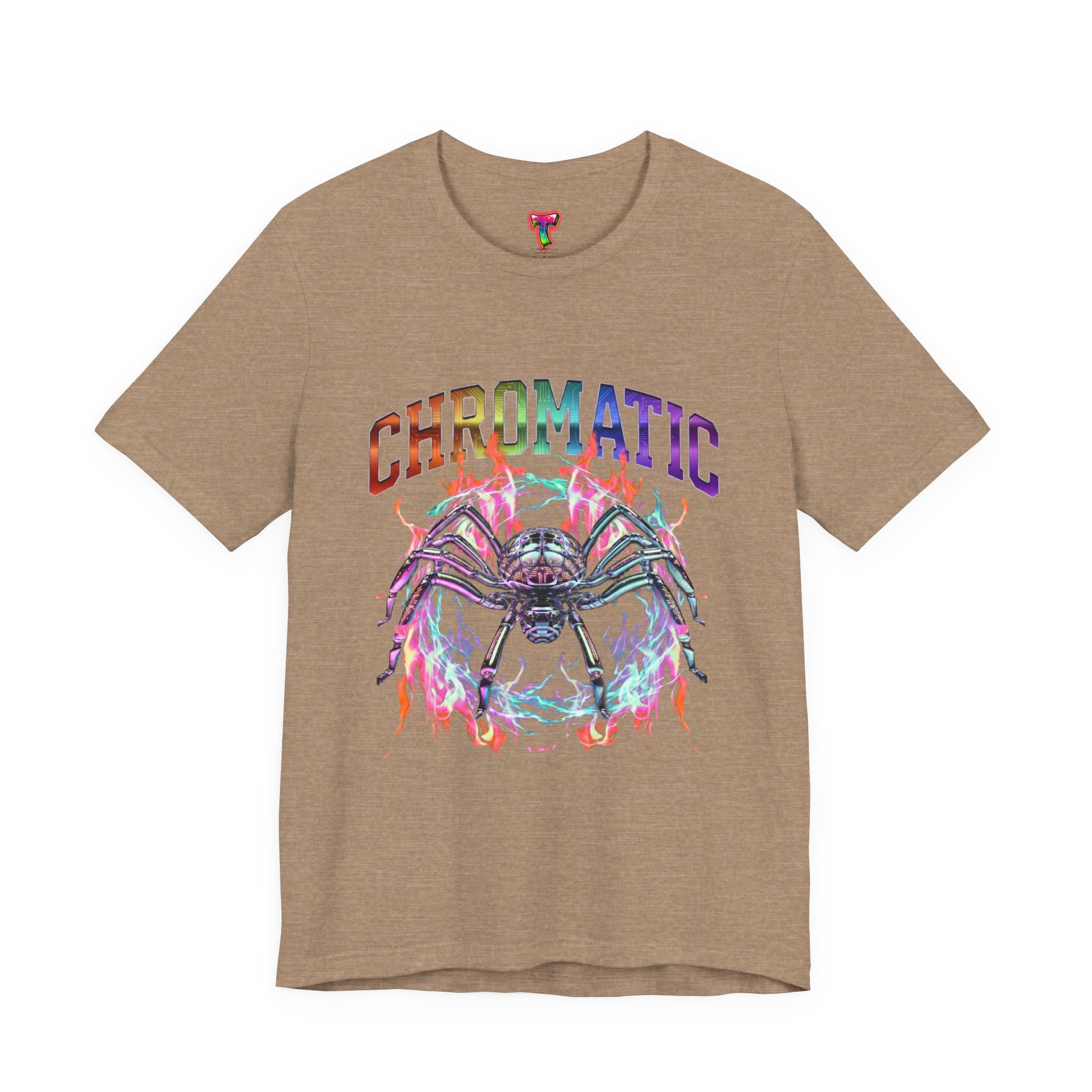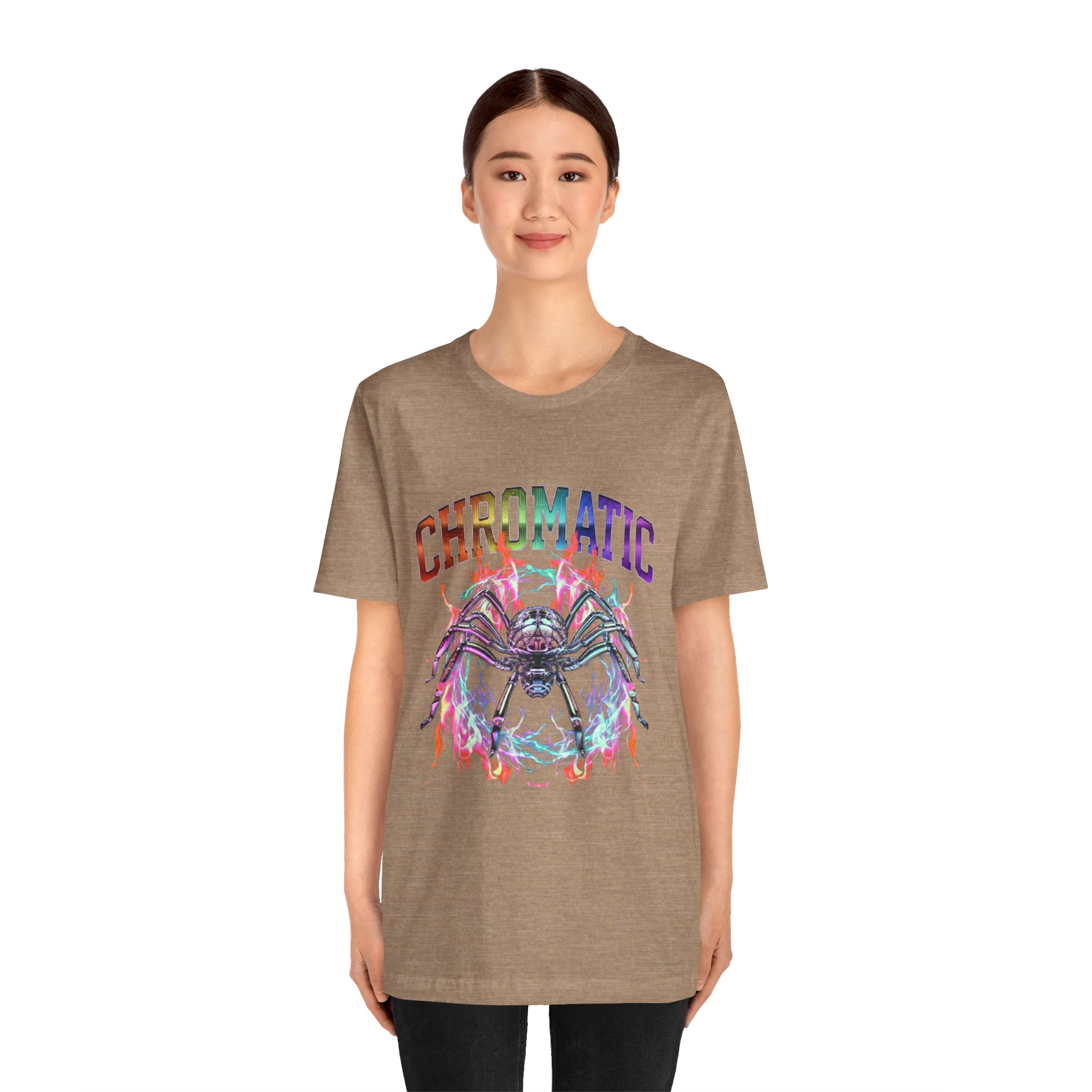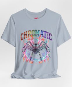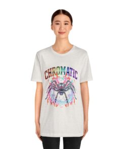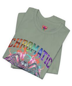 Striking graphic t-shirt design featuring a vibrant spider illustration with colorful glitch effects and bold typography that reads Chromatic. A perfect blend of edgy nature art, neon energy, and modern streetwear style for those who love unique statement fashion. Great for spider fans, alternative style lovers, and standout casual collections.