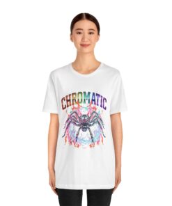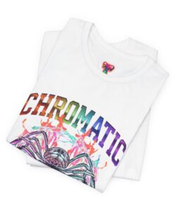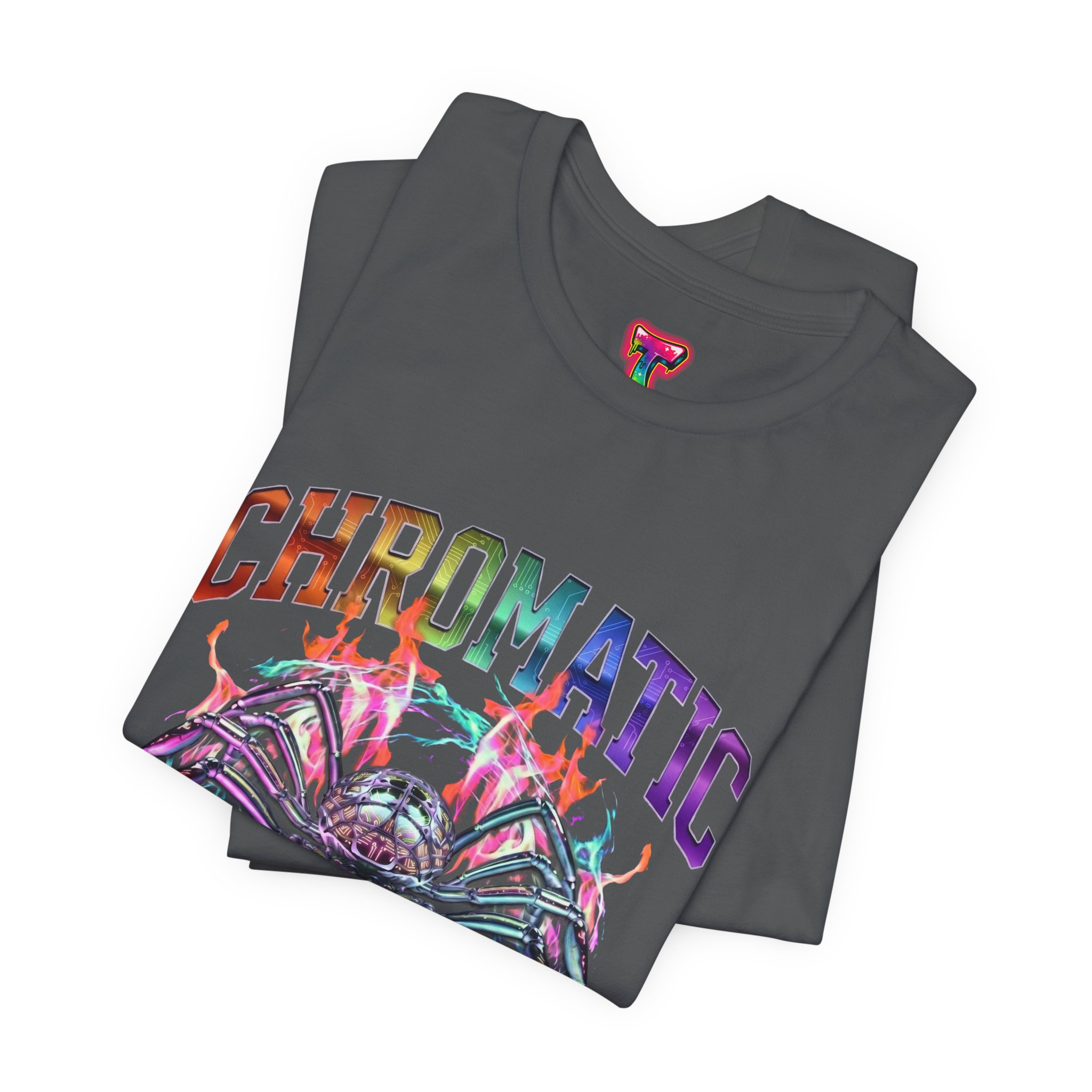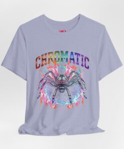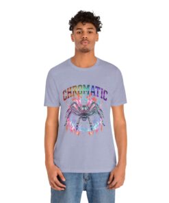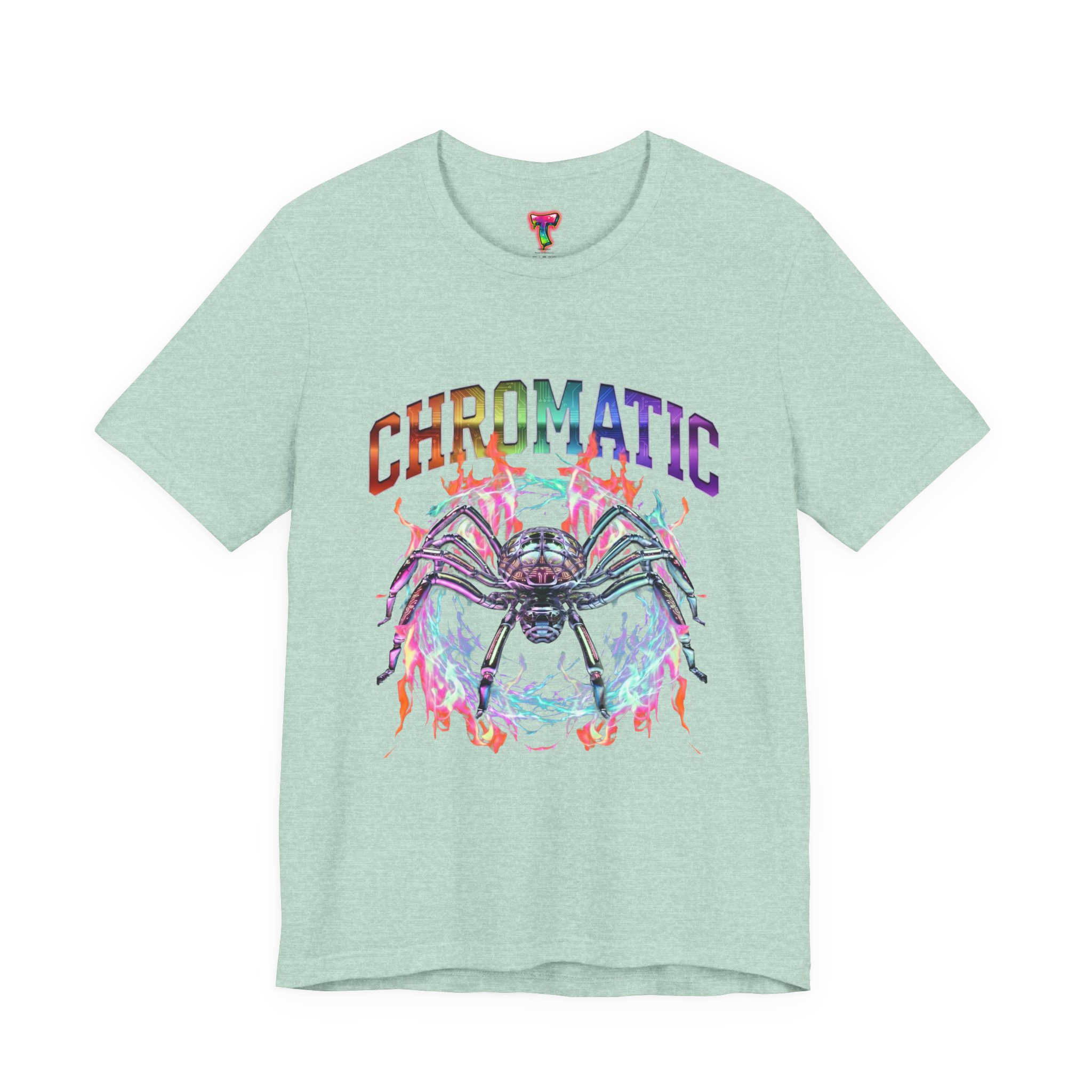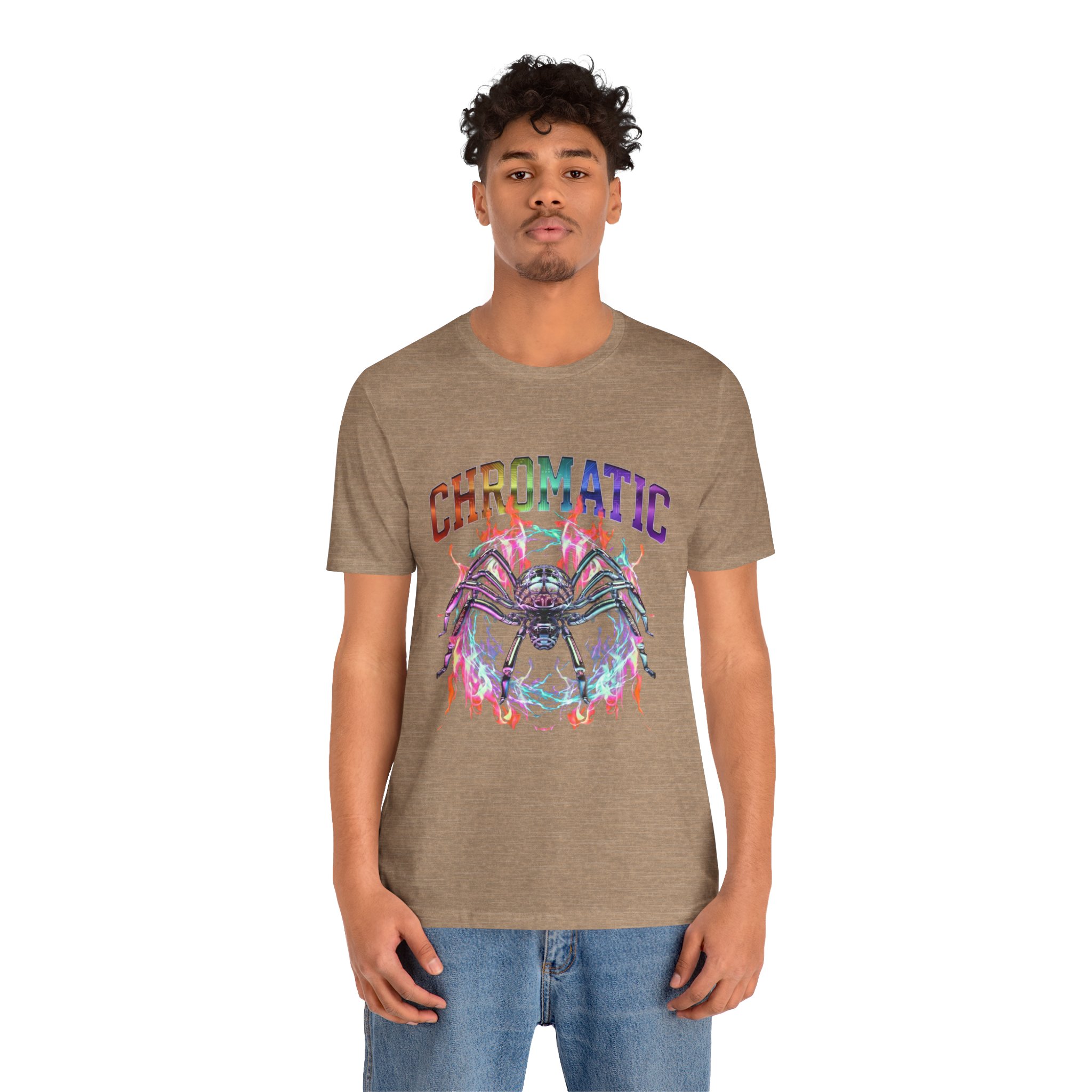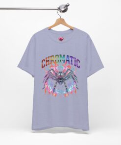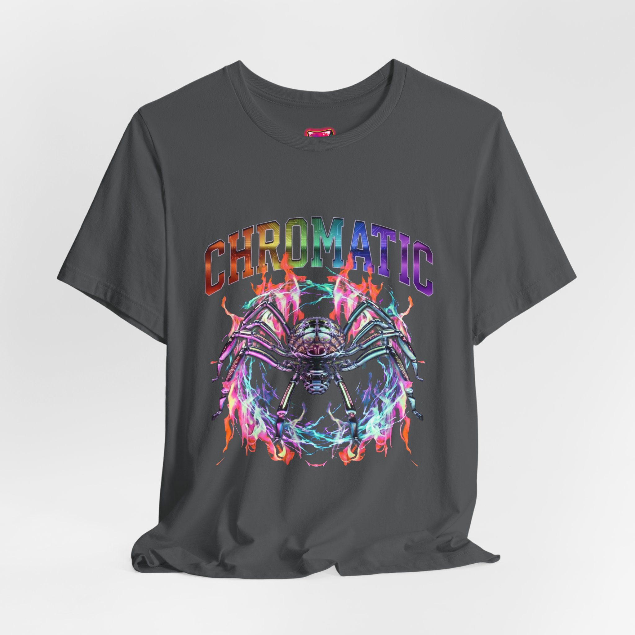 Striking graphic t-shirt design featuring a vibrant spider illustration with colorful glitch effects and bold typography that reads Chromatic. A perfect blend of edgy nature art, neon energy, and modern streetwear style for those who love unique statement fashion. Great for spider fans, alternative style lovers, and standout casual collections.