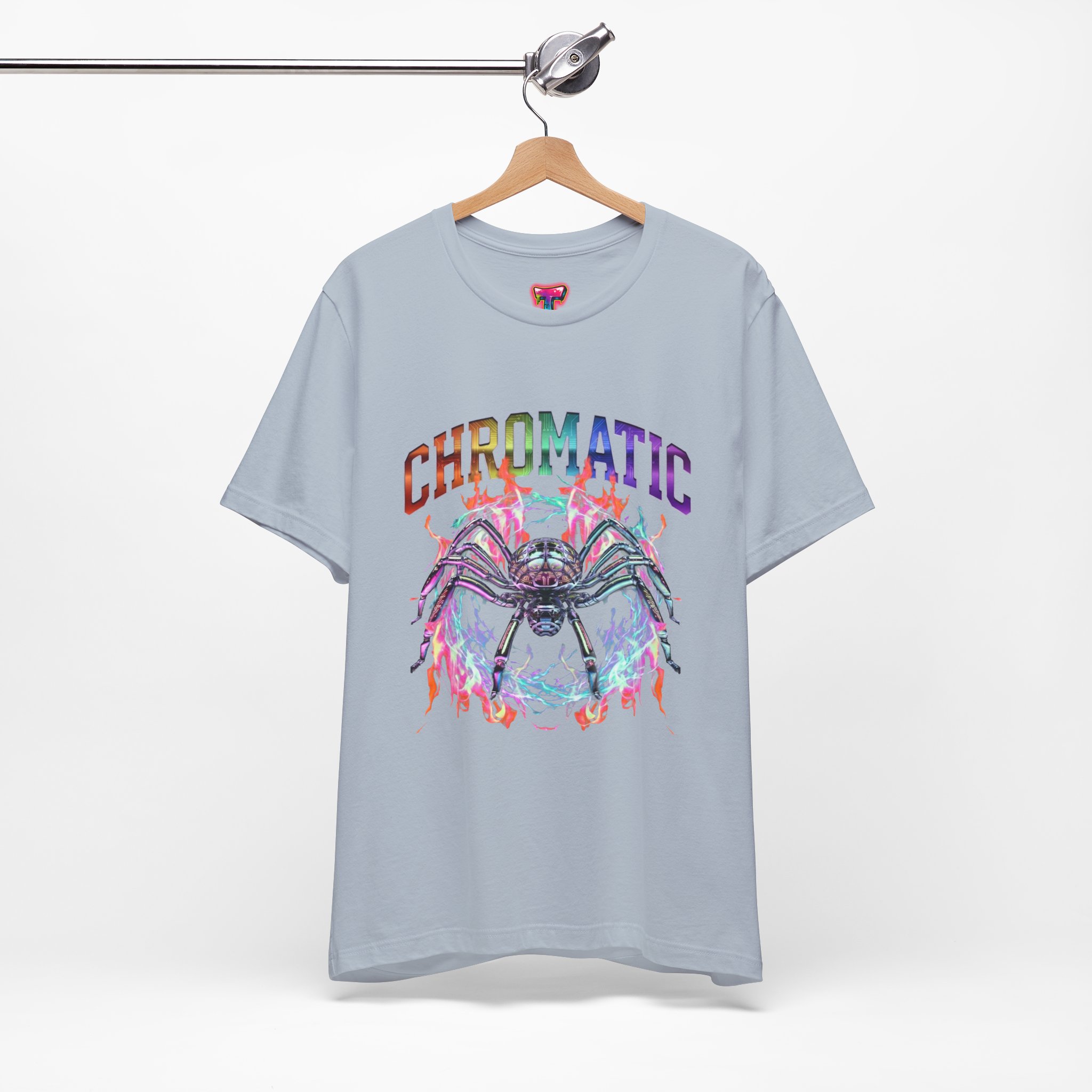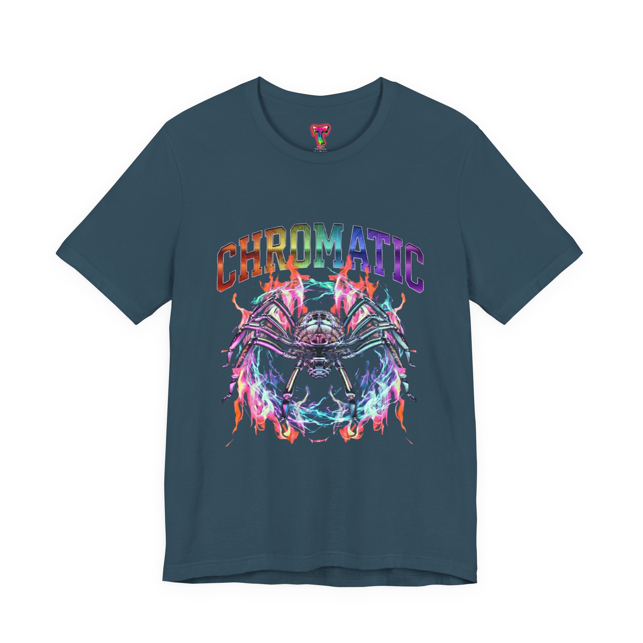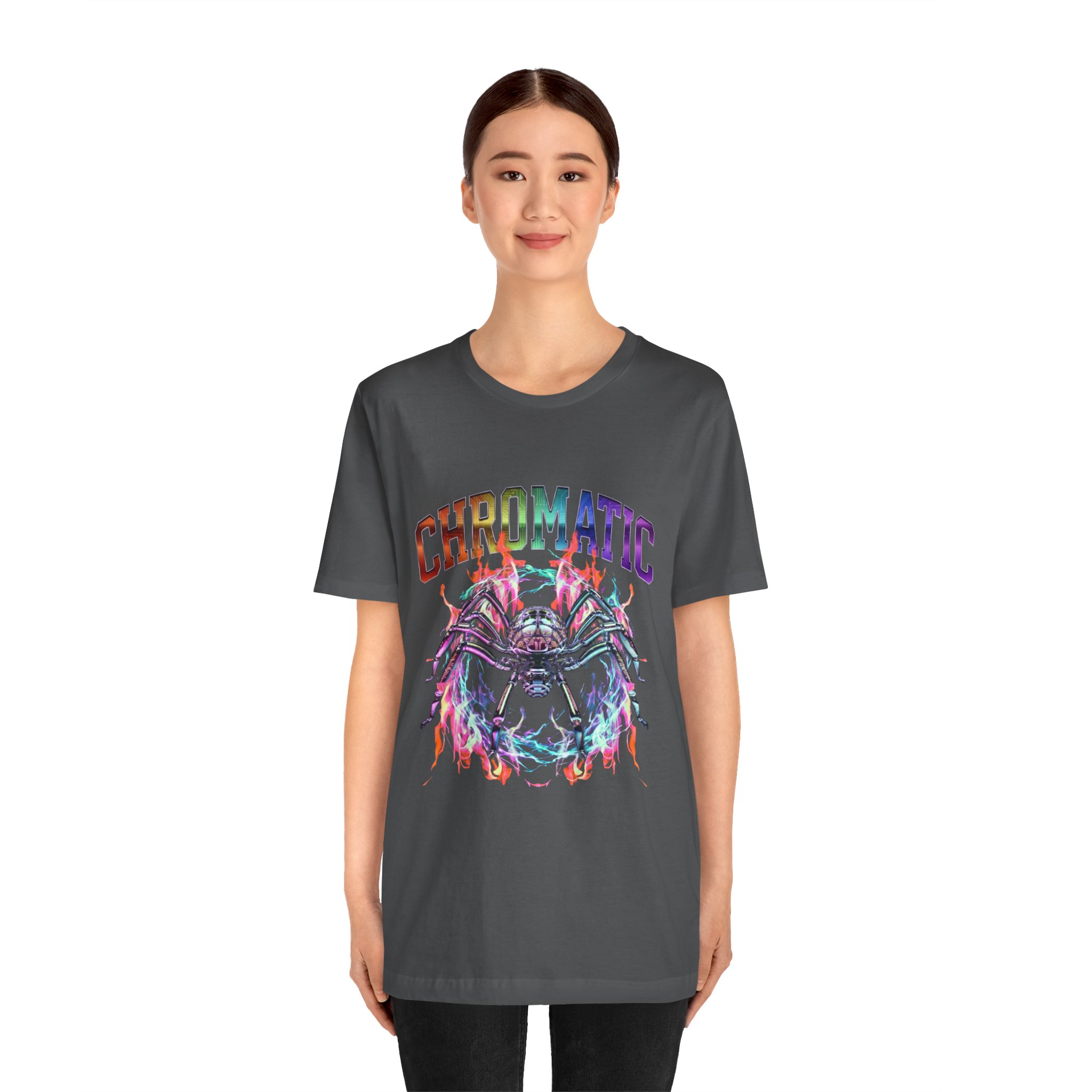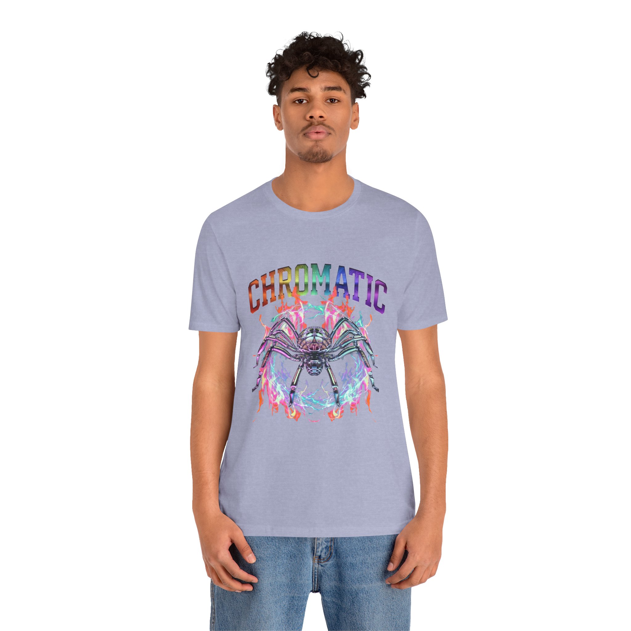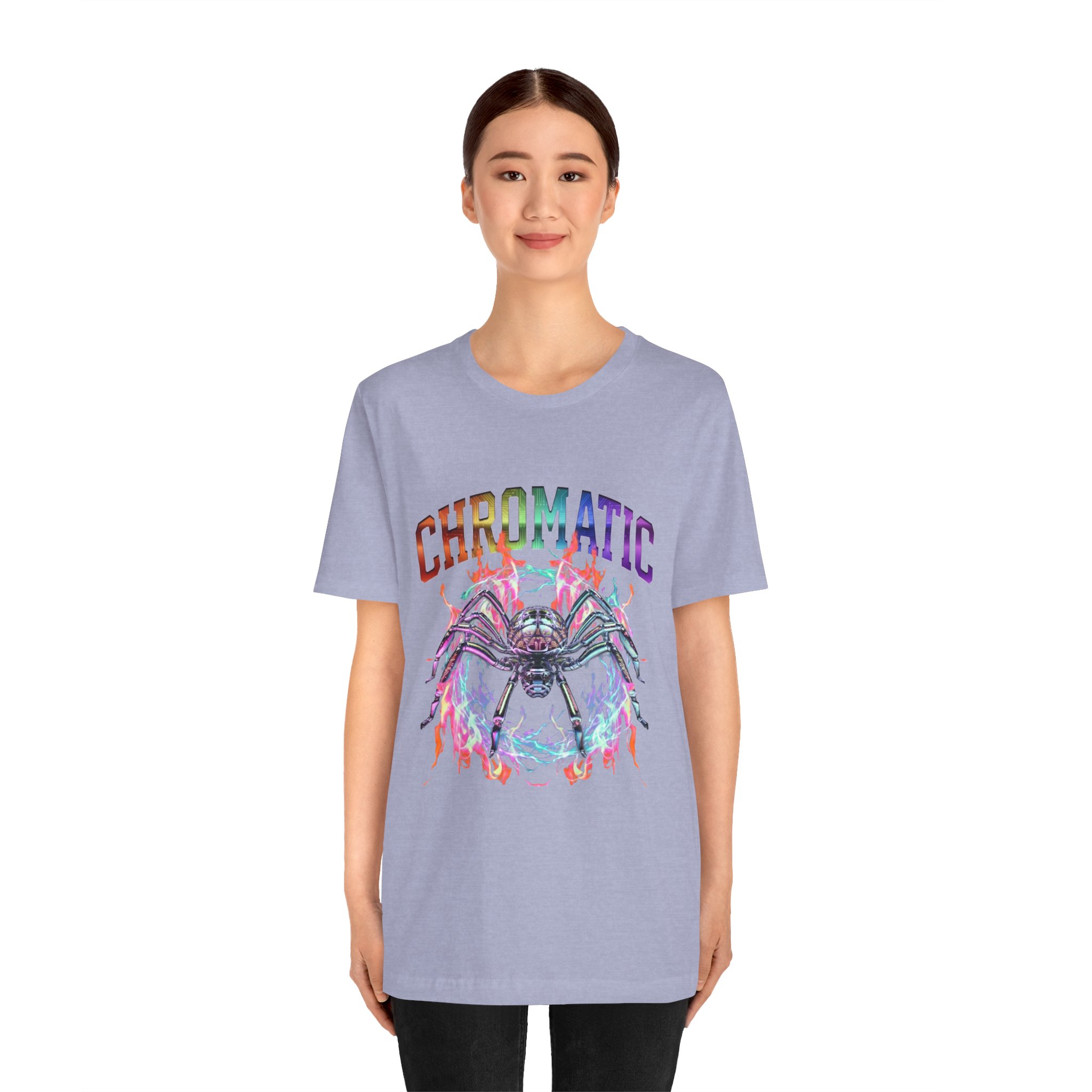 Striking graphic t-shirt design featuring a vibrant spider illustration with colorful glitch effects and bold typography that reads Chromatic. A perfect blend of edgy nature art, neon energy, and modern streetwear style for those who love unique statement fashion. Great for spider fans, alternative style lovers, and standout casual collections.