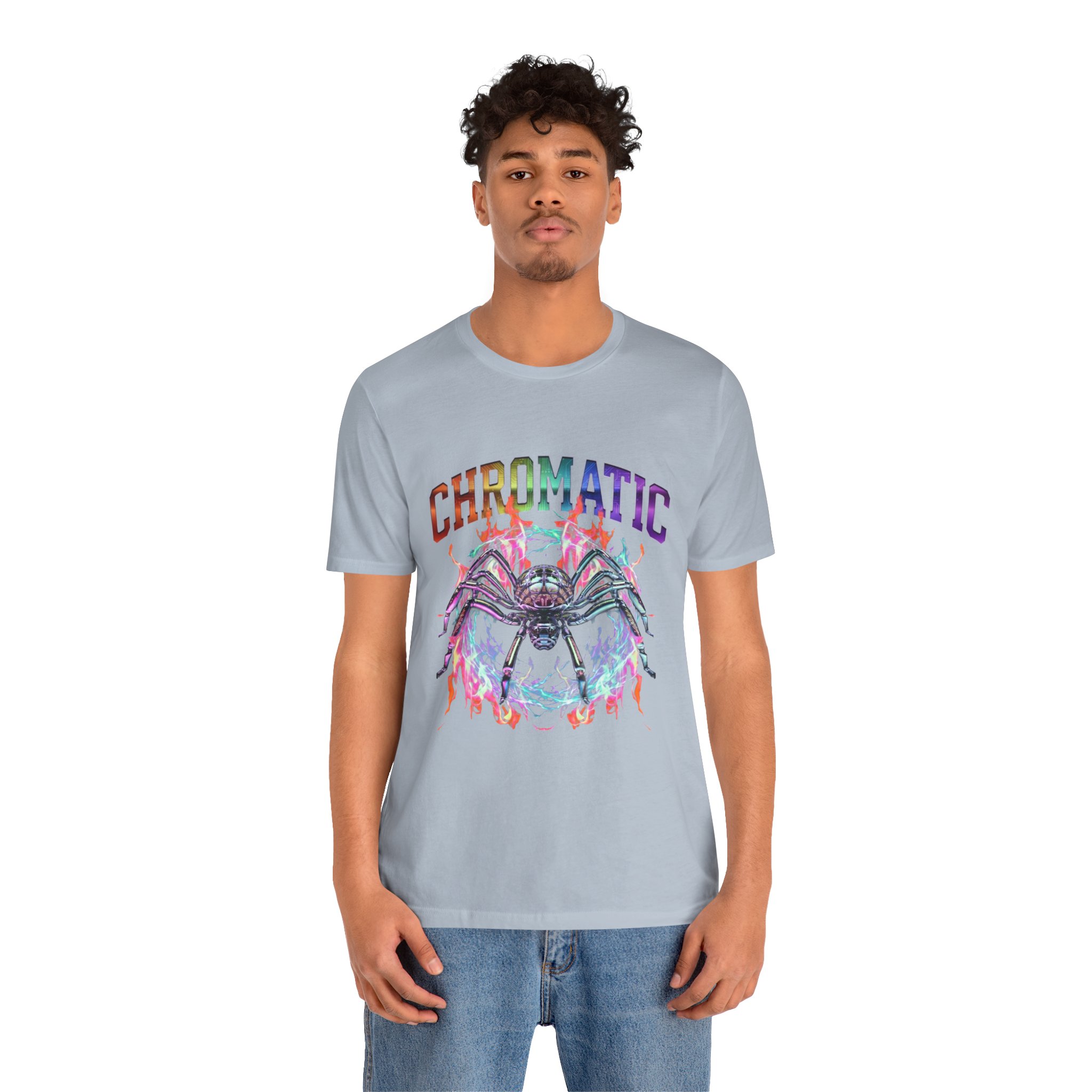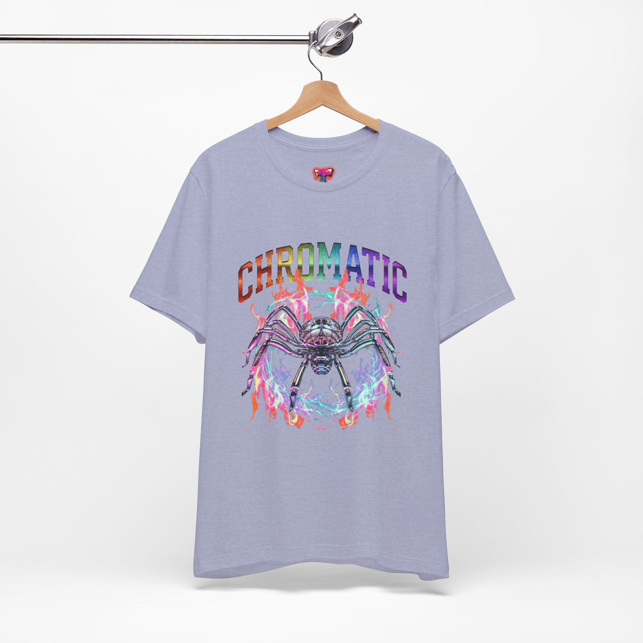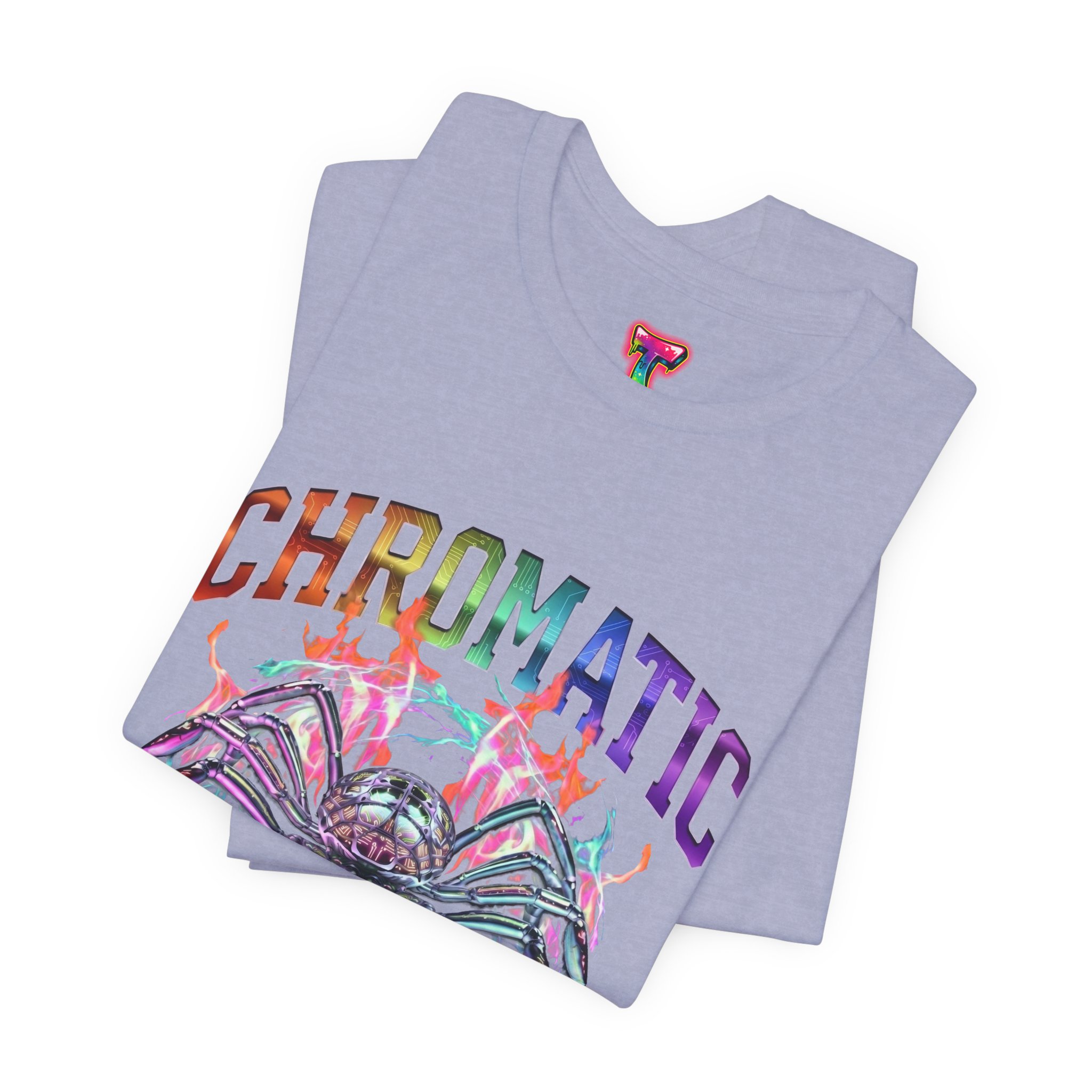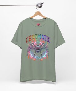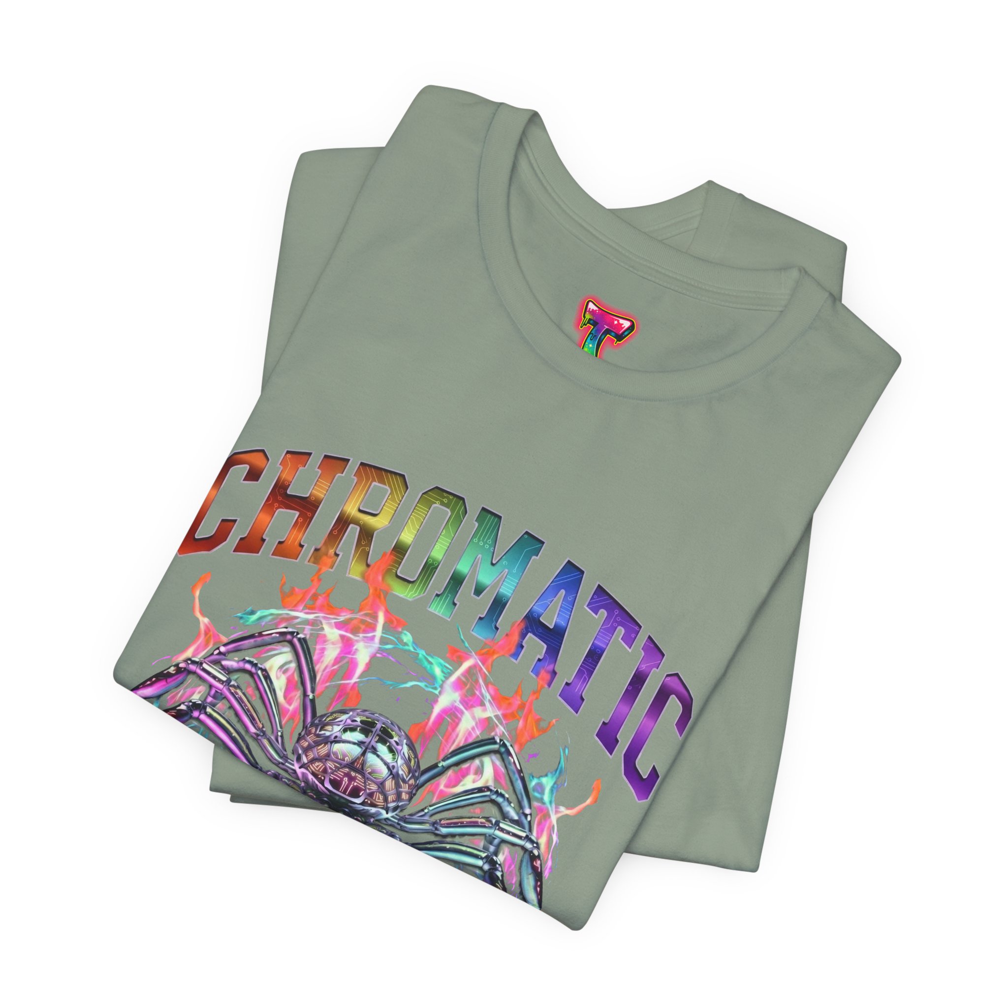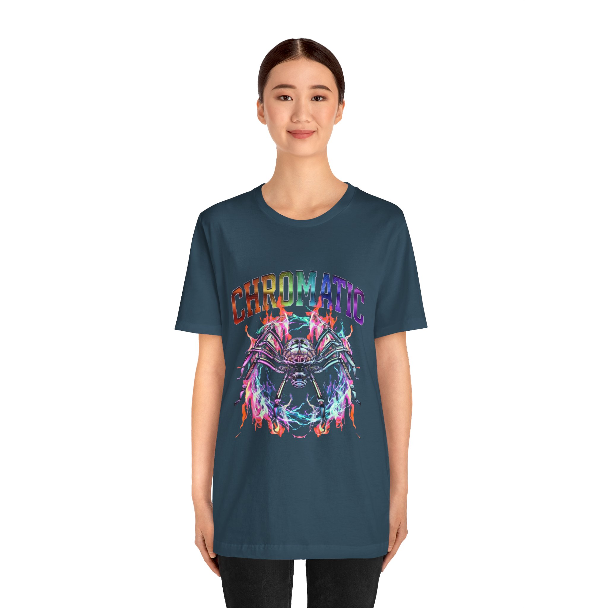 Striking graphic t-shirt design featuring a vibrant spider illustration with colorful glitch effects and bold typography that reads Chromatic. A perfect blend of edgy nature art, neon energy, and modern streetwear style for those who love unique statement fashion. Great for spider fans, alternative style lovers, and standout casual collections.