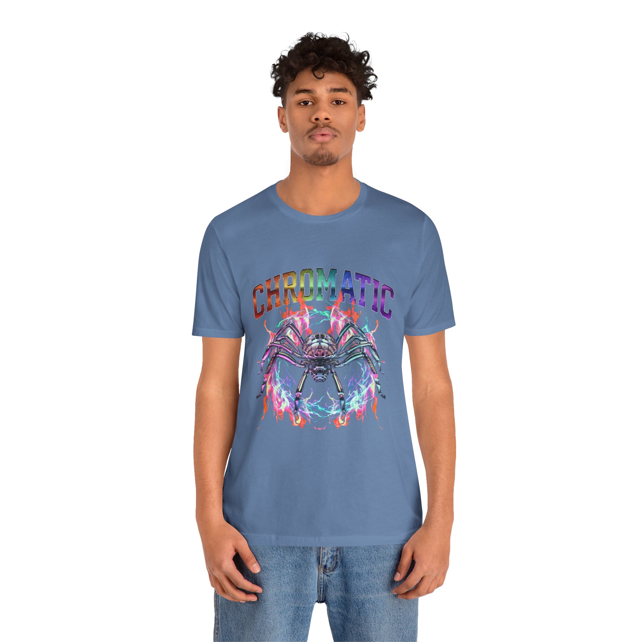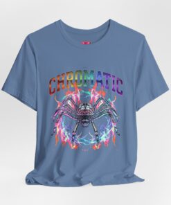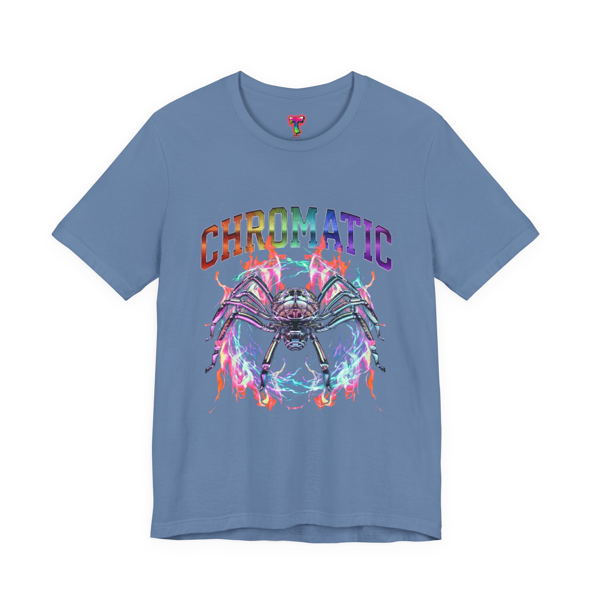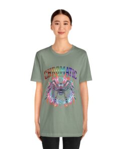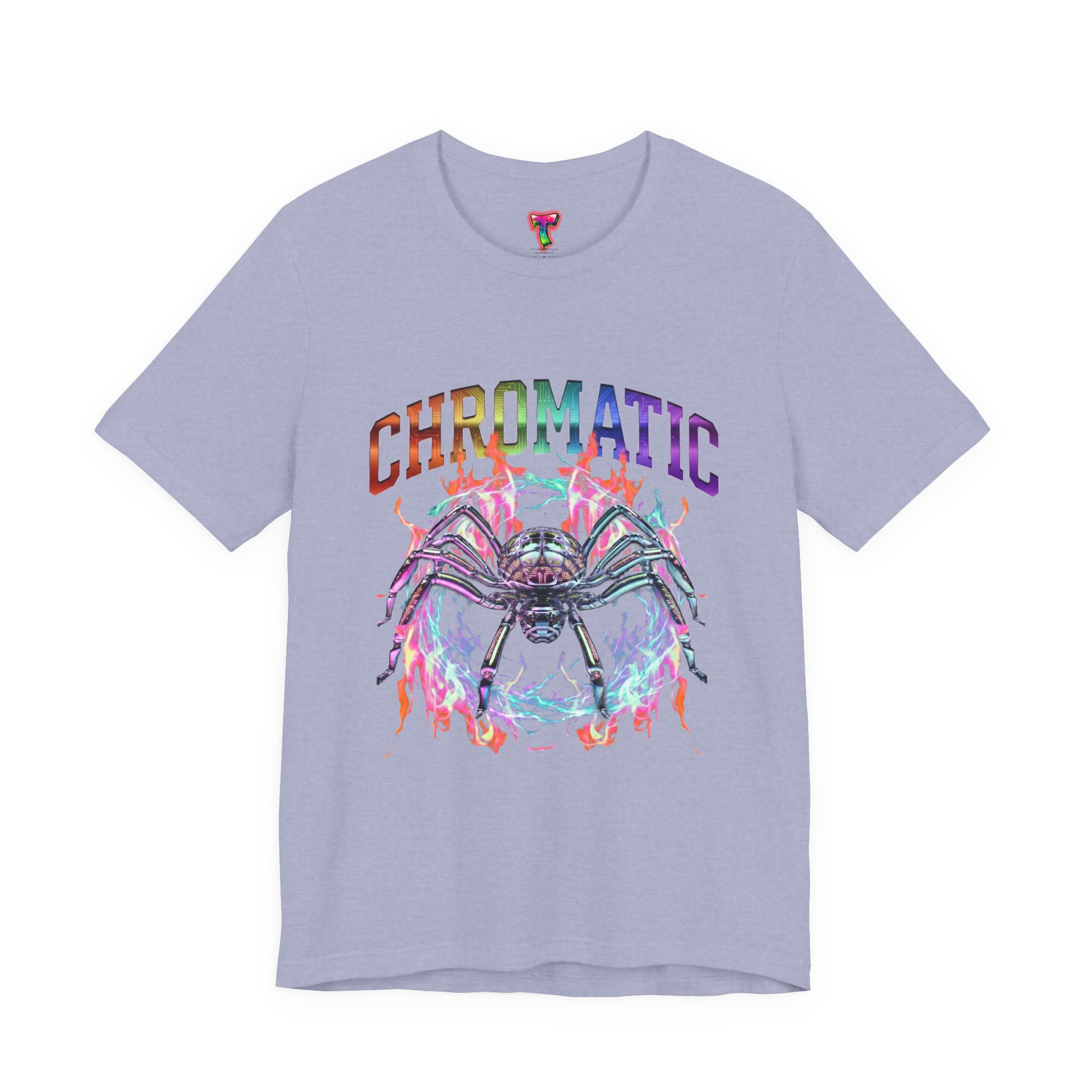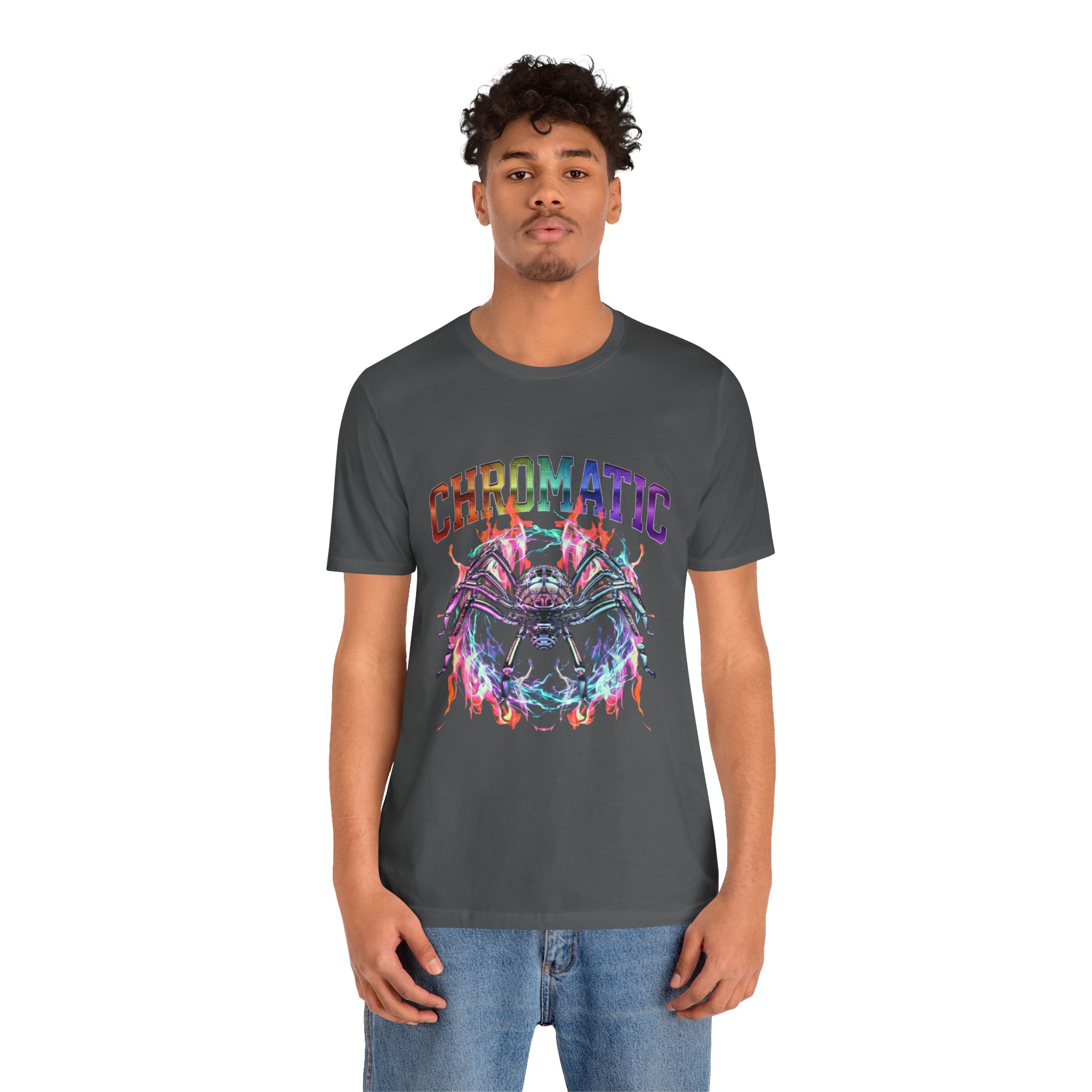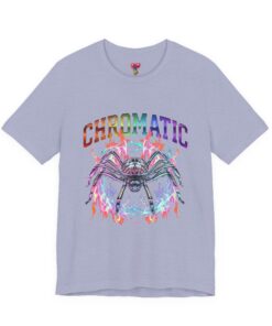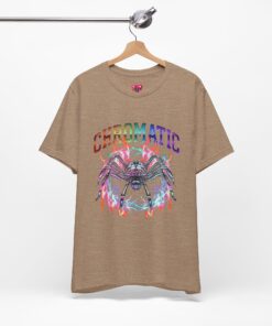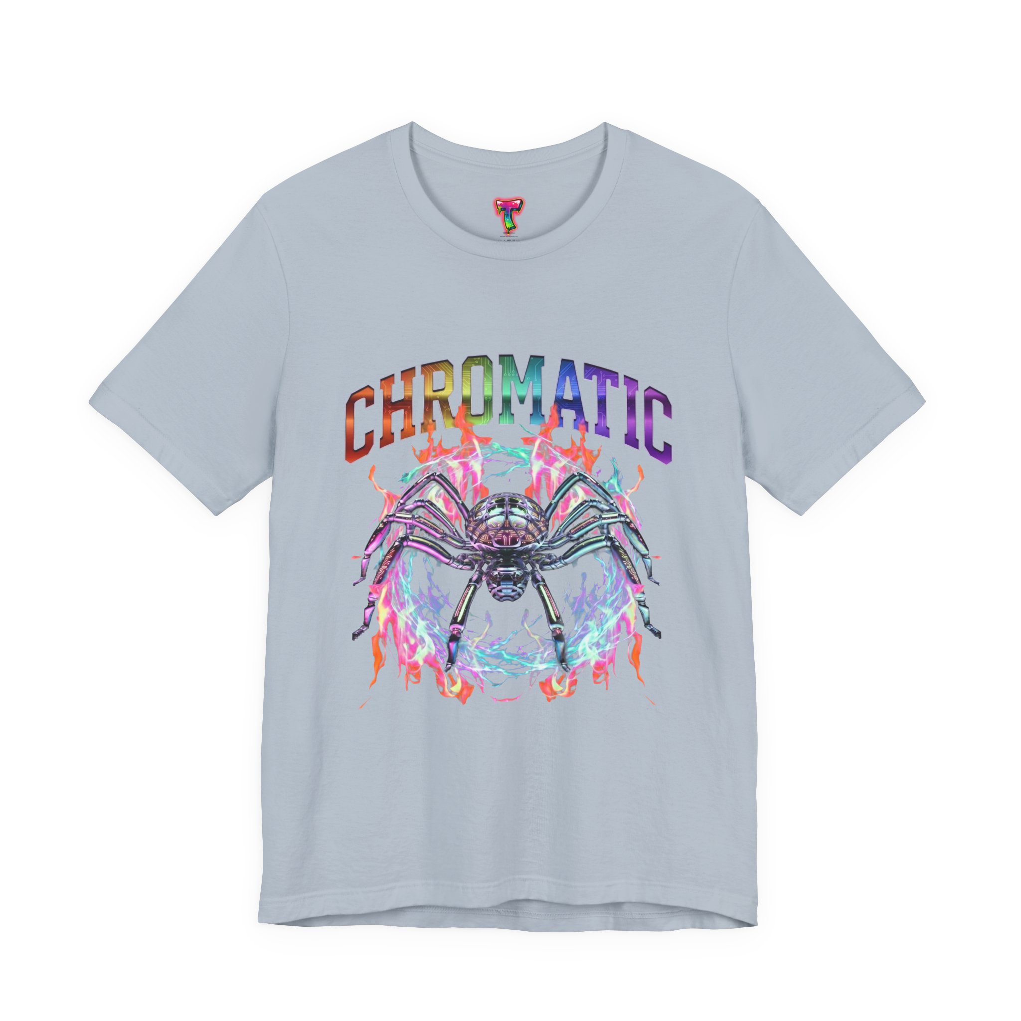 Striking graphic t-shirt design featuring a vibrant spider illustration with colorful glitch effects and bold typography that reads Chromatic. A perfect blend of edgy nature art, neon energy, and modern streetwear style for those who love unique statement fashion. Great for spider fans, alternative style lovers, and standout casual collections.