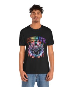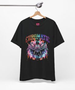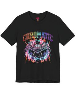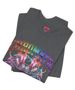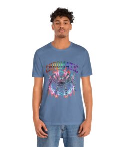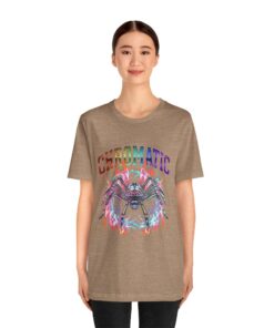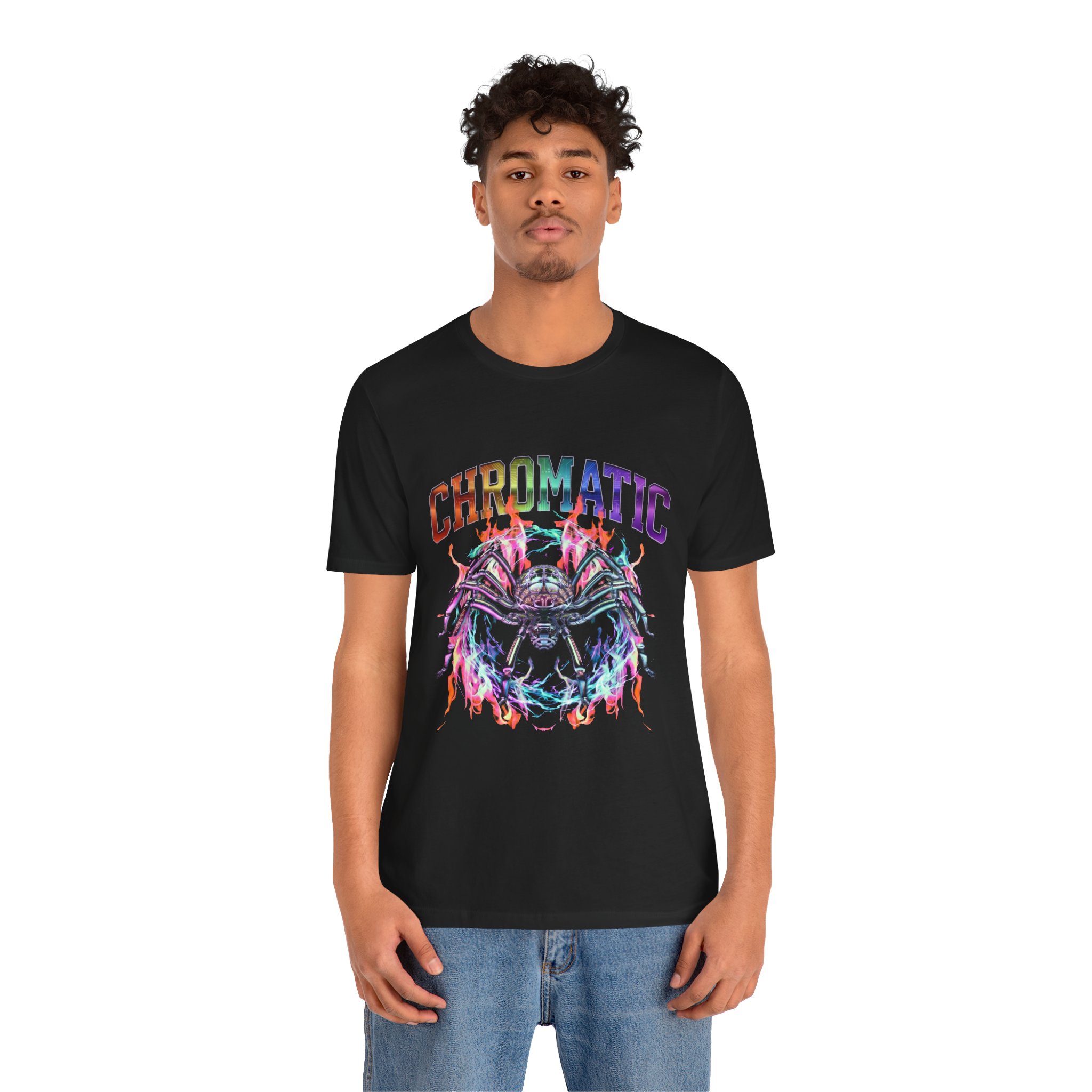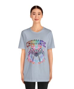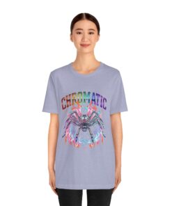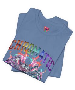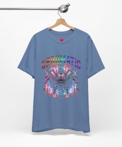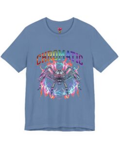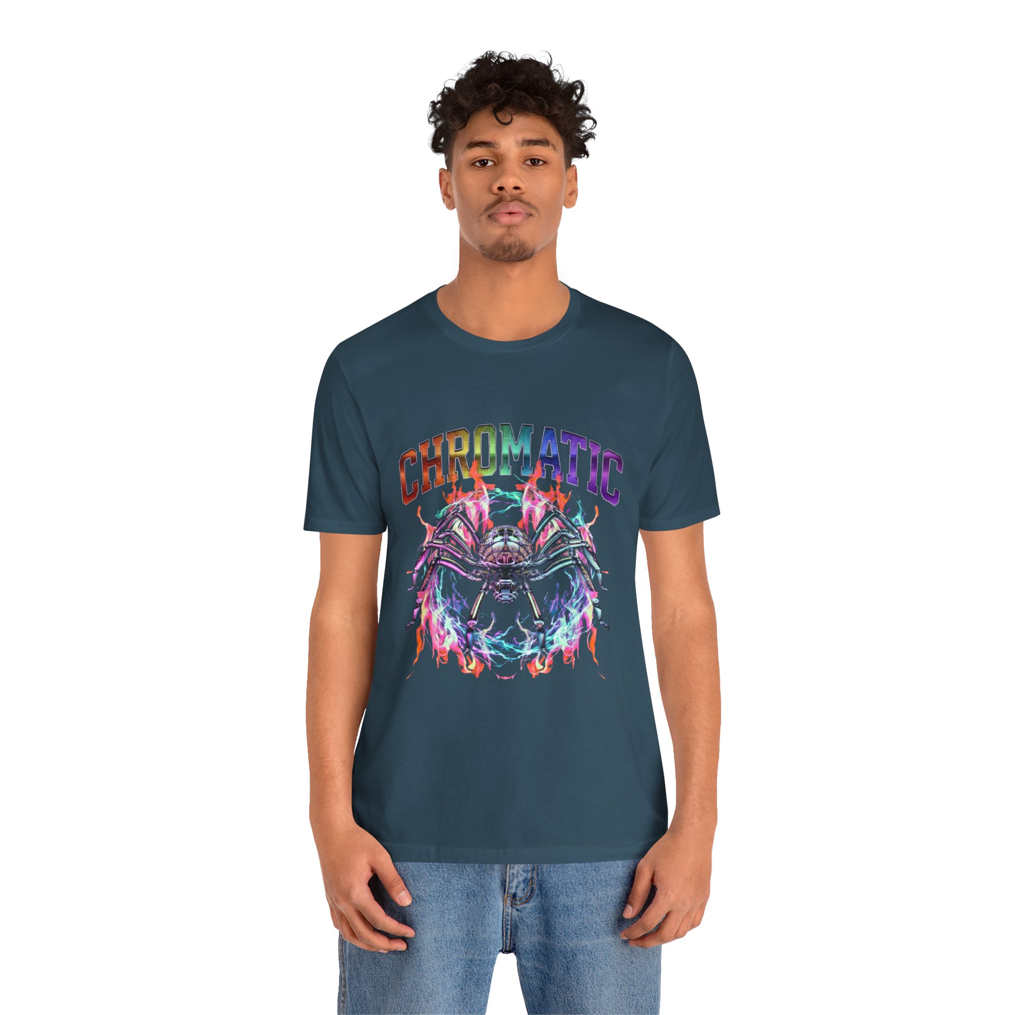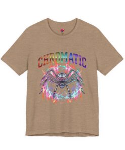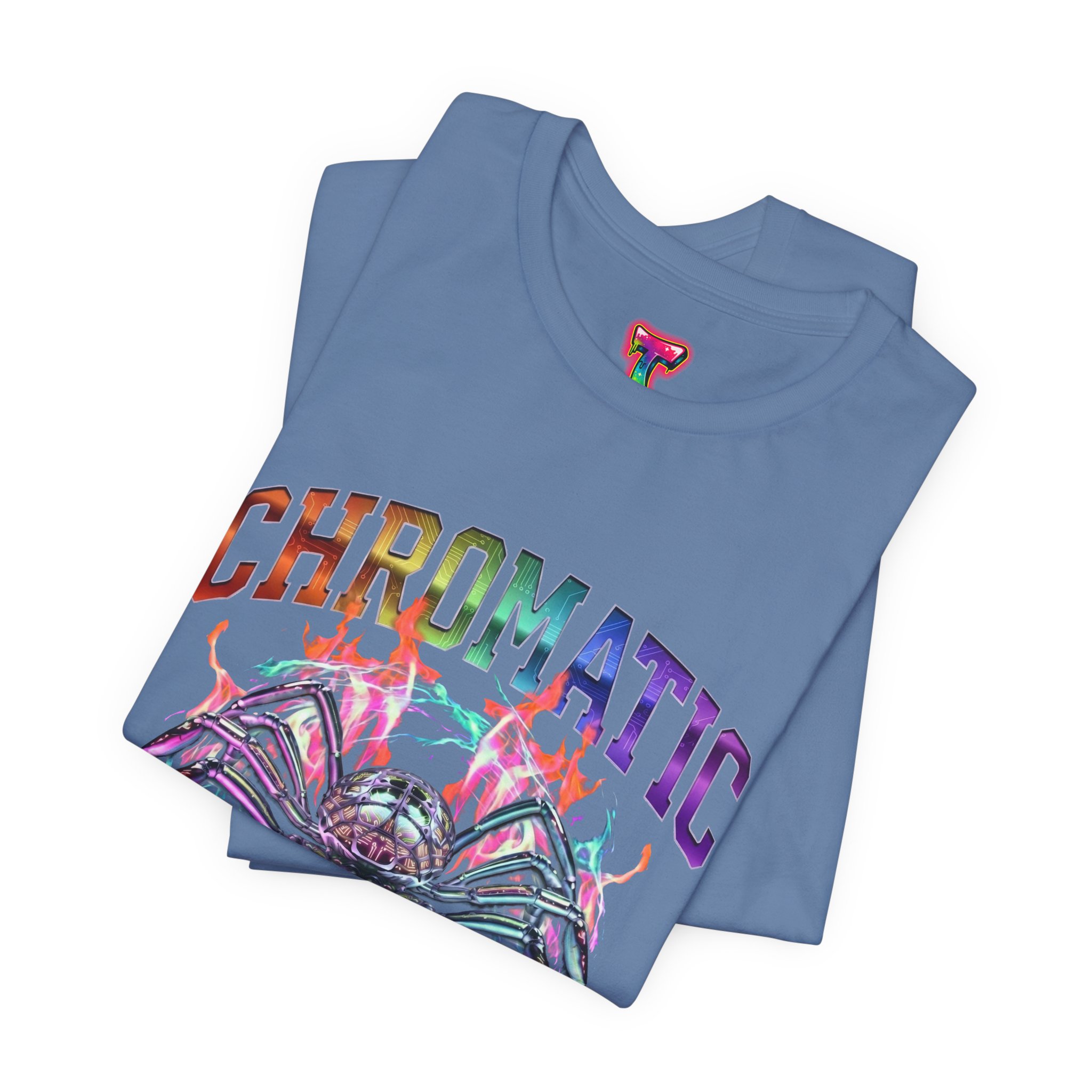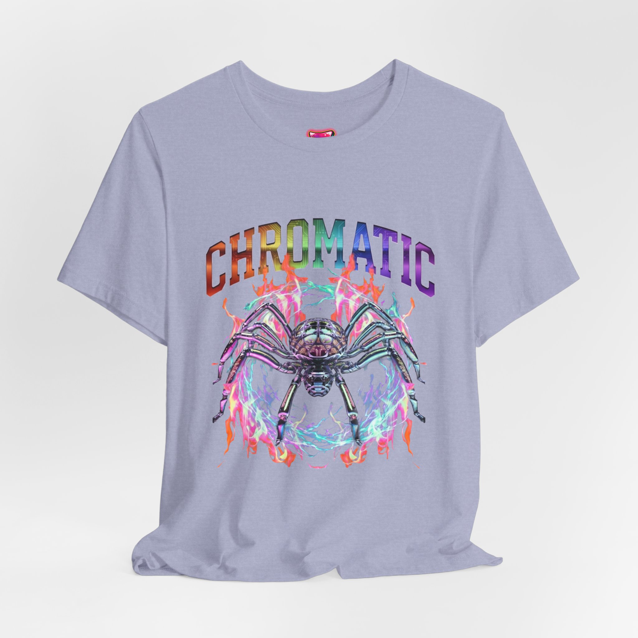 Striking graphic t-shirt design featuring a vibrant spider illustration with colorful glitch effects and bold typography that reads Chromatic. A perfect blend of edgy nature art, neon energy, and modern streetwear style for those who love unique statement fashion. Great for spider fans, alternative style lovers, and standout casual collections.