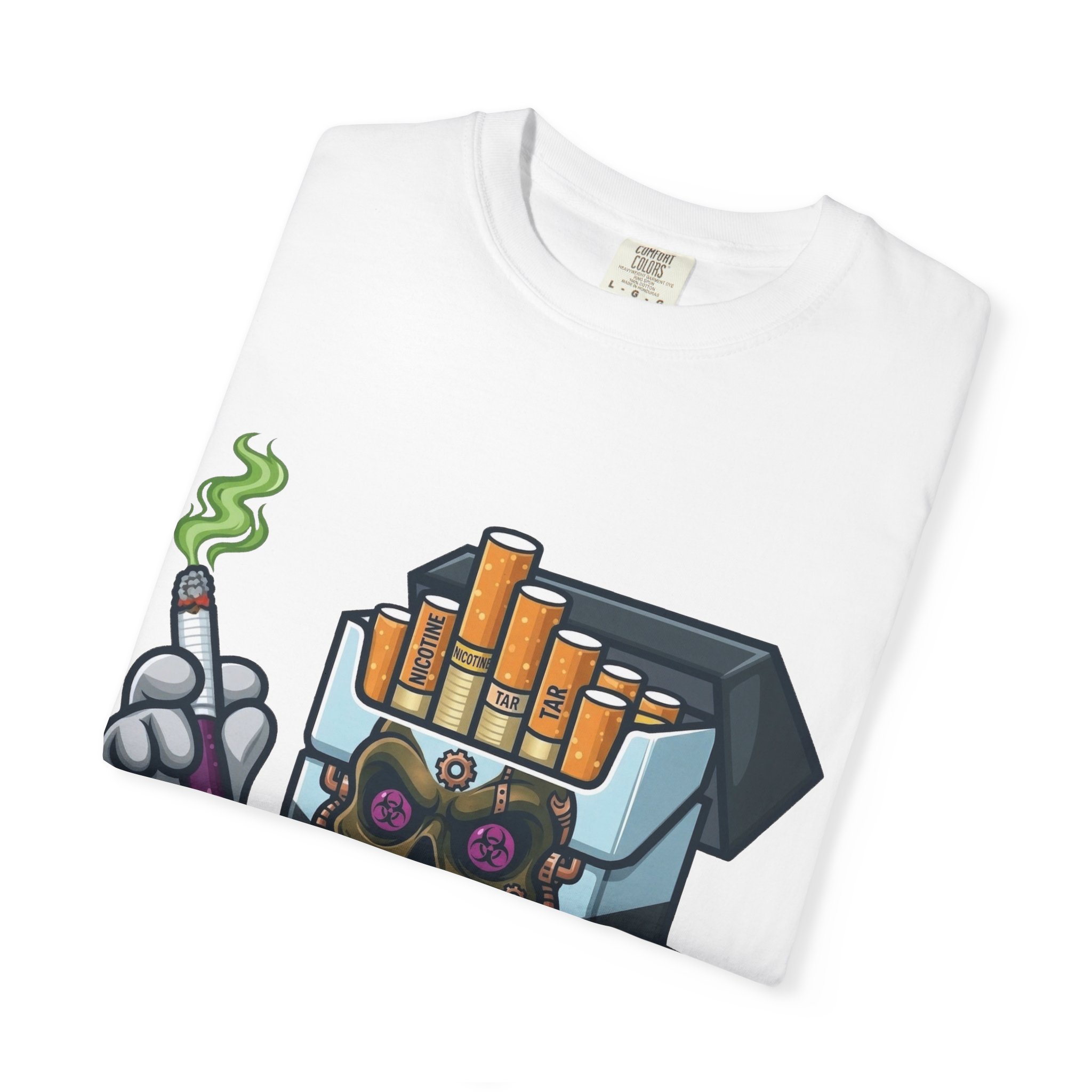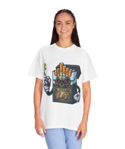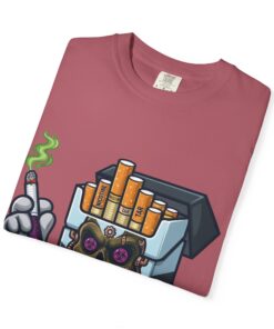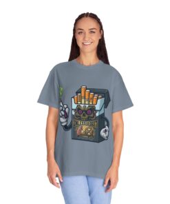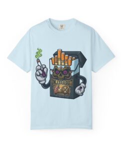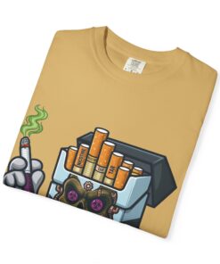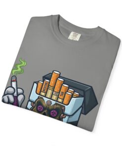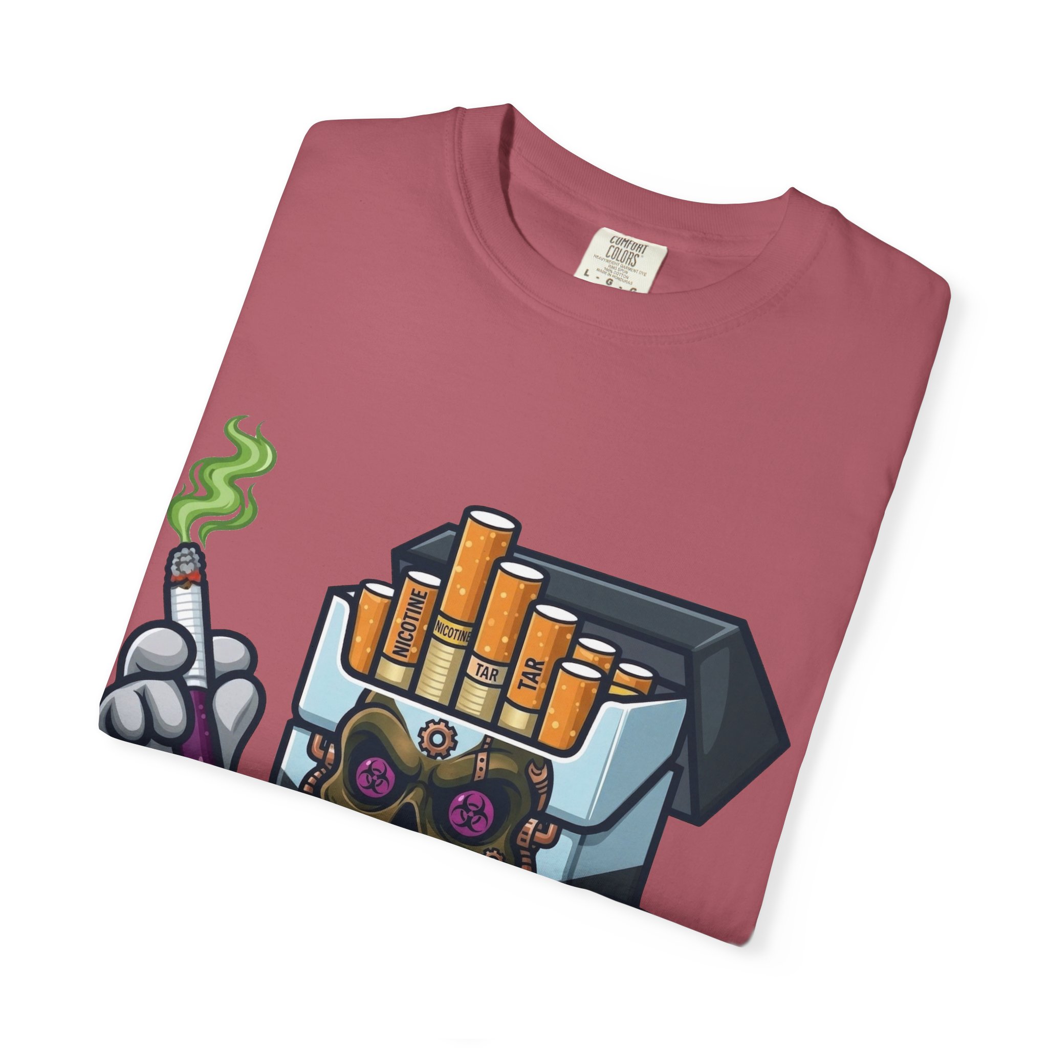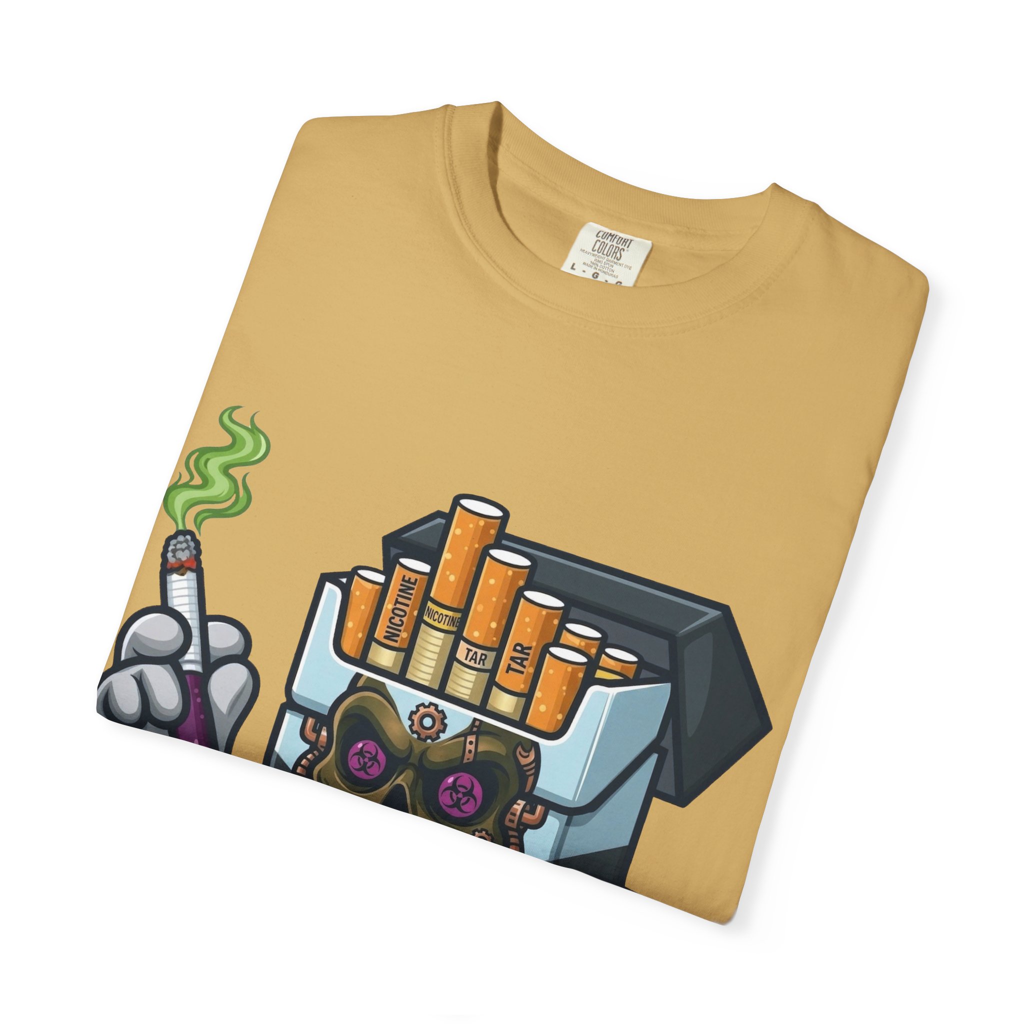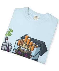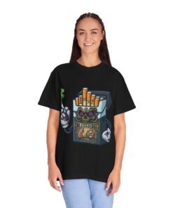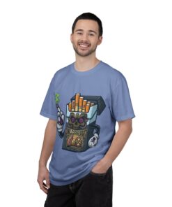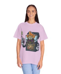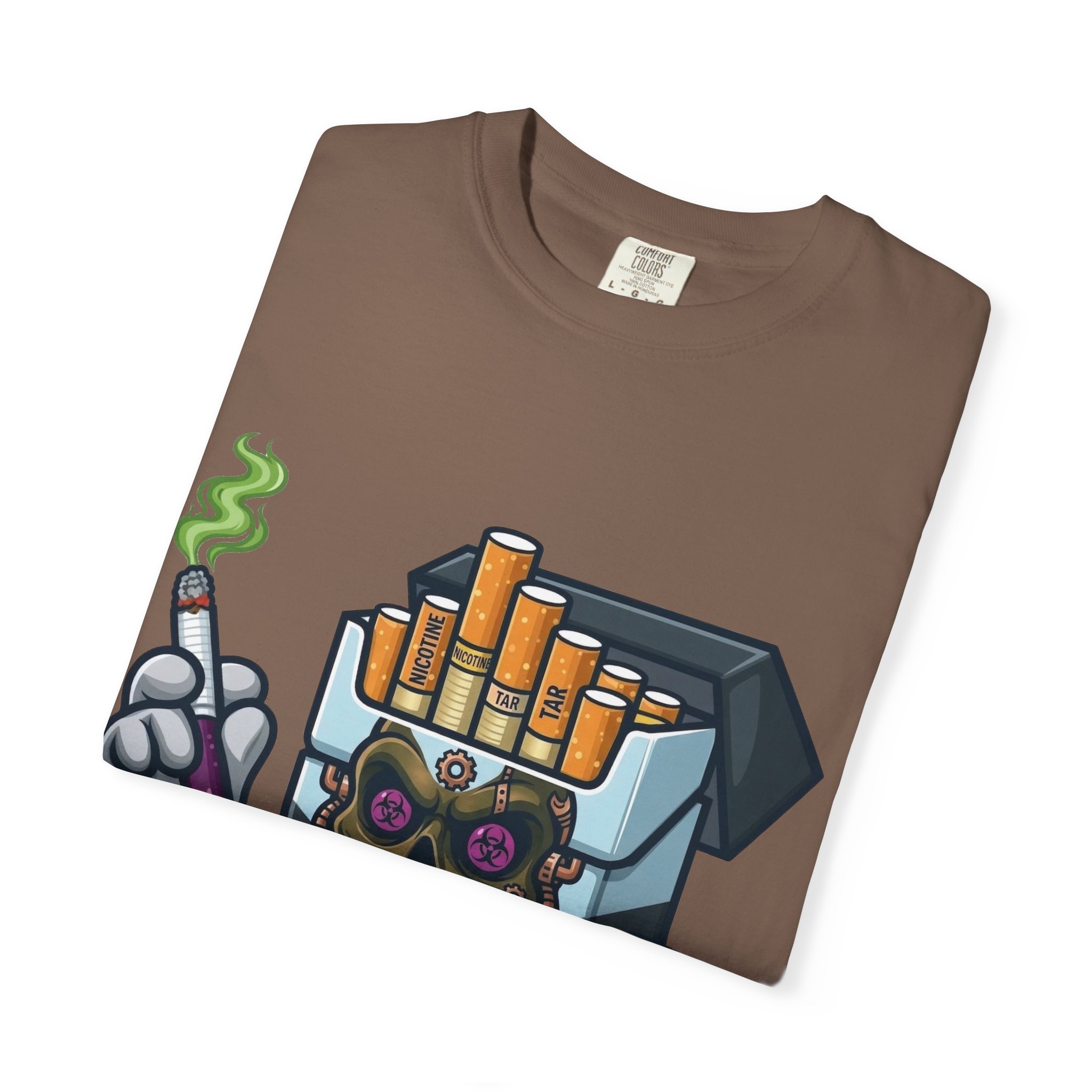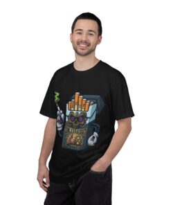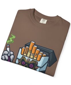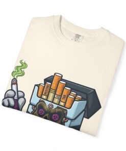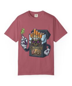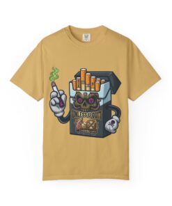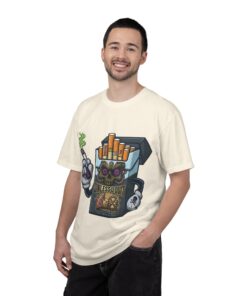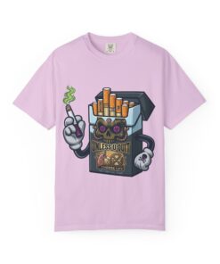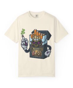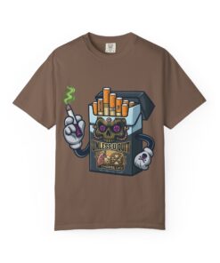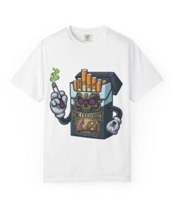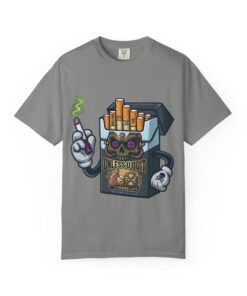 Edgy graphic t-shirt design featuring a cartoon cigarette pack character with attitude, smoke details, and bold street-art styling. Packed with rebellious energy and playful character design, this shirt is perfect for fans of dark humor, urban graphics, and standout casual fashion. A bold statement piece for streetwear collections and novelty apparel lovers.