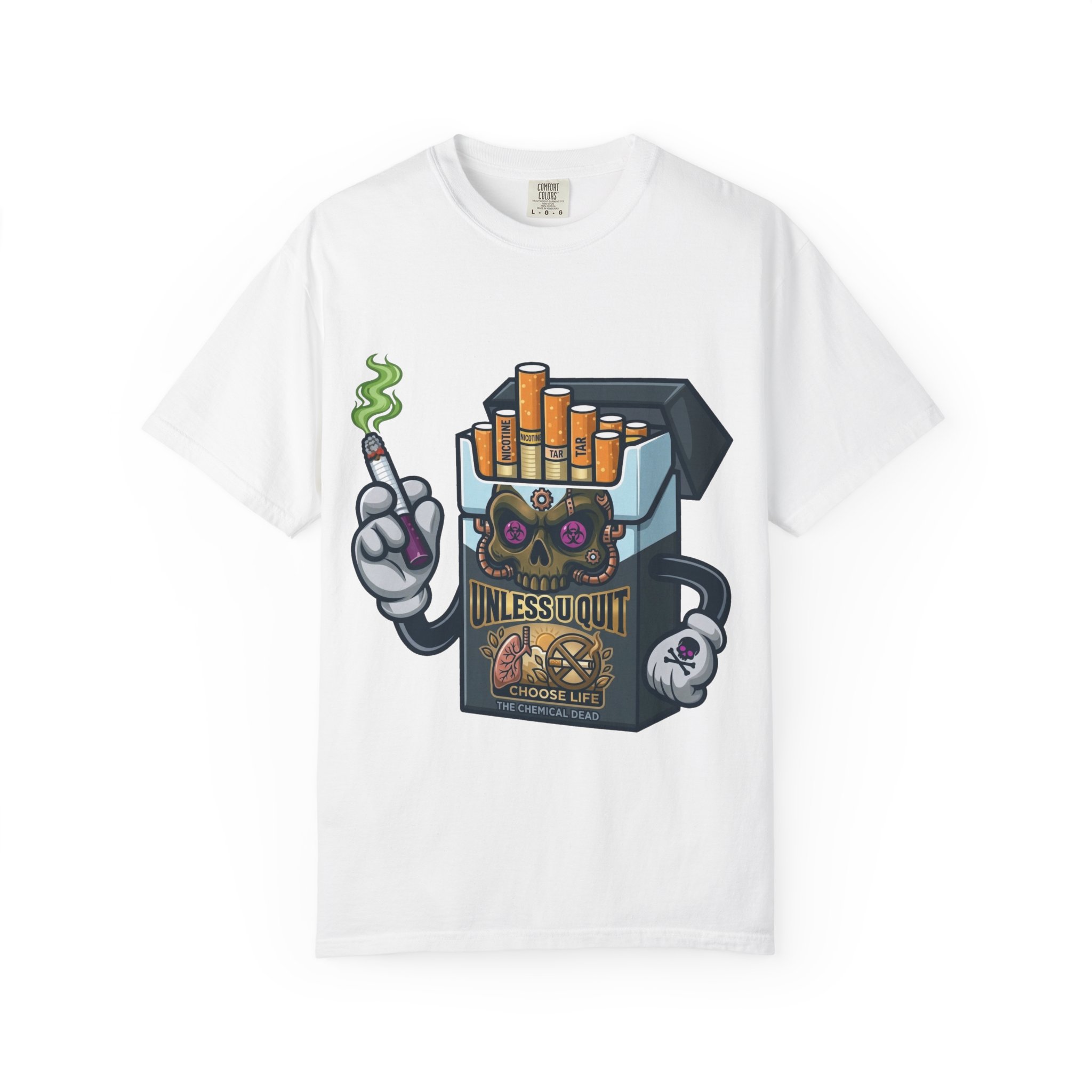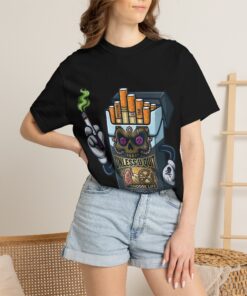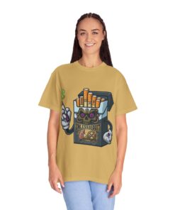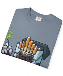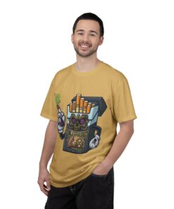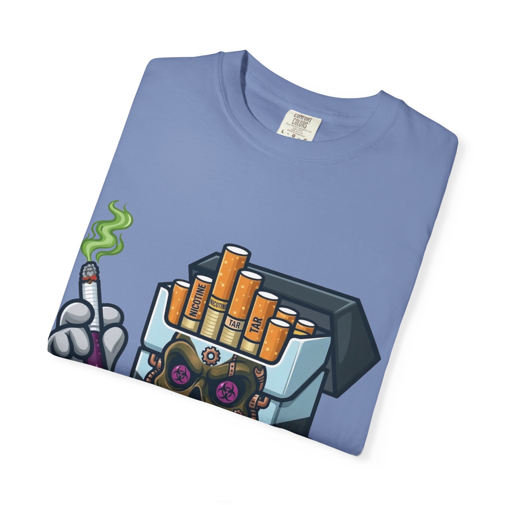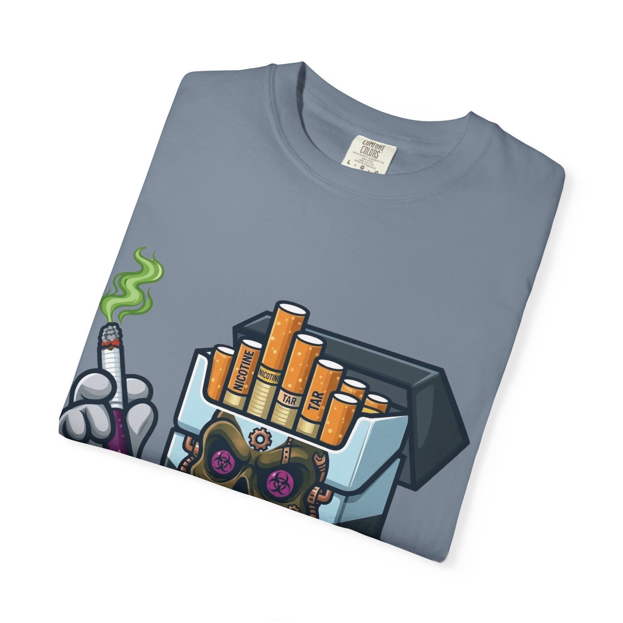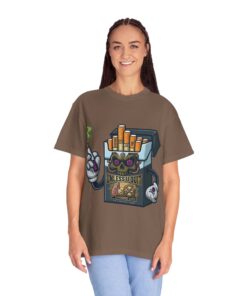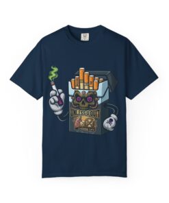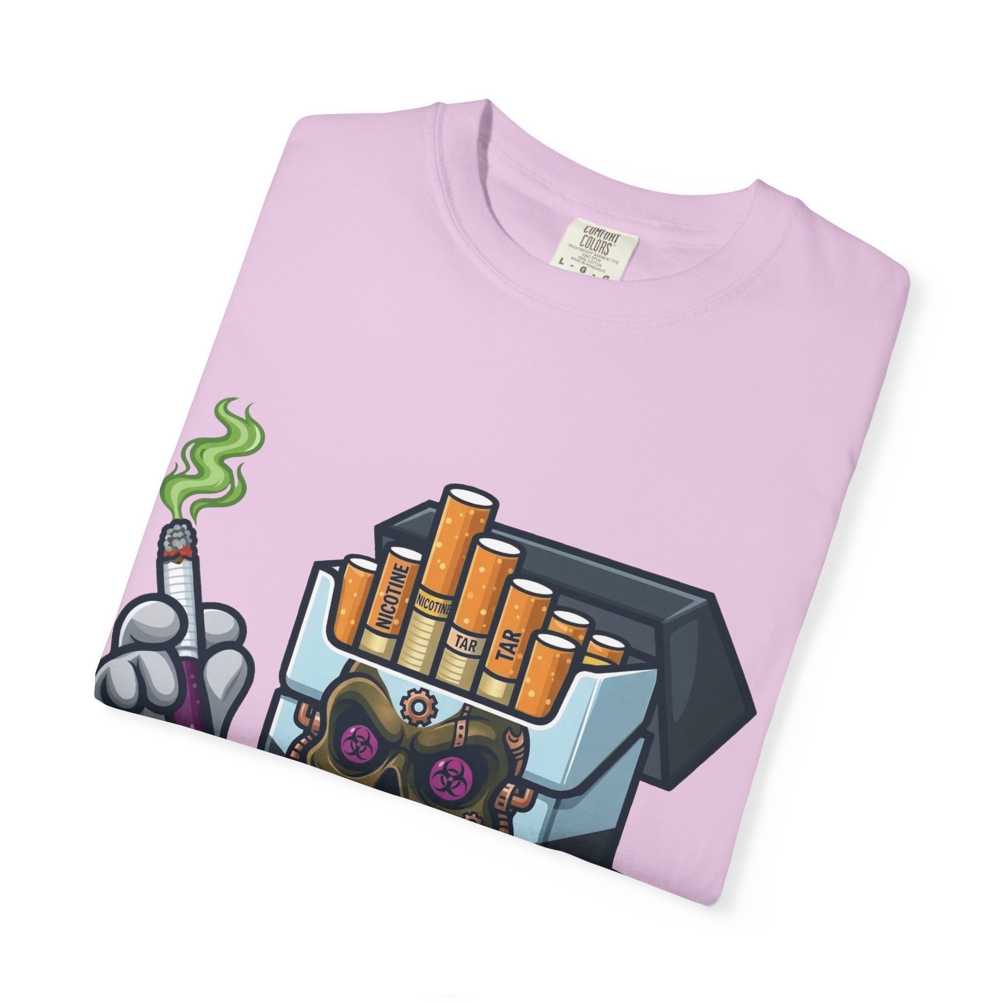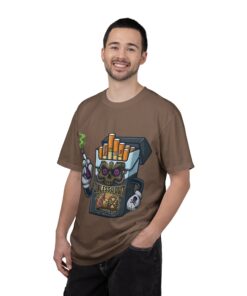 Edgy graphic t-shirt design featuring a cartoon cigarette pack character with attitude, smoke details, and bold street-art styling. Packed with rebellious energy and playful character design, this shirt is perfect for fans of dark humor, urban graphics, and standout casual fashion. A bold statement piece for streetwear collections and novelty apparel lovers.