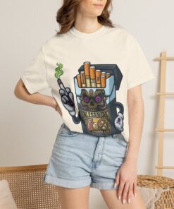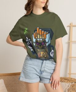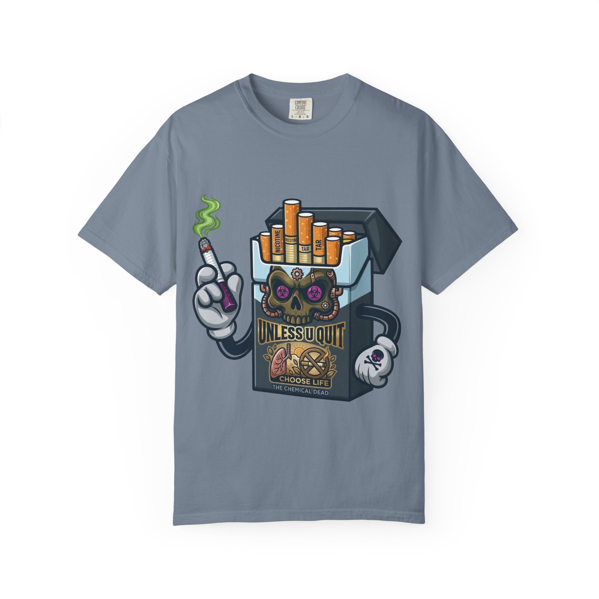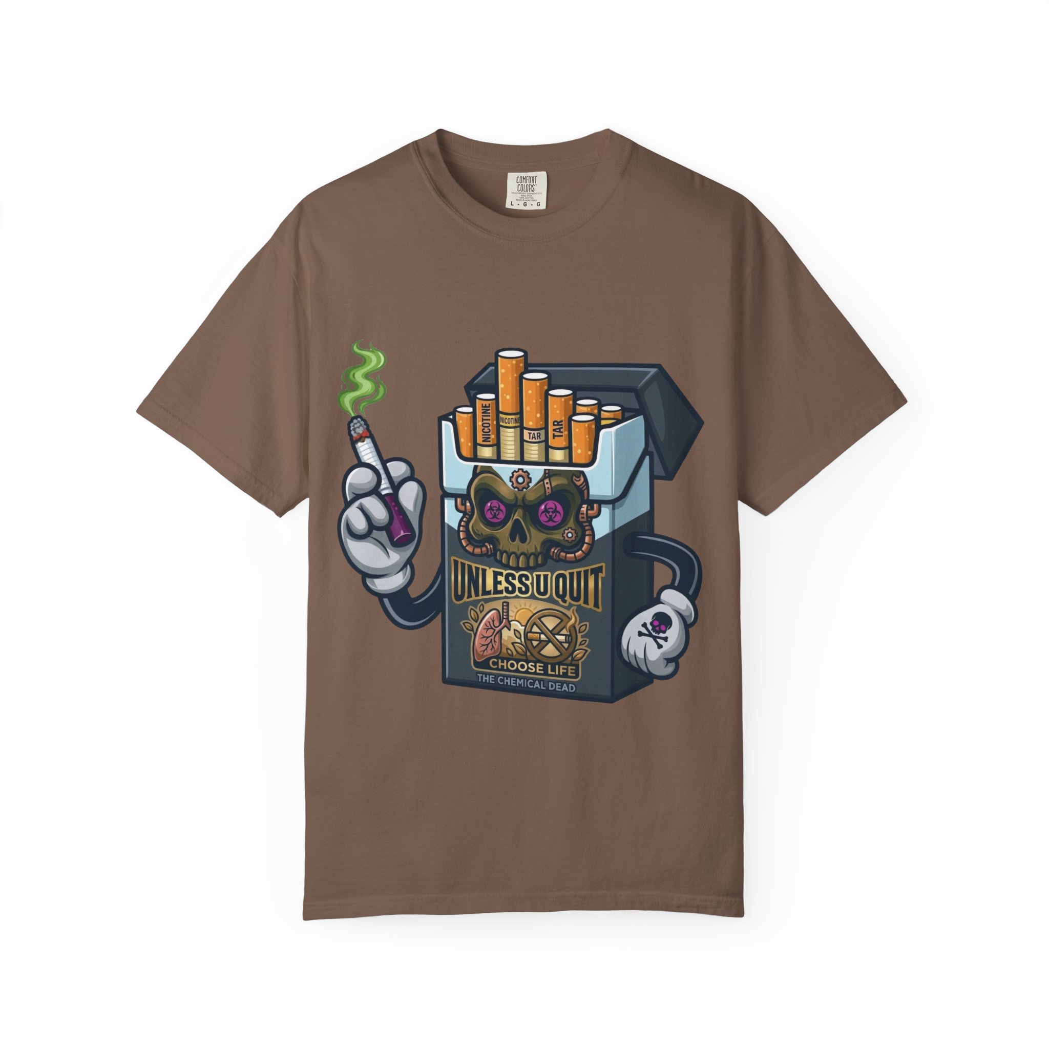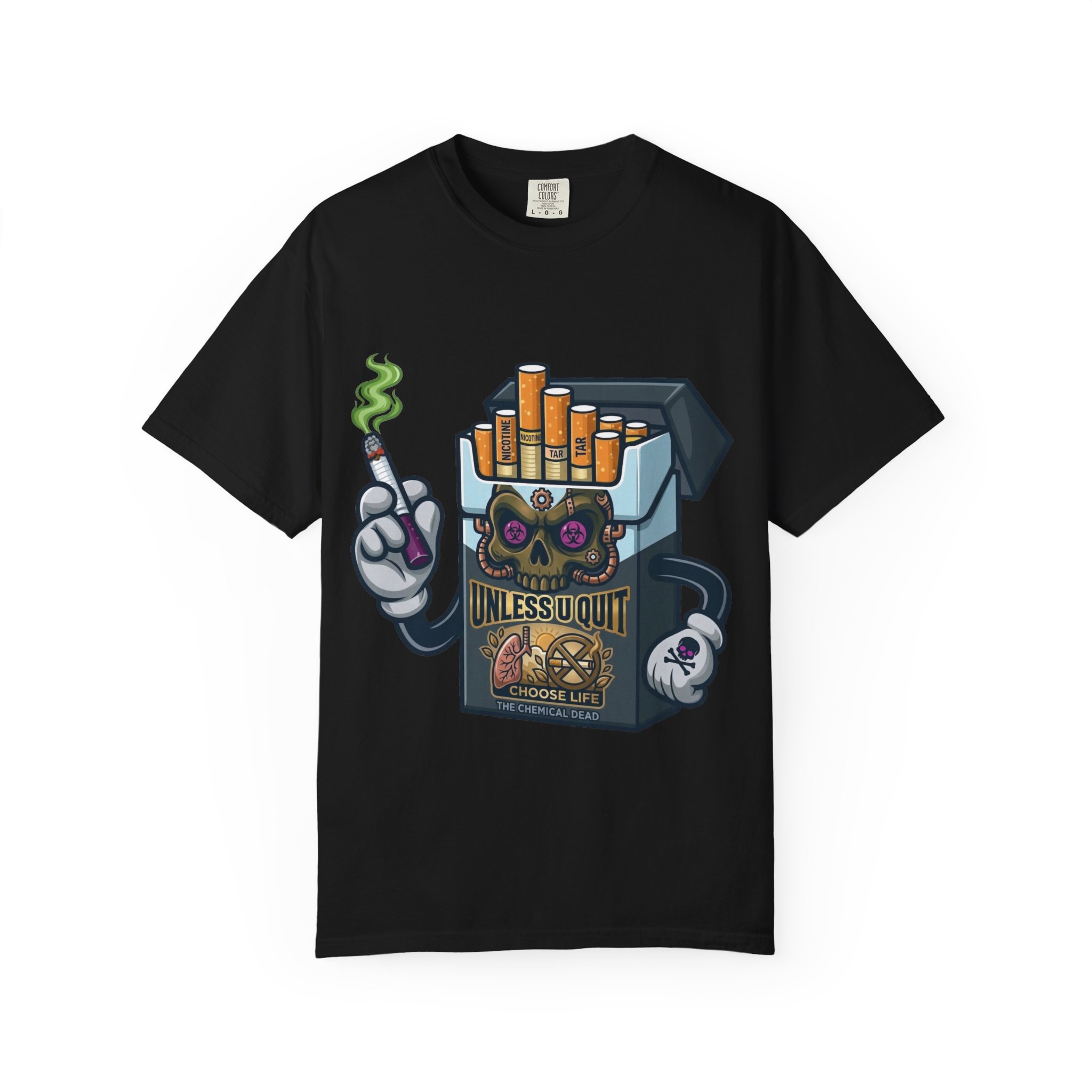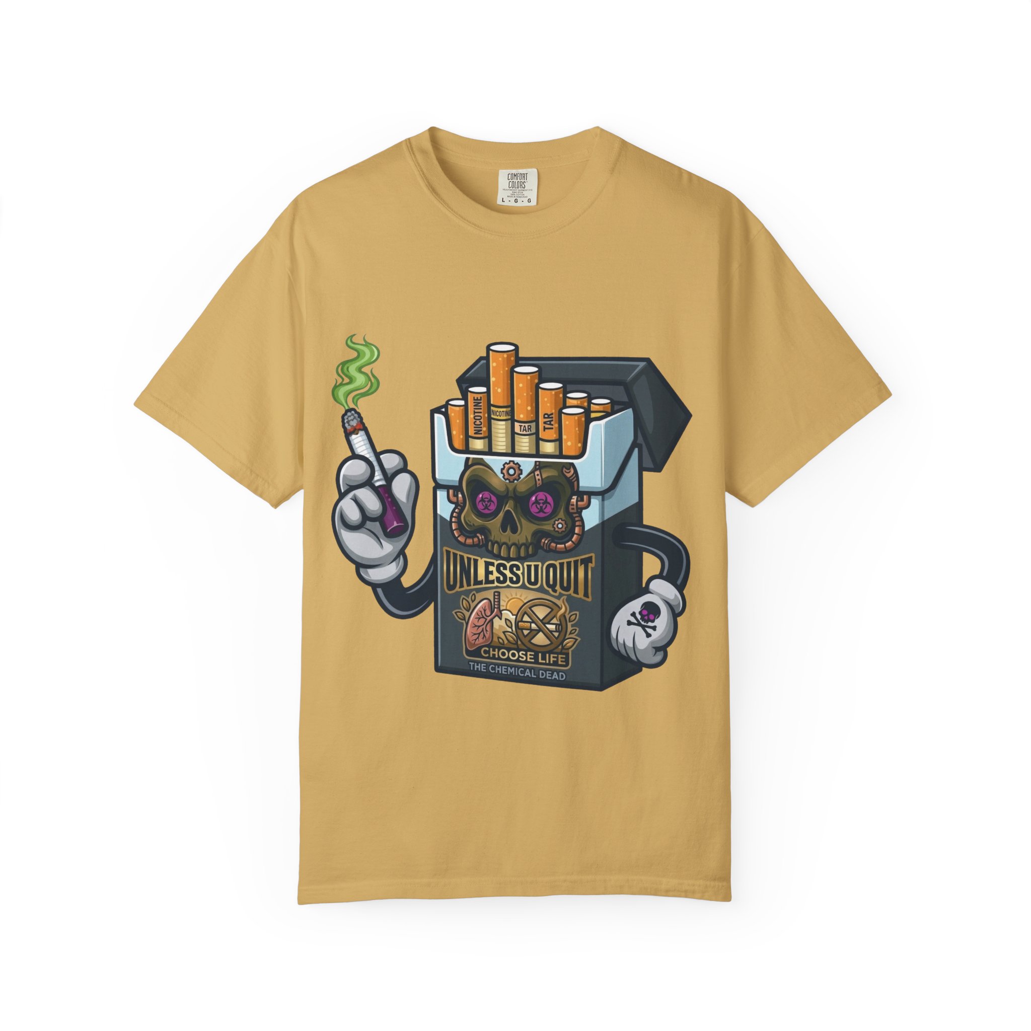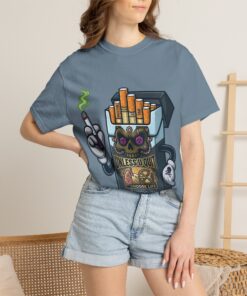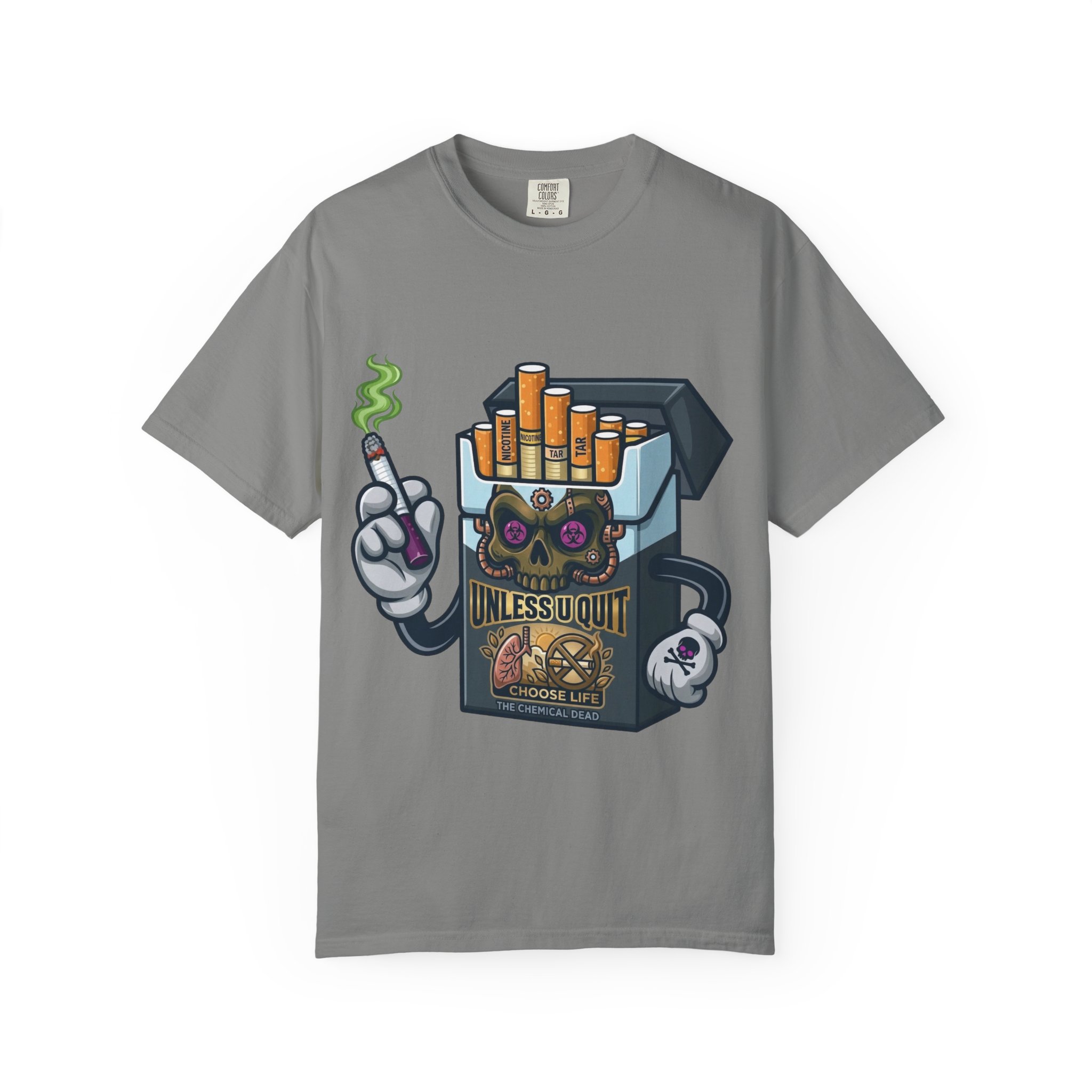 Edgy graphic t-shirt design featuring a cartoon cigarette pack character with attitude, smoke details, and bold street-art styling. Packed with rebellious energy and playful character design, this shirt is perfect for fans of dark humor, urban graphics, and standout casual fashion. A bold statement piece for streetwear collections and novelty apparel lovers.
