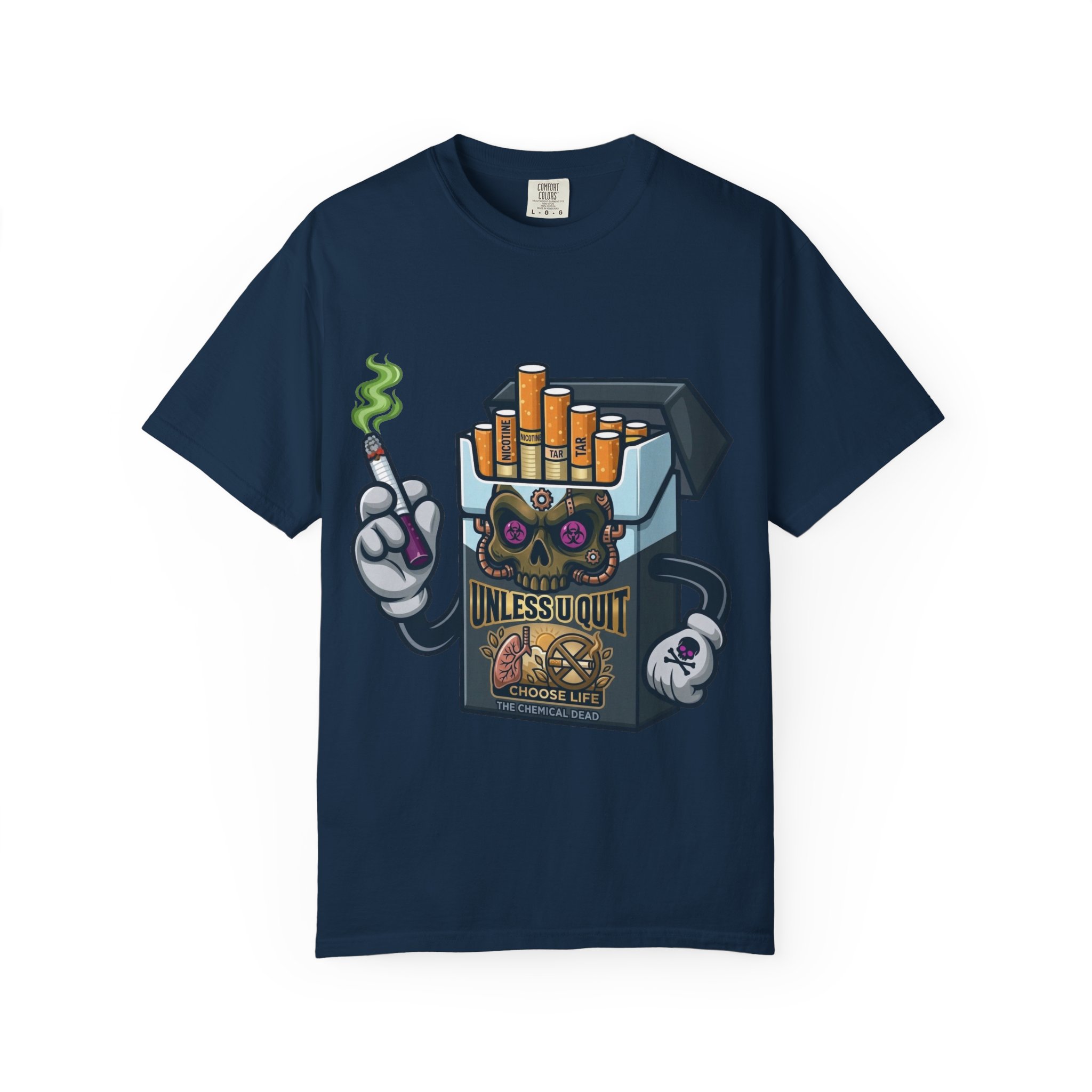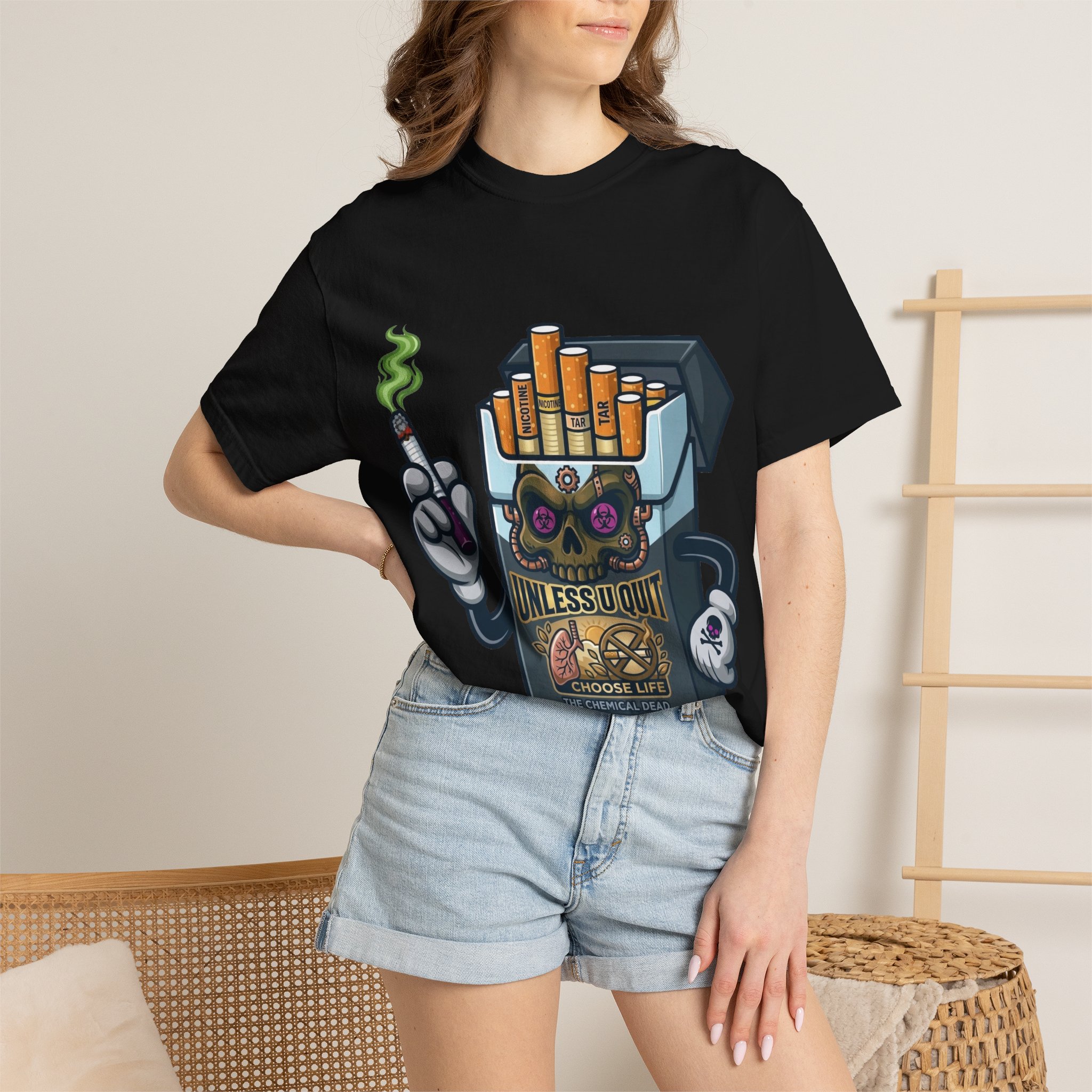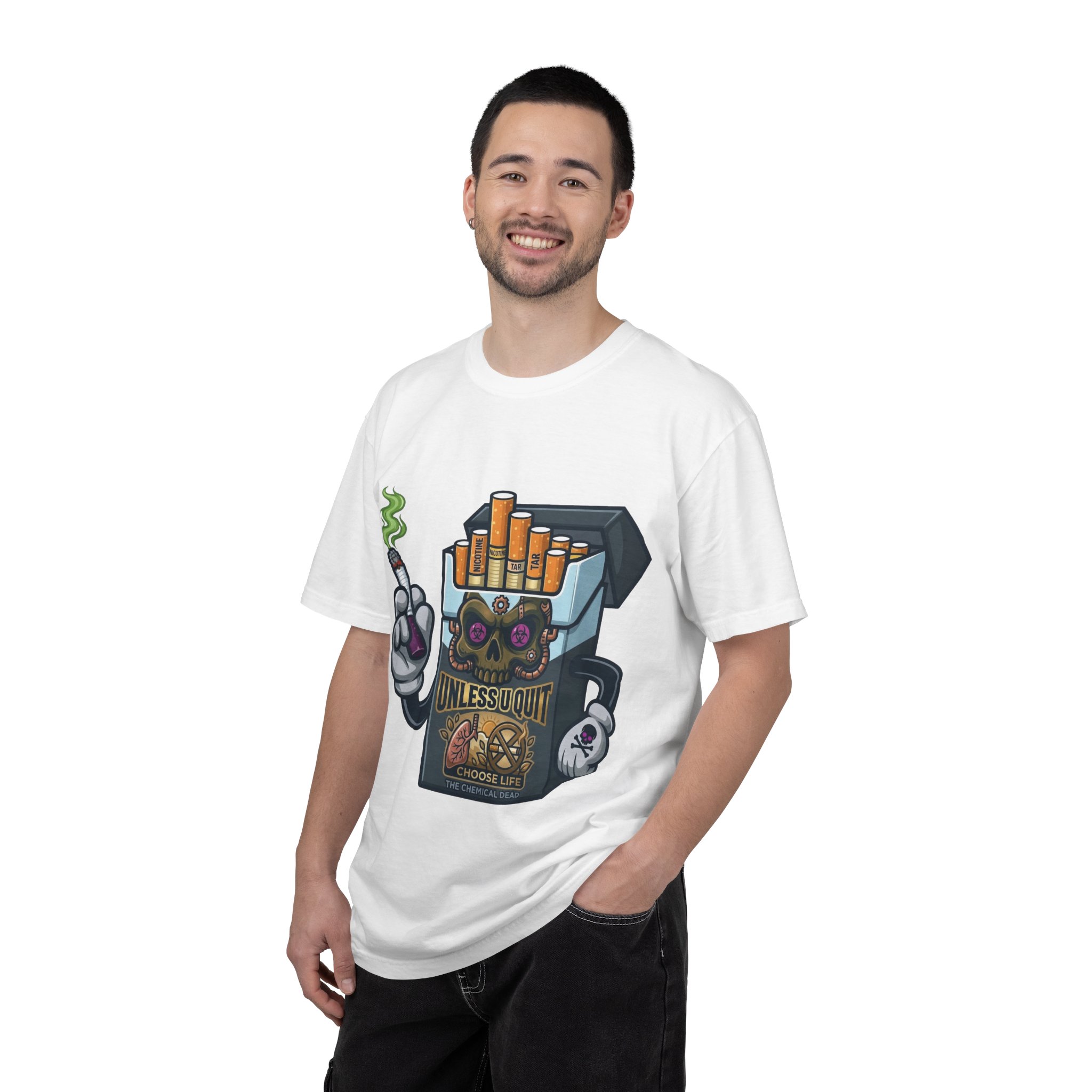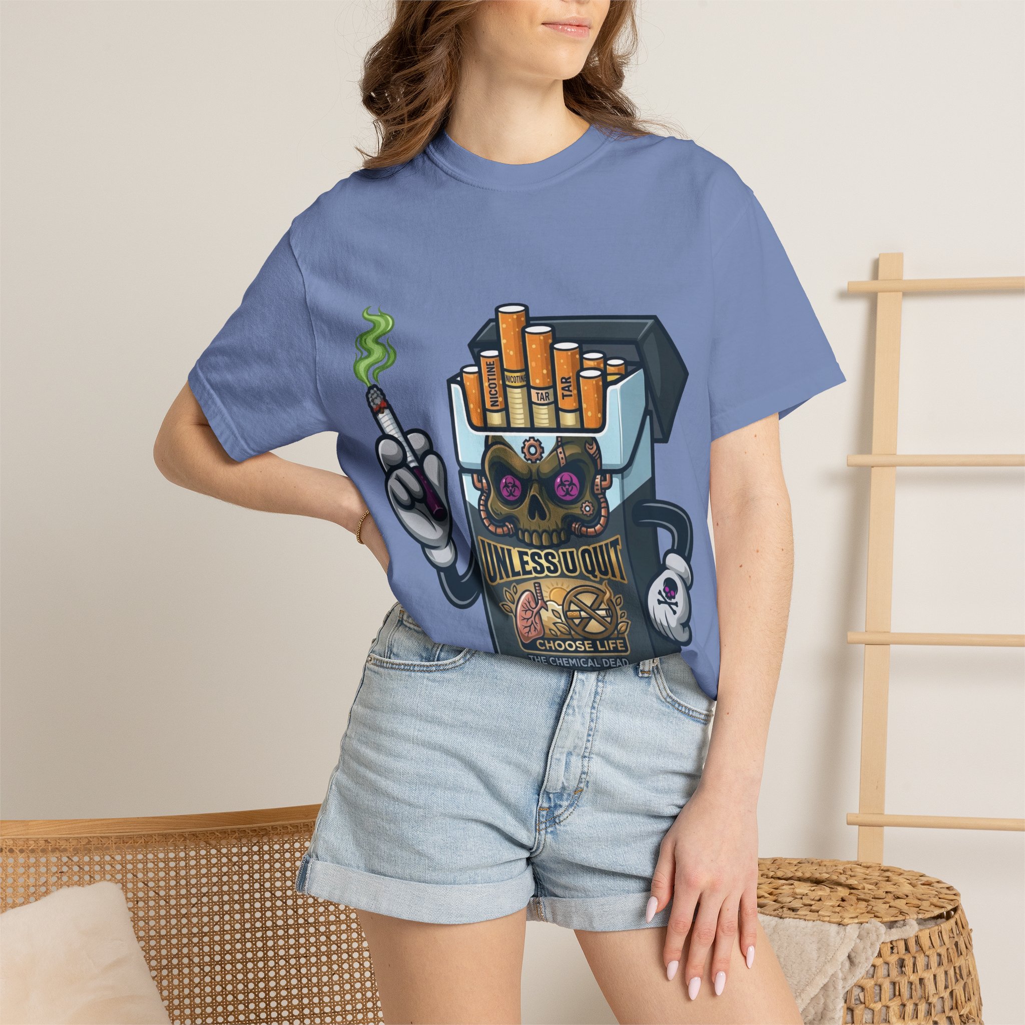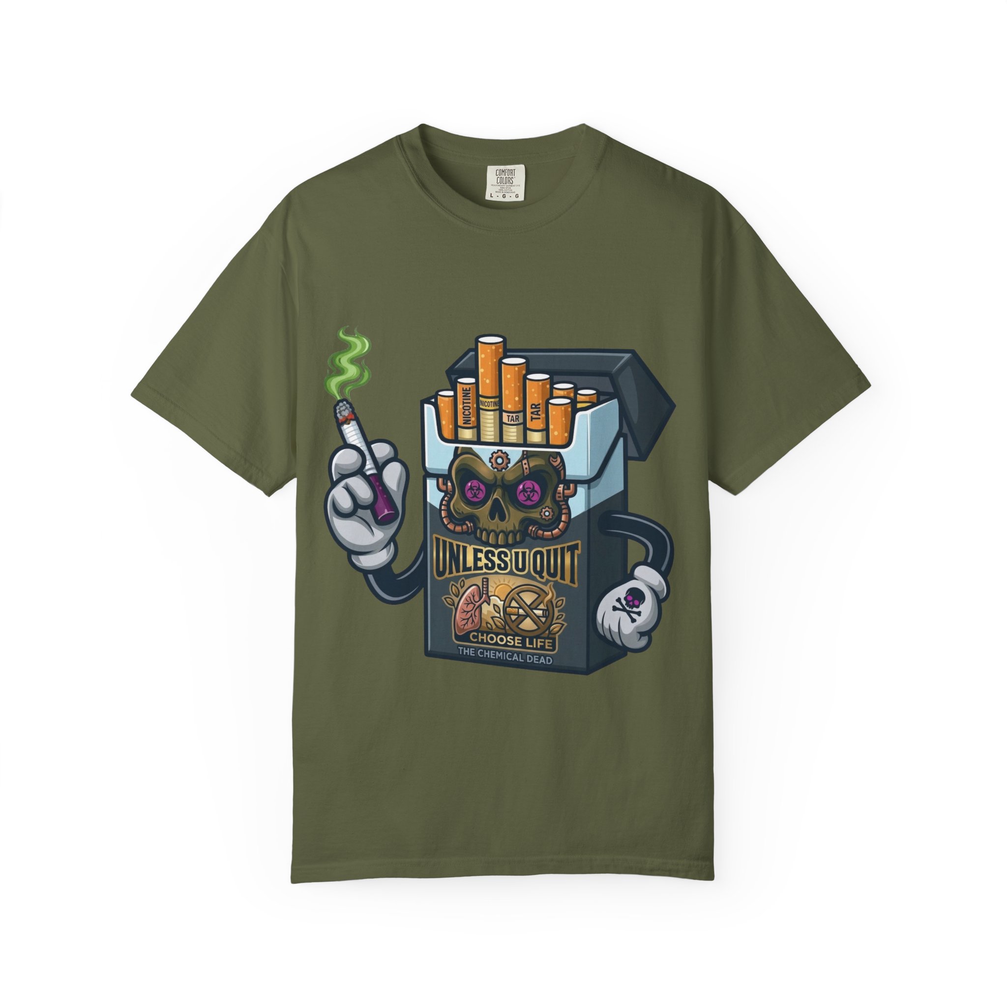 Edgy graphic t-shirt design featuring a cartoon cigarette pack character with attitude, smoke details, and bold street-art styling. Packed with rebellious energy and playful character design, this shirt is perfect for fans of dark humor, urban graphics, and standout casual fashion. A bold statement piece for streetwear collections and novelty apparel lovers.