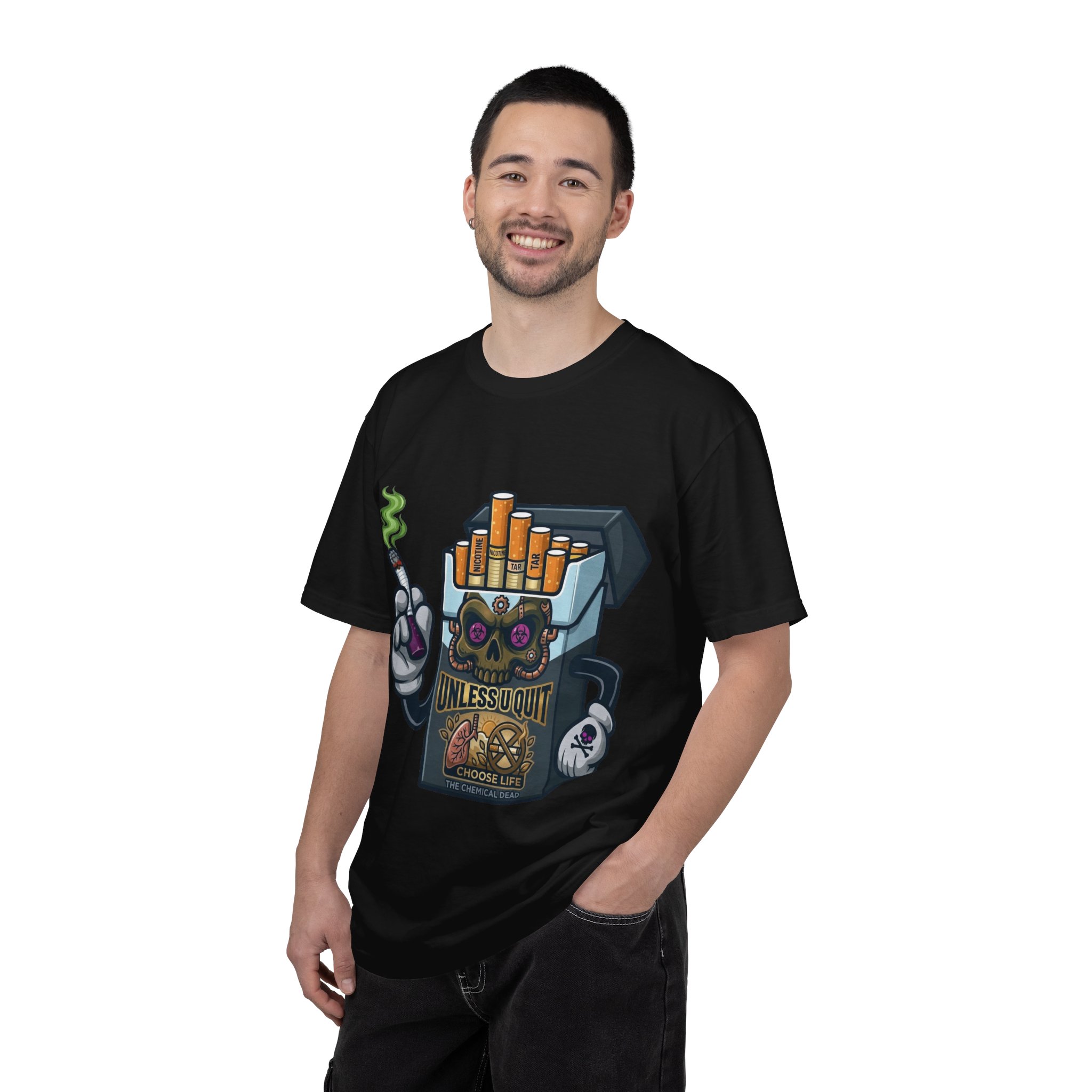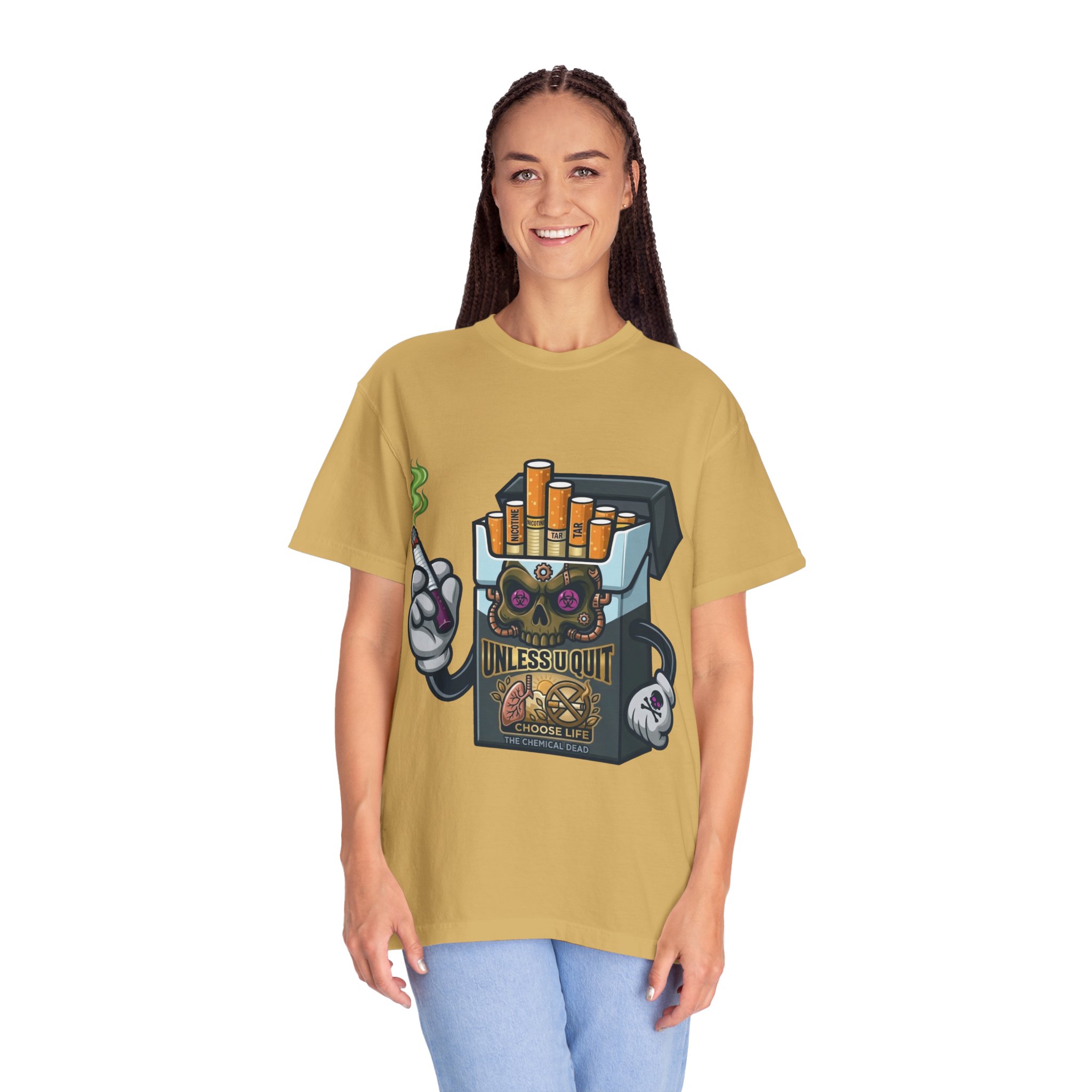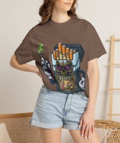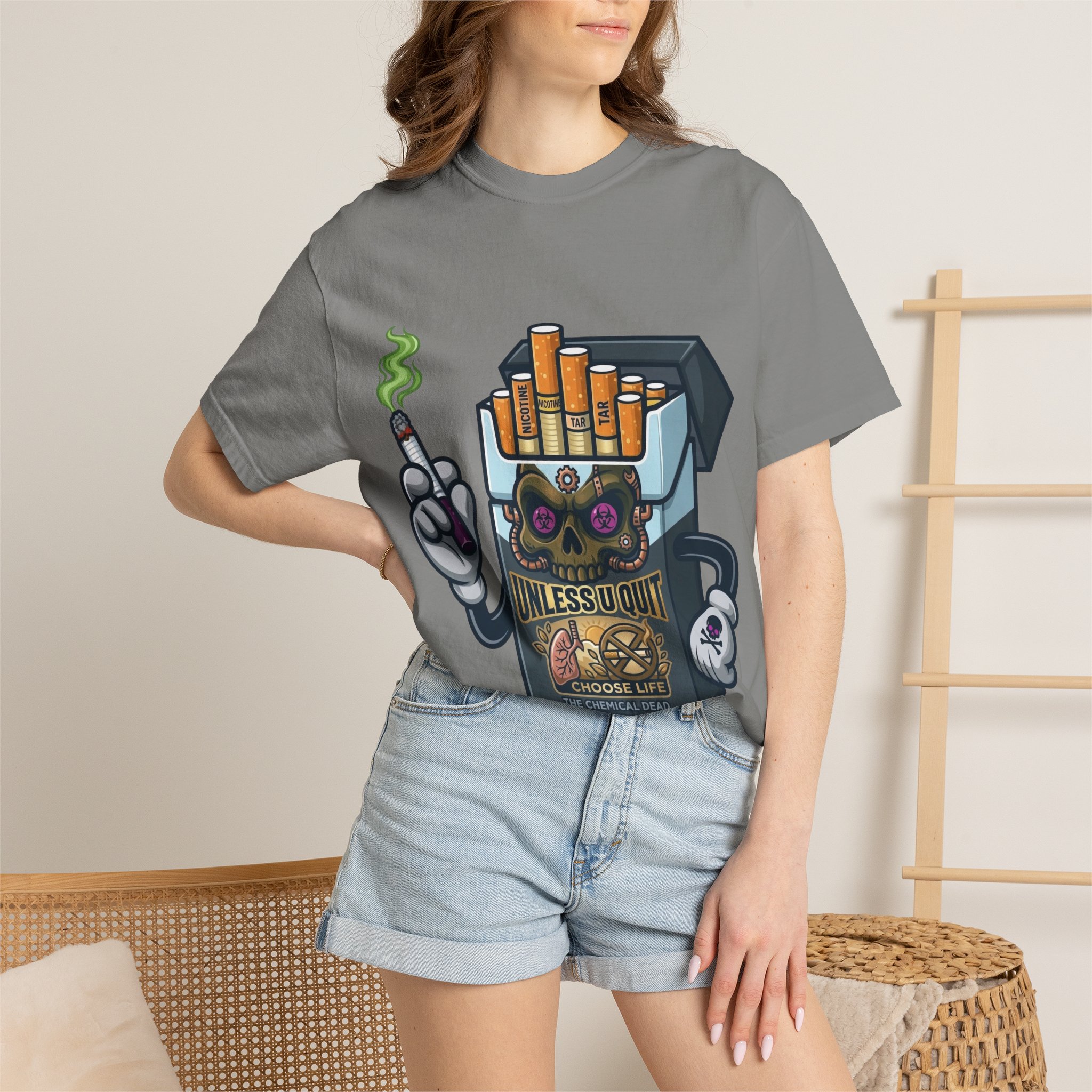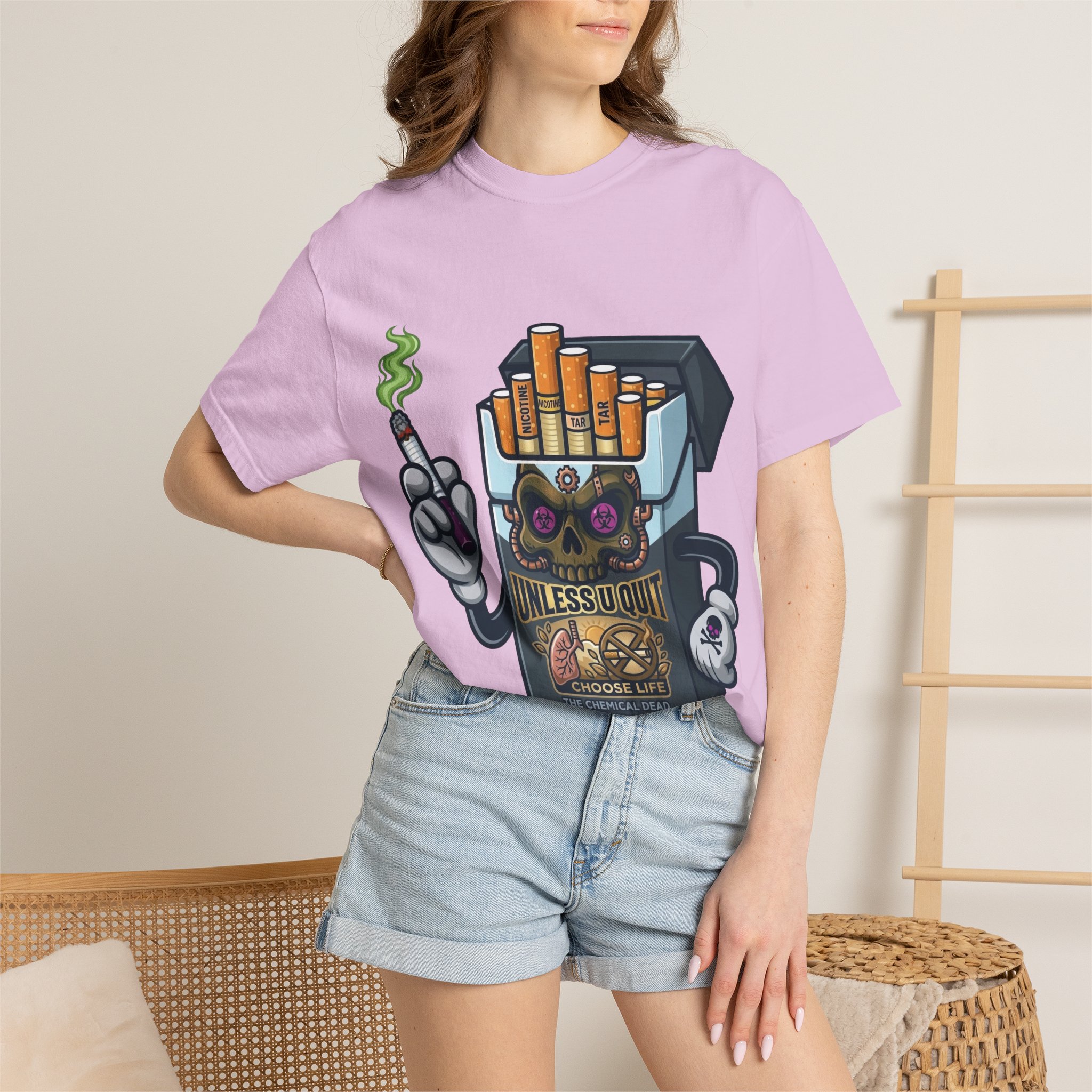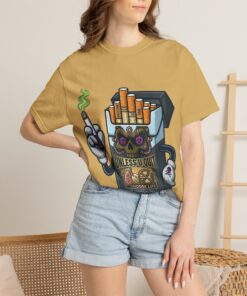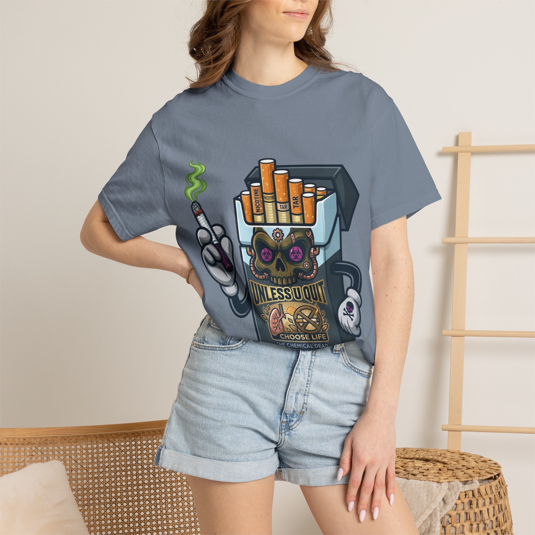 Edgy graphic t-shirt design featuring a cartoon cigarette pack character with attitude, smoke details, and bold street-art styling. Packed with rebellious energy and playful character design, this shirt is perfect for fans of dark humor, urban graphics, and standout casual fashion. A bold statement piece for streetwear collections and novelty apparel lovers.