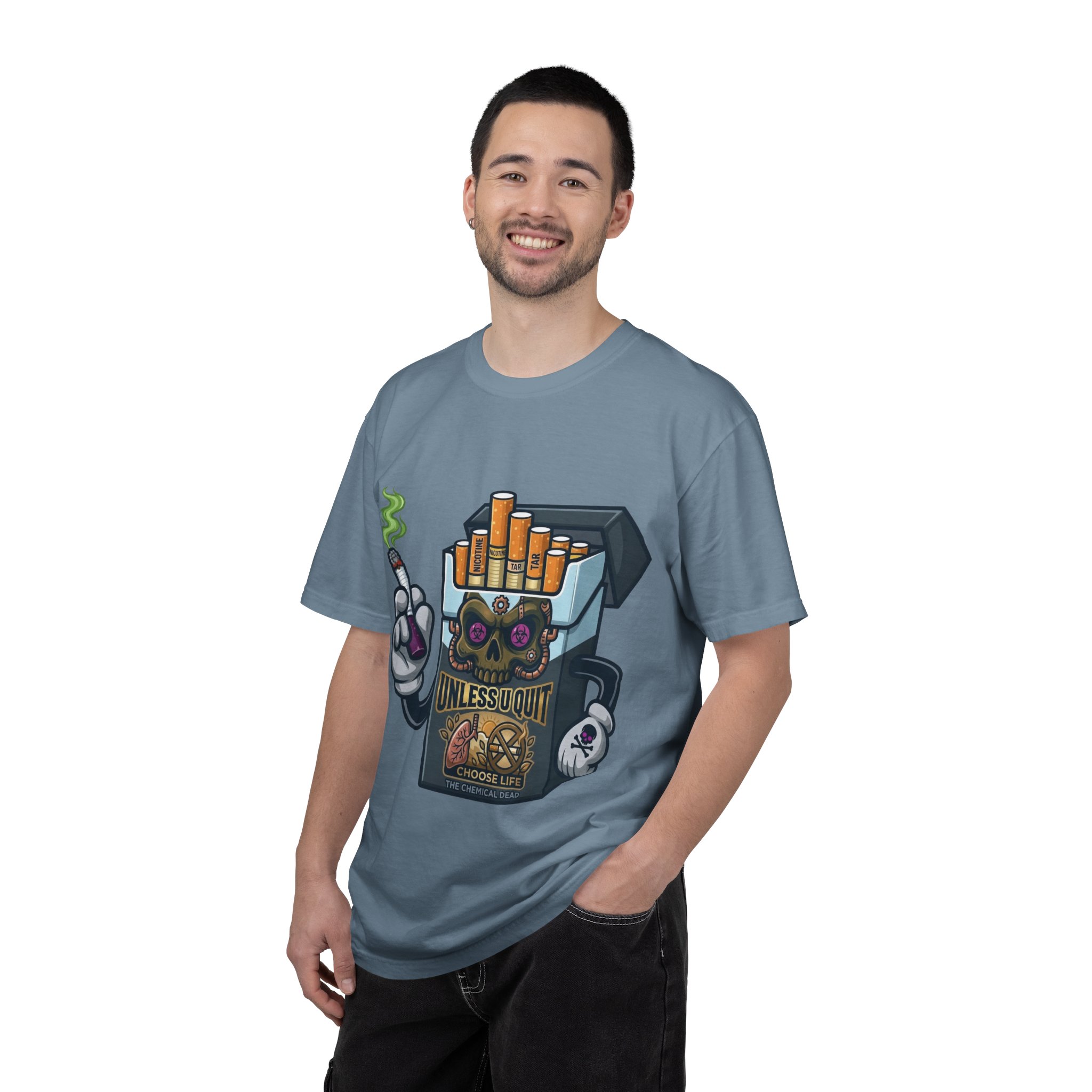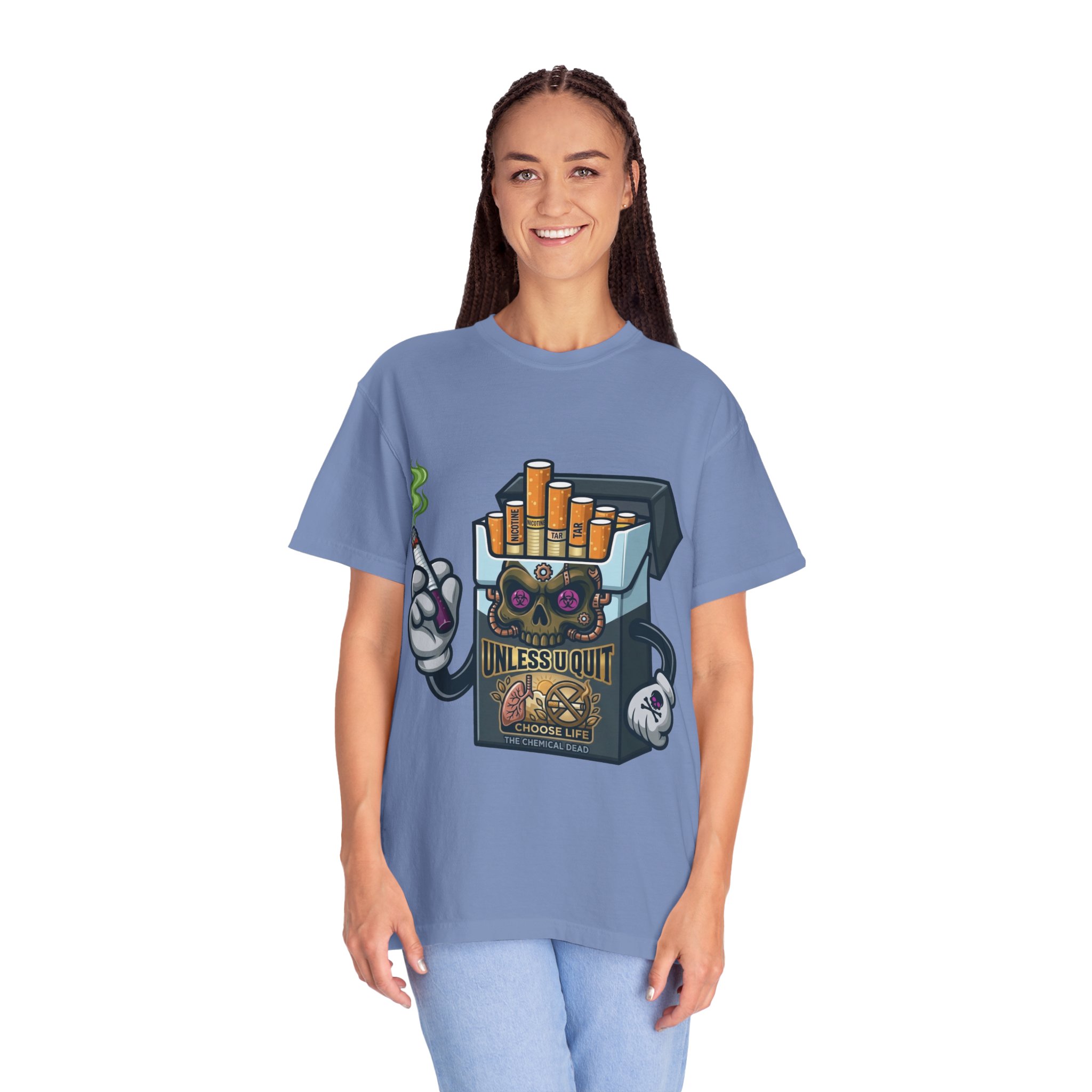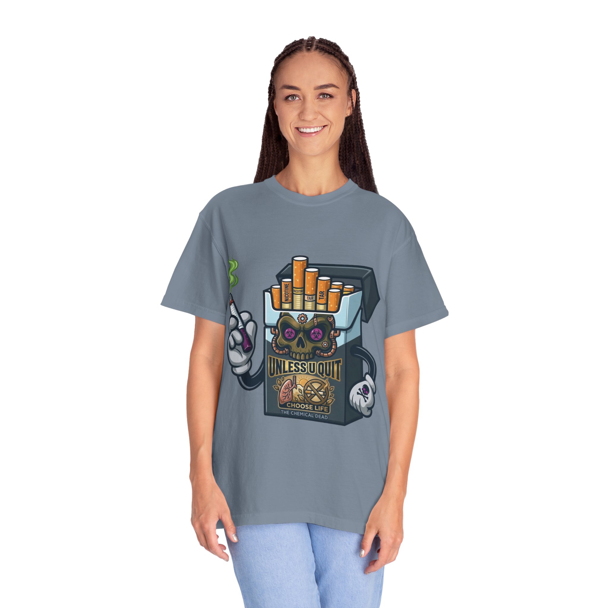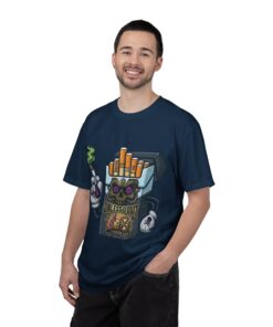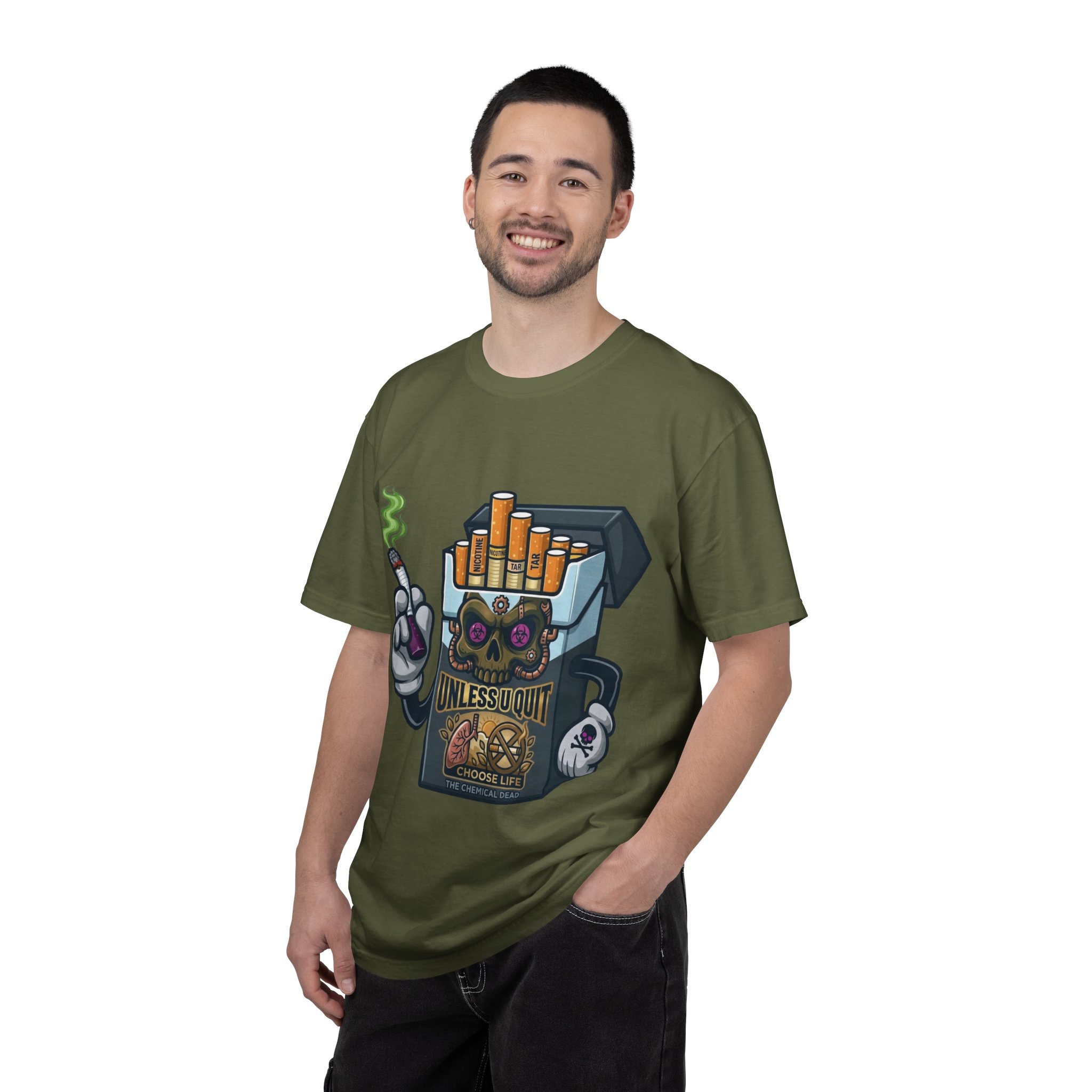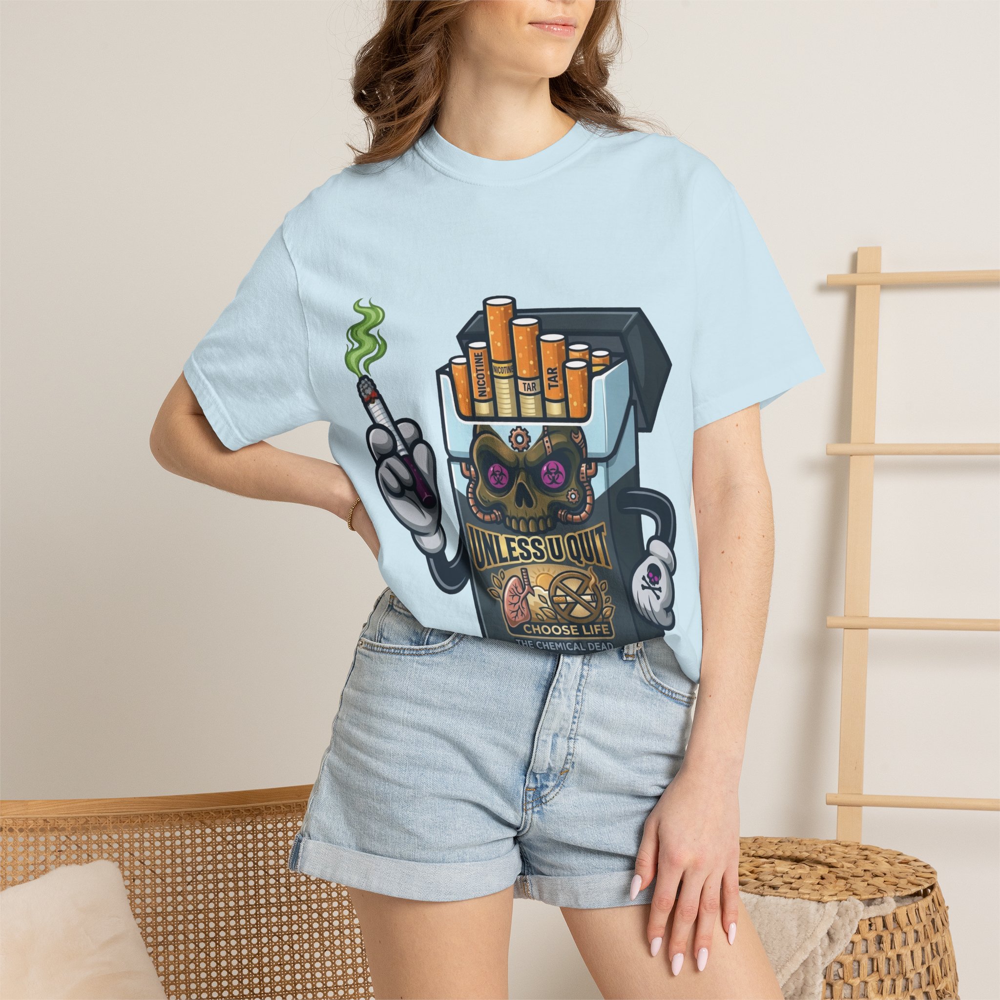 Edgy graphic t-shirt design featuring a cartoon cigarette pack character with attitude, smoke details, and bold street-art styling. Packed with rebellious energy and playful character design, this shirt is perfect for fans of dark humor, urban graphics, and standout casual fashion. A bold statement piece for streetwear collections and novelty apparel lovers.