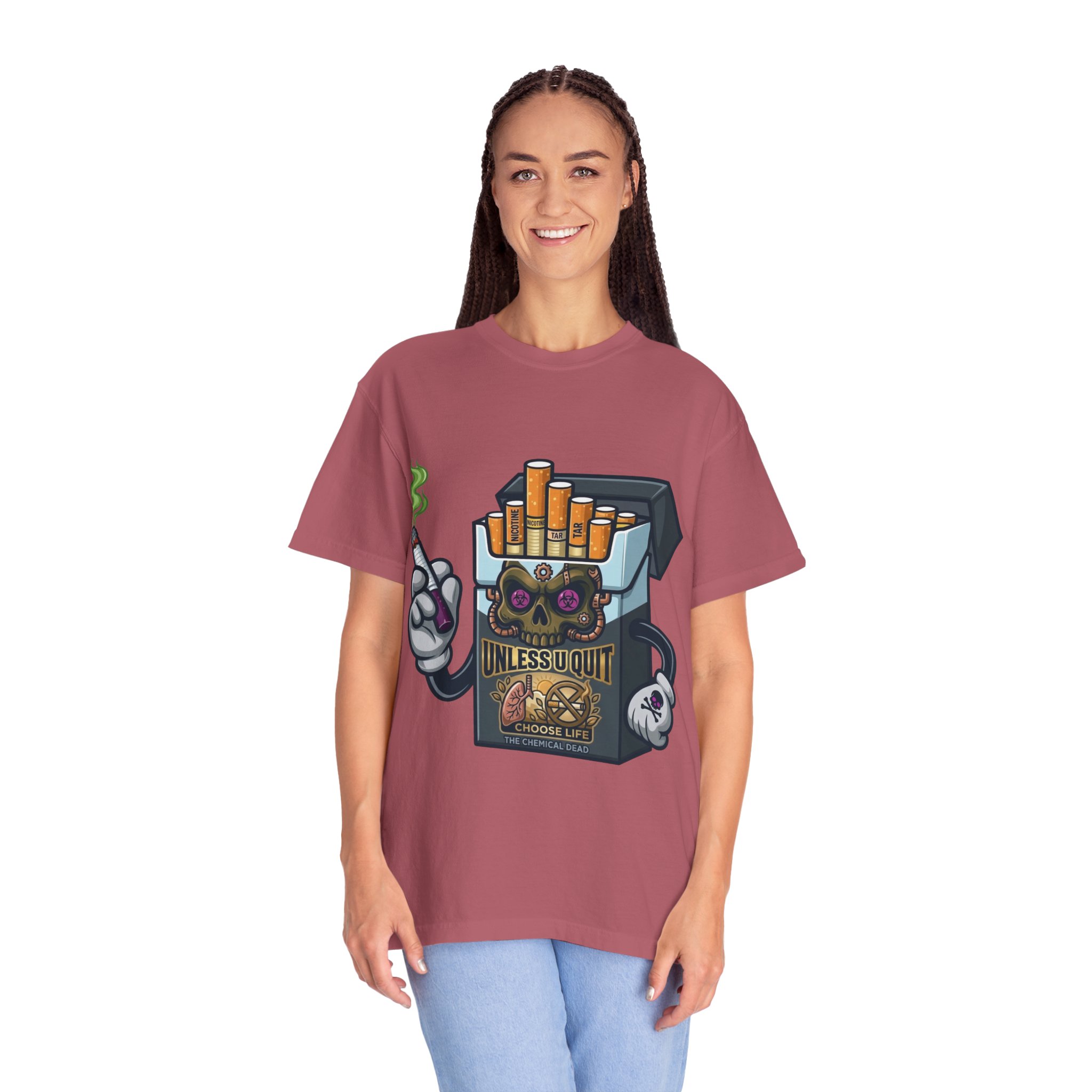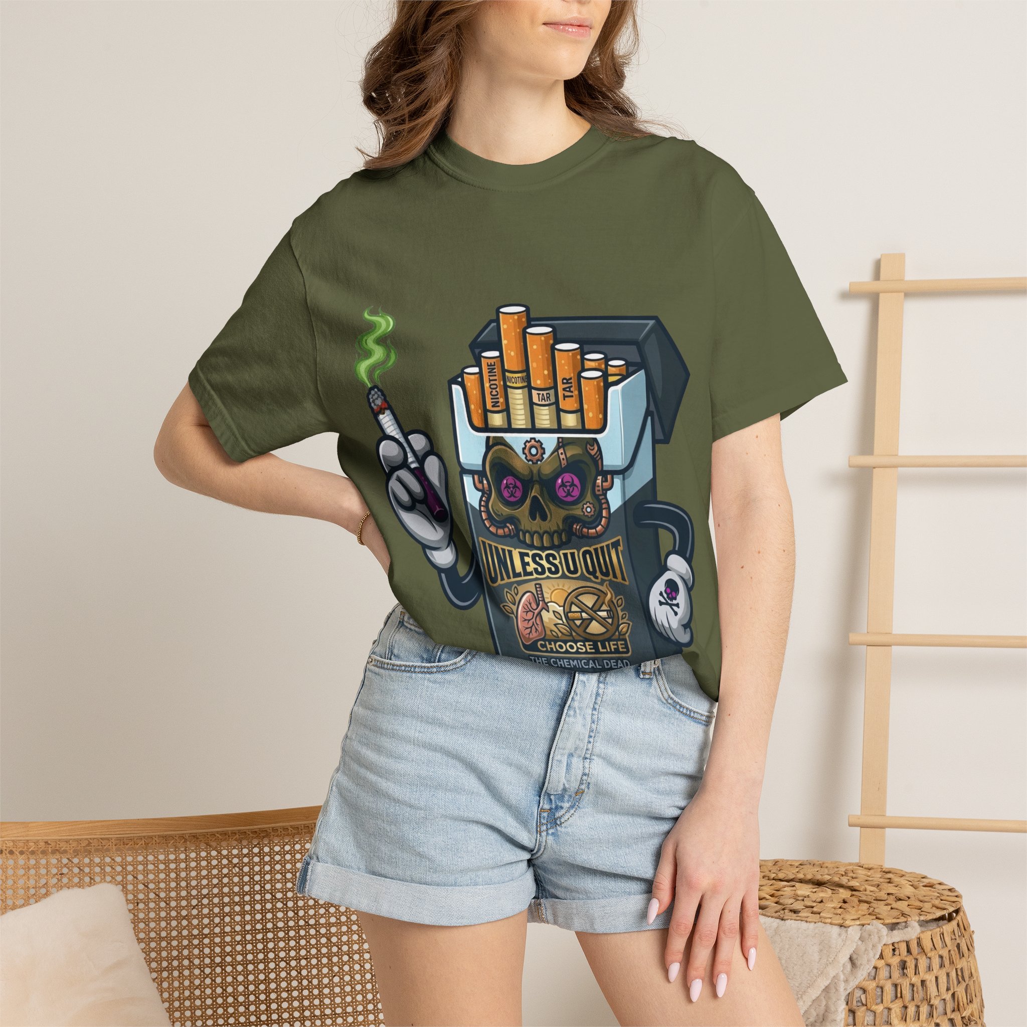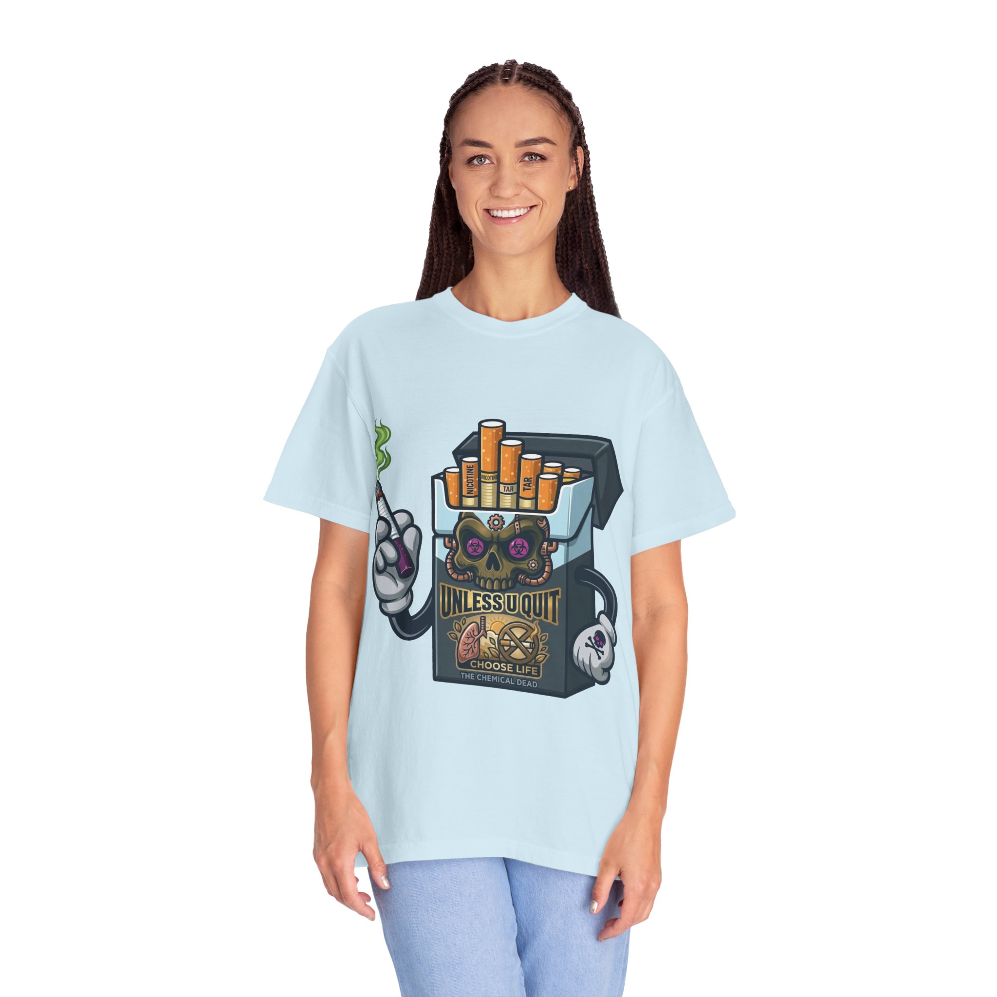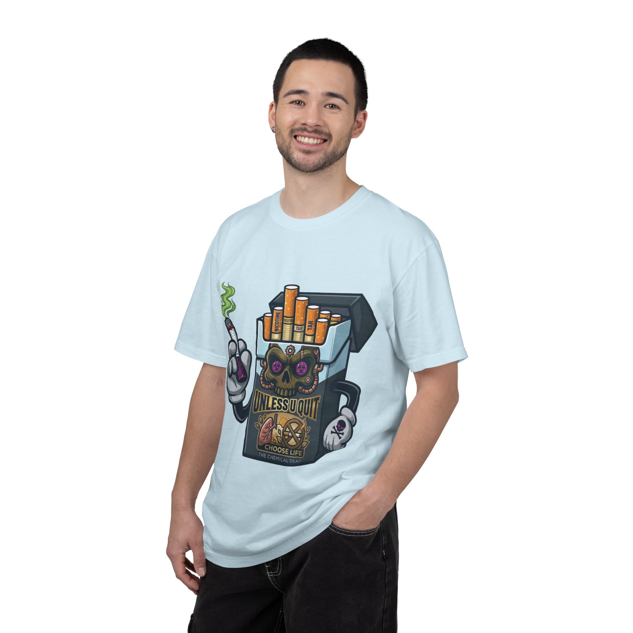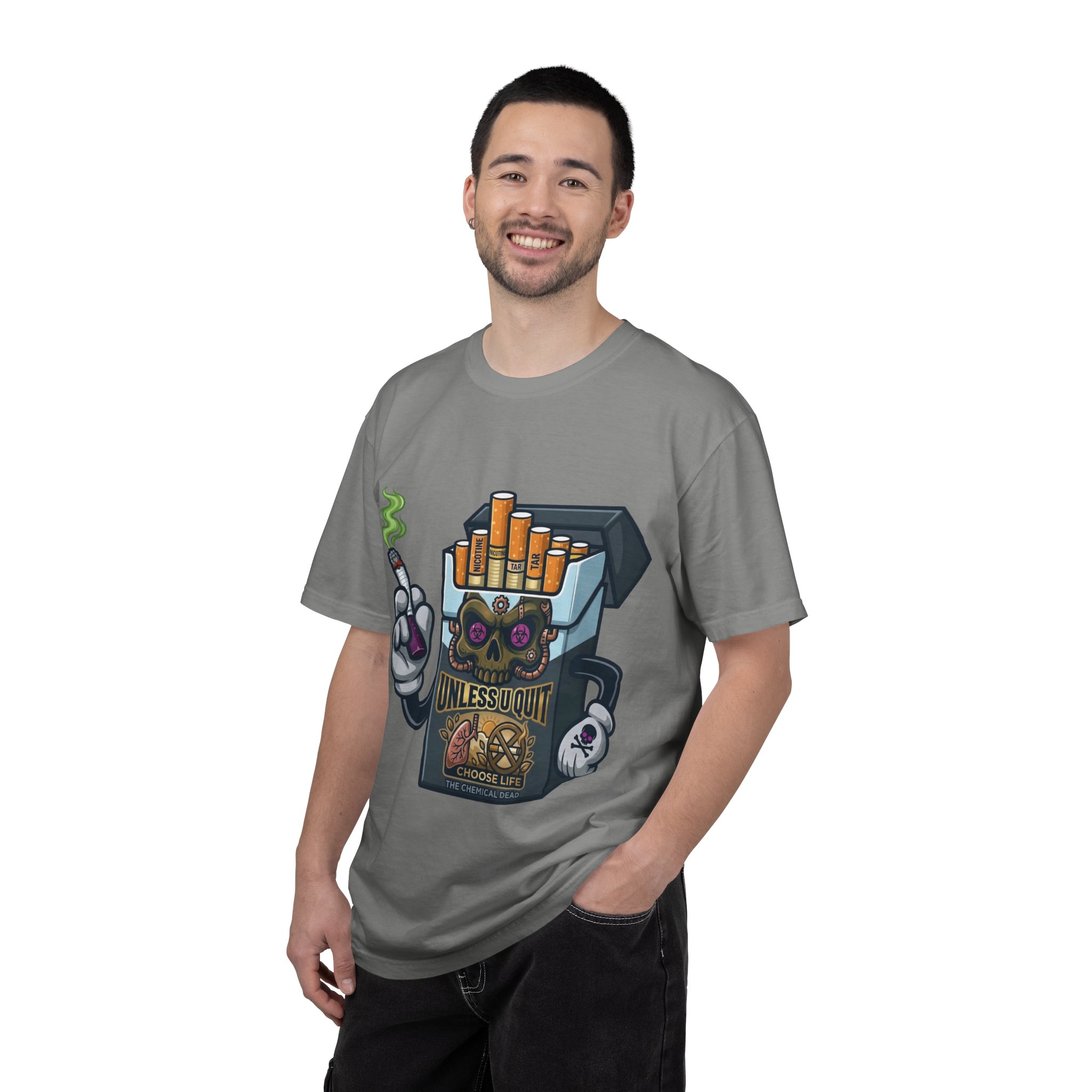 Edgy graphic t-shirt design featuring a cartoon cigarette pack character with attitude, smoke details, and bold street-art styling. Packed with rebellious energy and playful character design, this shirt is perfect for fans of dark humor, urban graphics, and standout casual fashion. A bold statement piece for streetwear collections and novelty apparel lovers.