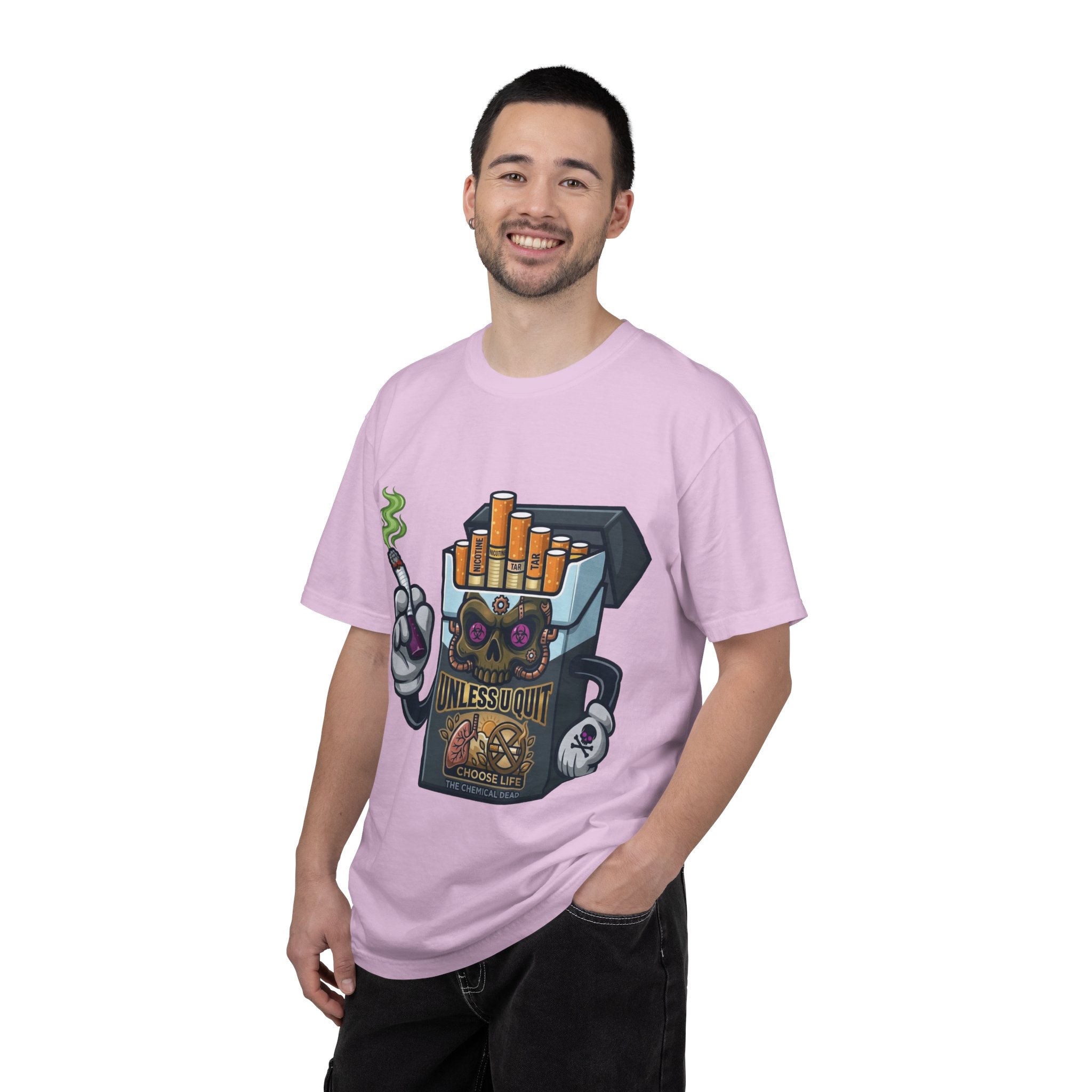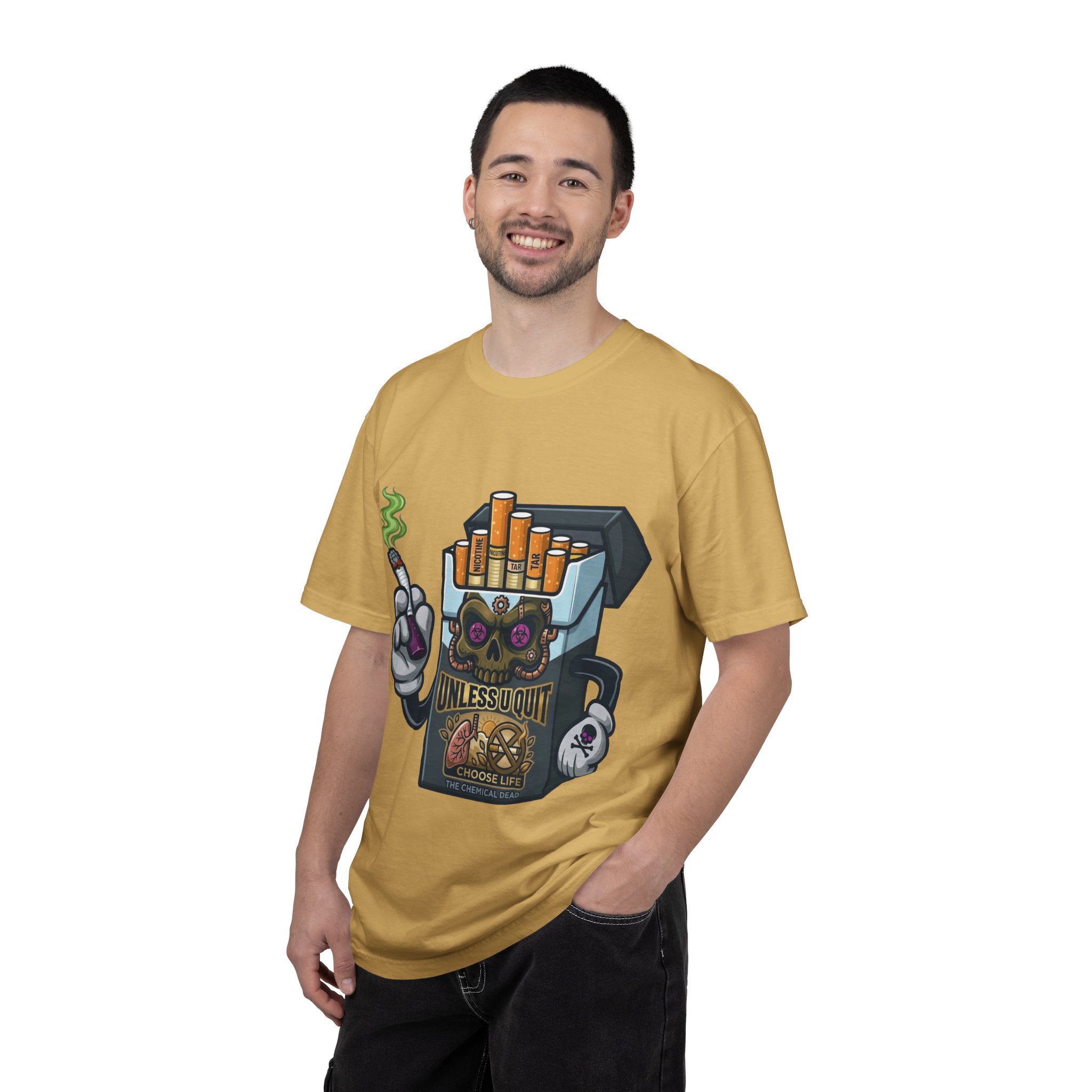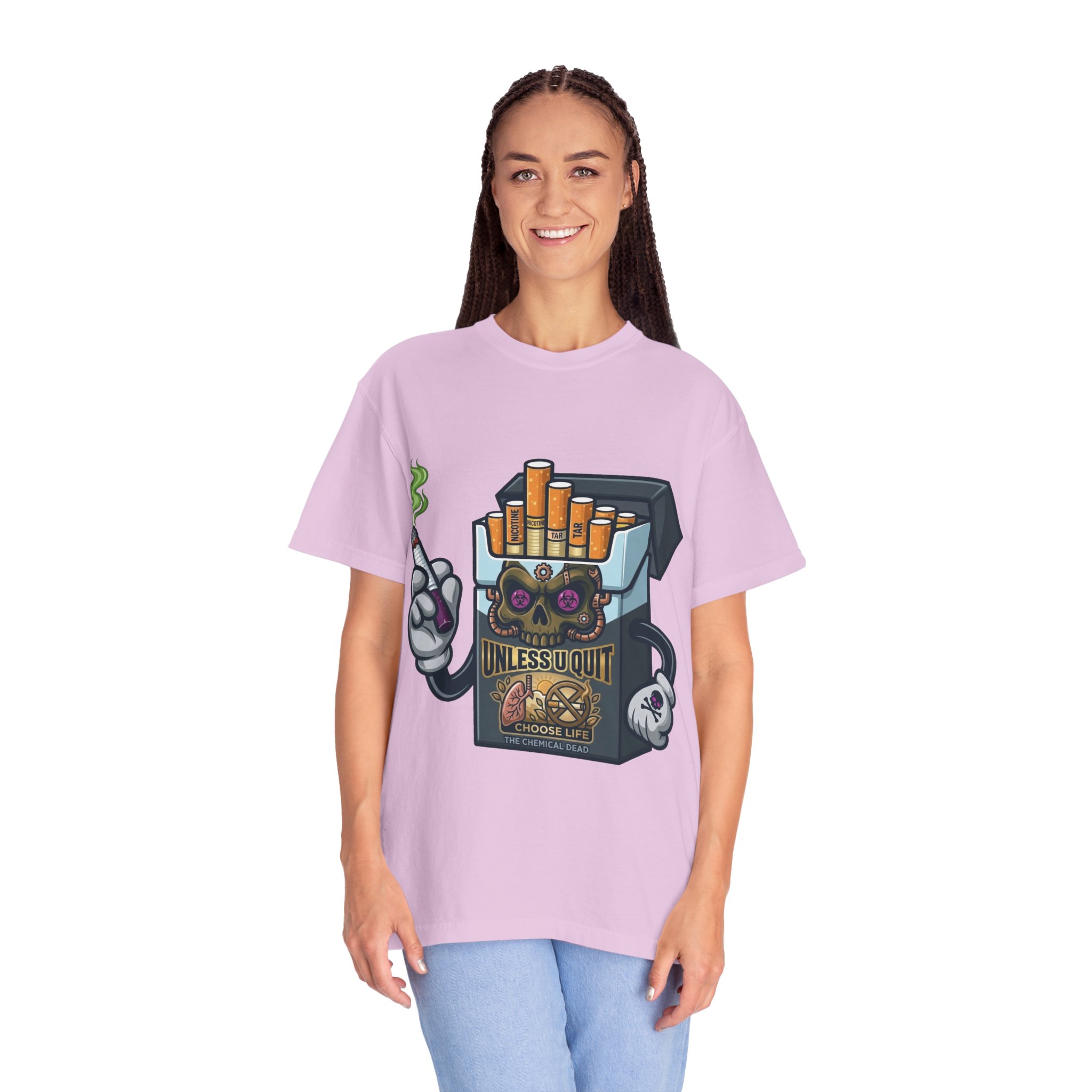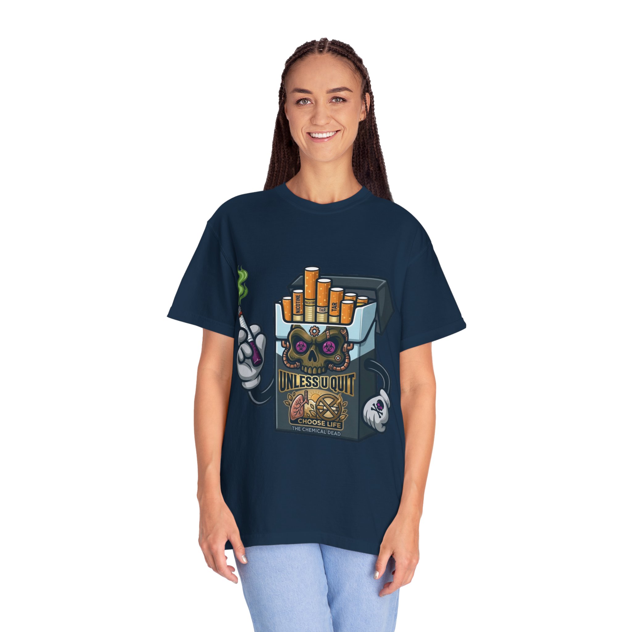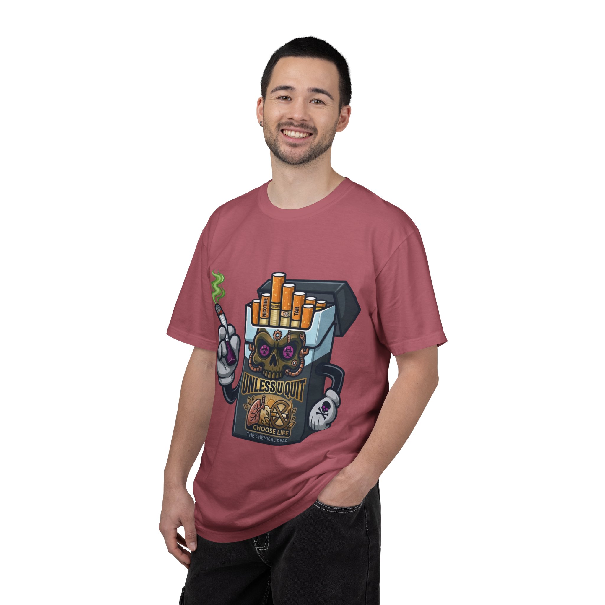 Edgy graphic t-shirt design featuring a cartoon cigarette pack character with attitude, smoke details, and bold street-art styling. Packed with rebellious energy and playful character design, this shirt is perfect for fans of dark humor, urban graphics, and standout casual fashion. A bold statement piece for streetwear collections and novelty apparel lovers.