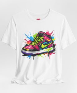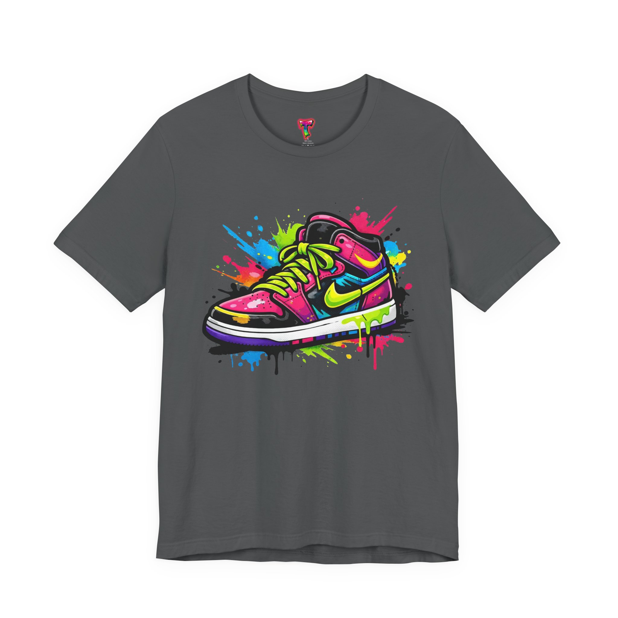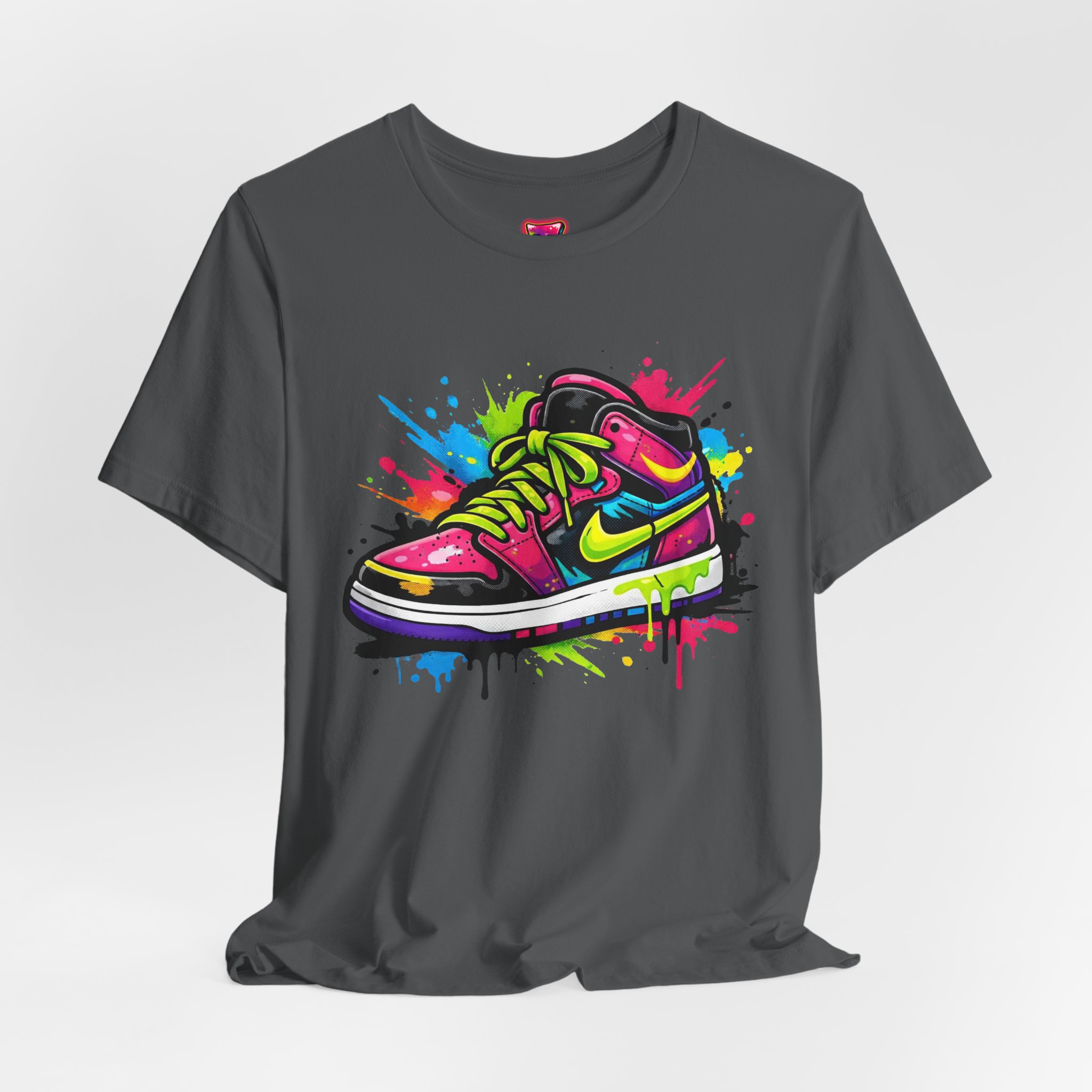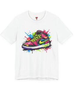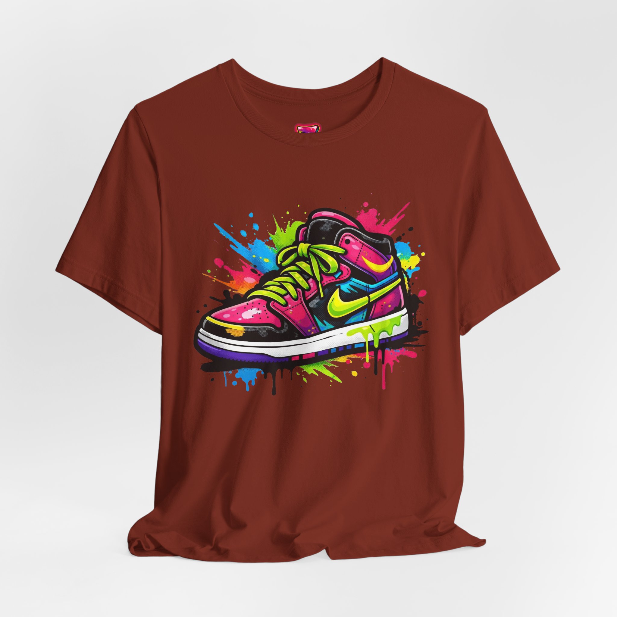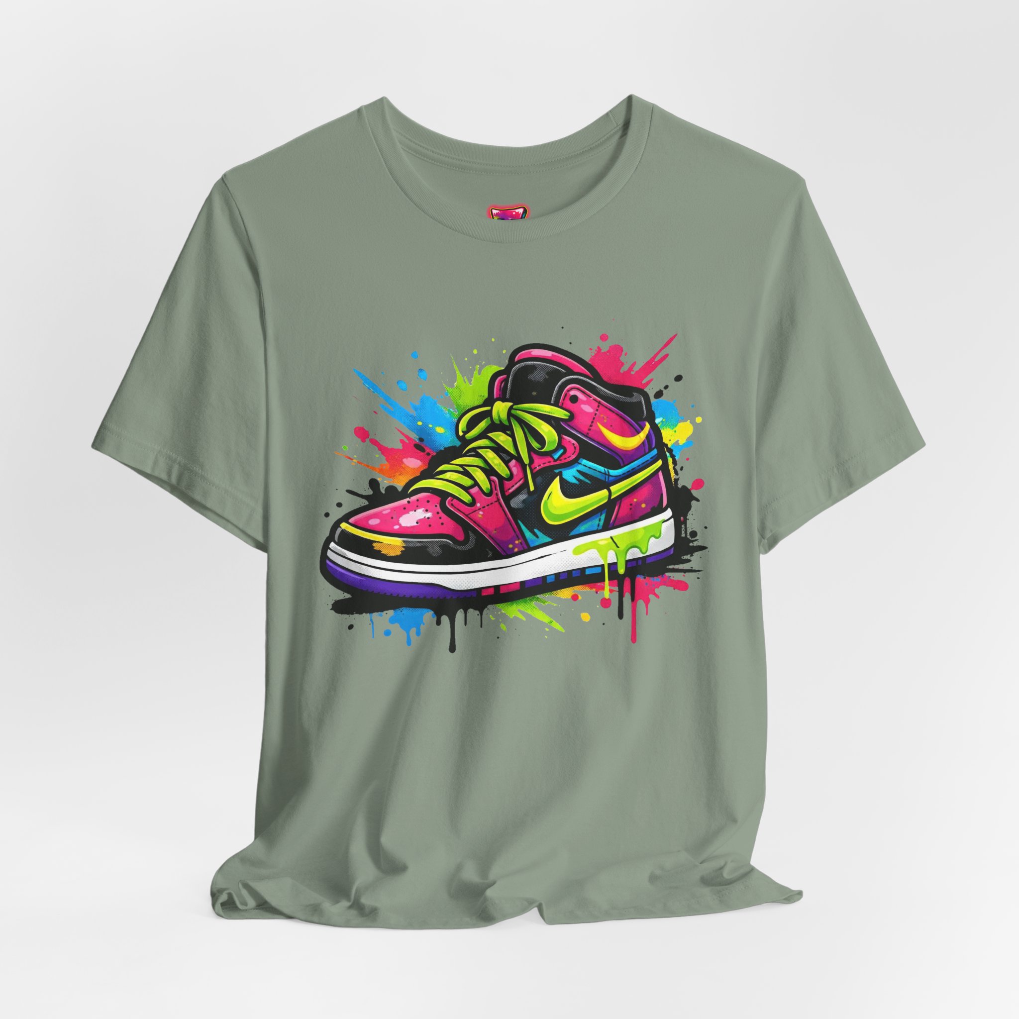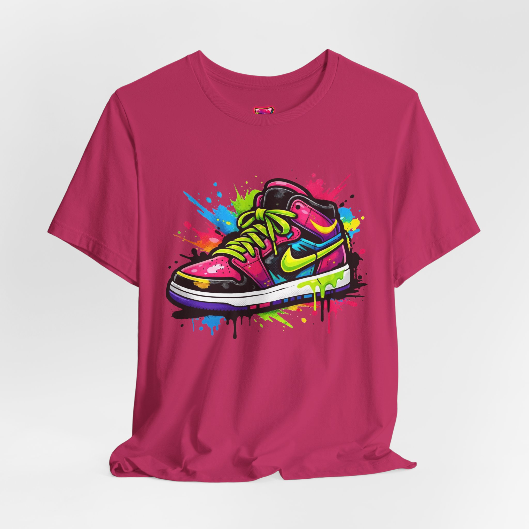 This lightweight jersey tee brings street-art energy to everyday wear. A vivid, hand-drawn sneaker splash sits center chest: neon pinks, electric greens and cobalt blues layered with paint-drip accents for a bold, urban look. The breathable Airlume combed cotton feels soft against skin and keeps you cool on busy days. Finished with a ribbed crew neck, side seams for shape retention, and a tear-away label for comfort. Wear it layered under a denim jacket or solo with joggers — it reads like a canvas you live in, not just a shirt you put on.