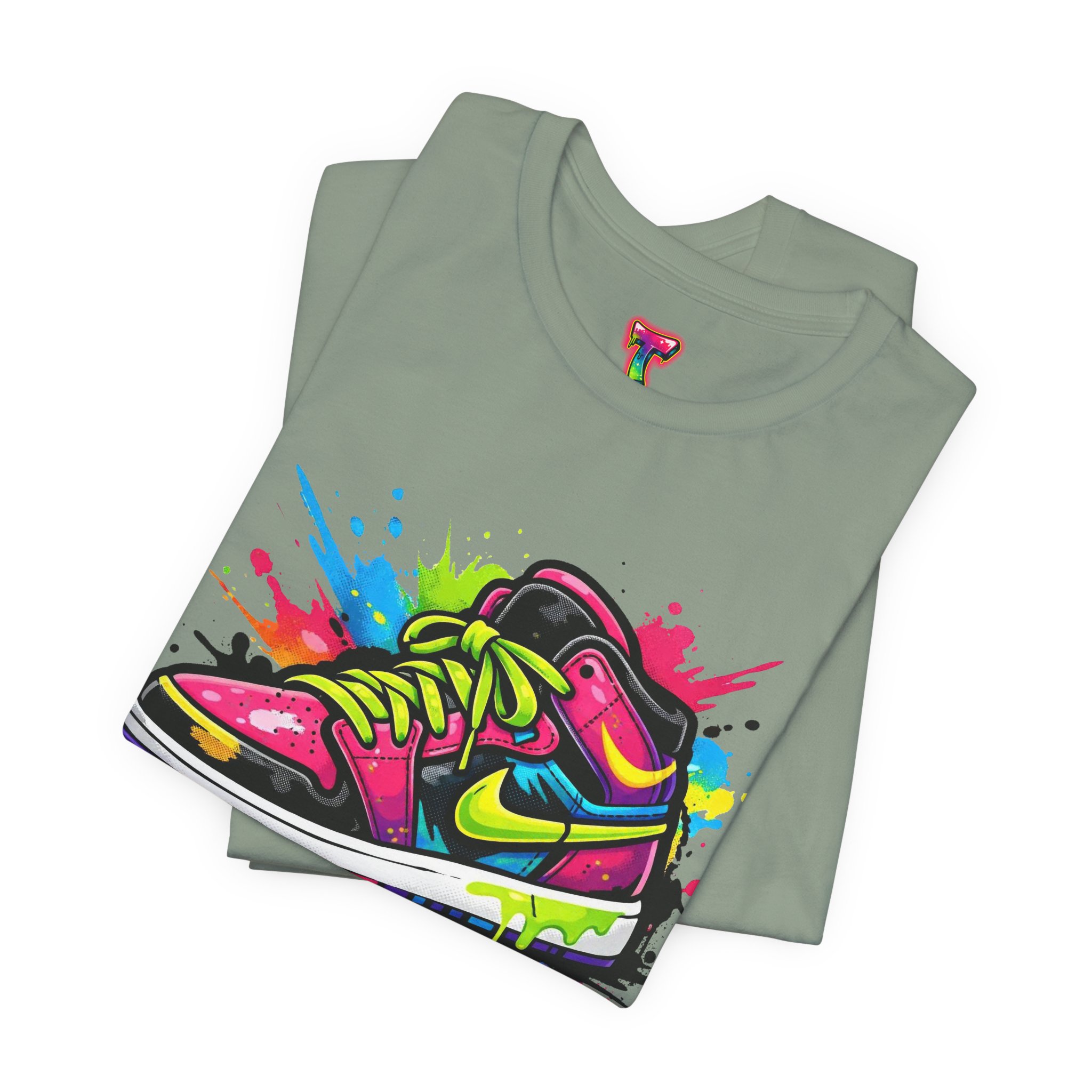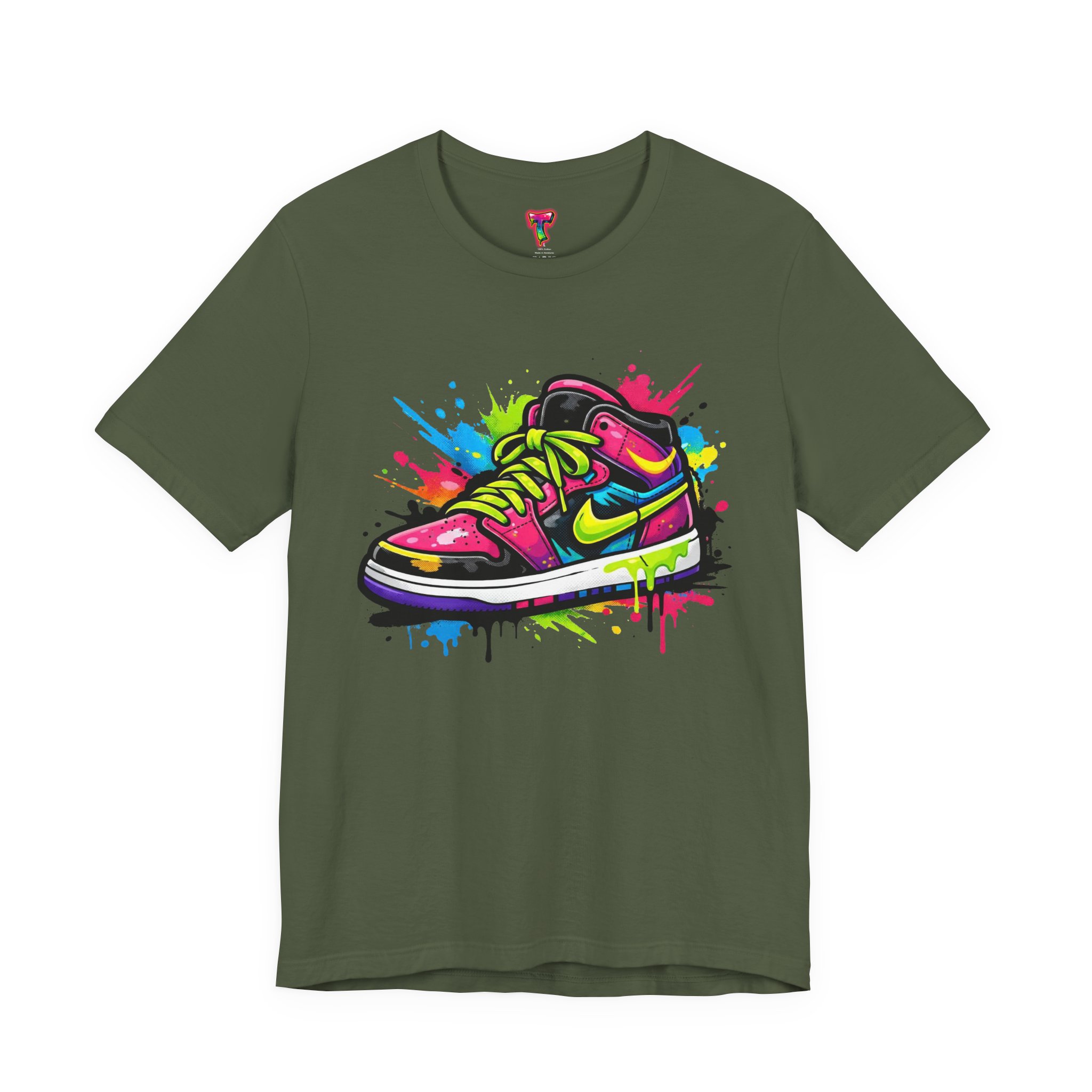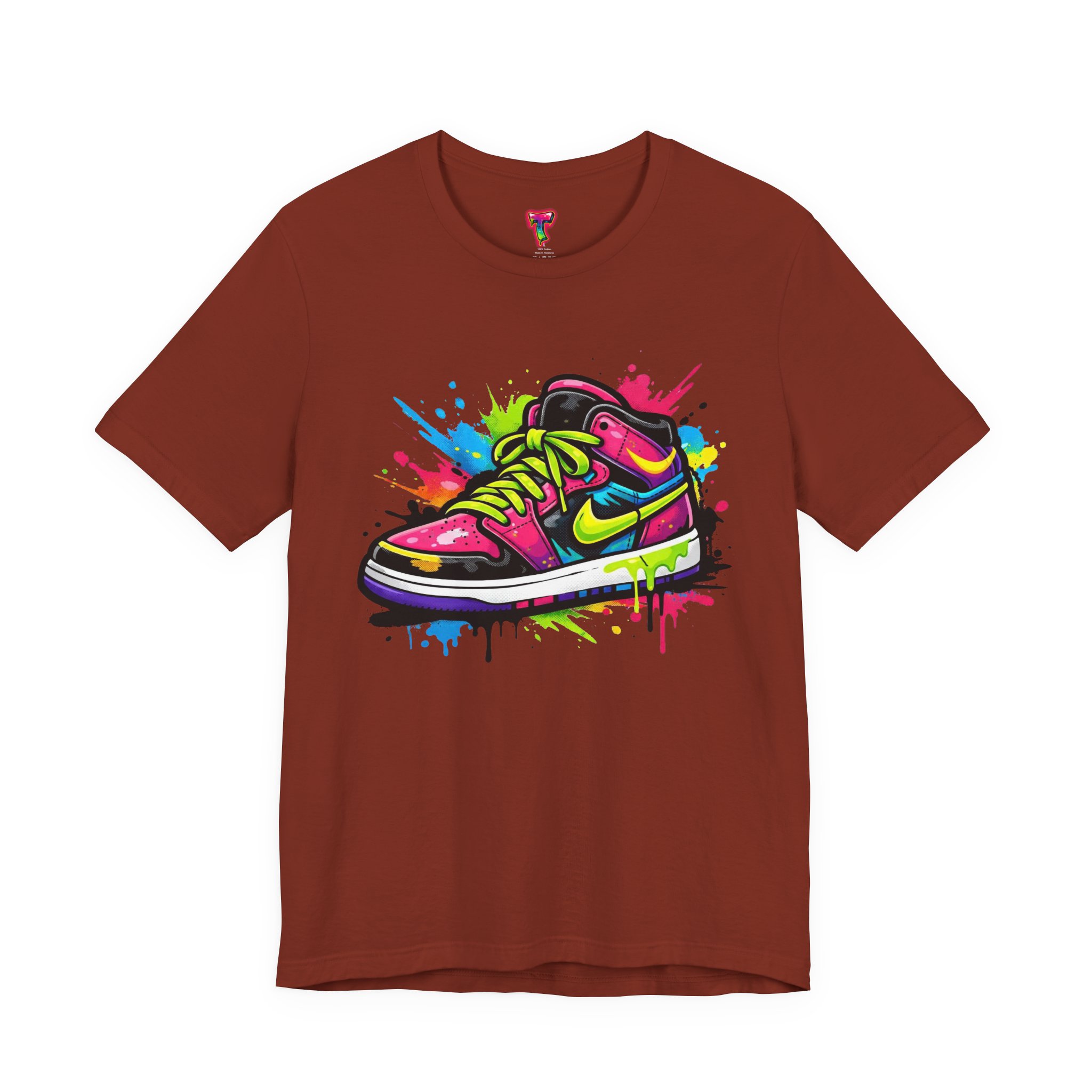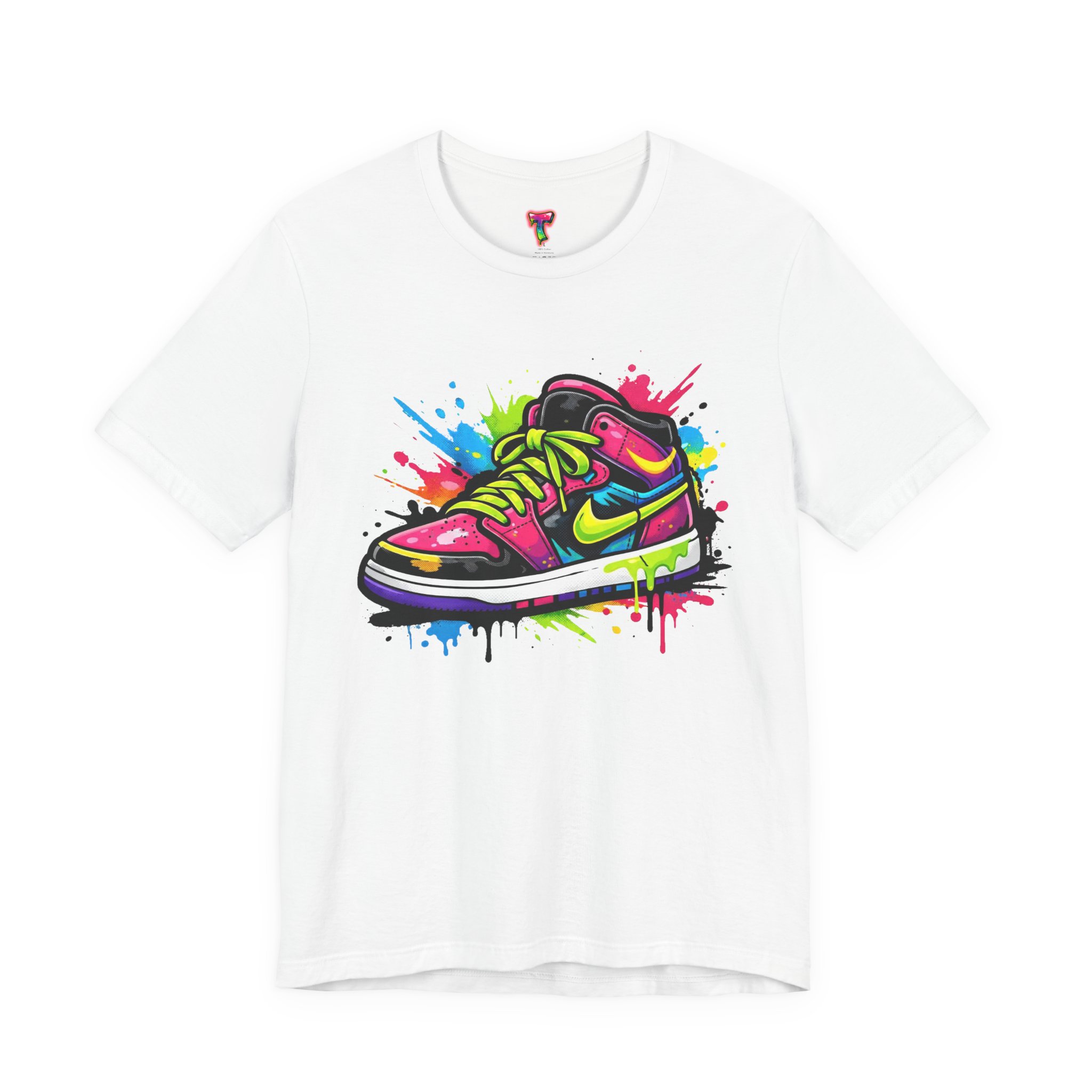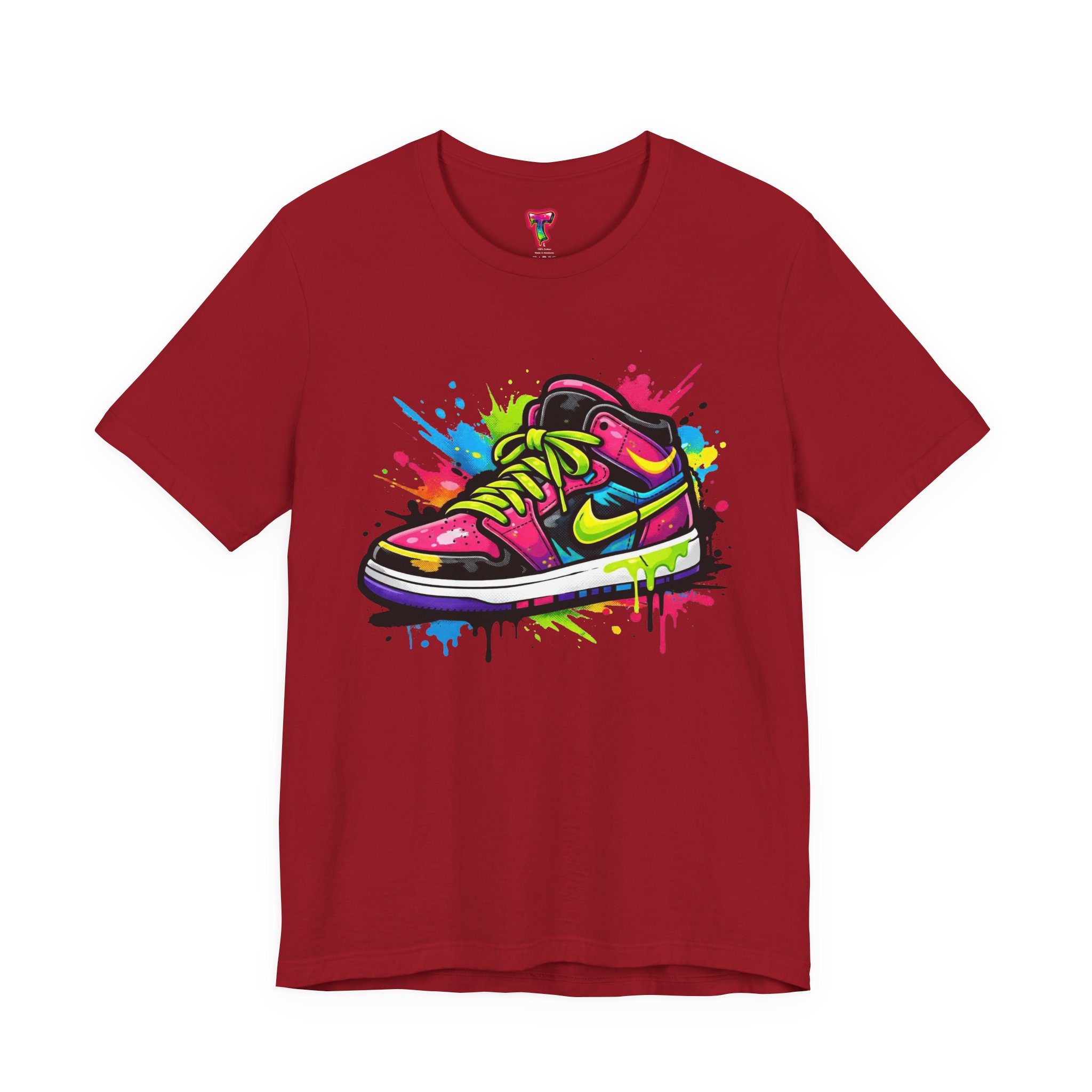 This lightweight jersey tee brings street-art energy to everyday wear. A vivid, hand-drawn sneaker splash sits center chest: neon pinks, electric greens and cobalt blues layered with paint-drip accents for a bold, urban look. The breathable Airlume combed cotton feels soft against skin and keeps you cool on busy days. Finished with a ribbed crew neck, side seams for shape retention, and a tear-away label for comfort. Wear it layered under a denim jacket or solo with joggers — it reads like a canvas you live in, not just a shirt you put on.