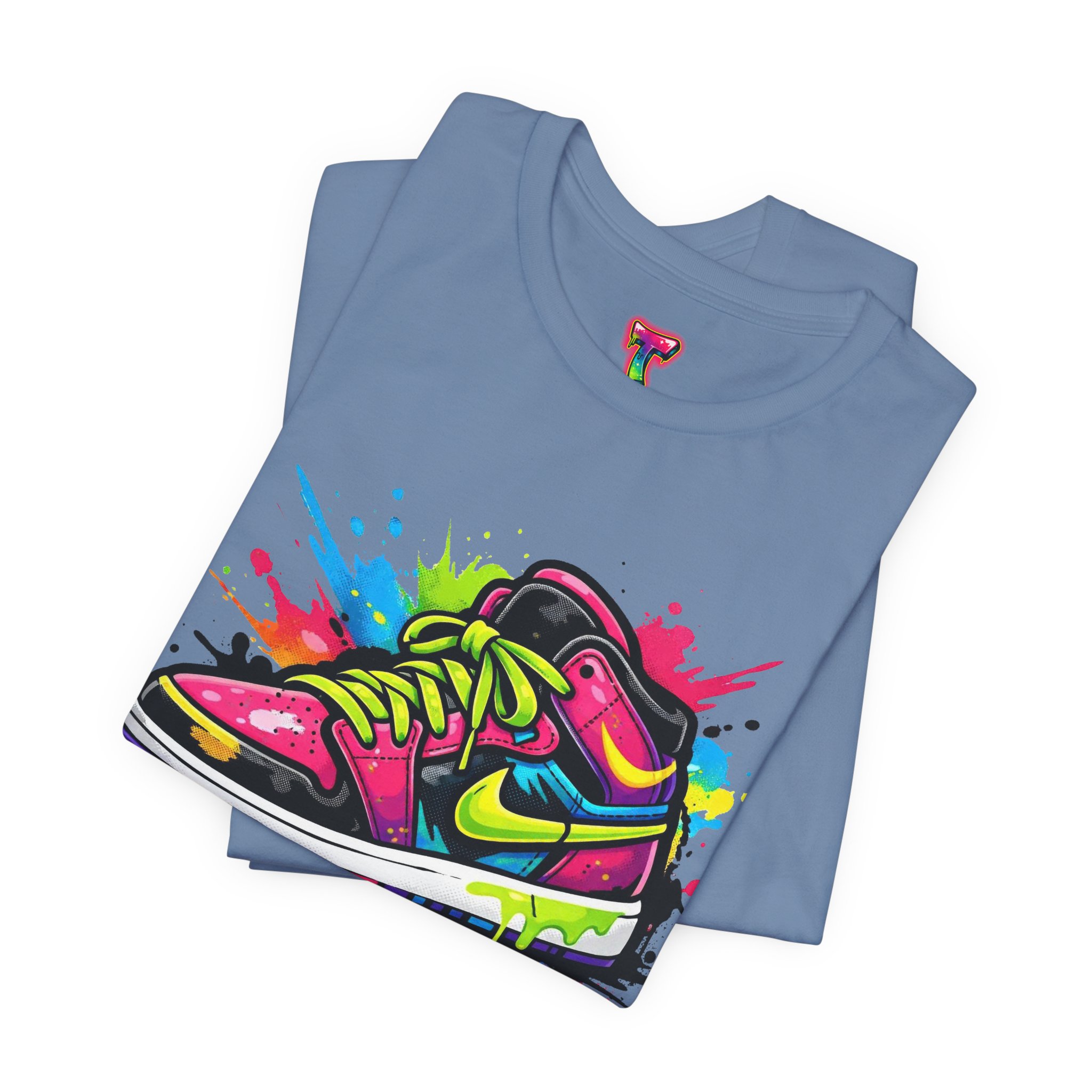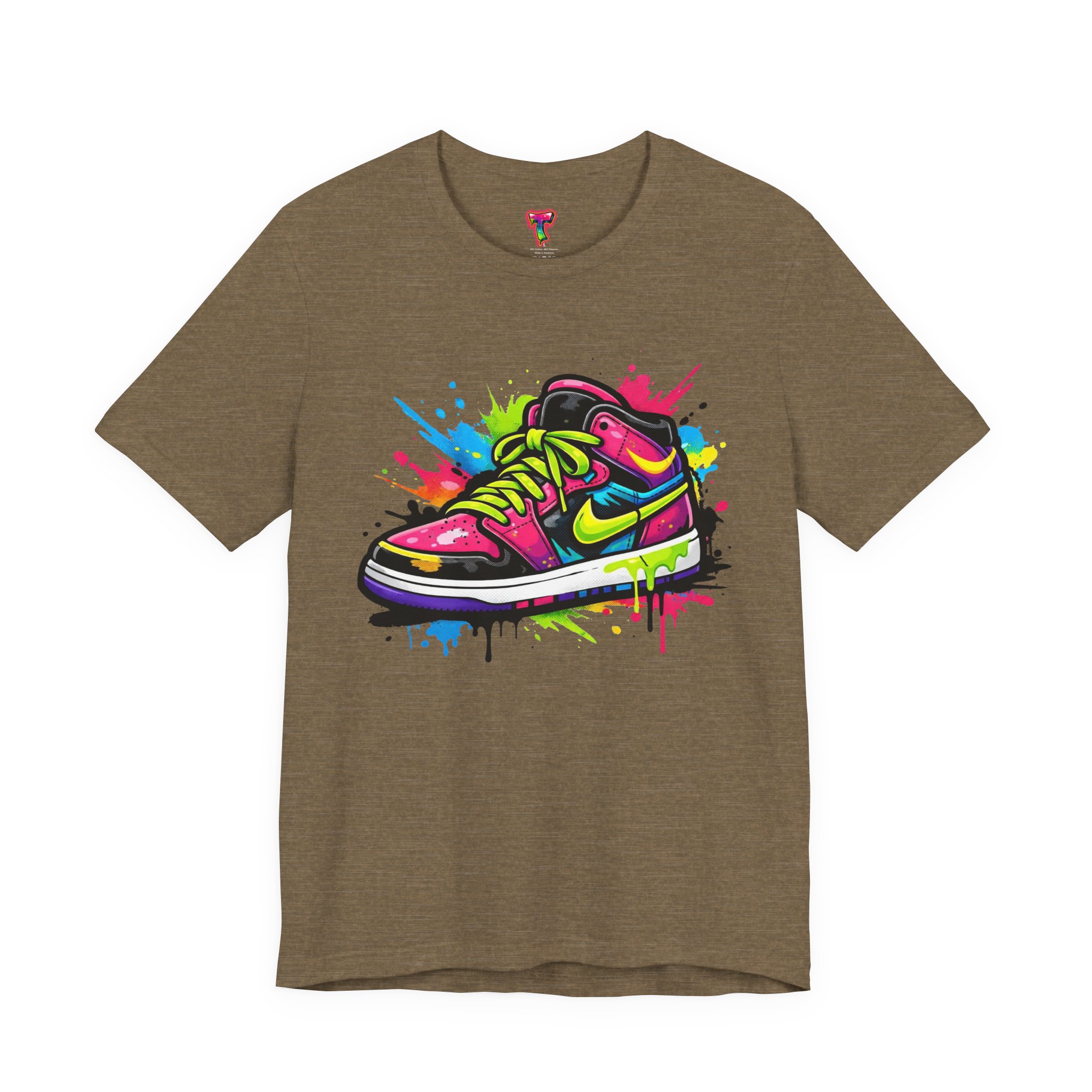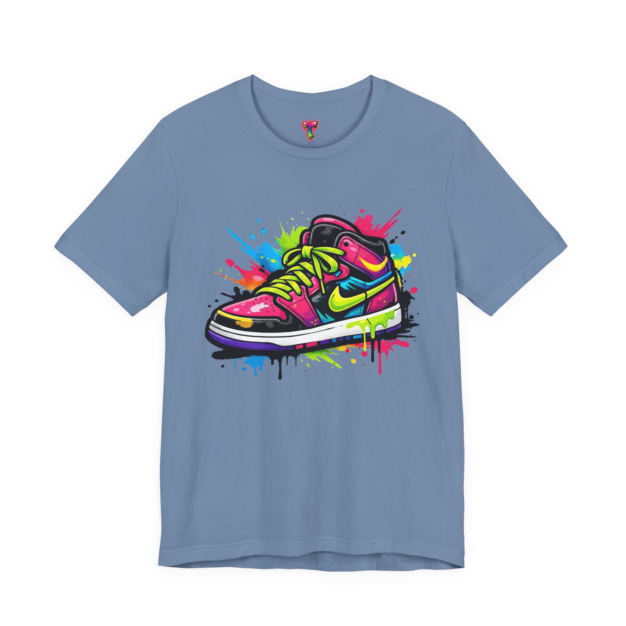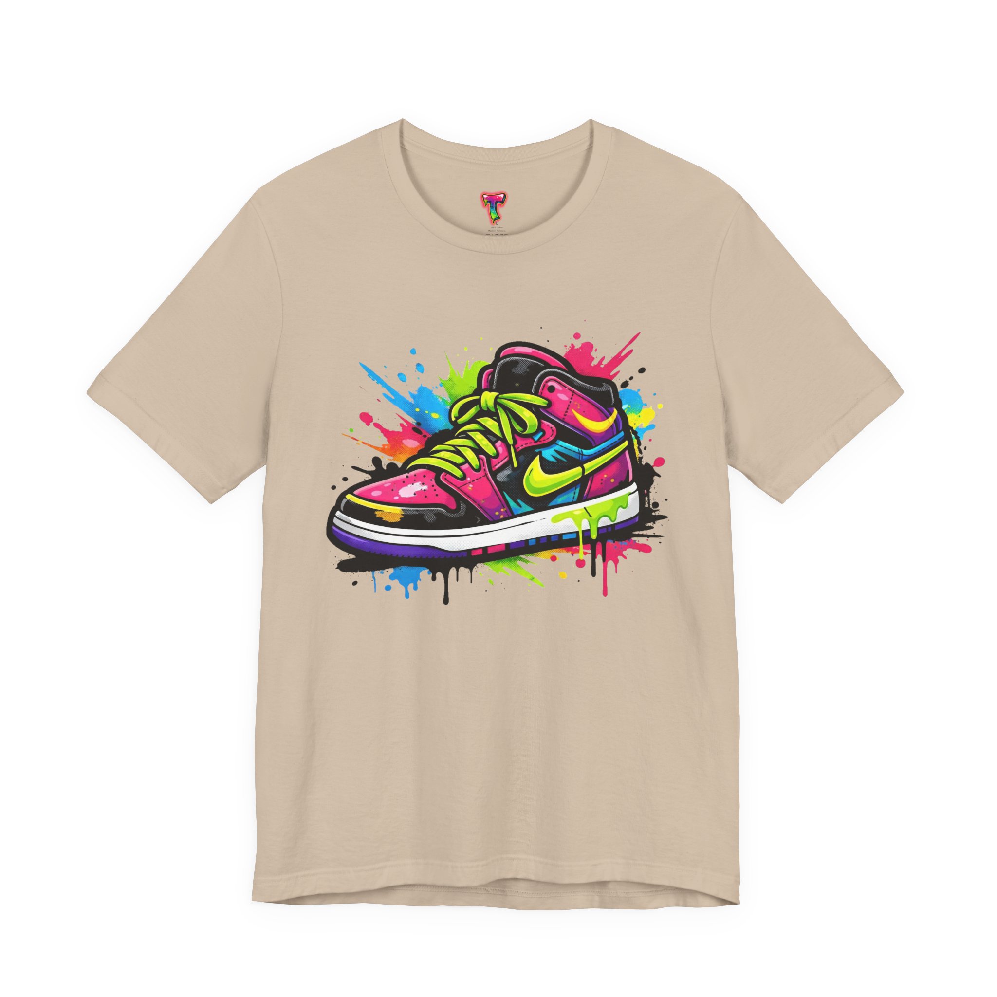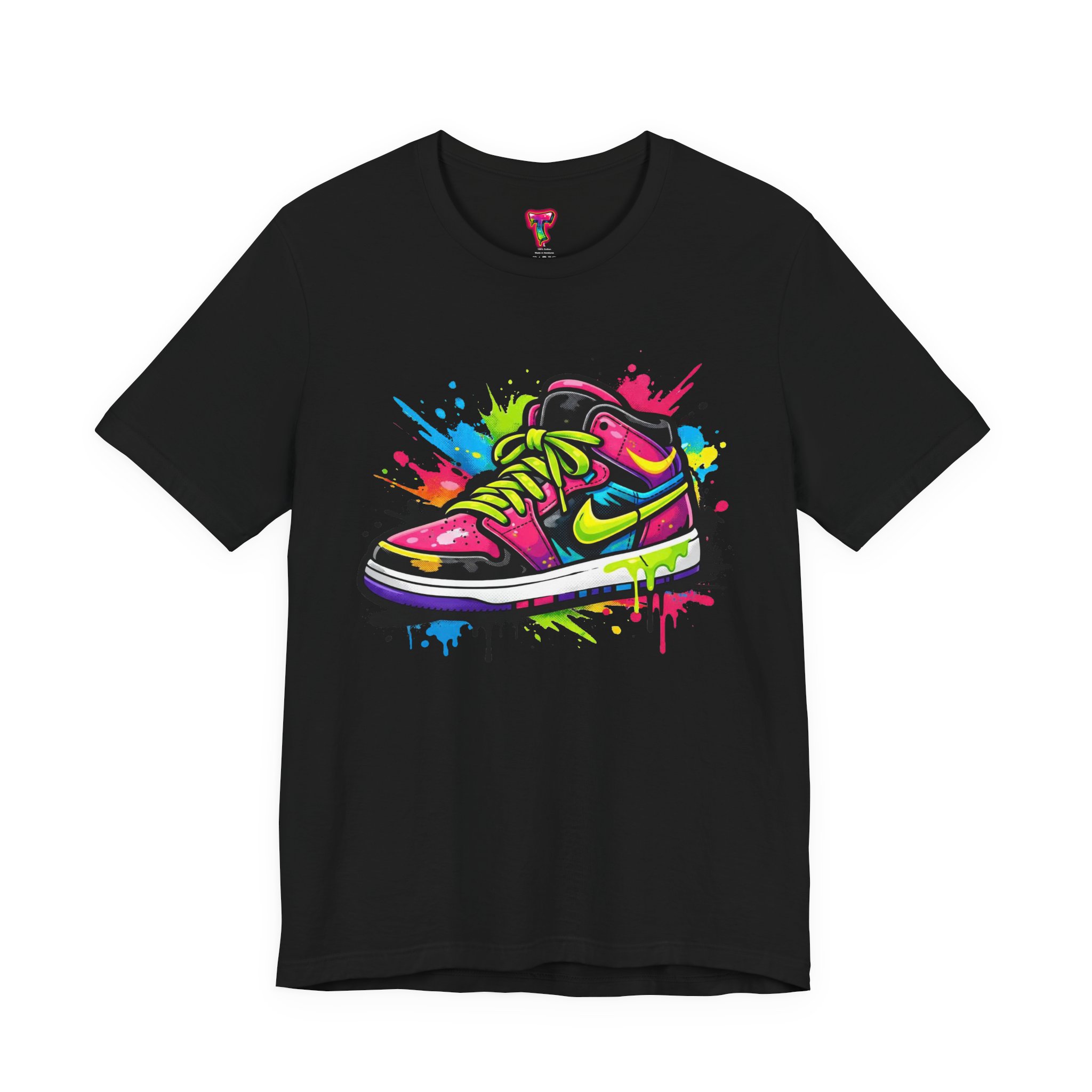 This lightweight jersey tee brings street-art energy to everyday wear. A vivid, hand-drawn sneaker splash sits center chest: neon pinks, electric greens and cobalt blues layered with paint-drip accents for a bold, urban look. The breathable Airlume combed cotton feels soft against skin and keeps you cool on busy days. Finished with a ribbed crew neck, side seams for shape retention, and a tear-away label for comfort. Wear it layered under a denim jacket or solo with joggers — it reads like a canvas you live in, not just a shirt you put on.