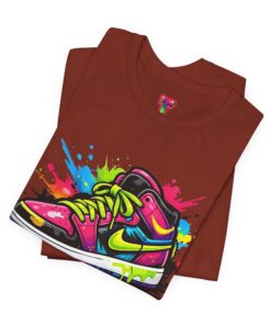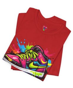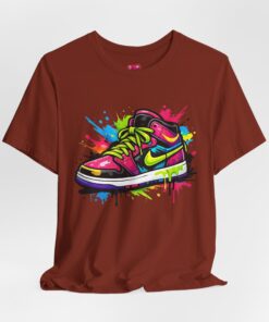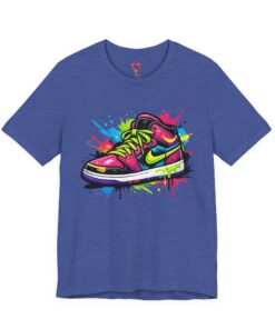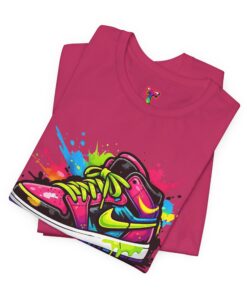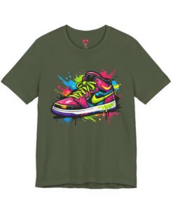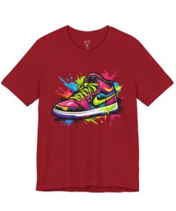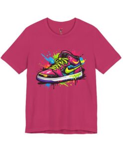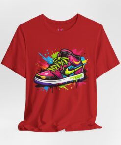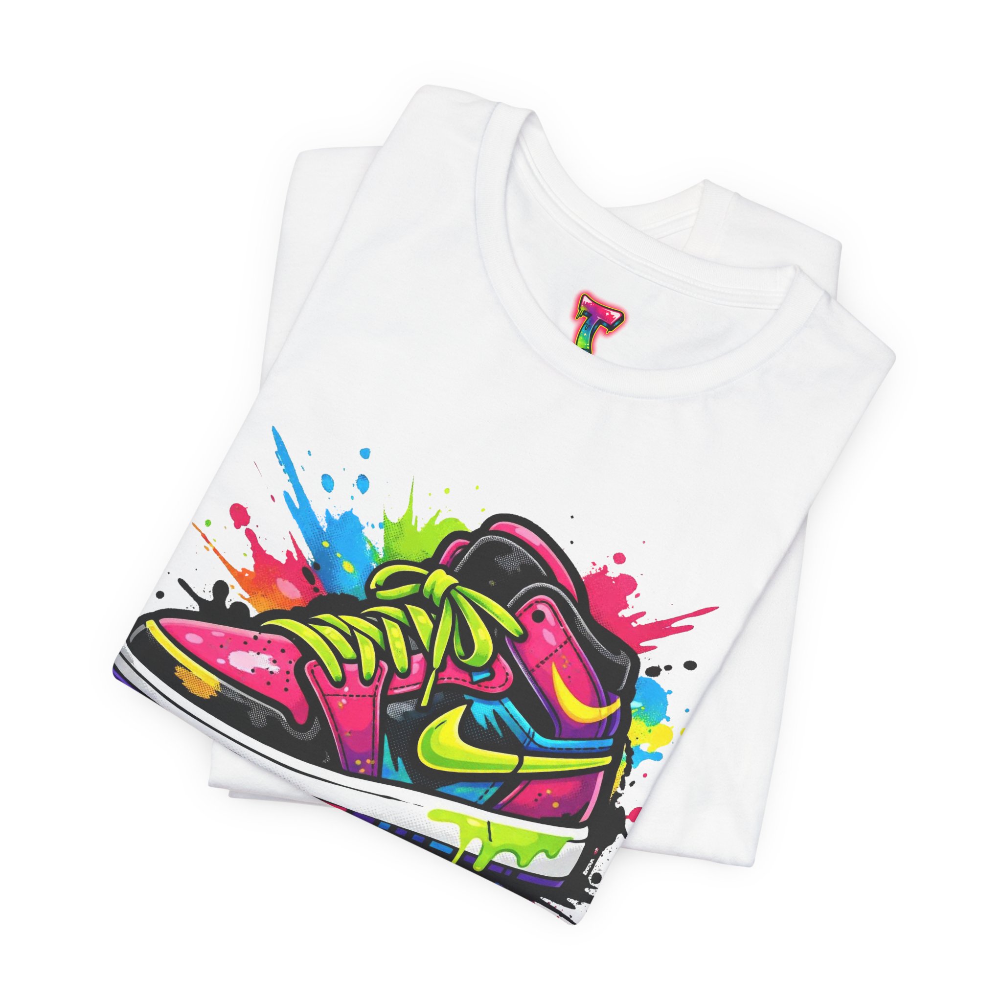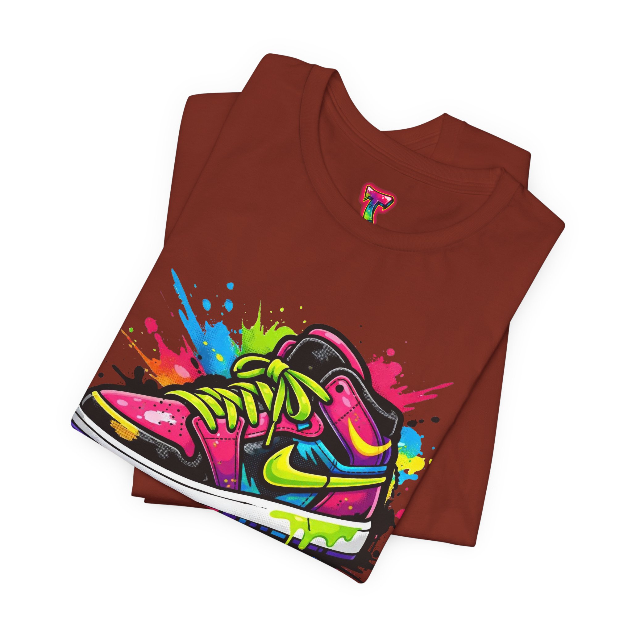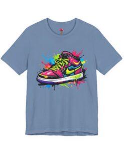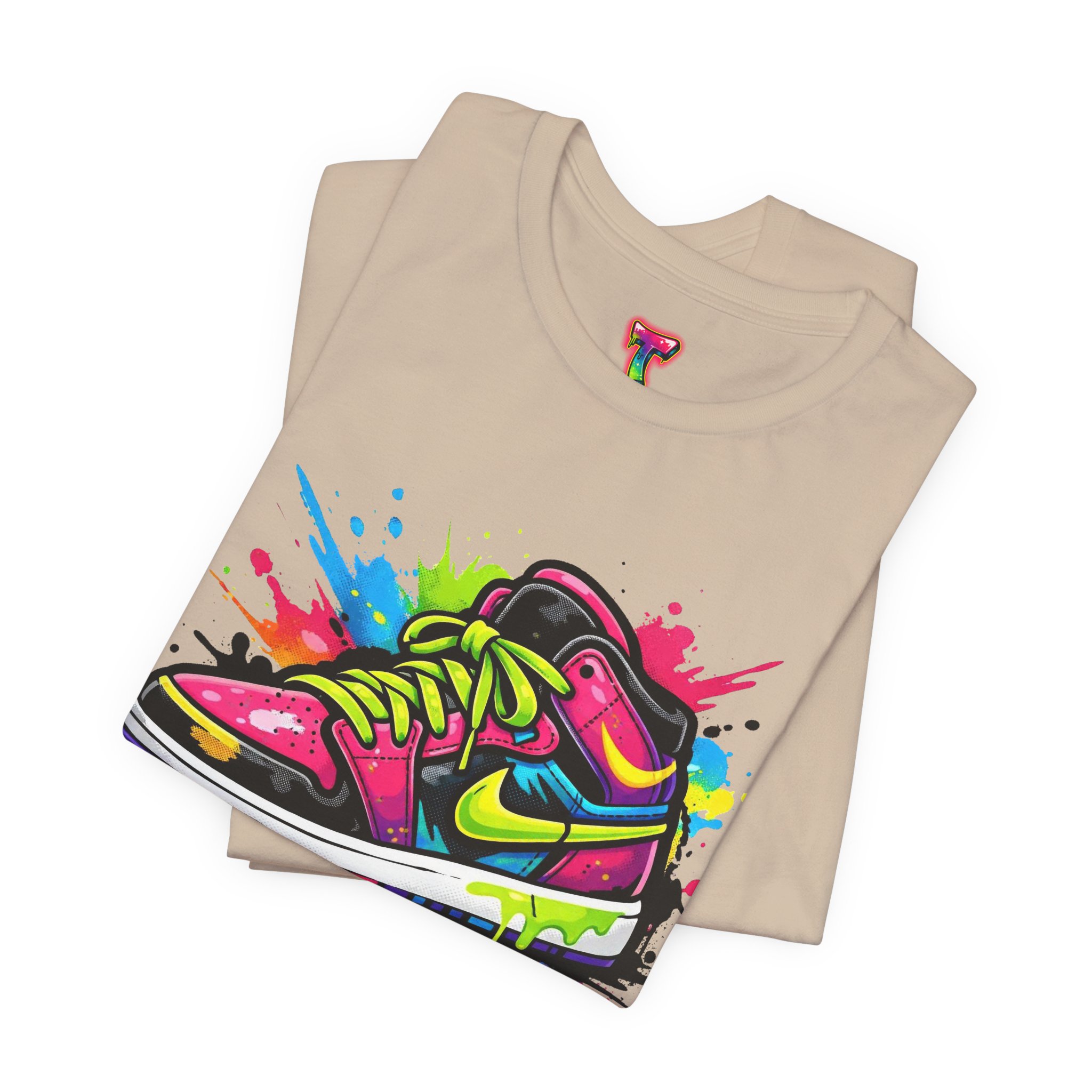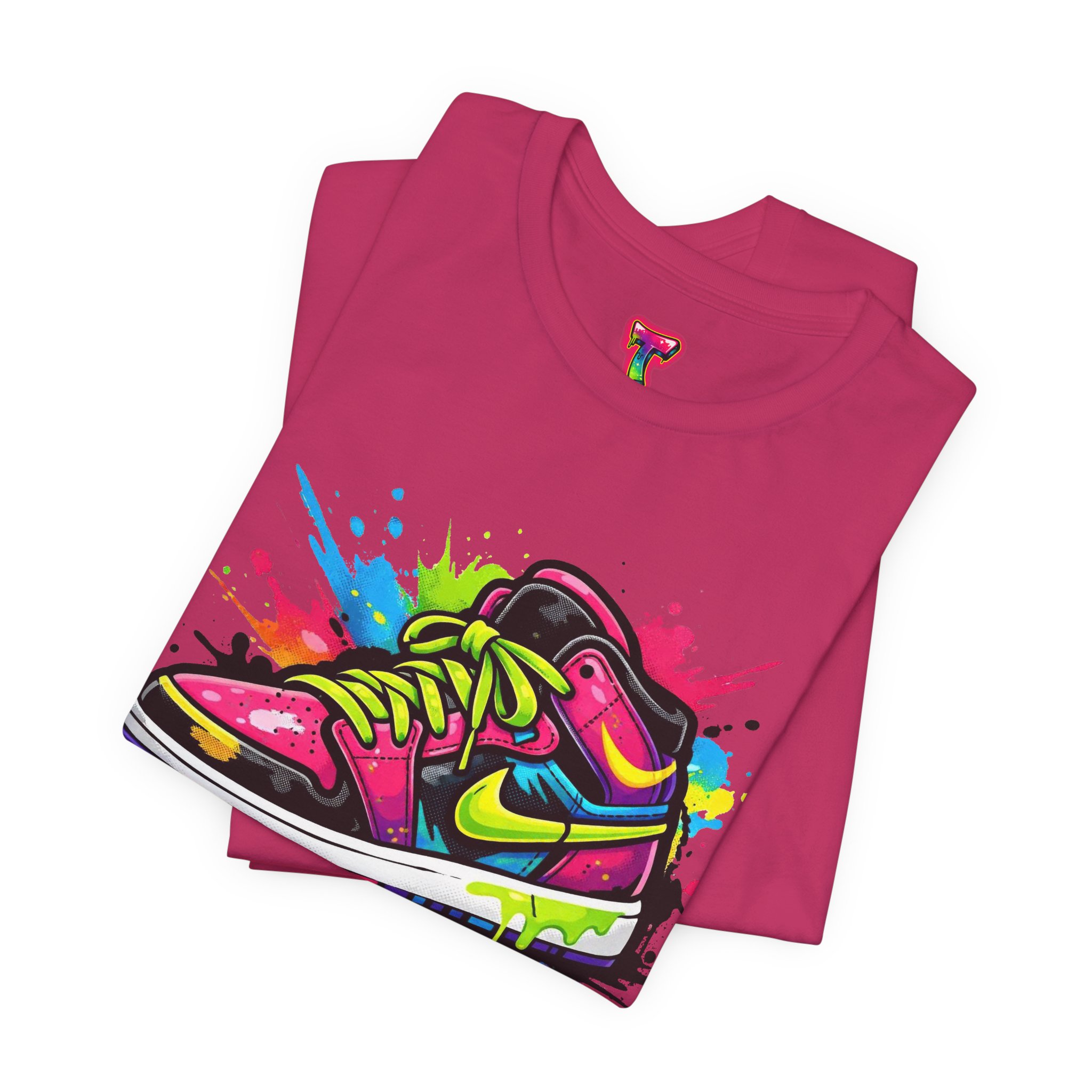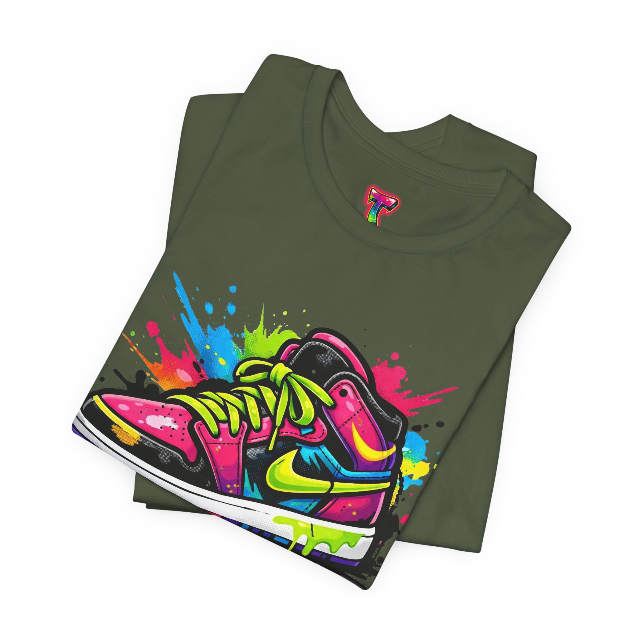This lightweight jersey tee brings street-art energy to everyday wear. A vivid, hand-drawn sneaker splash sits center chest: neon pinks, electric greens and cobalt blues layered with paint-drip accents for a bold, urban look. The breathable Airlume combed cotton feels soft against skin and keeps you cool on busy days. Finished with a ribbed crew neck, side seams for shape retention, and a tear-away label for comfort. Wear it layered under a denim jacket or solo with joggers — it reads like a canvas you live in, not just a shirt you put on.