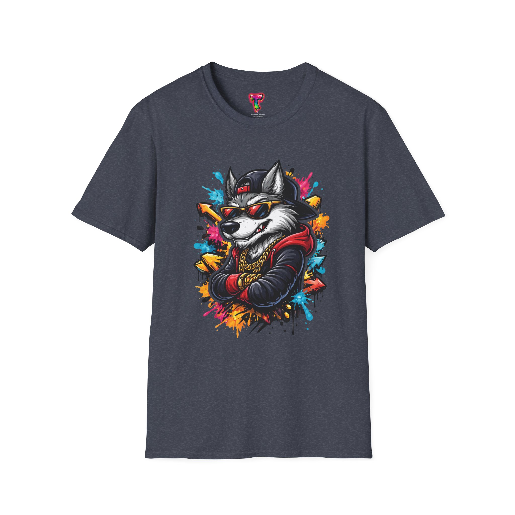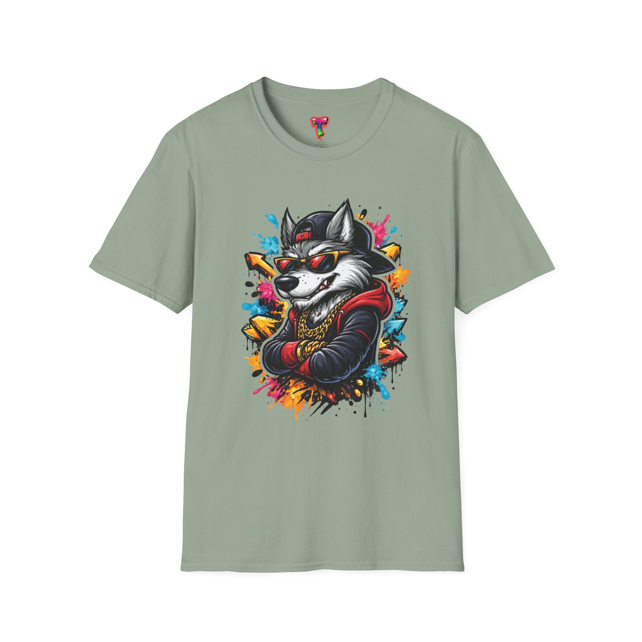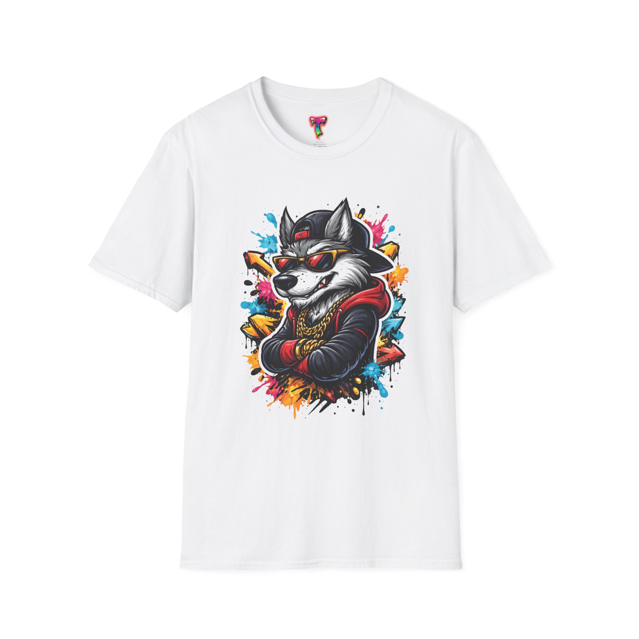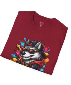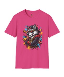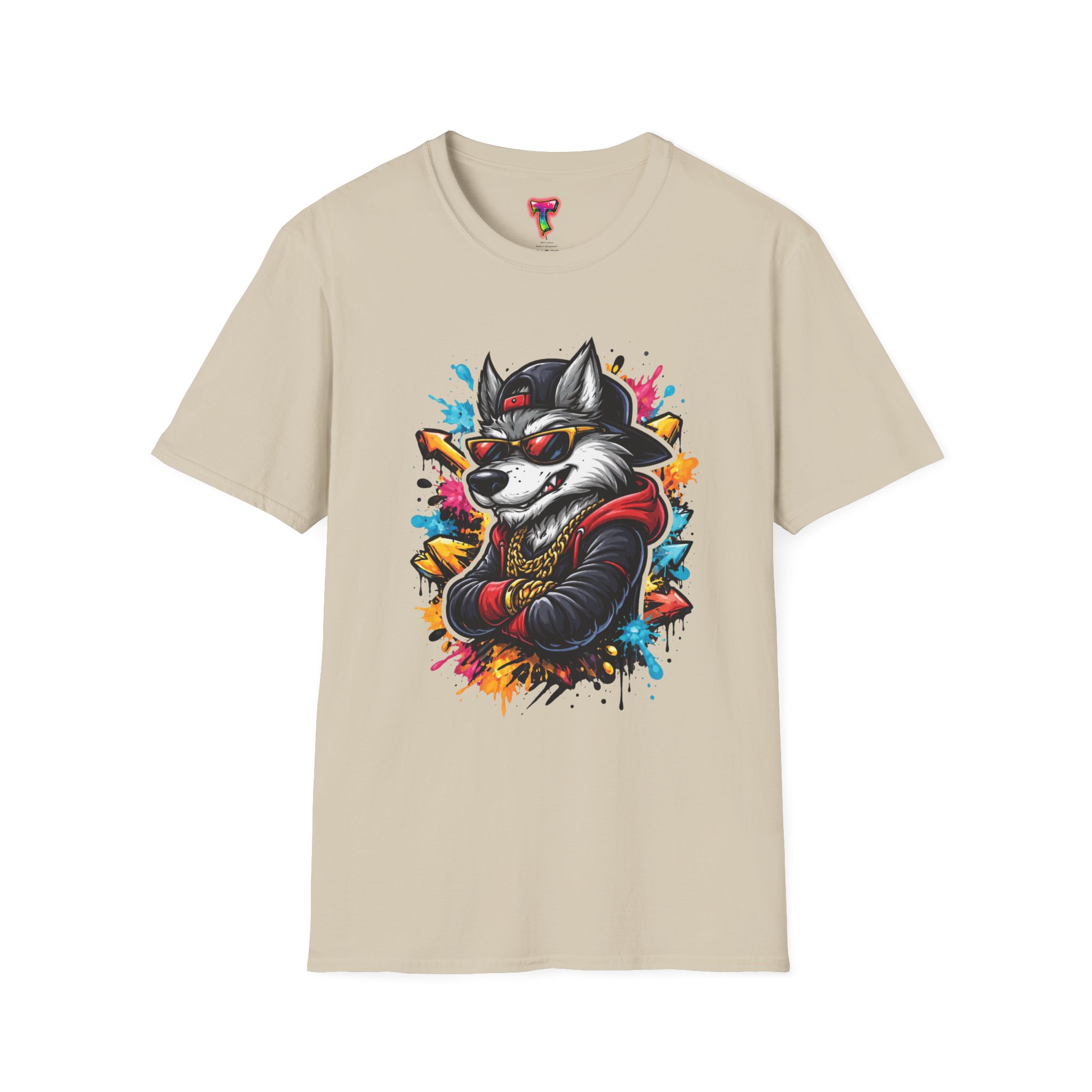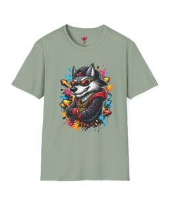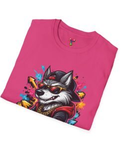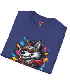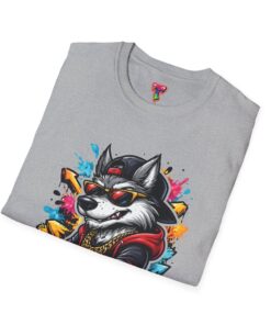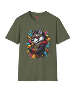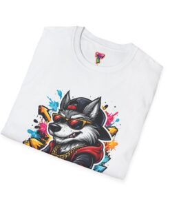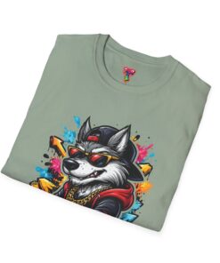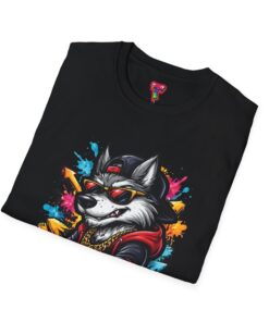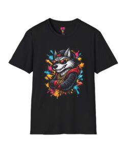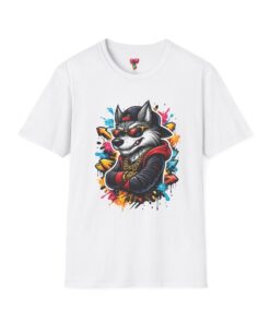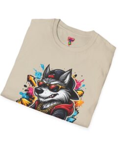 This crisp cotton tee wears like a confident nod — bold artwork at the chest, soft drape against the skin, and a clean crew neckline that keeps the look effortless. The graphic shows a streetwise wolf in a leather jacket and shades, splashed with vibrant paint accents that catch the eye and add movement. It fits into everyday wardrobes for people who lean into urban edge: skateboarders, street-art fans, band-goers, and anyone who likes a bit of bite in their style. Wear it to late-night gigs, art walks, skate sessions, or casual meetups; the lightweight ring-spun cotton keeps you comfortable while the durable print holds up to repeat wear. Simple, sturdy construction (no side seams, taped shoulders, ribbed collar) means this tee looks good wash after wash.