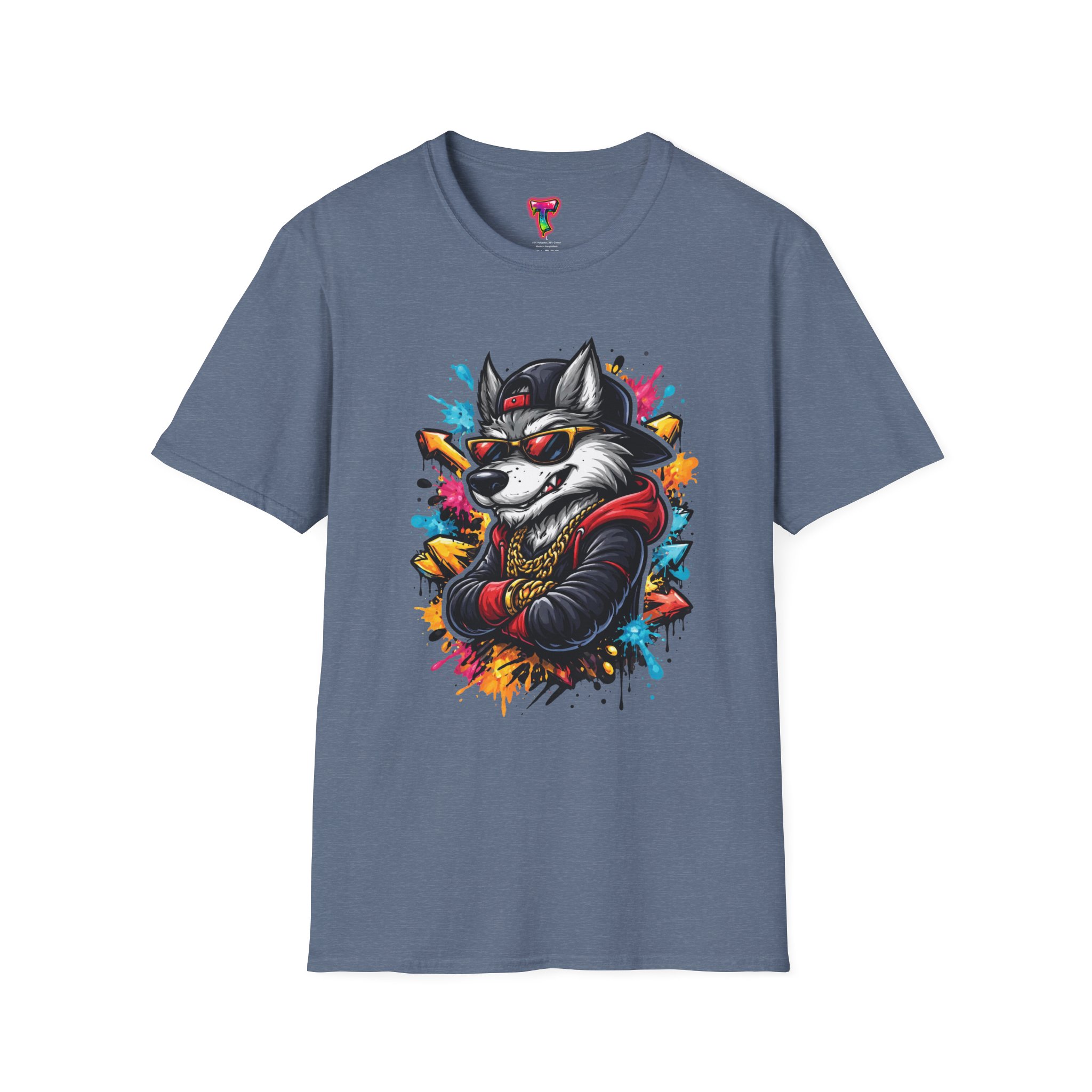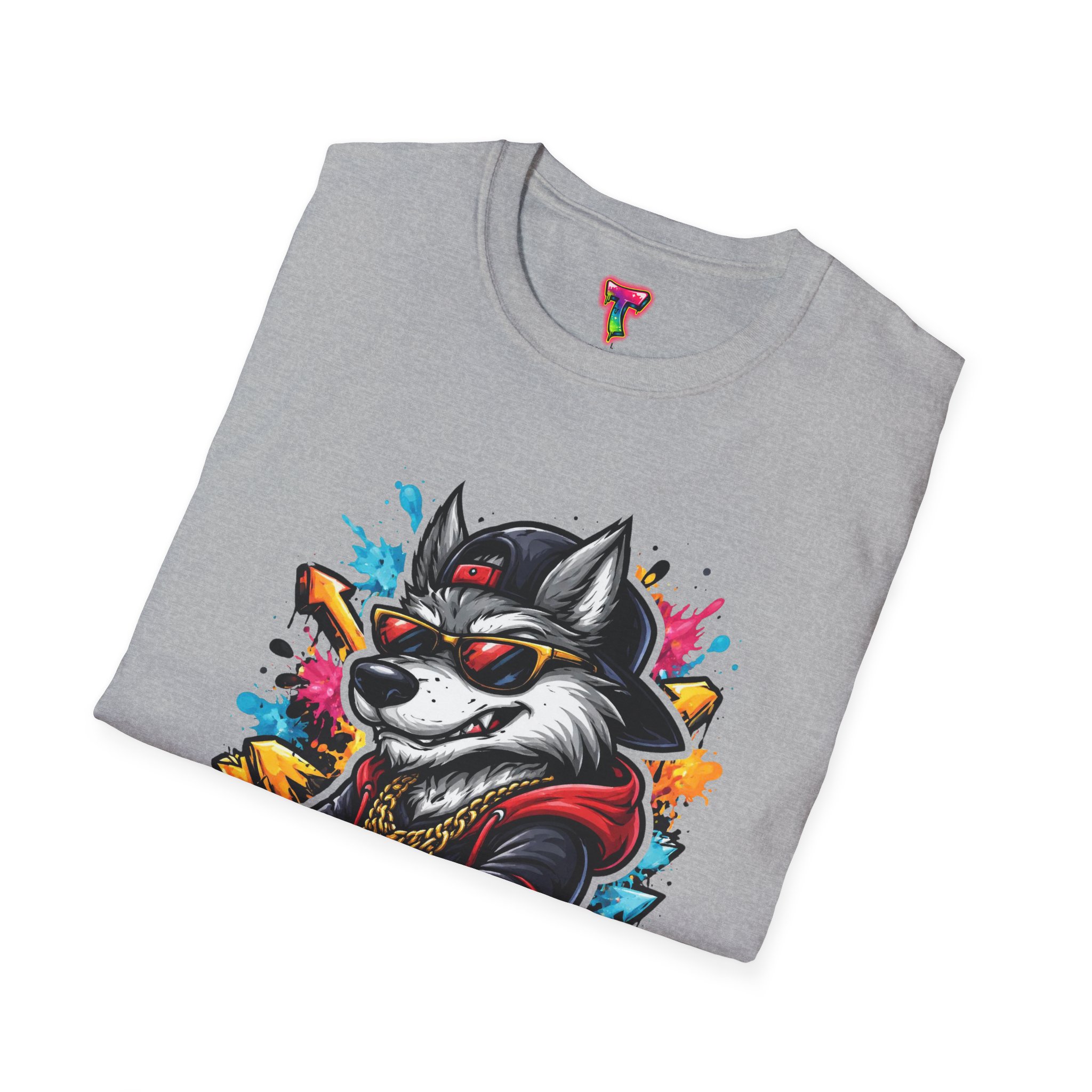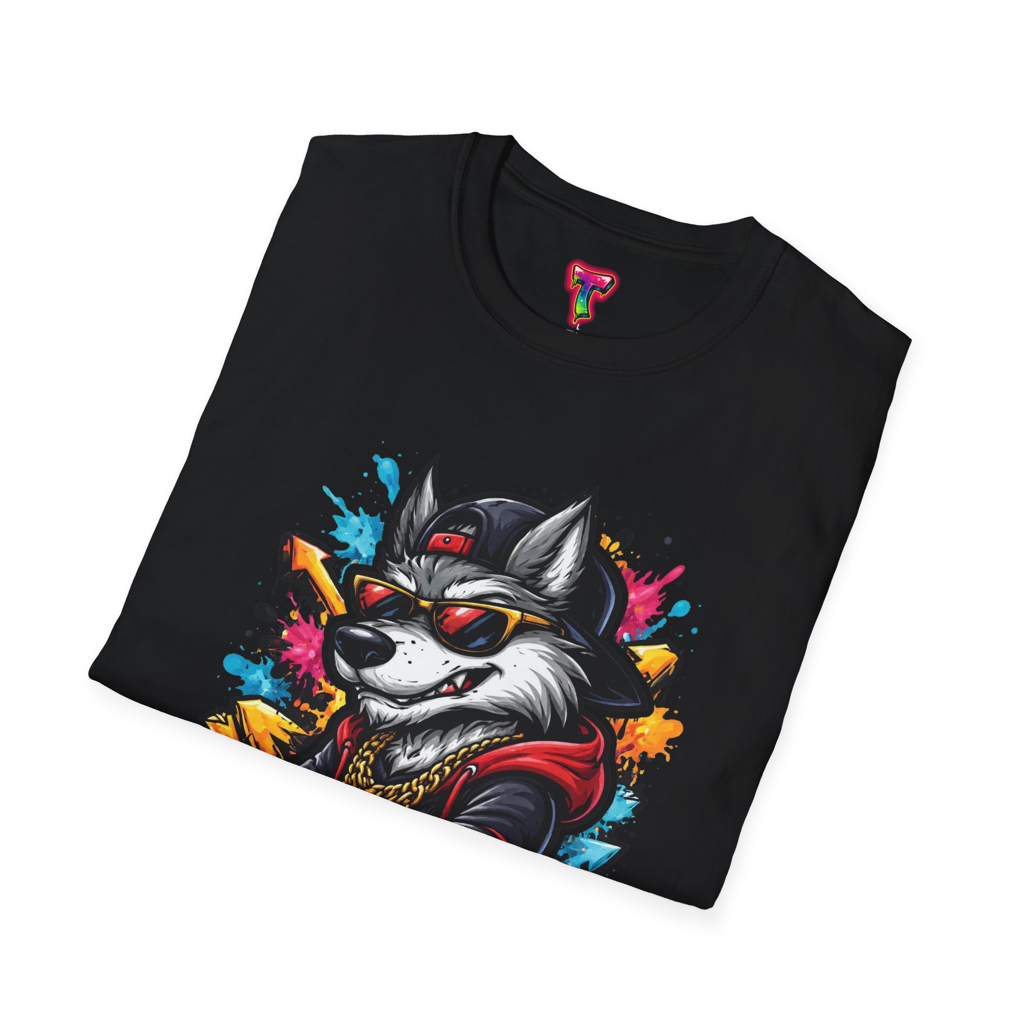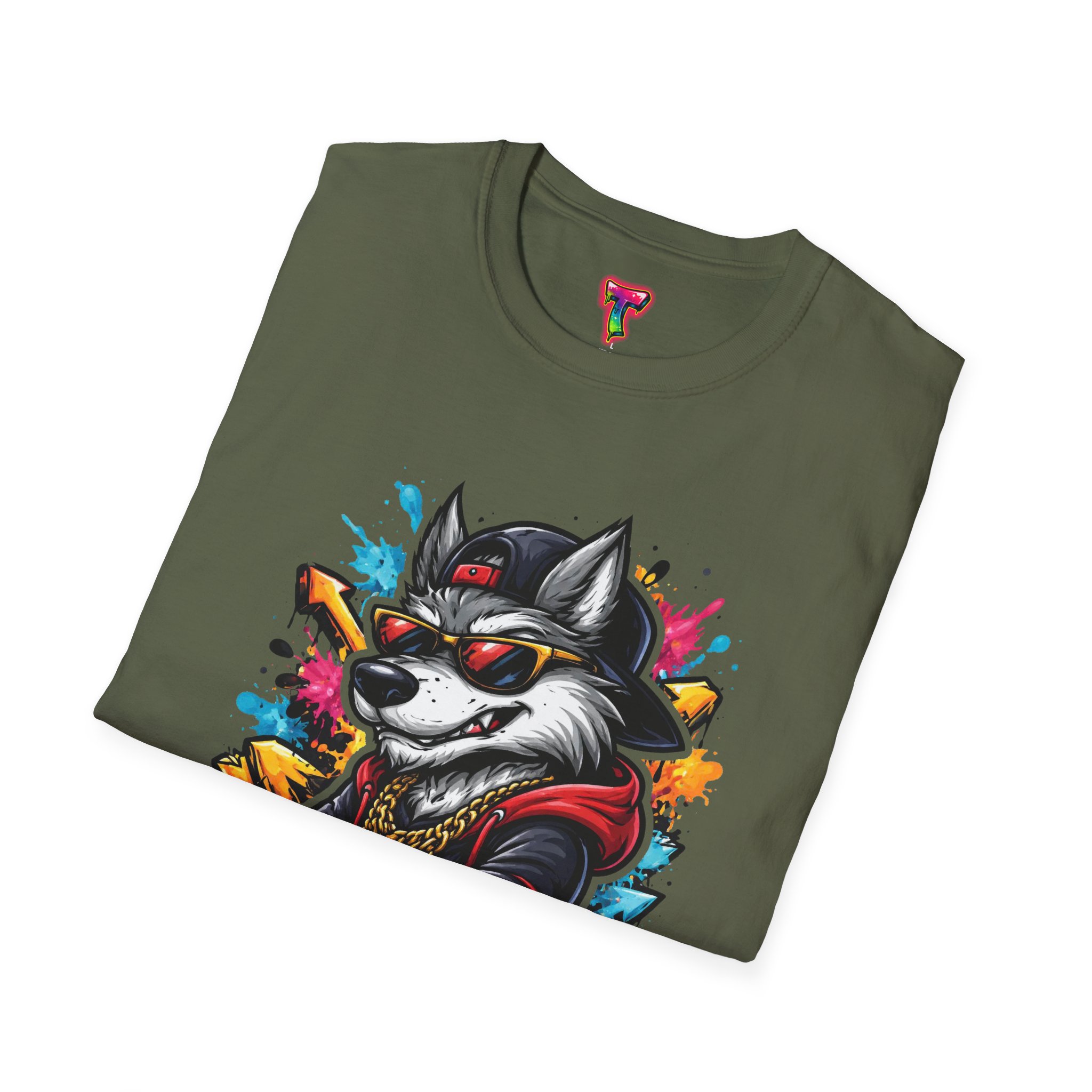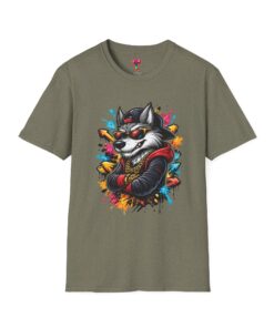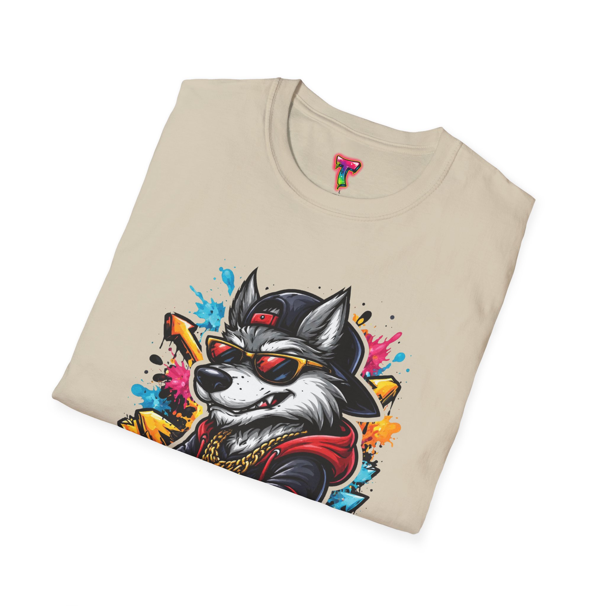 This crisp cotton tee wears like a confident nod — bold artwork at the chest, soft drape against the skin, and a clean crew neckline that keeps the look effortless. The graphic shows a streetwise wolf in a leather jacket and shades, splashed with vibrant paint accents that catch the eye and add movement. It fits into everyday wardrobes for people who lean into urban edge: skateboarders, street-art fans, band-goers, and anyone who likes a bit of bite in their style. Wear it to late-night gigs, art walks, skate sessions, or casual meetups; the lightweight ring-spun cotton keeps you comfortable while the durable print holds up to repeat wear. Simple, sturdy construction (no side seams, taped shoulders, ribbed collar) means this tee looks good wash after wash.