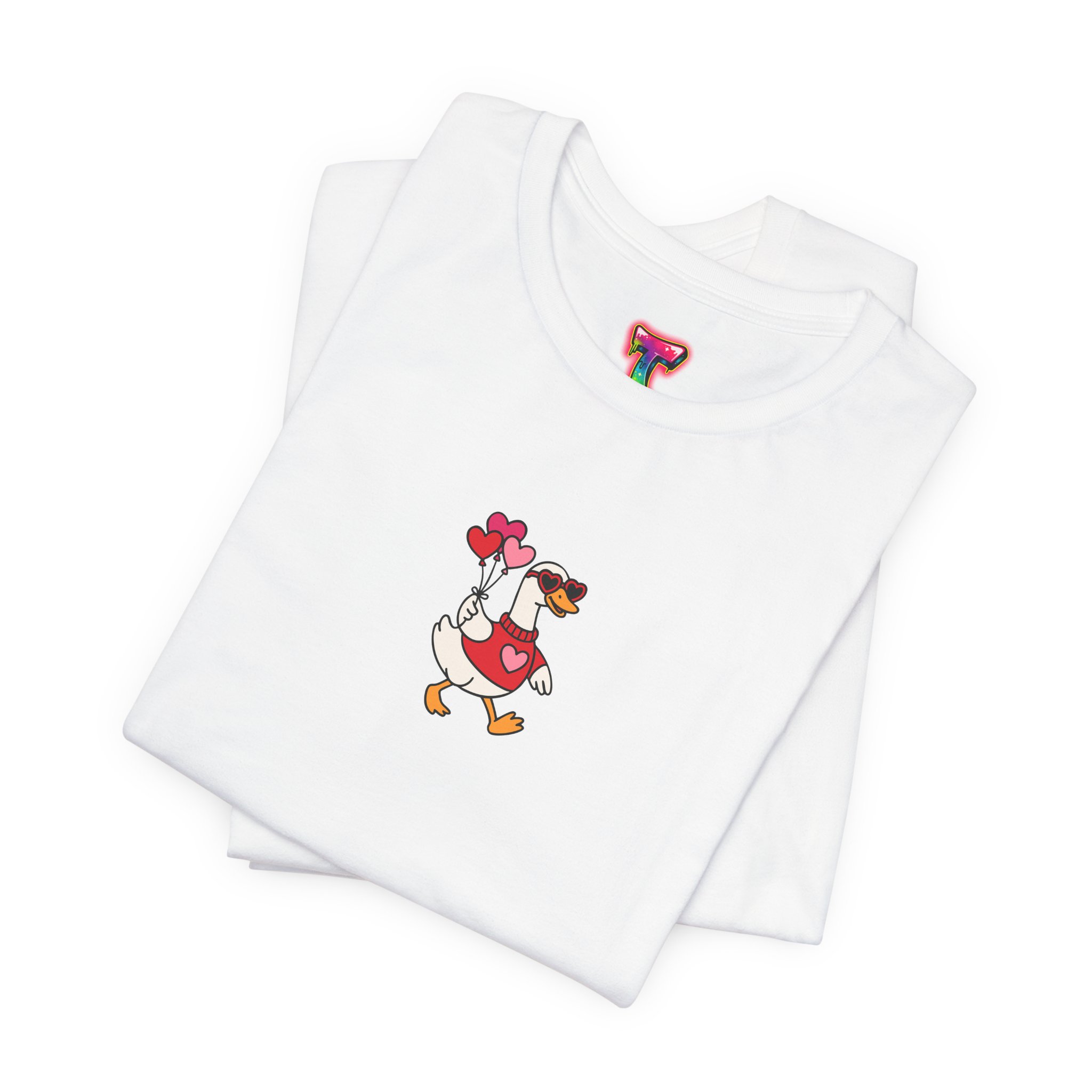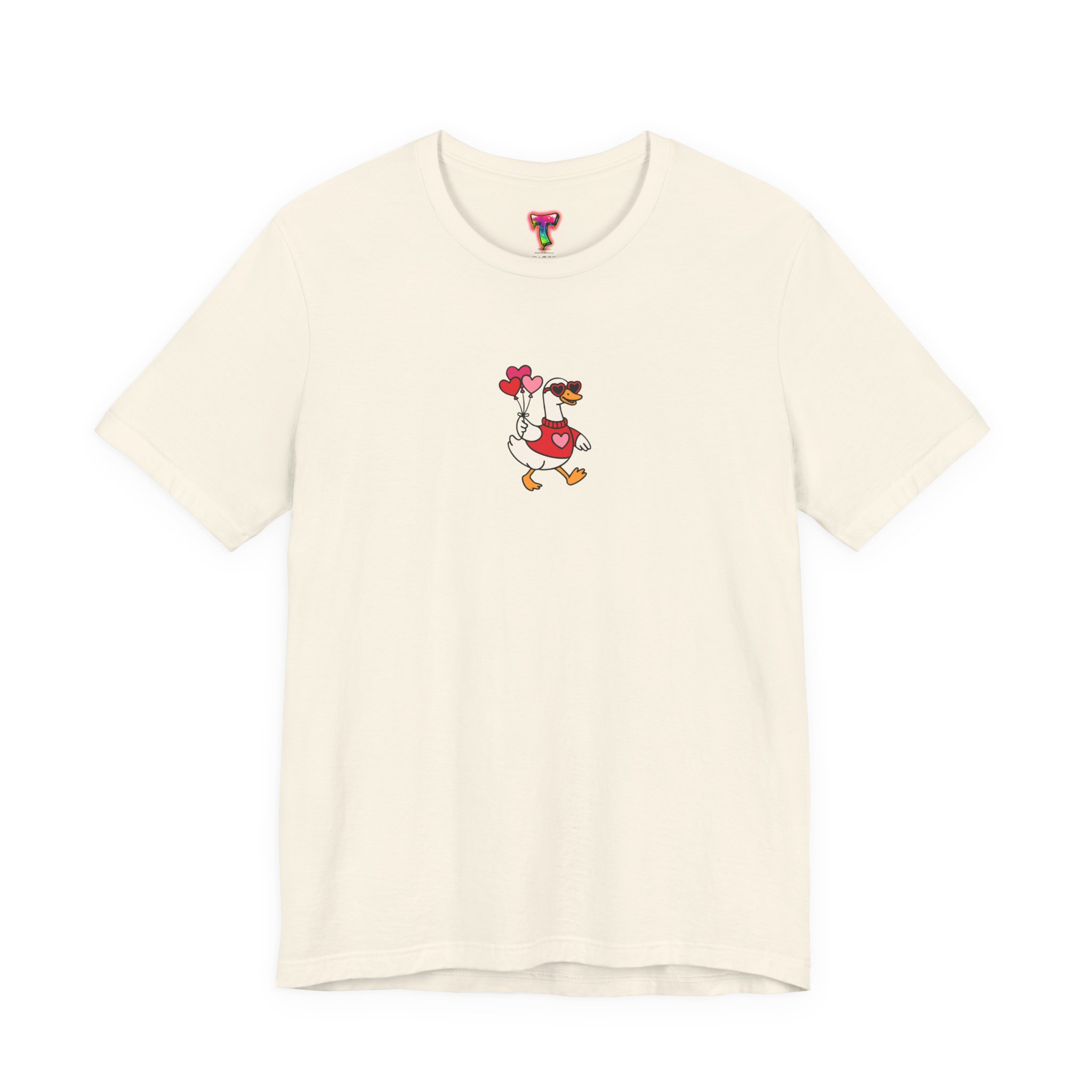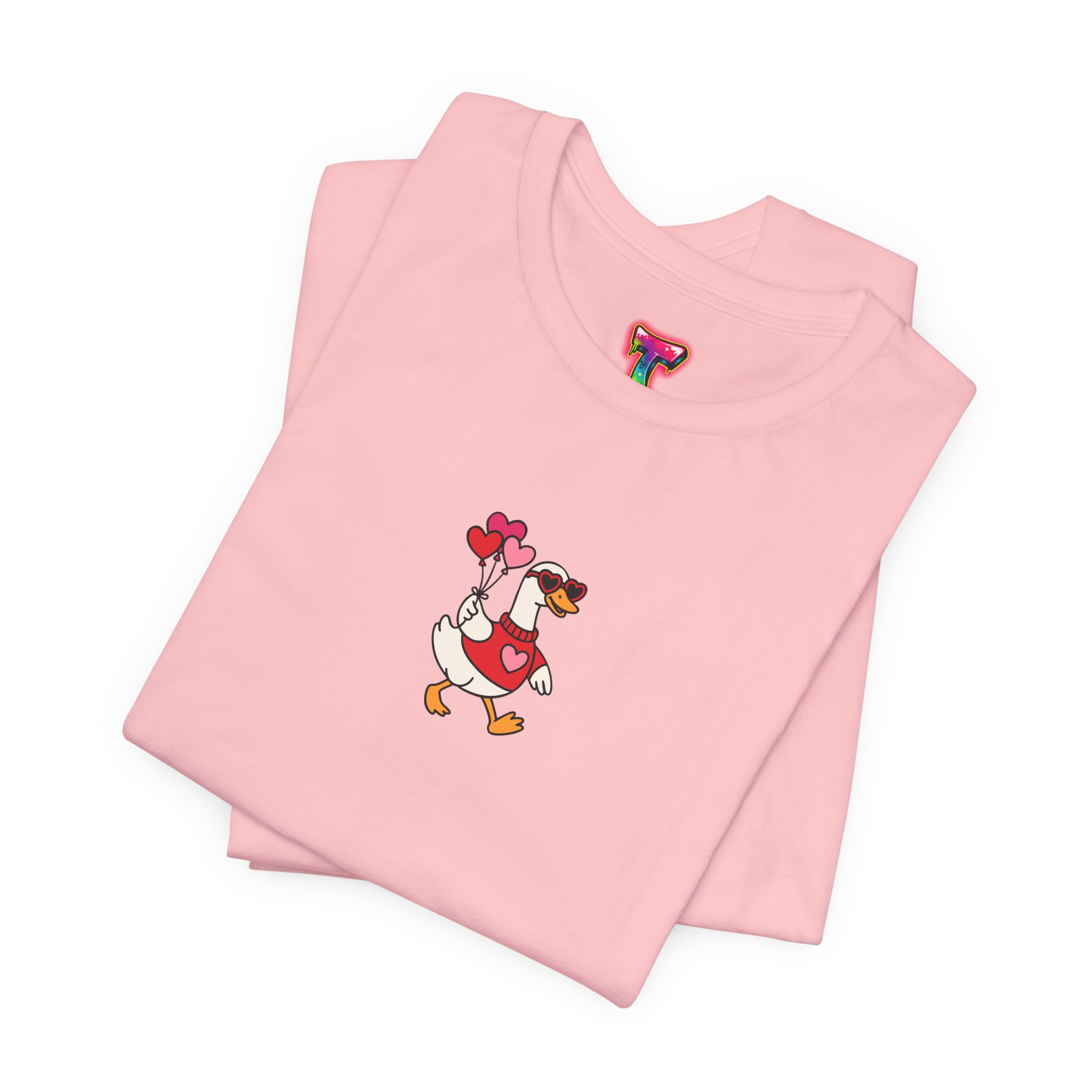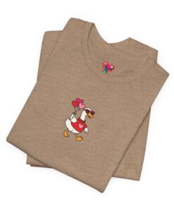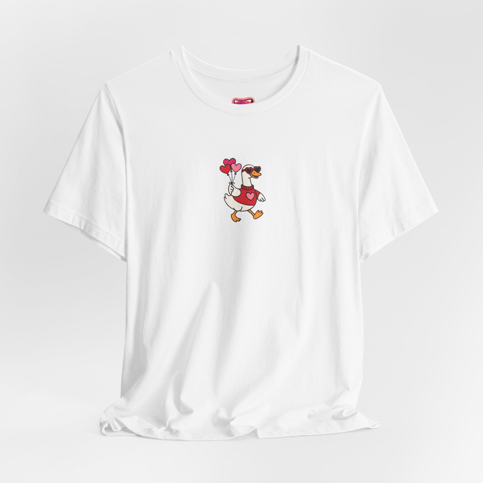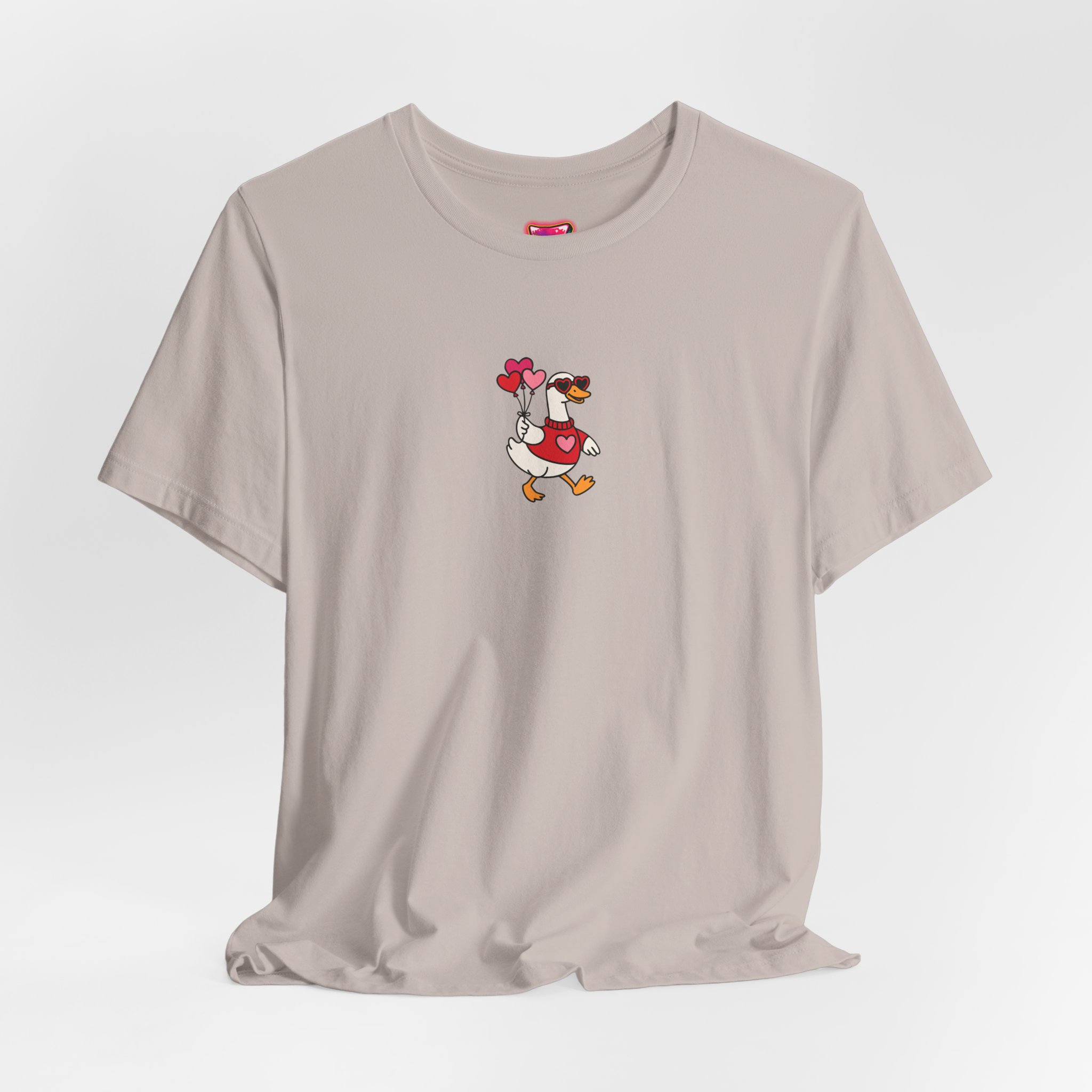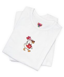 Steal the show with the coolest bird in town! Our “Cool Duck” Tee is all about confident vibes. This design features our signature white duckling looking extra smooth in black sunglasses and a heart-patterned red sweater, holding a bunch of pink heart balloons. It’s a playful mix of “cool” and “cute” that makes it an irresistible choice for anyone who loves unique, conversation-starting fashion.
