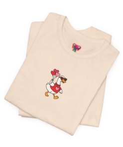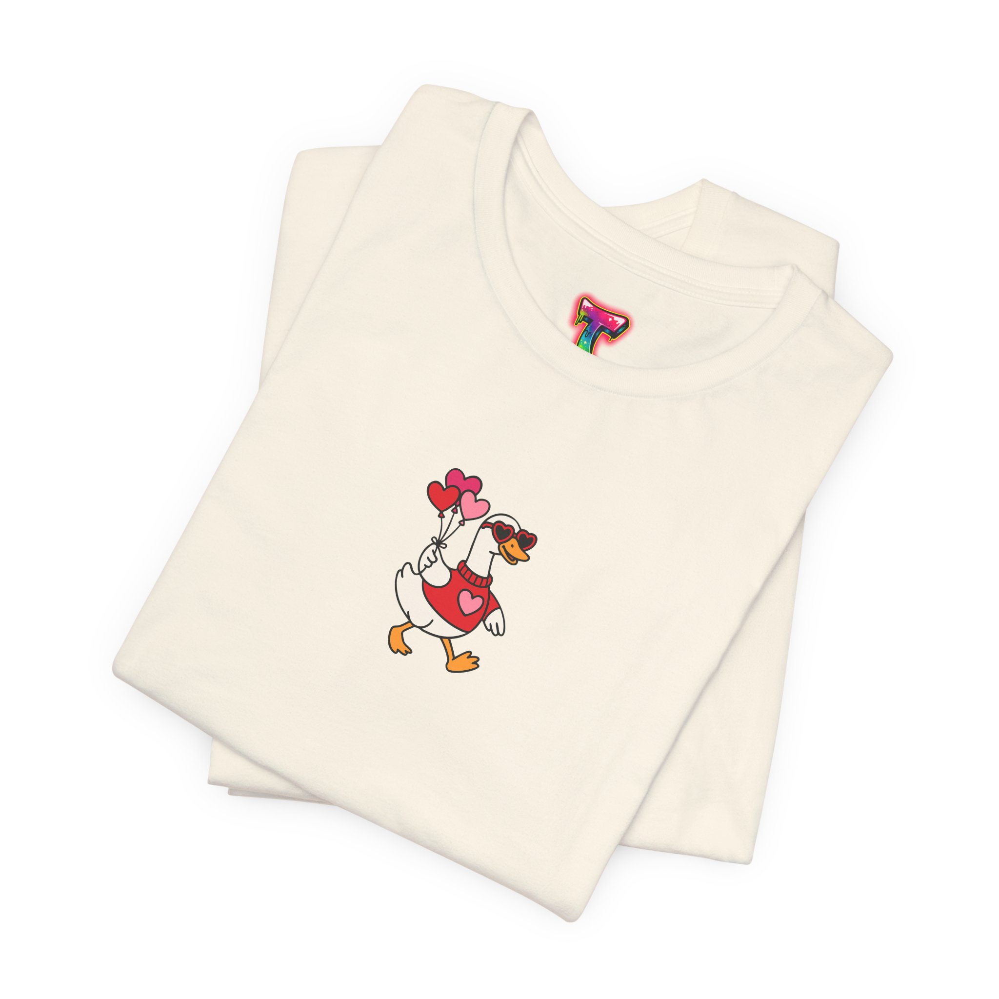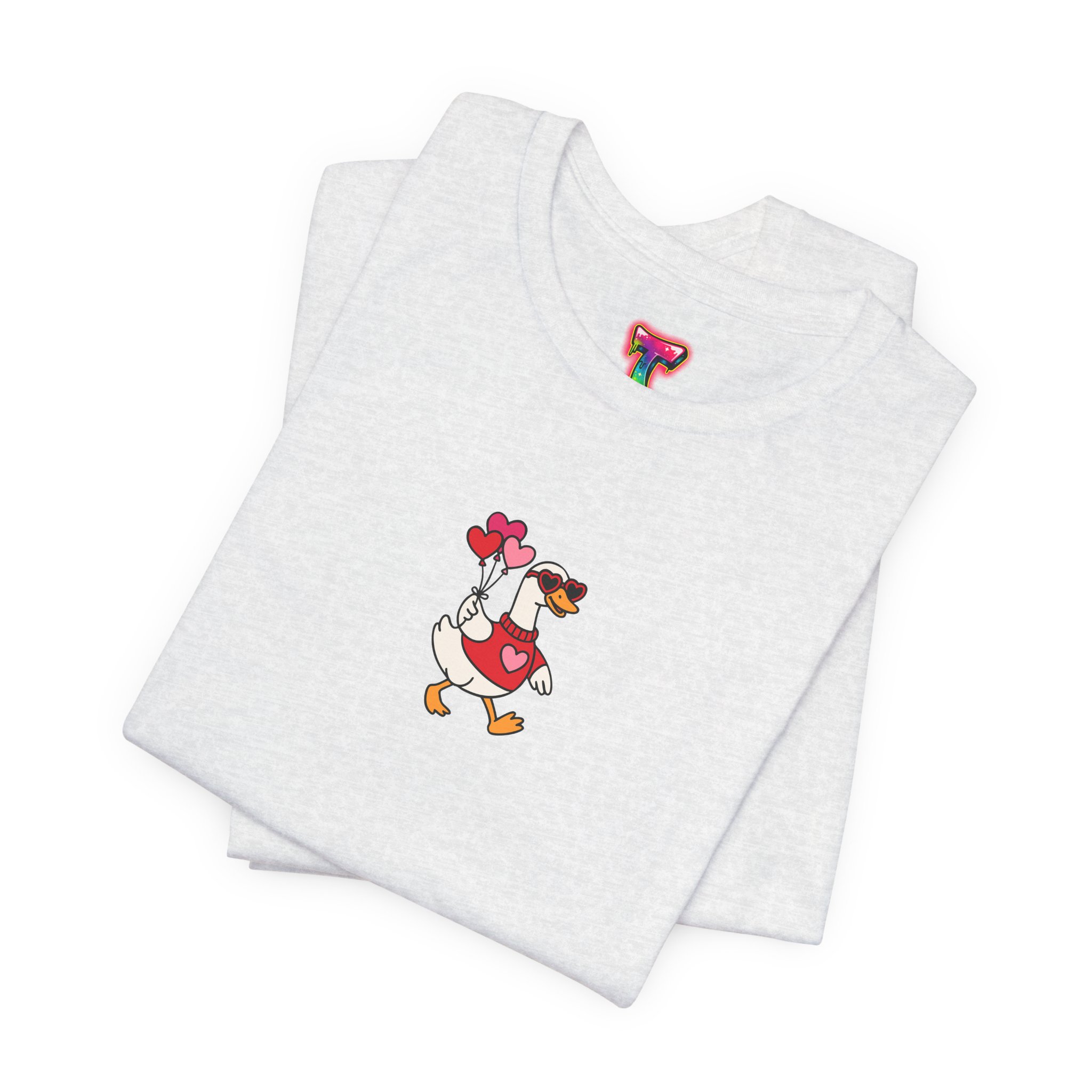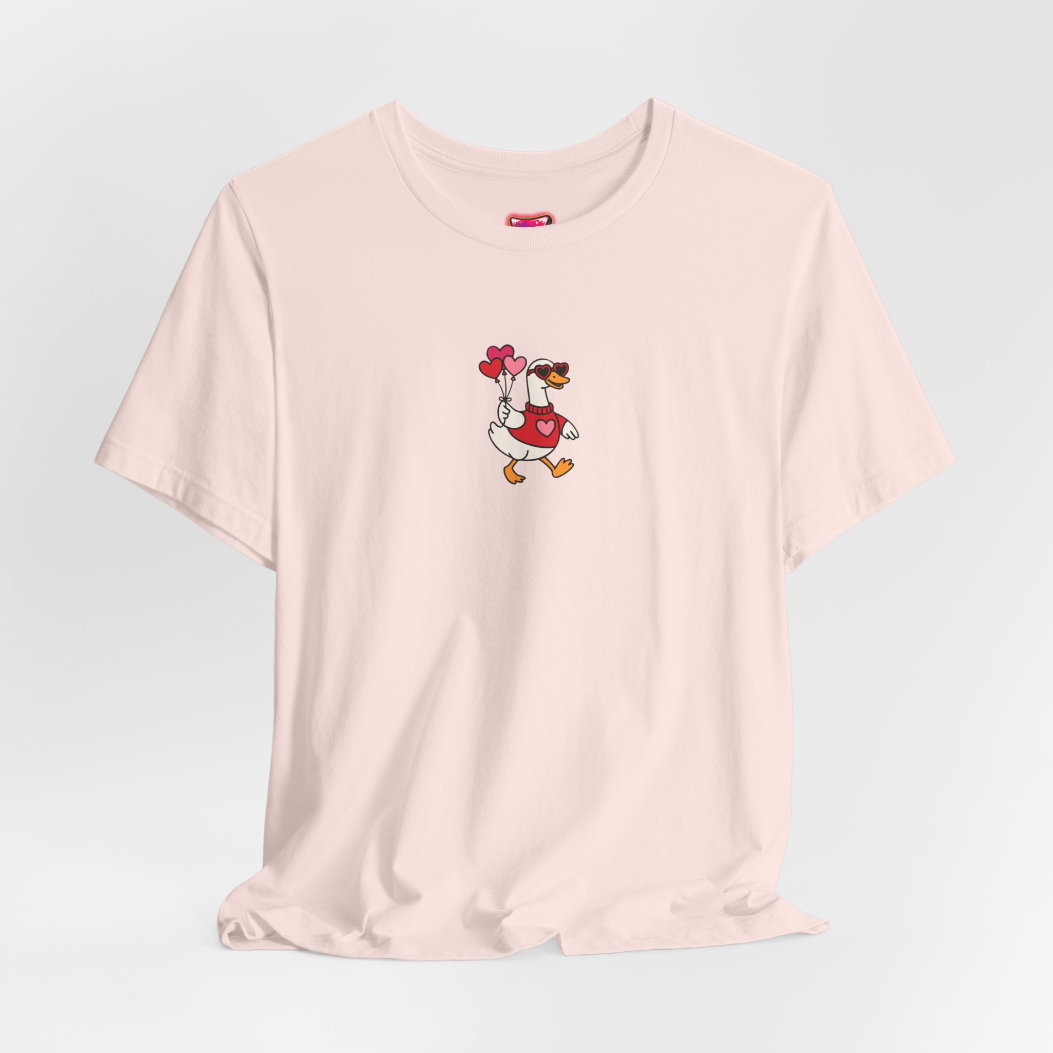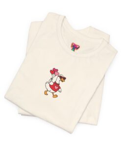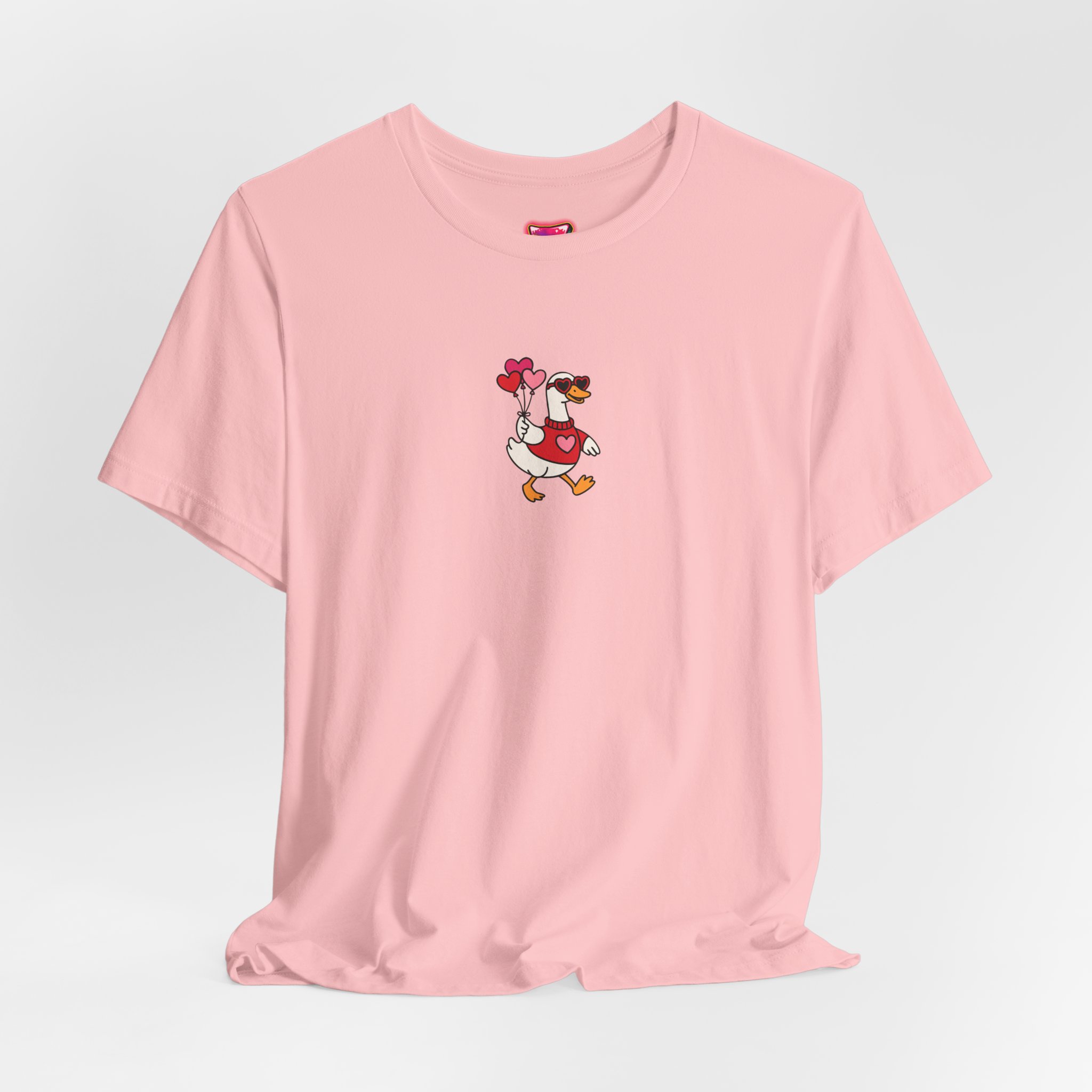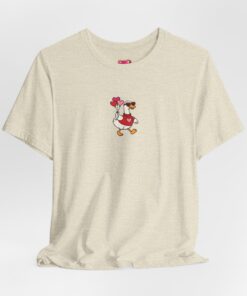 Steal the show with the coolest bird in town! Our “Cool Duck” Tee is all about confident vibes. This design features our signature white duckling looking extra smooth in black sunglasses and a heart-patterned red sweater, holding a bunch of pink heart balloons. It’s a playful mix of “cool” and “cute” that makes it an irresistible choice for anyone who loves unique, conversation-starting fashion.