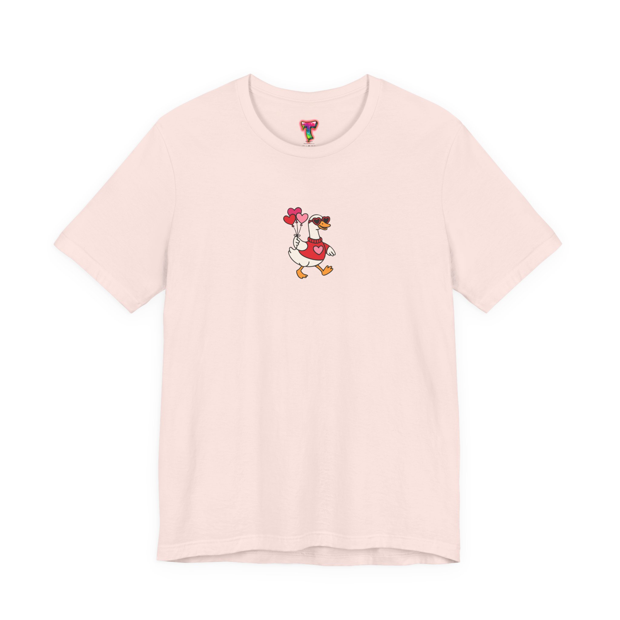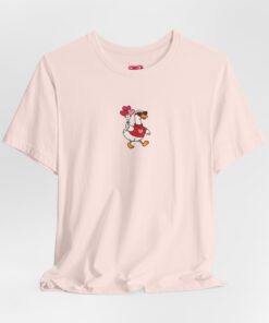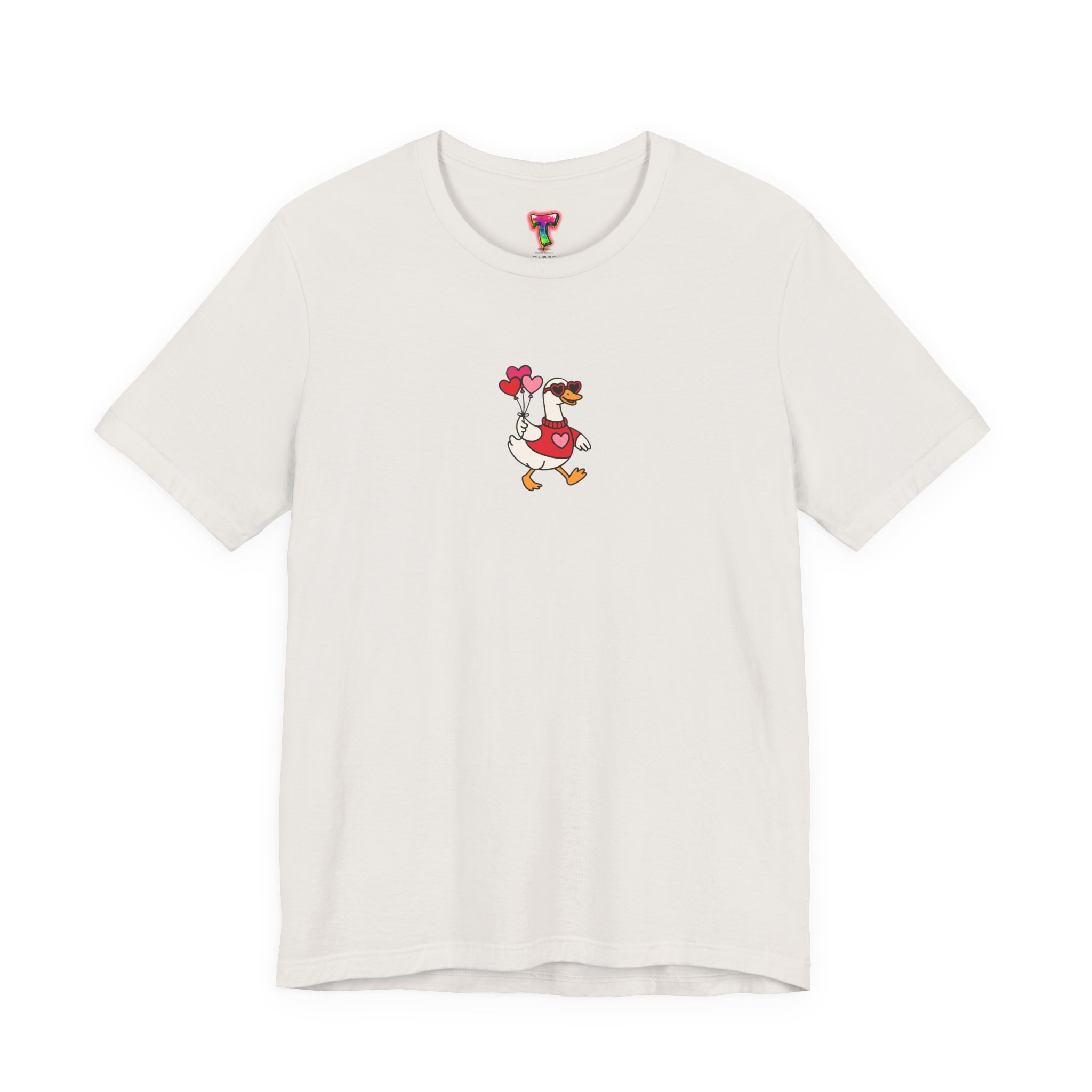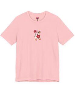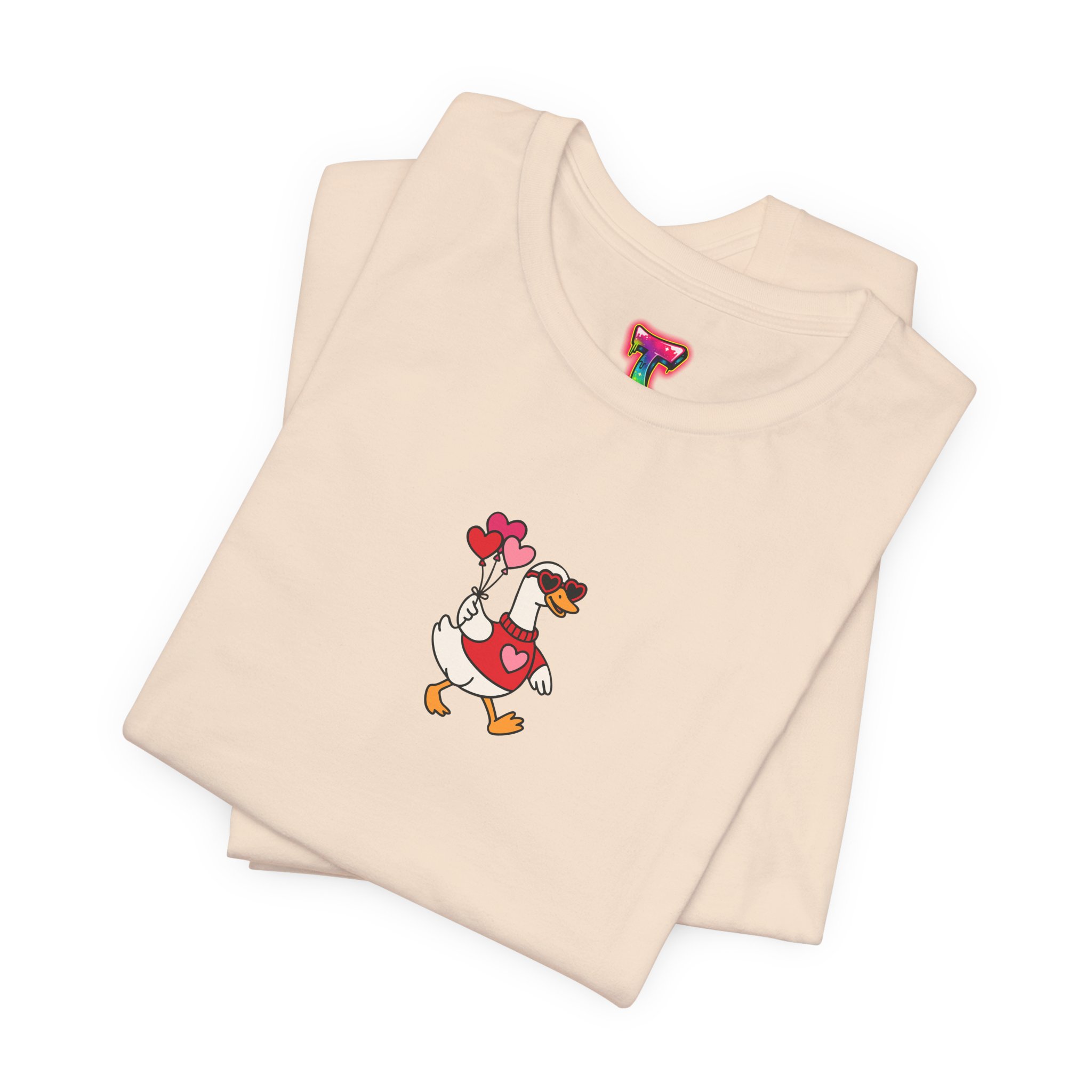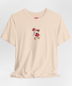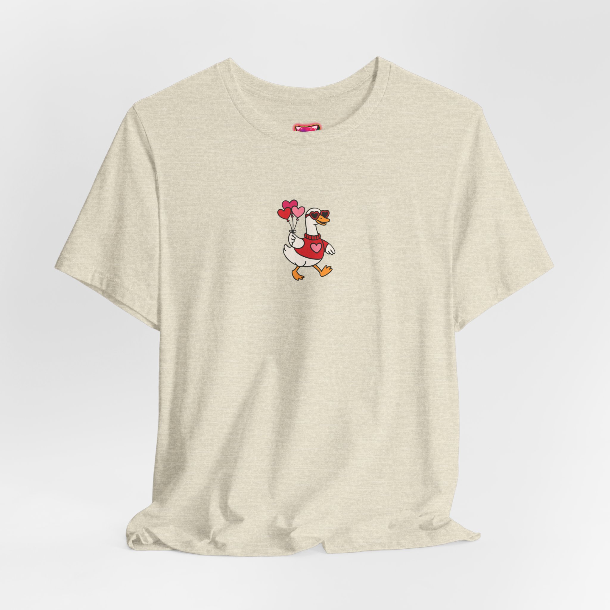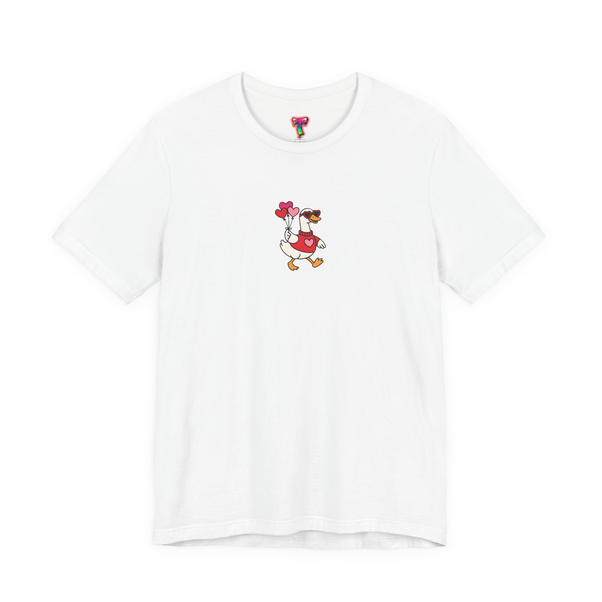 Steal the show with the coolest bird in town! Our “Cool Duck” Tee is all about confident vibes. This design features our signature white duckling looking extra smooth in black sunglasses and a heart-patterned red sweater, holding a bunch of pink heart balloons. It’s a playful mix of “cool” and “cute” that makes it an irresistible choice for anyone who loves unique, conversation-starting fashion.
