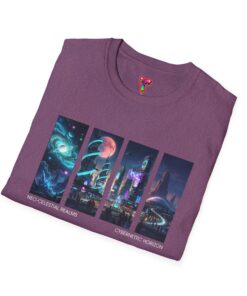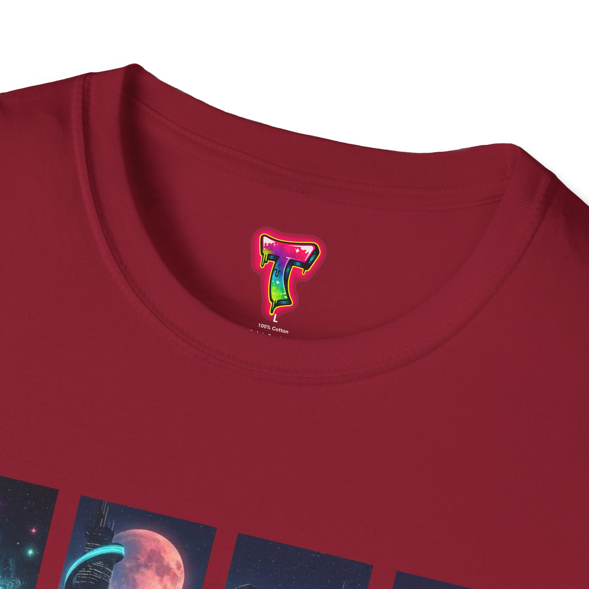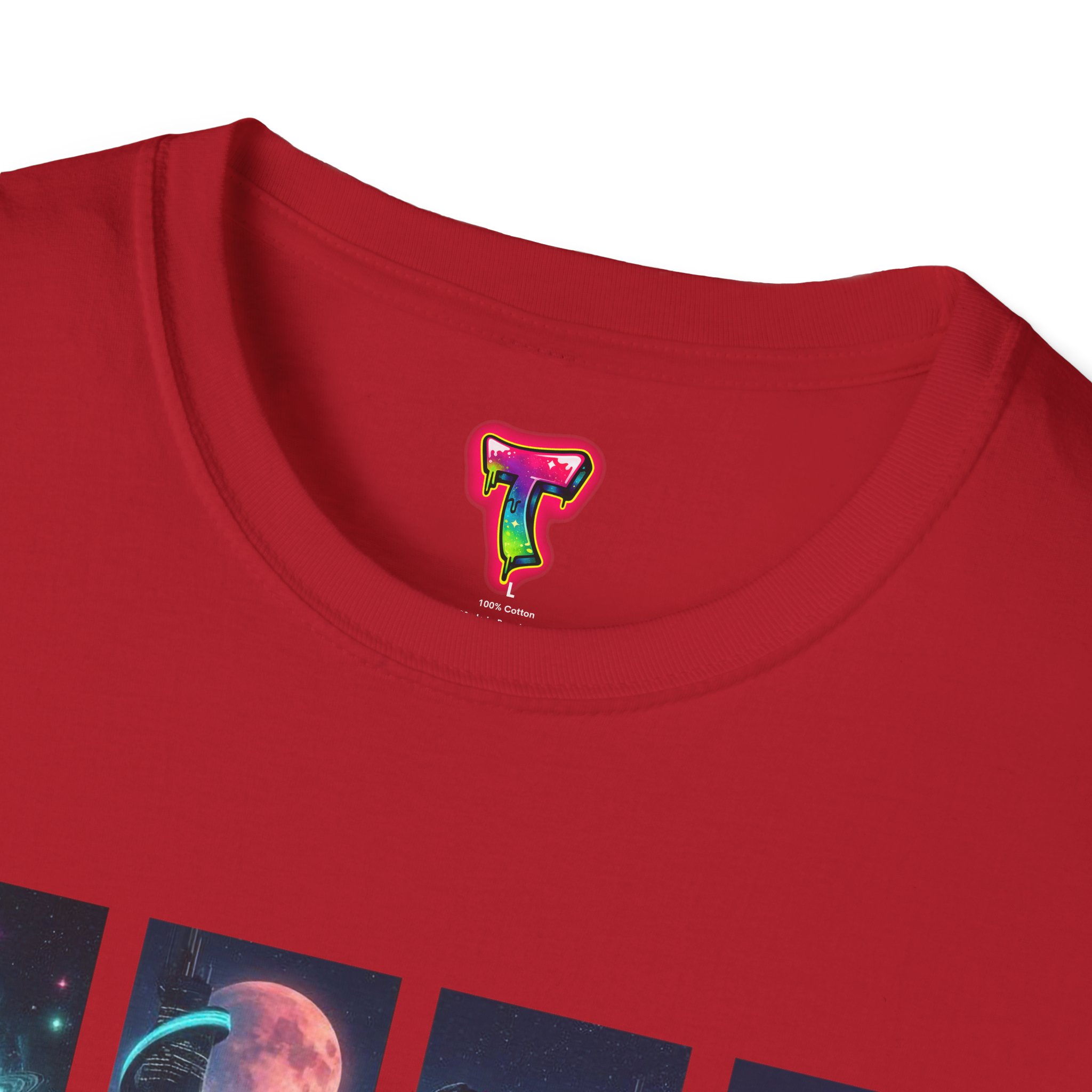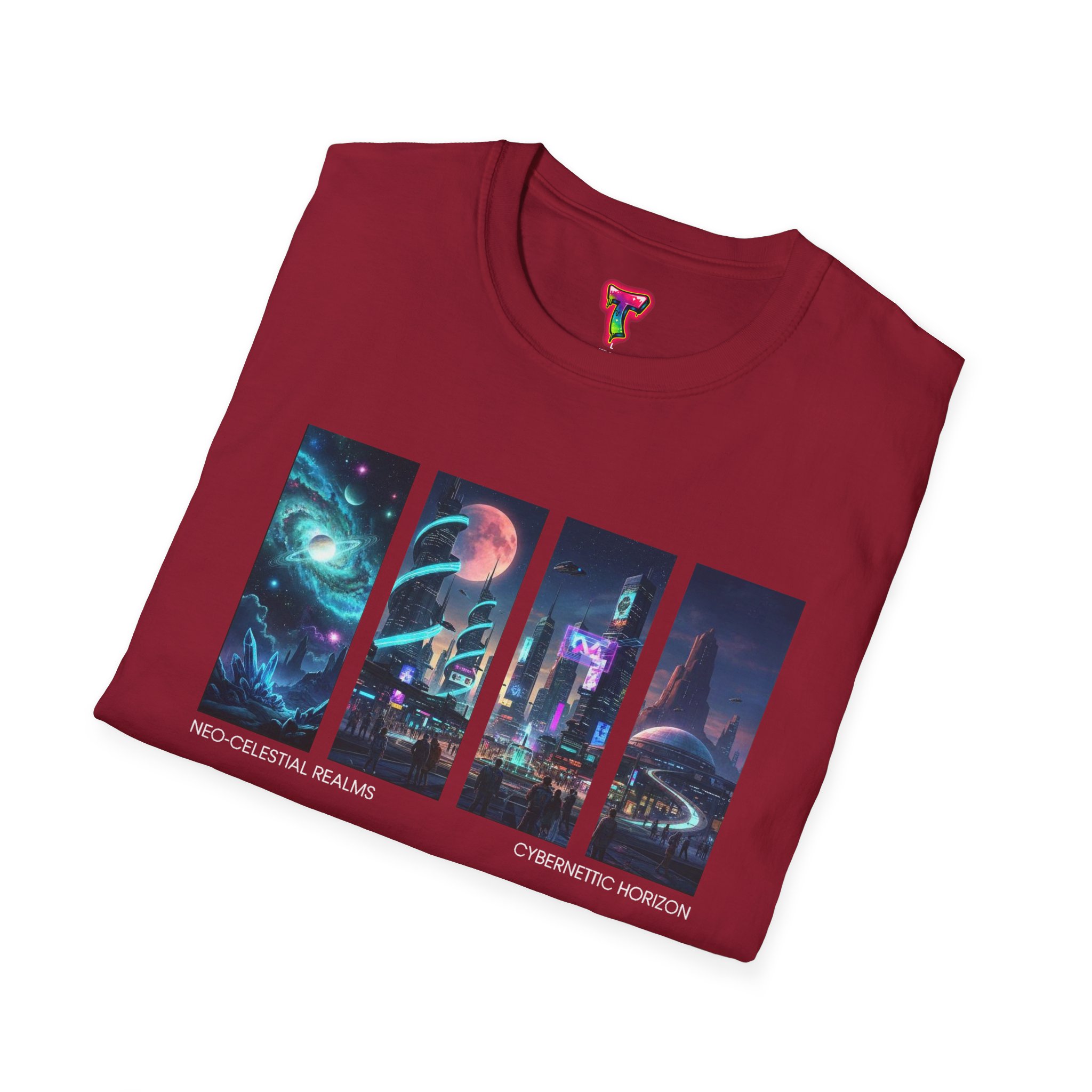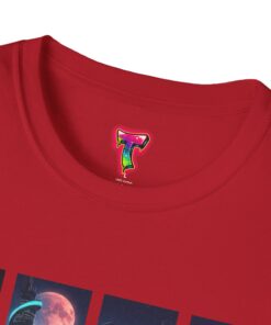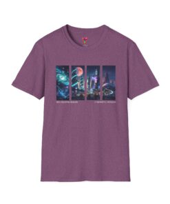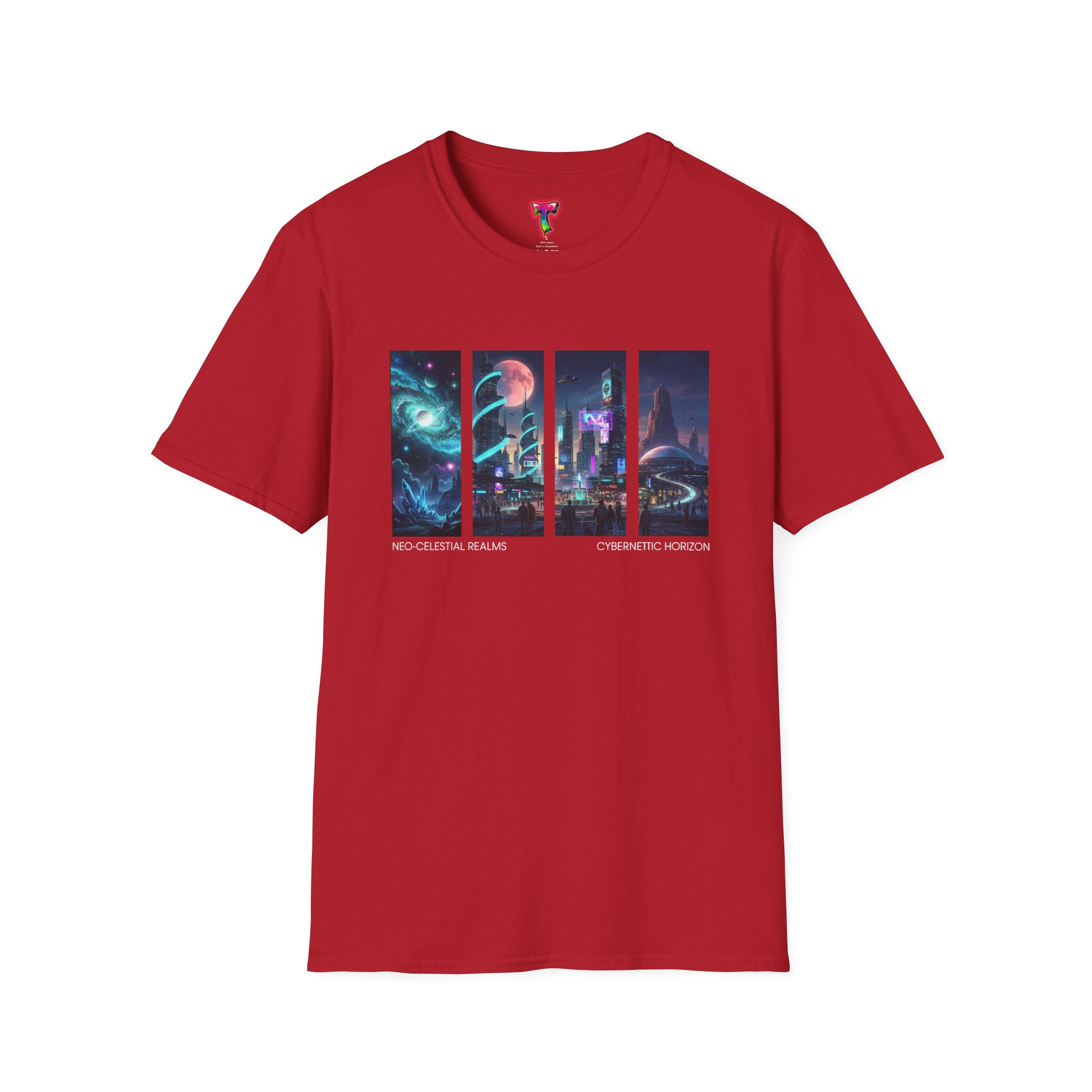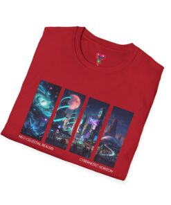 A soft, breathable tee printed with a quartet of neon-soaked sci‑fi vignettes — swirling galaxies, a lone astronaut on a glowing world, a neon city skyline, and a looming starship. Wear it when you want to carry a small, vivid story on your chest: retro-futuristic colors that pop against the red fabric, fine DTG/DTF printing that keeps details crisp, and a lightweight feel that moves with you. It sits comfortably under a jacket or stands out on its own during late-night meetups, con‑wars, con panels, or casual city wandering. The shirt ages gracefully thanks to ring‑spun cotton and thoughtful construction — shoulder tape, ribbed collar, and tear‑away label for everyday comfort — while certifications and ethical sourcing give the piece quiet integrity.