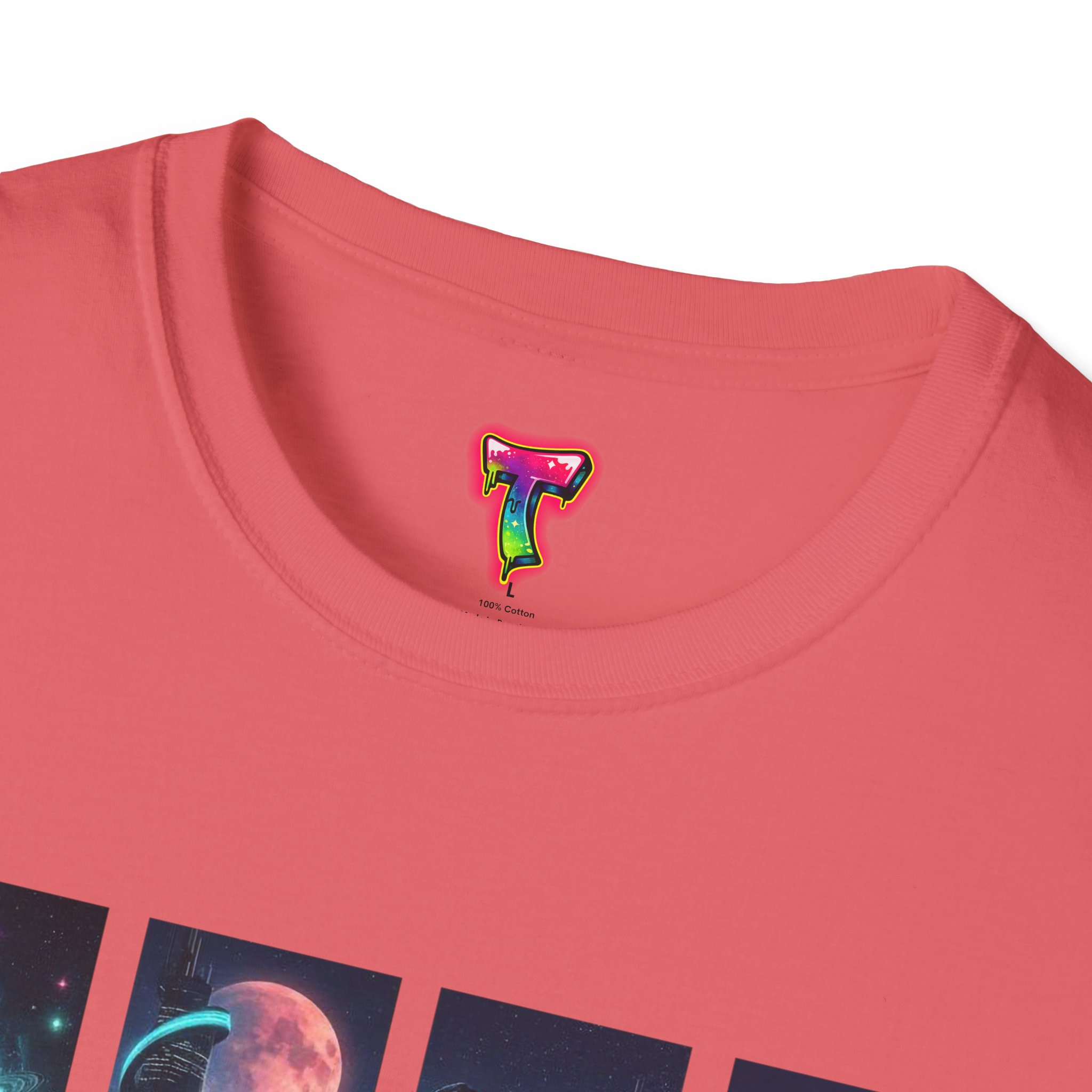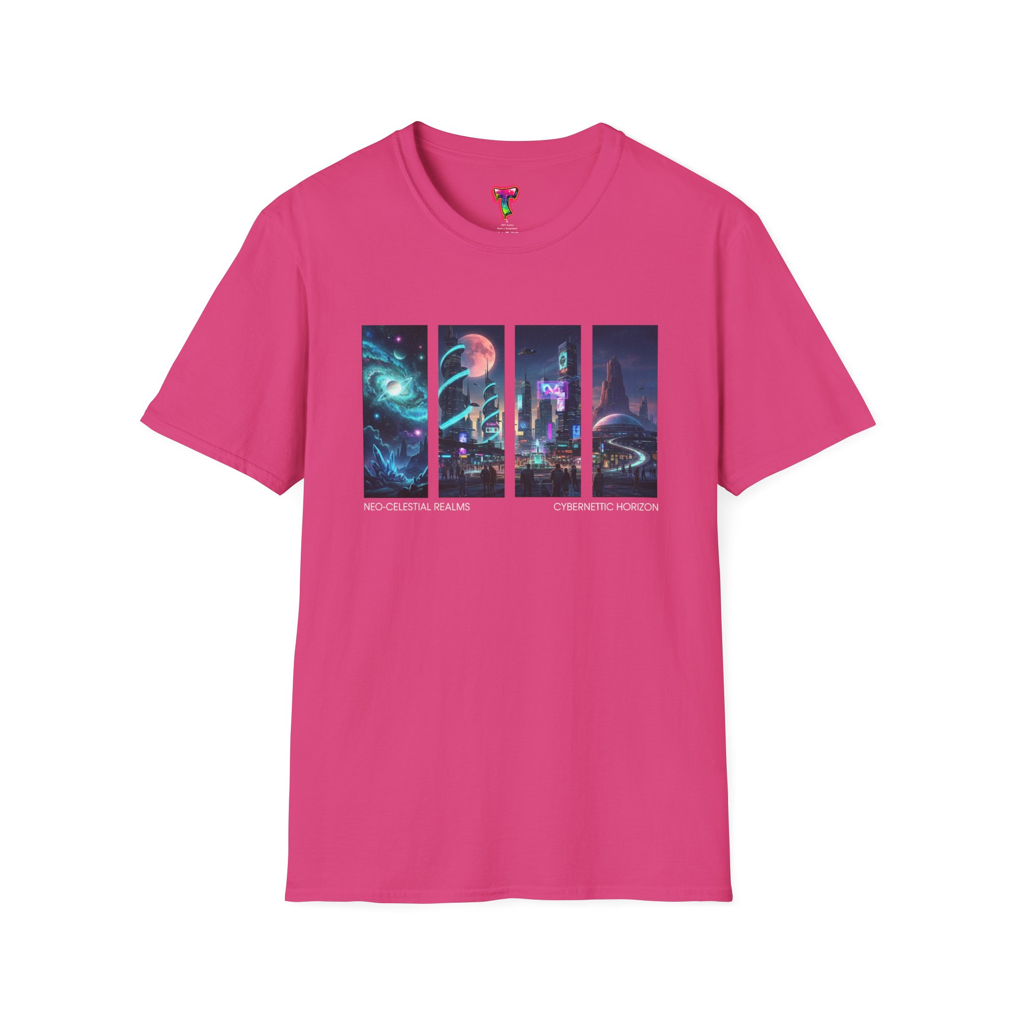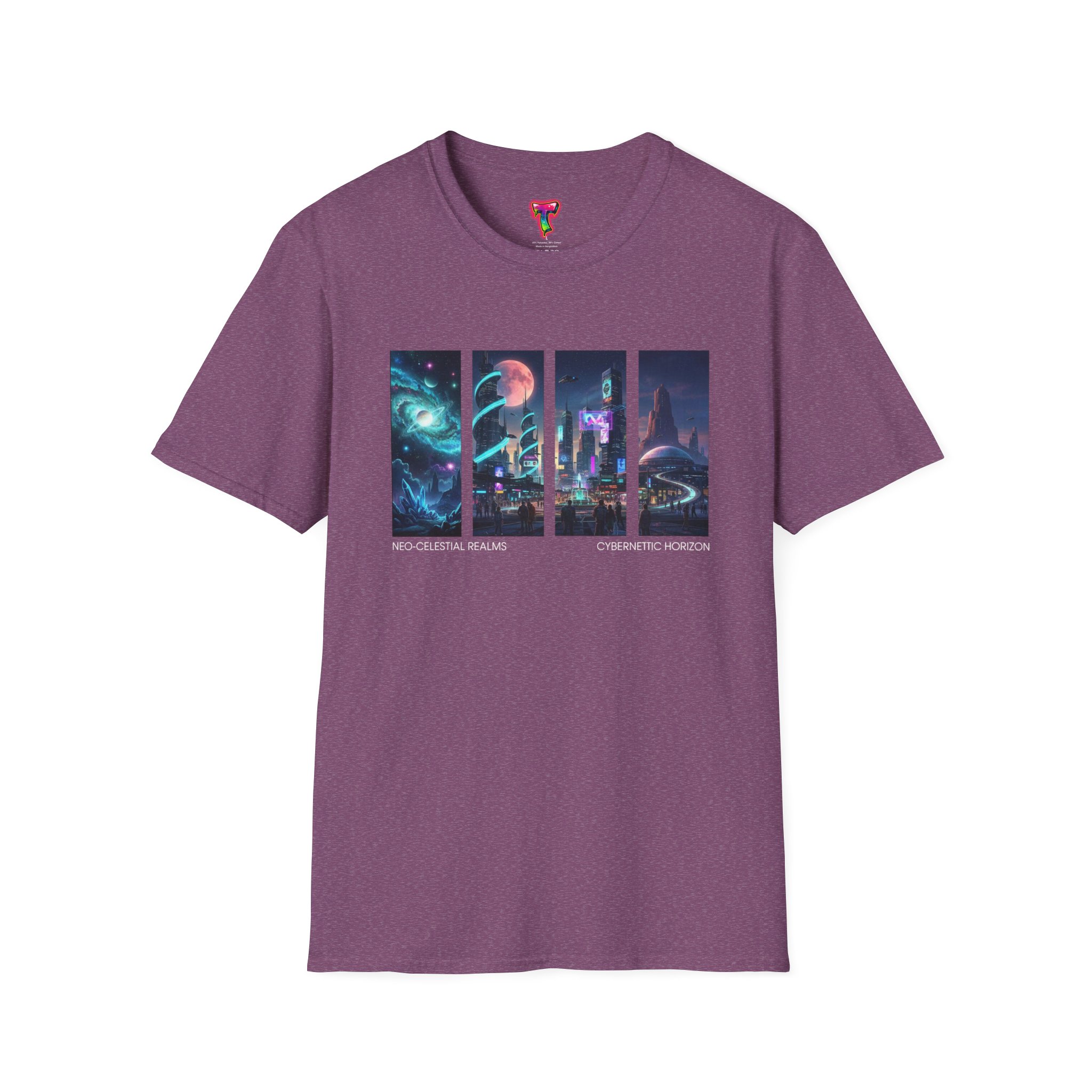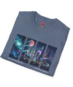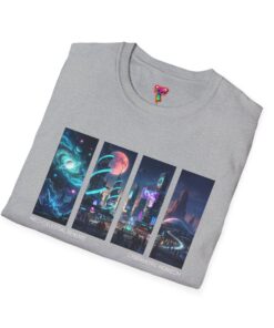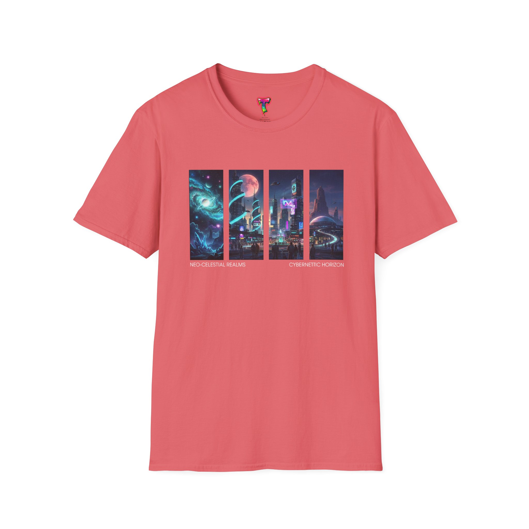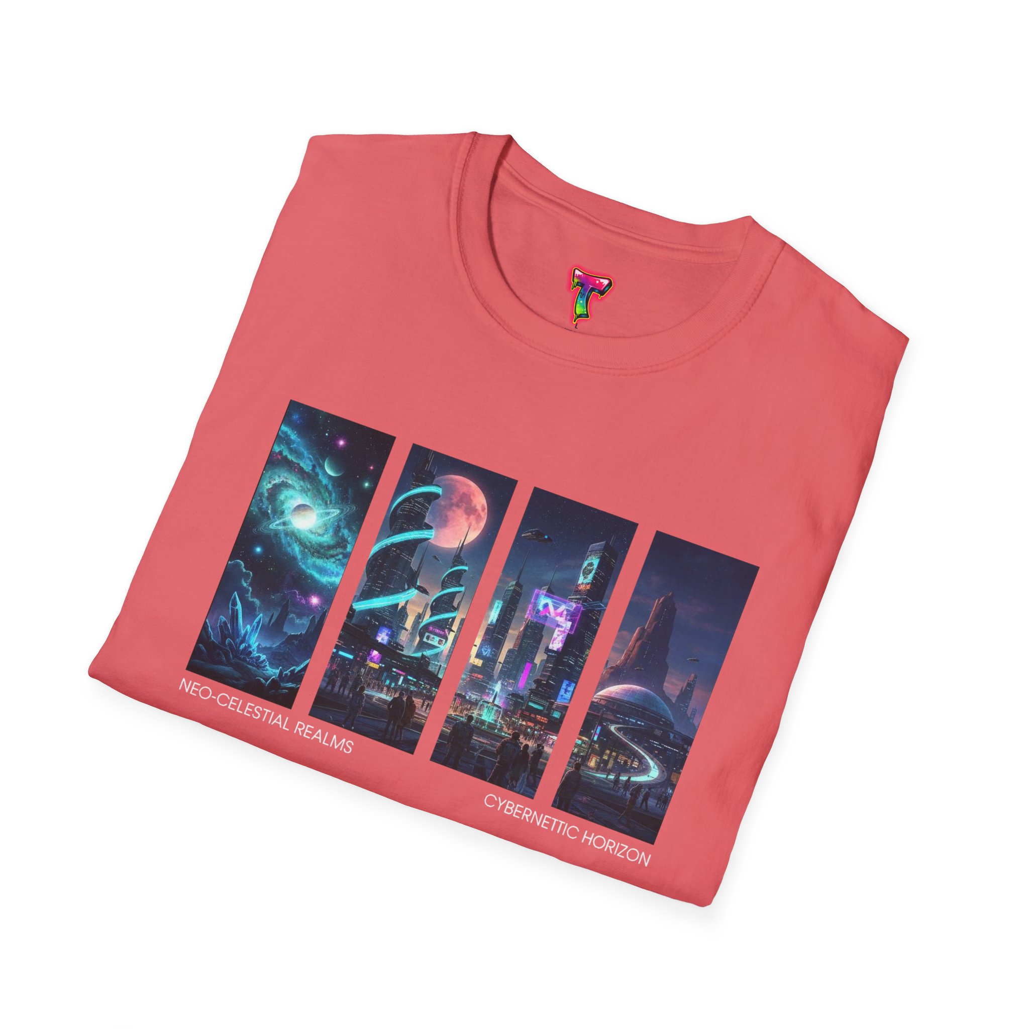 A soft, breathable tee printed with a quartet of neon-soaked sci‑fi vignettes — swirling galaxies, a lone astronaut on a glowing world, a neon city skyline, and a looming starship. Wear it when you want to carry a small, vivid story on your chest: retro-futuristic colors that pop against the red fabric, fine DTG/DTF printing that keeps details crisp, and a lightweight feel that moves with you. It sits comfortably under a jacket or stands out on its own during late-night meetups, con‑wars, con panels, or casual city wandering. The shirt ages gracefully thanks to ring‑spun cotton and thoughtful construction — shoulder tape, ribbed collar, and tear‑away label for everyday comfort — while certifications and ethical sourcing give the piece quiet integrity.