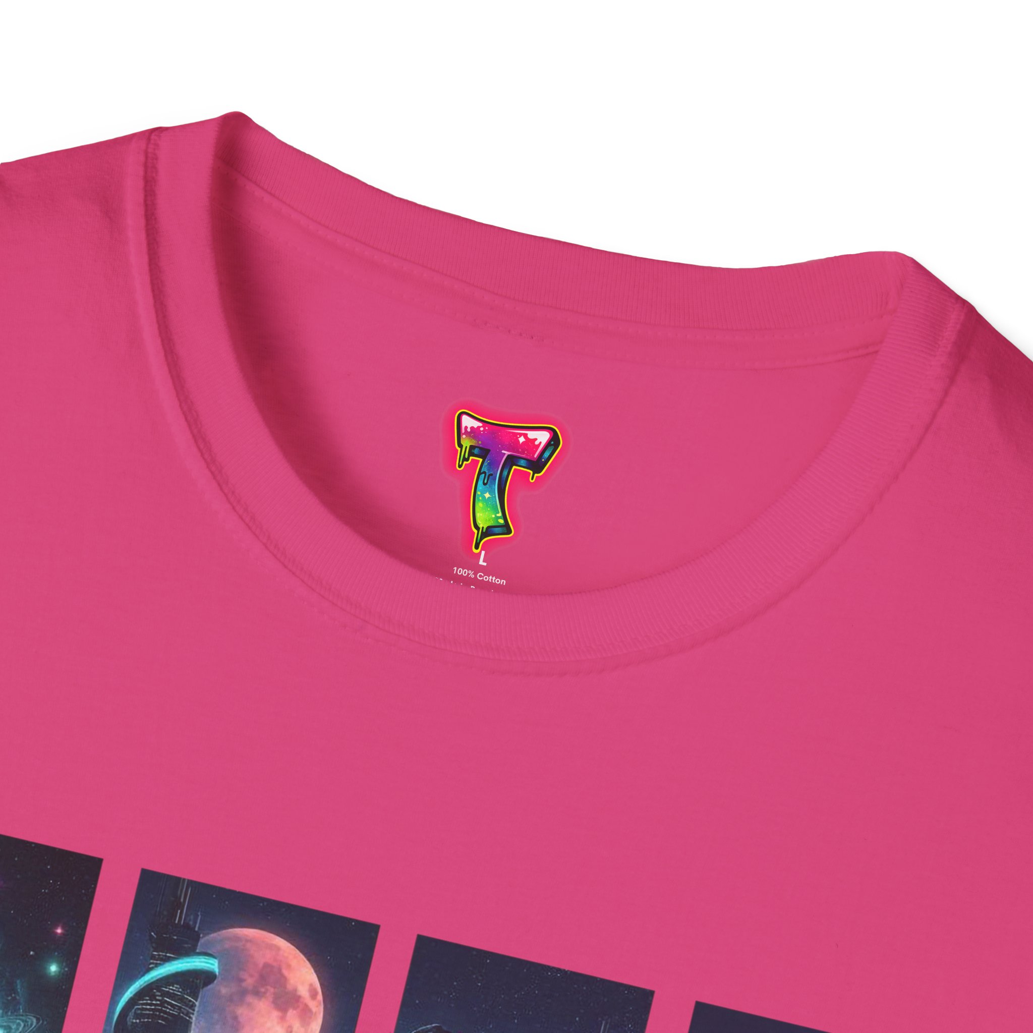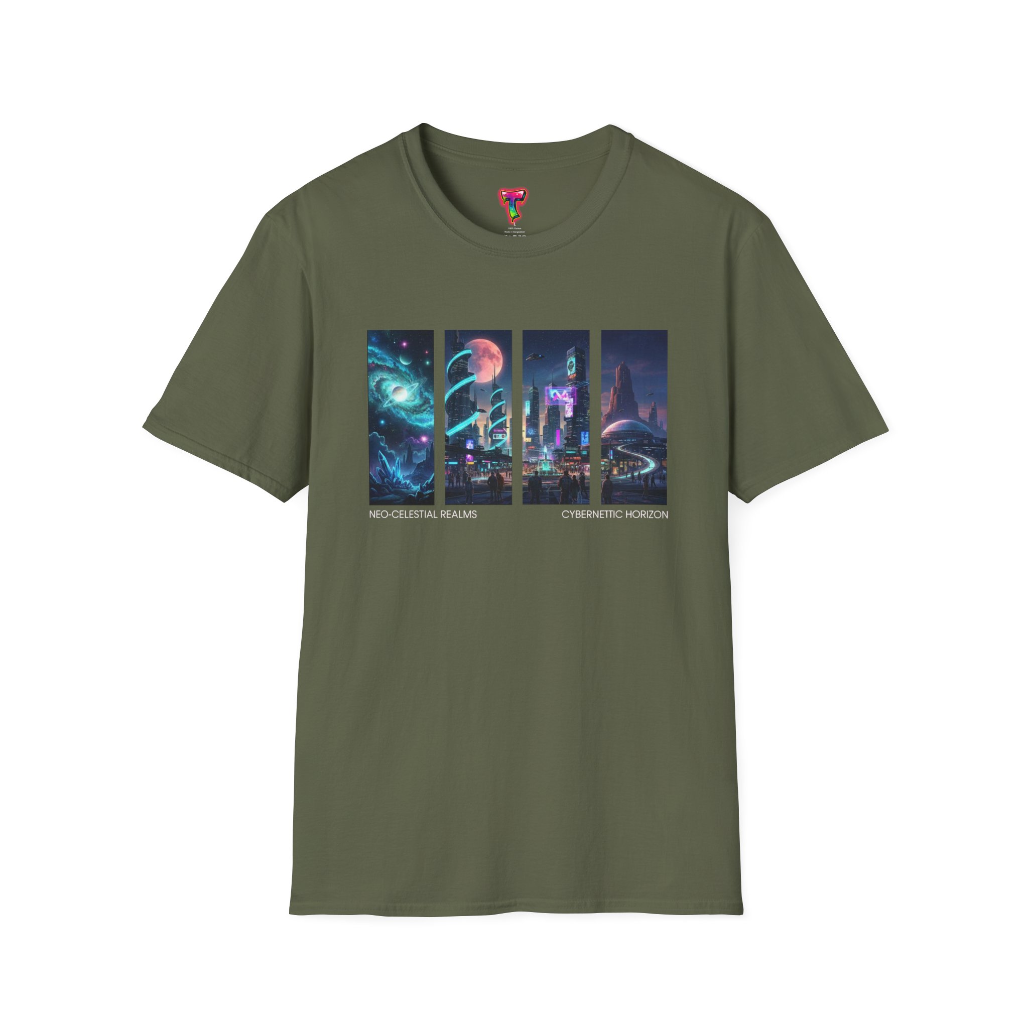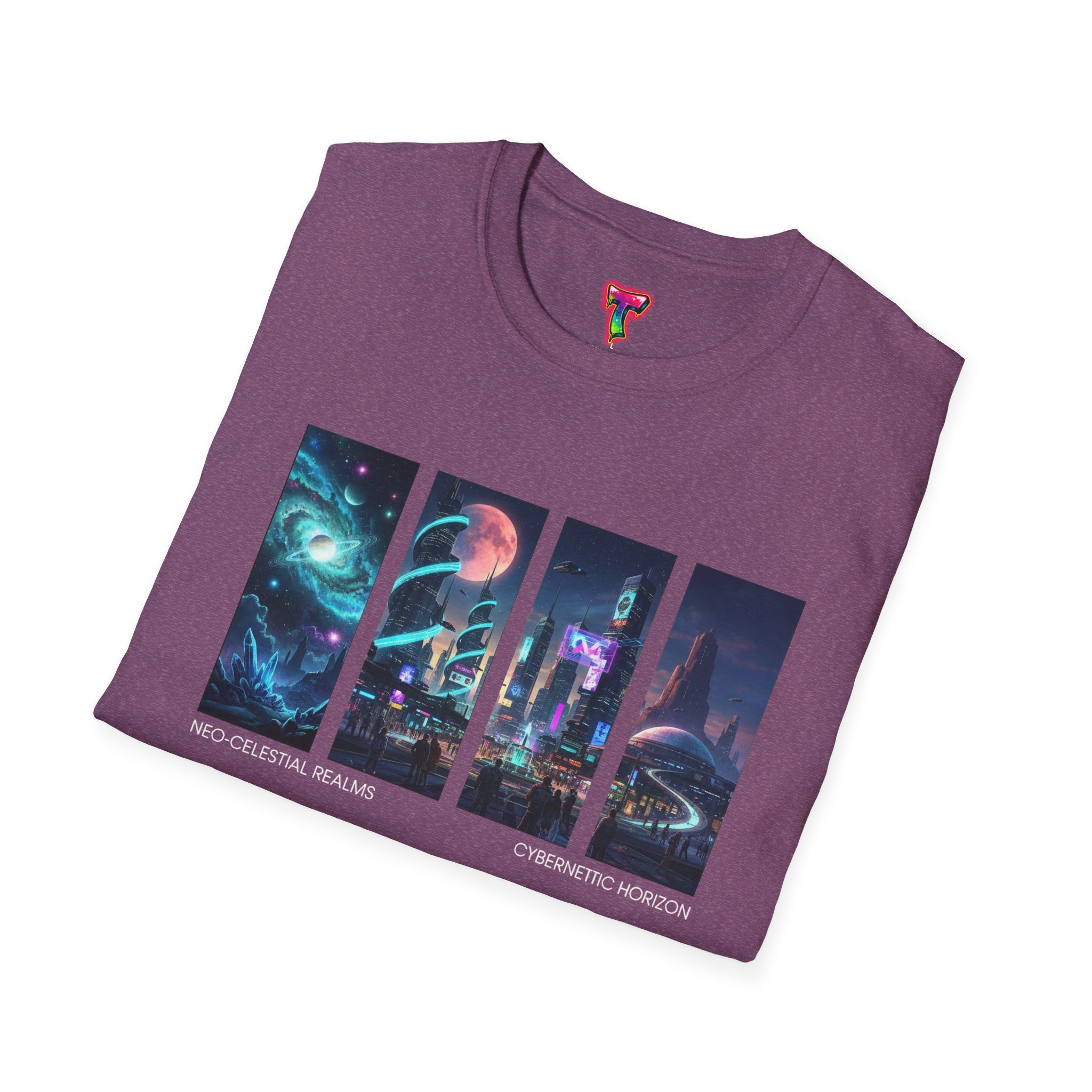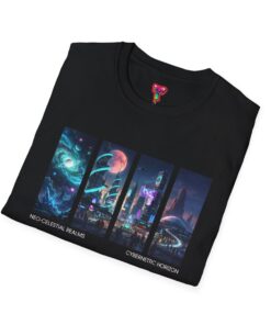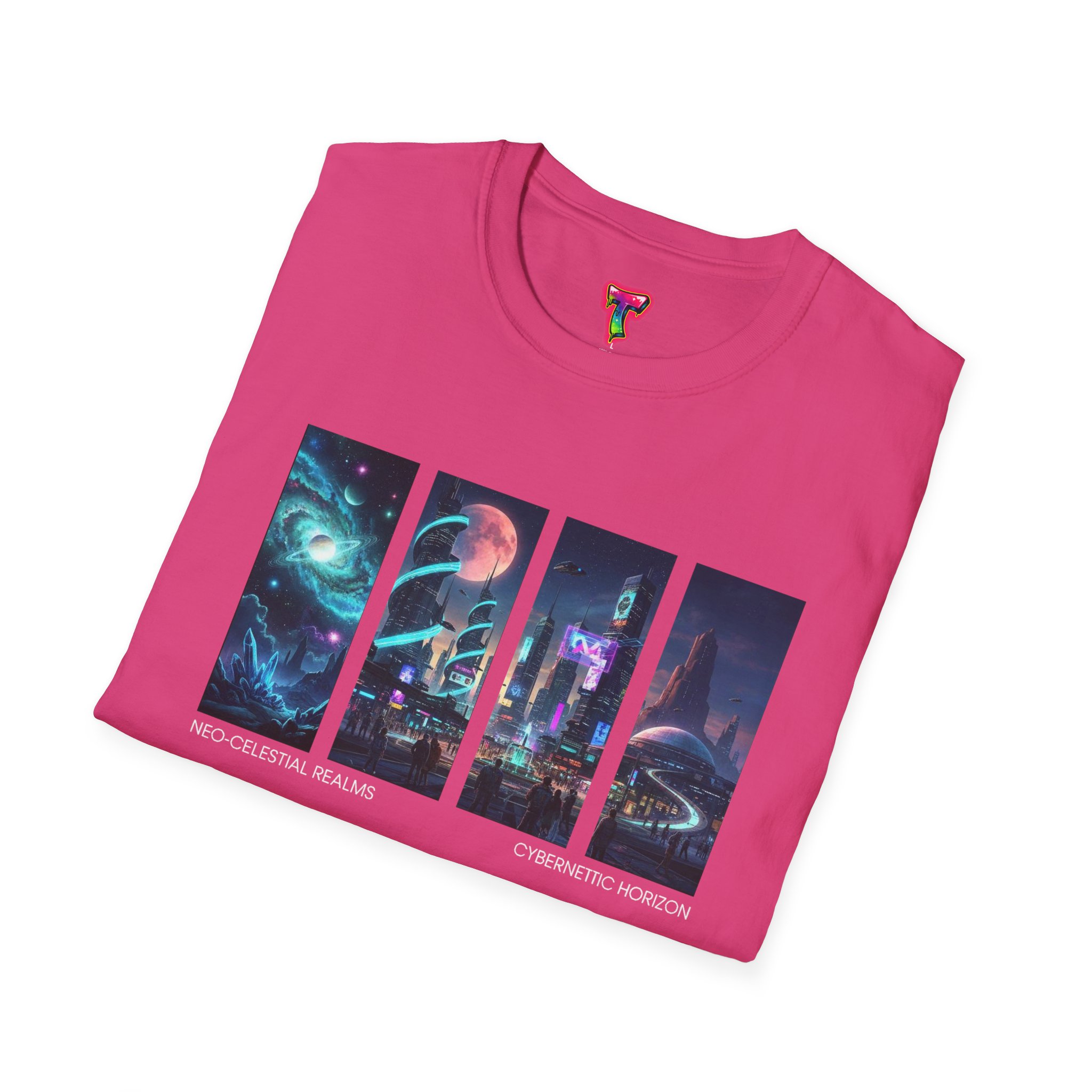 A soft, breathable tee printed with a quartet of neon-soaked sci‑fi vignettes — swirling galaxies, a lone astronaut on a glowing world, a neon city skyline, and a looming starship. Wear it when you want to carry a small, vivid story on your chest: retro-futuristic colors that pop against the red fabric, fine DTG/DTF printing that keeps details crisp, and a lightweight feel that moves with you. It sits comfortably under a jacket or stands out on its own during late-night meetups, con‑wars, con panels, or casual city wandering. The shirt ages gracefully thanks to ring‑spun cotton and thoughtful construction — shoulder tape, ribbed collar, and tear‑away label for everyday comfort — while certifications and ethical sourcing give the piece quiet integrity.