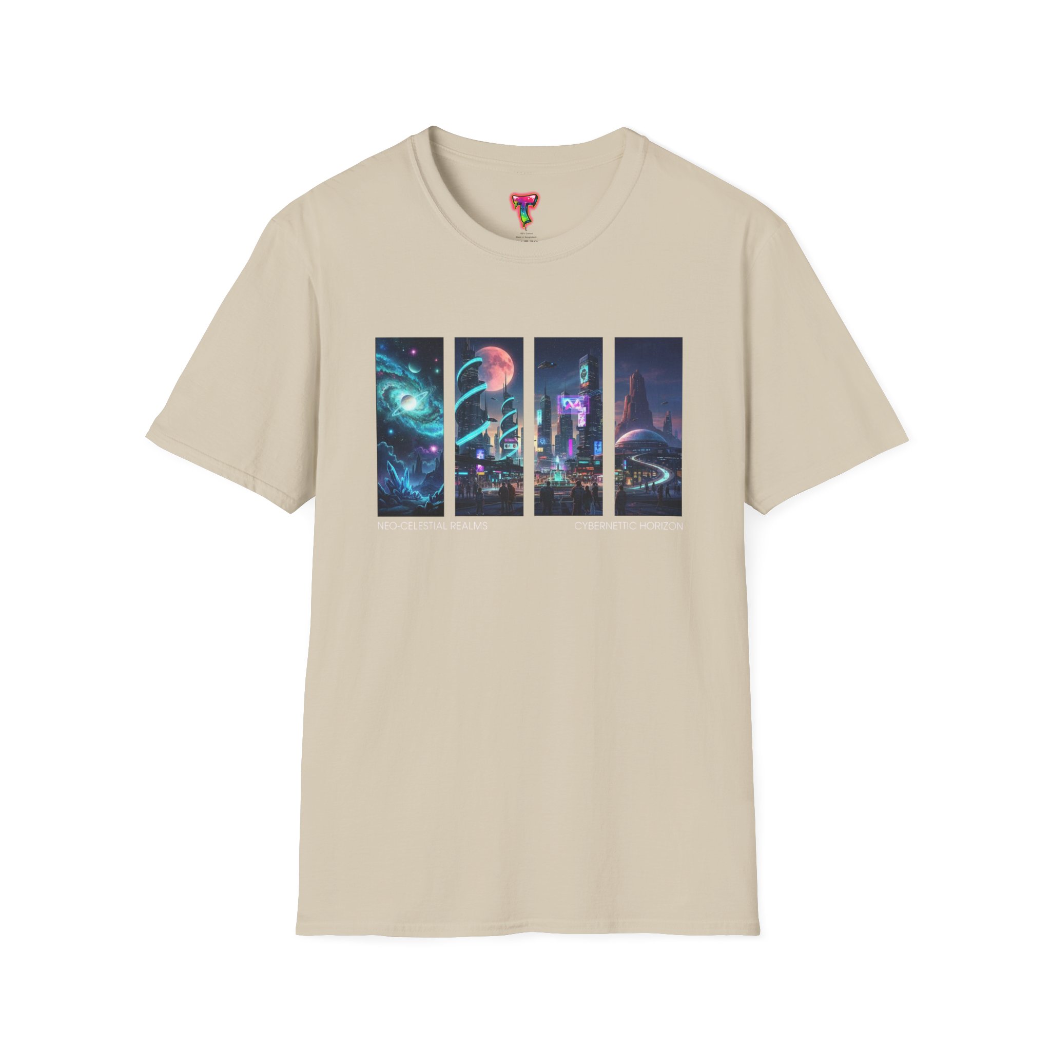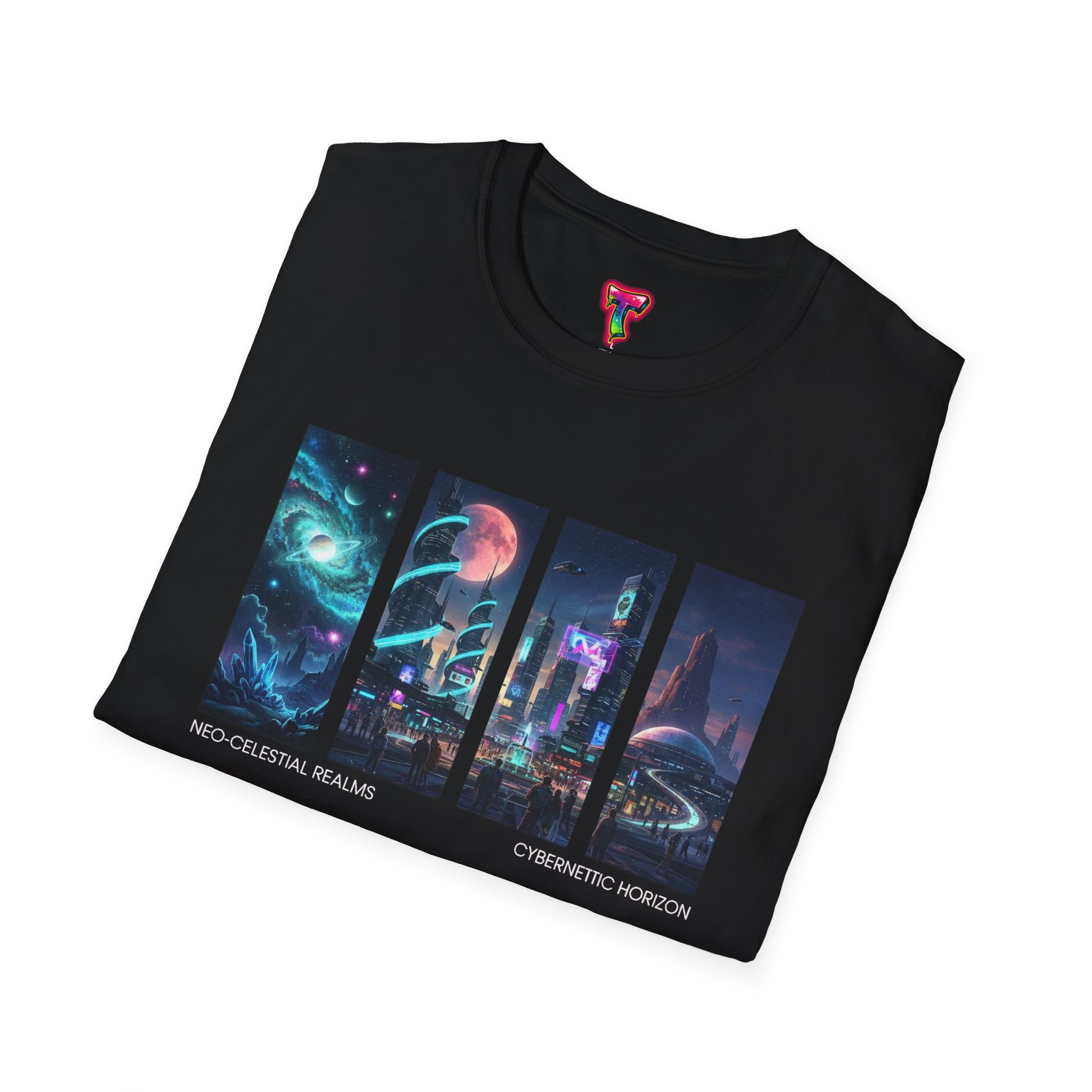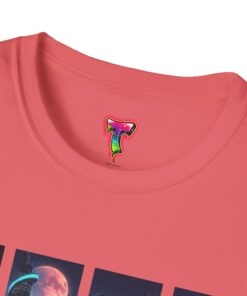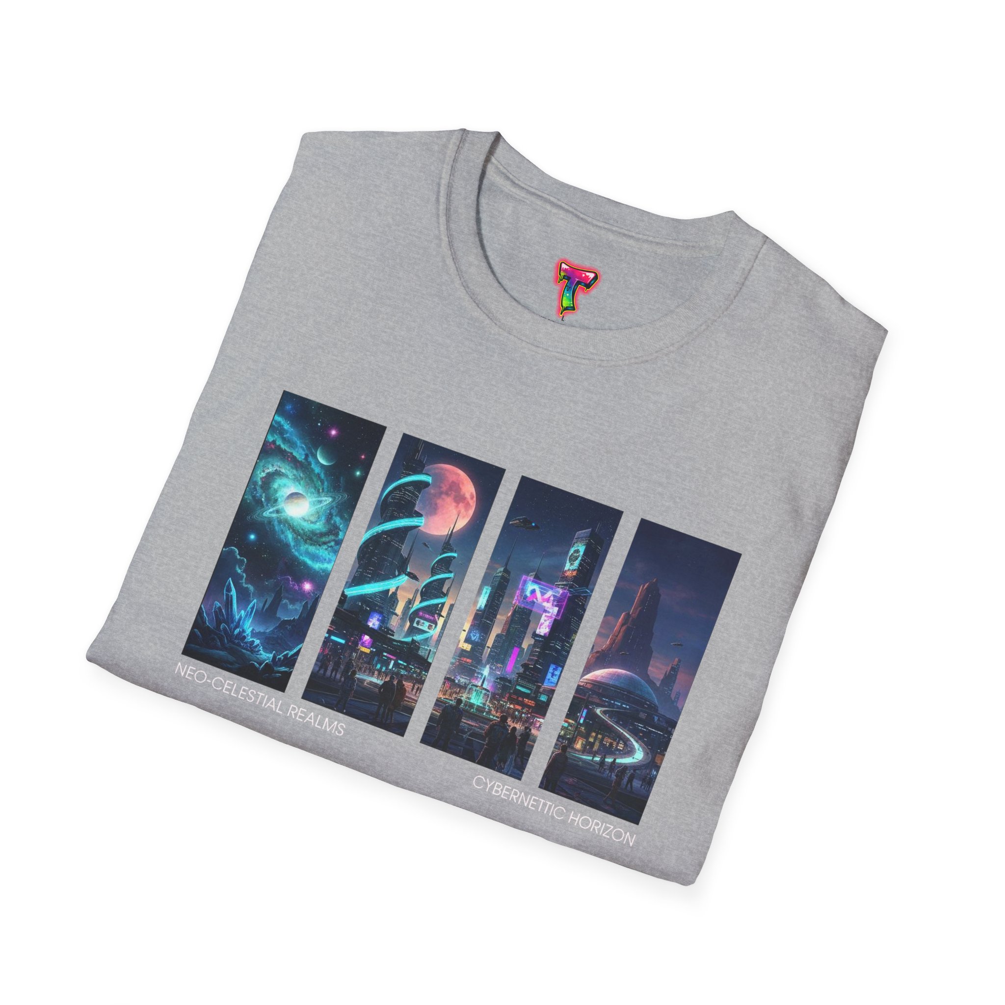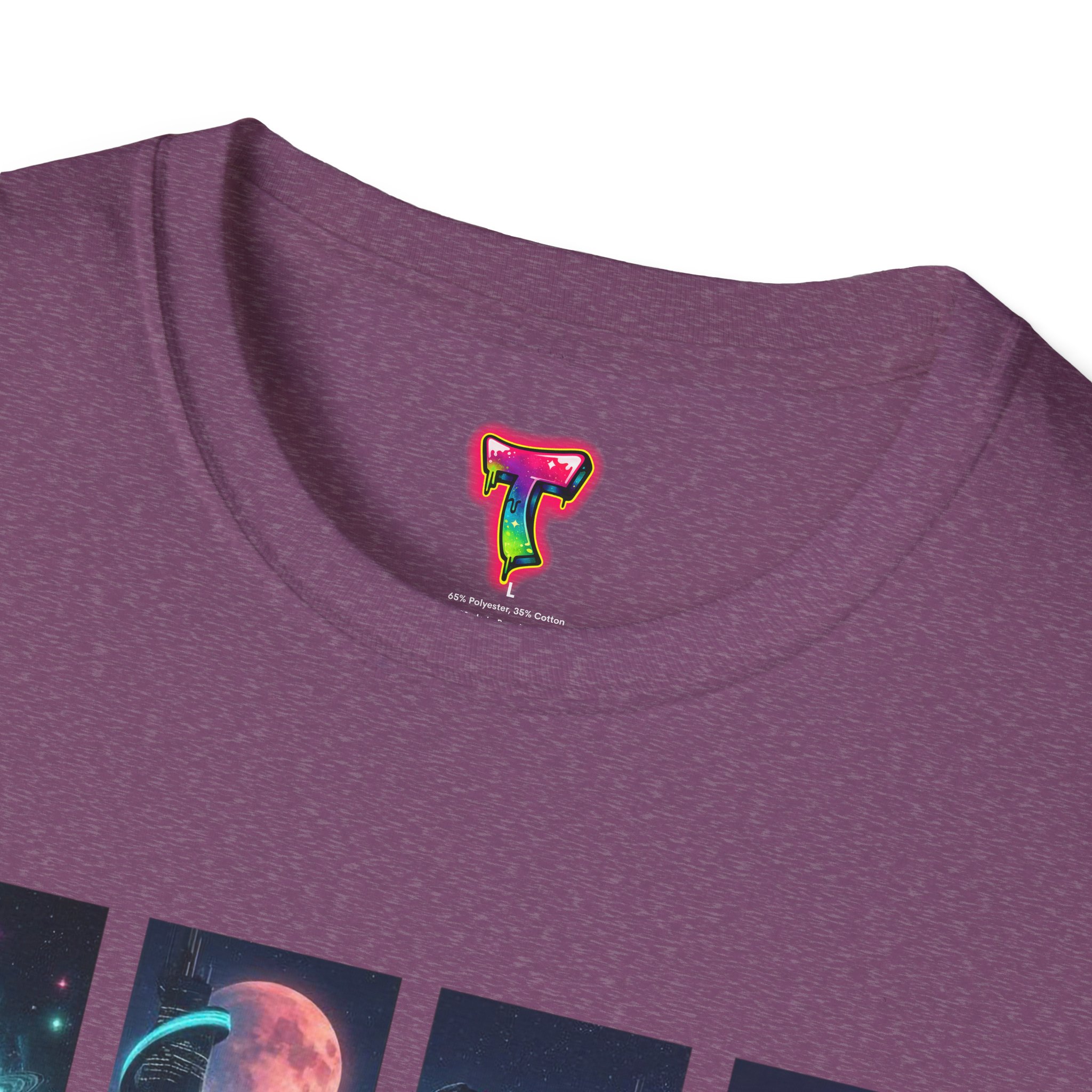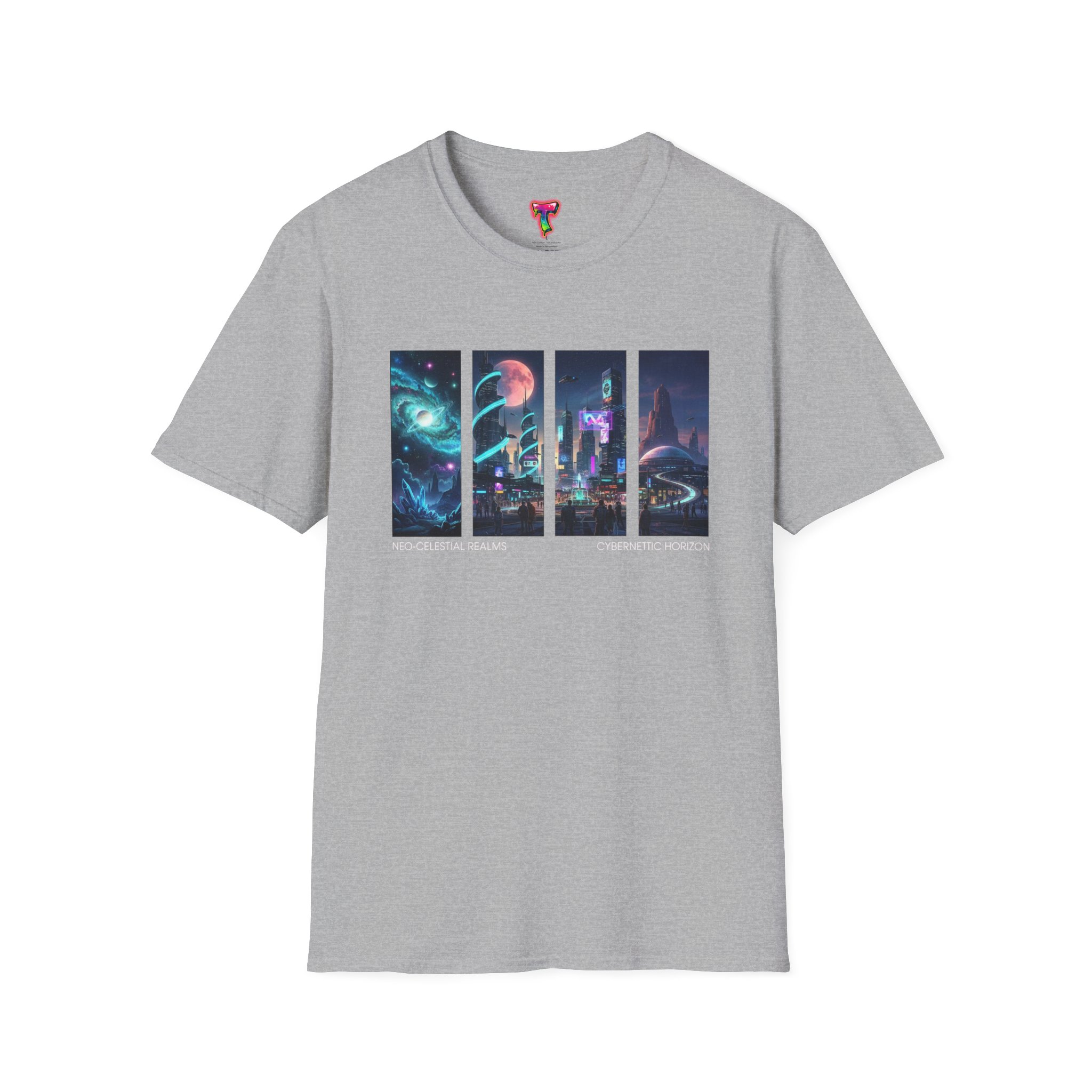 A soft, breathable tee printed with a quartet of neon-soaked sci‑fi vignettes — swirling galaxies, a lone astronaut on a glowing world, a neon city skyline, and a looming starship. Wear it when you want to carry a small, vivid story on your chest: retro-futuristic colors that pop against the red fabric, fine DTG/DTF printing that keeps details crisp, and a lightweight feel that moves with you. It sits comfortably under a jacket or stands out on its own during late-night meetups, con‑wars, con panels, or casual city wandering. The shirt ages gracefully thanks to ring‑spun cotton and thoughtful construction — shoulder tape, ribbed collar, and tear‑away label for everyday comfort — while certifications and ethical sourcing give the piece quiet integrity.