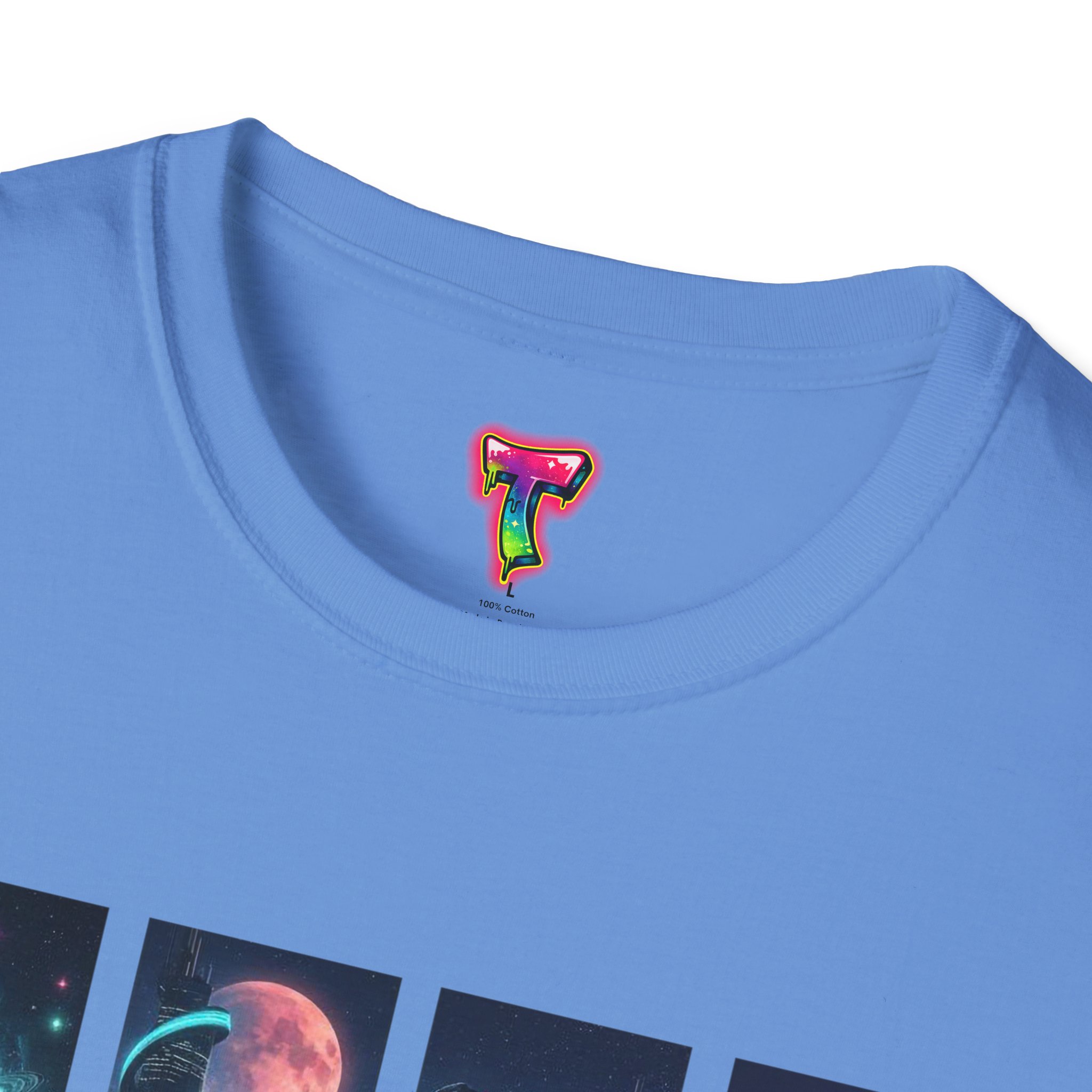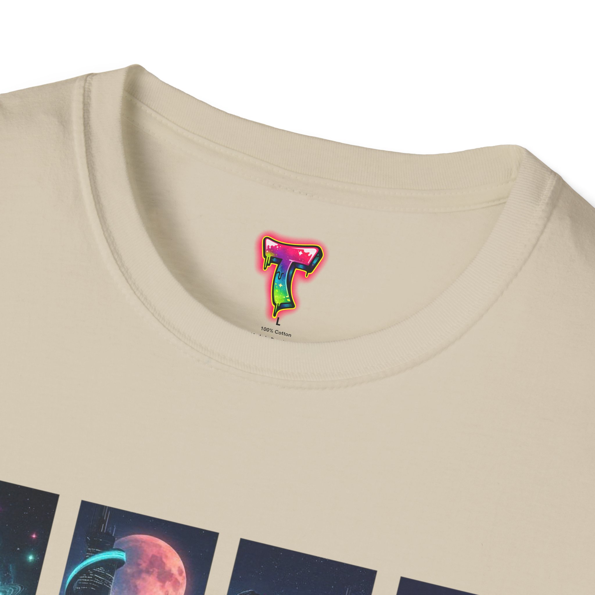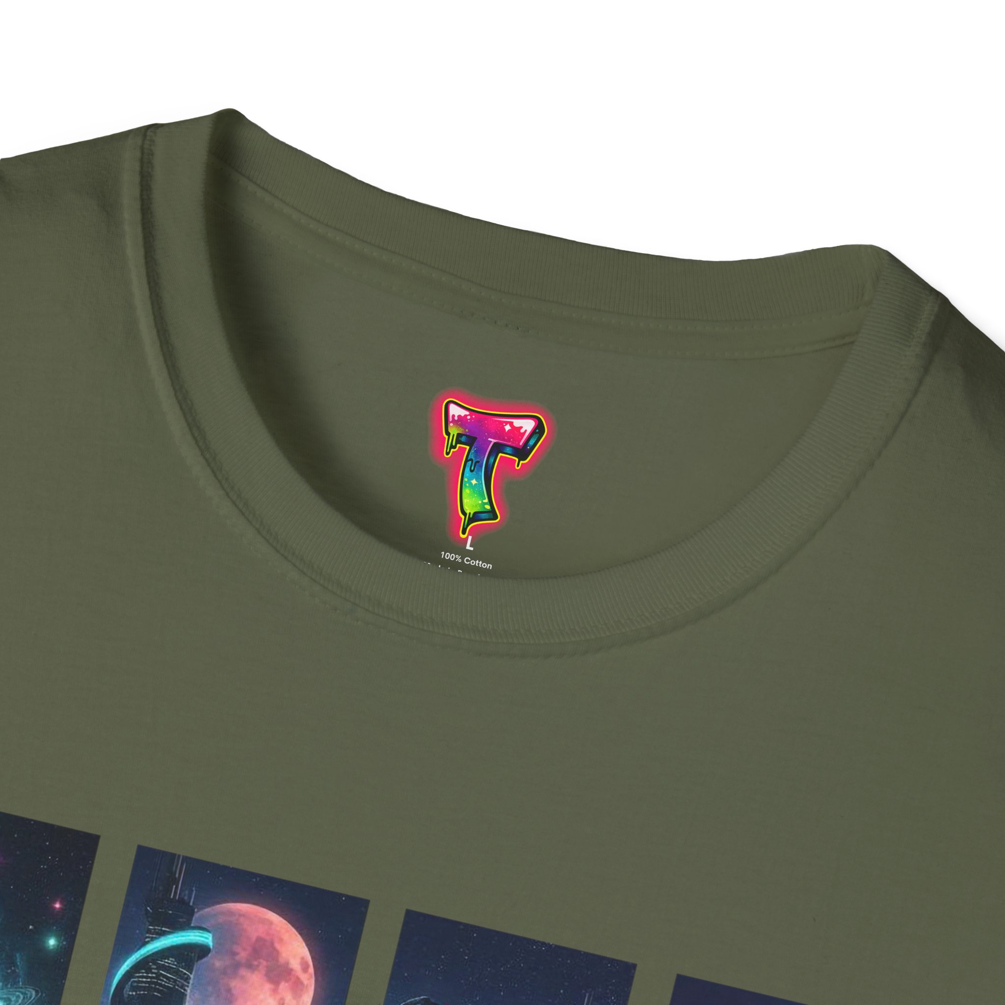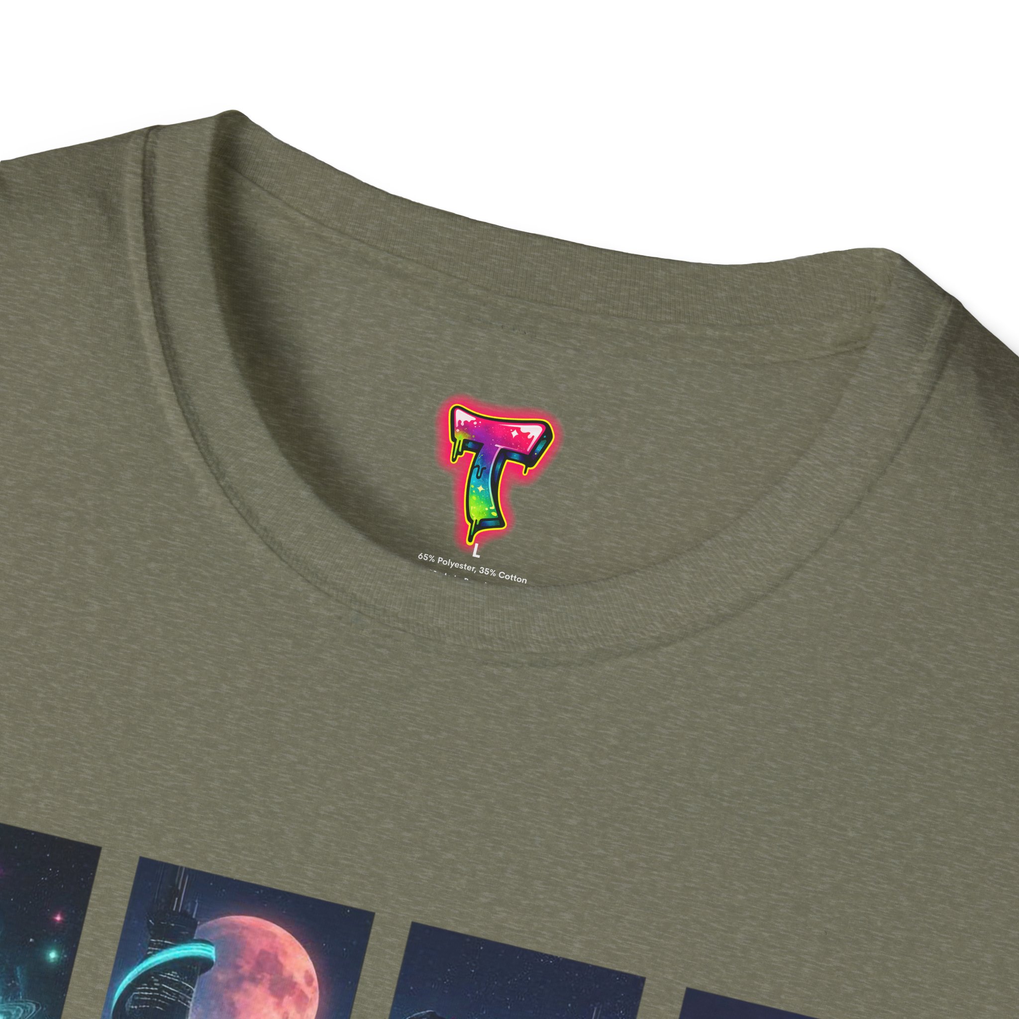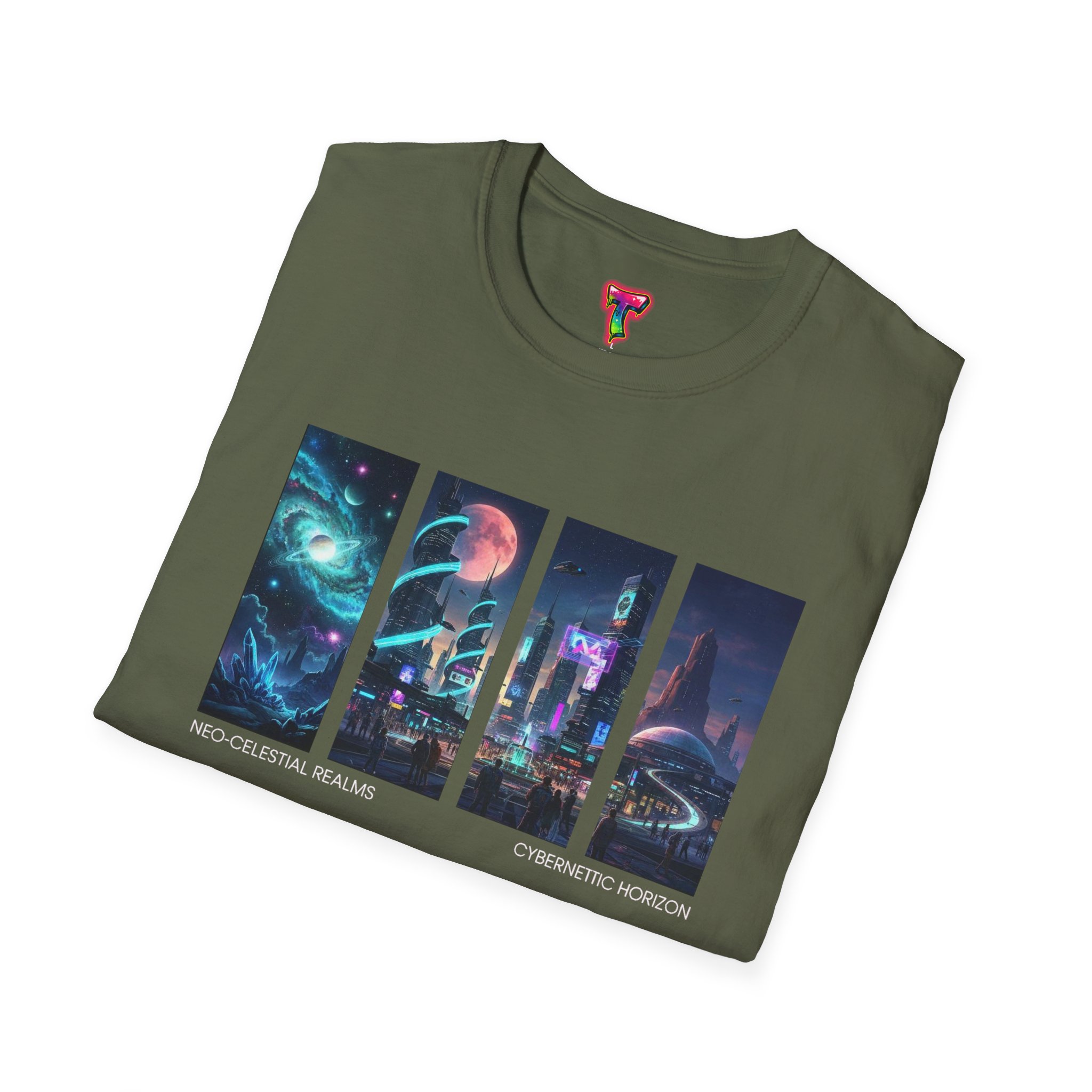 A soft, breathable tee printed with a quartet of neon-soaked sci‑fi vignettes — swirling galaxies, a lone astronaut on a glowing world, a neon city skyline, and a looming starship. Wear it when you want to carry a small, vivid story on your chest: retro-futuristic colors that pop against the red fabric, fine DTG/DTF printing that keeps details crisp, and a lightweight feel that moves with you. It sits comfortably under a jacket or stands out on its own during late-night meetups, con‑wars, con panels, or casual city wandering. The shirt ages gracefully thanks to ring‑spun cotton and thoughtful construction — shoulder tape, ribbed collar, and tear‑away label for everyday comfort — while certifications and ethical sourcing give the piece quiet integrity.