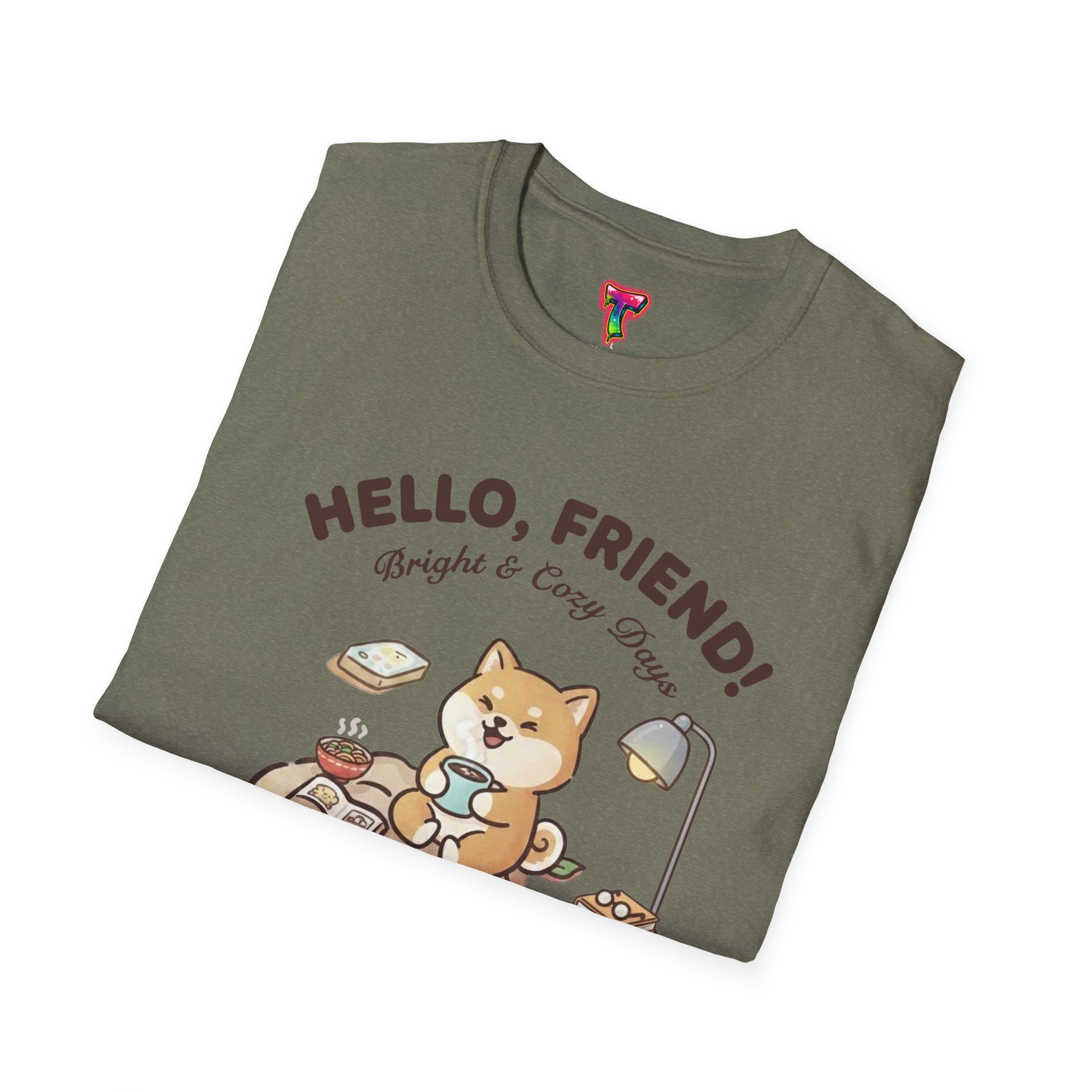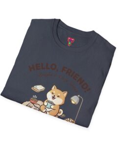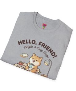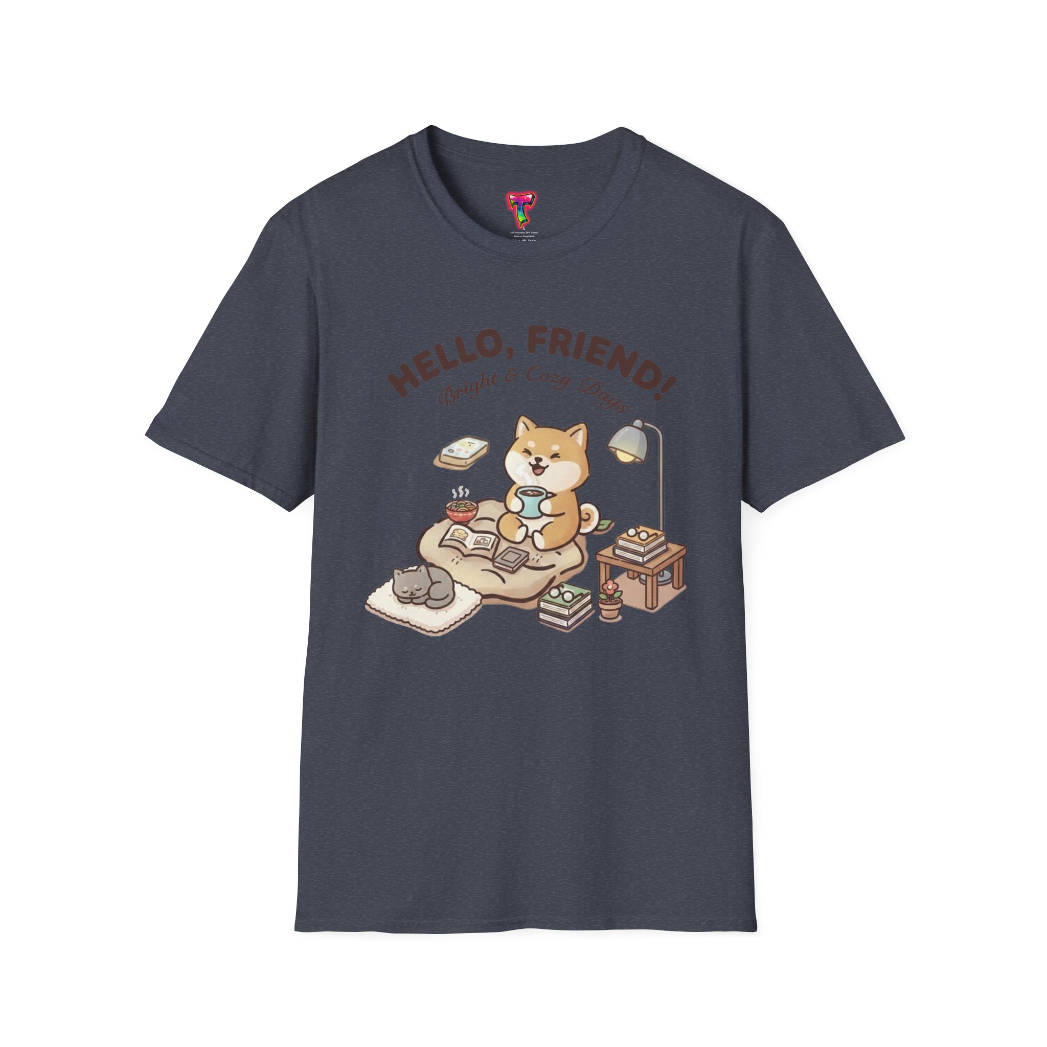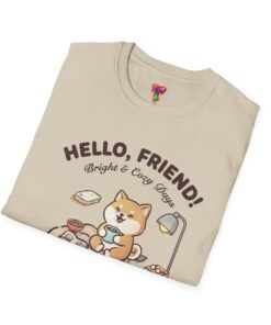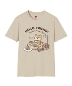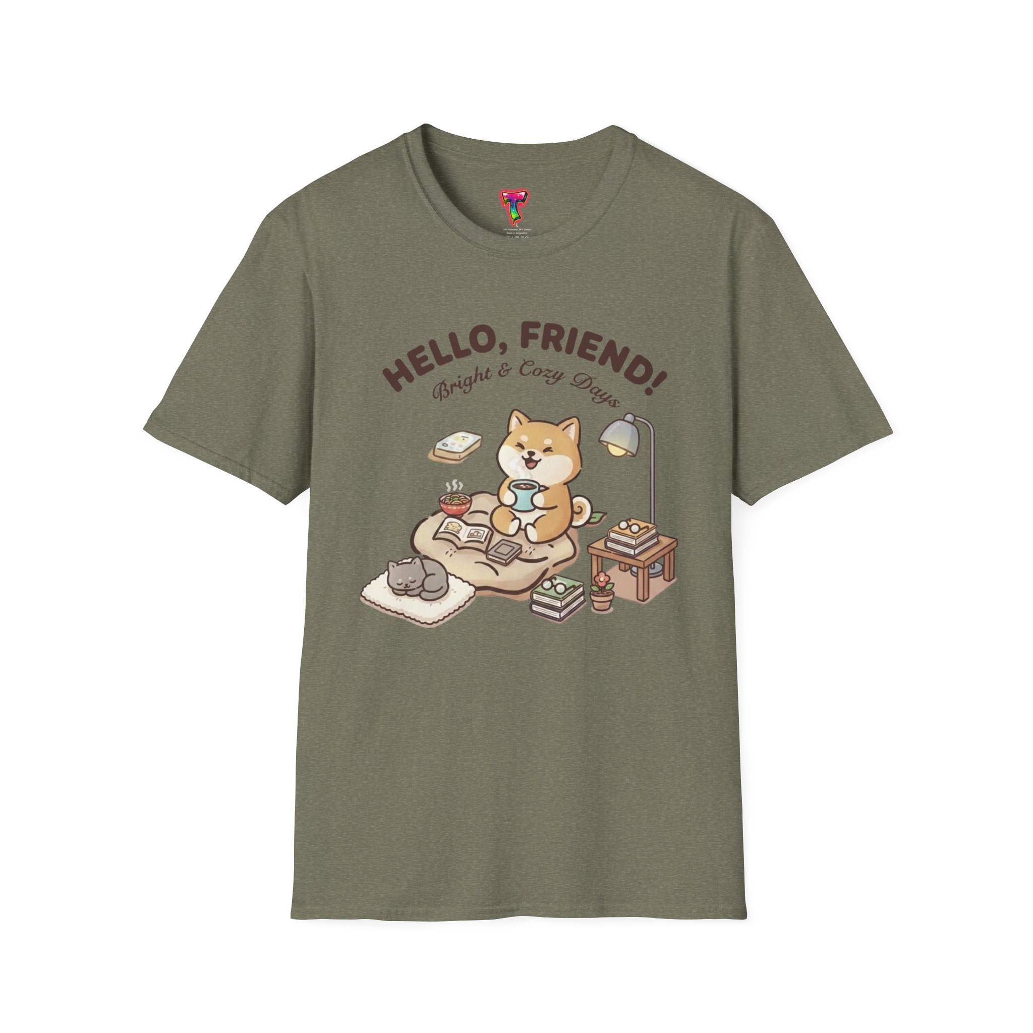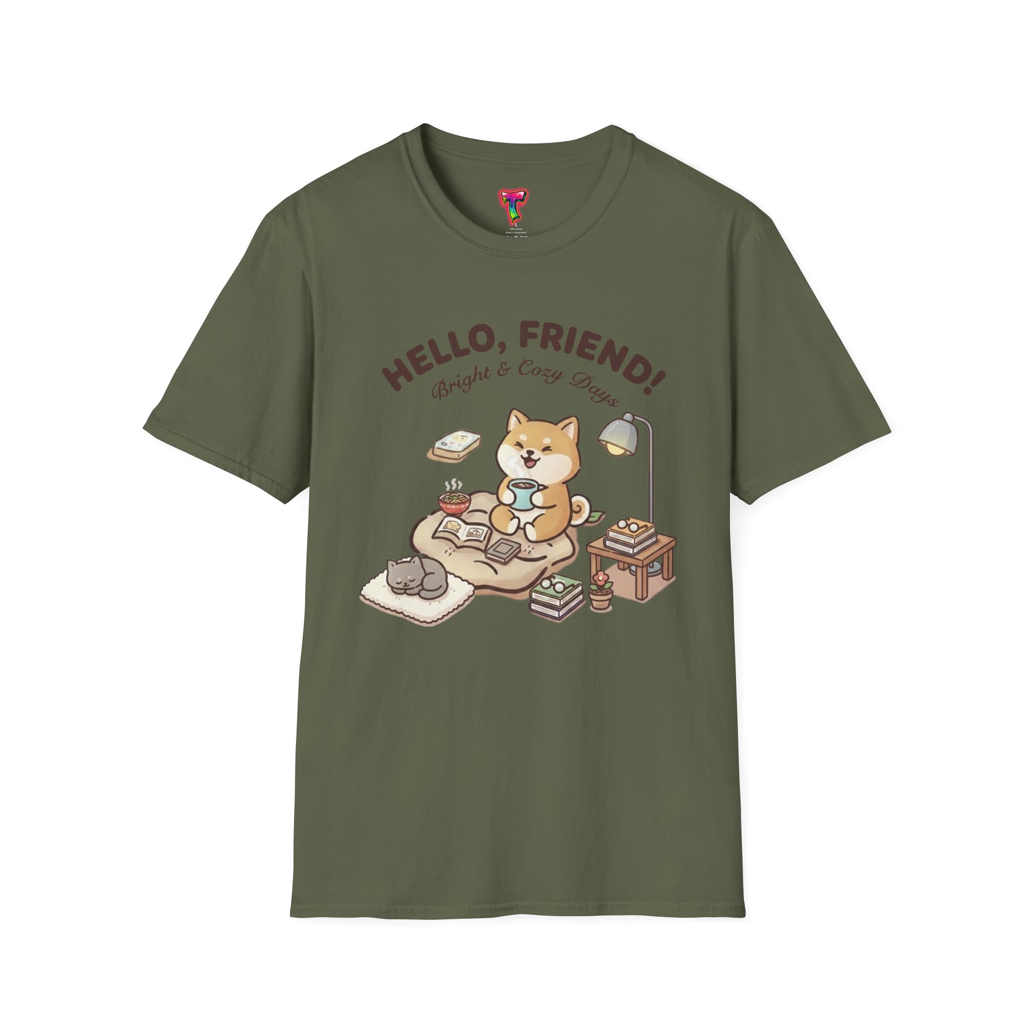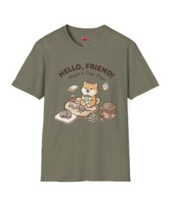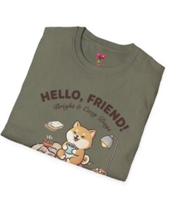 Quiet, cozy, and a little playful — this lightweight cotton tee feels like slipping into your favorite reading nook. A warm olive canvas carries a soft, illustrated scene: a content Shiba curled up with a mug, books stacked close, slippers kicked off. Short, rounded lines and muted earth tones make the design comforting rather than loud. Wear it for slow mornings, library runs, or low-key hangouts; it layers easily under jackets and won’t overpower the rest of your outfit. The smooth, ring-spun cotton keeps the print vivid and comfortable against skin, while the tear-away label and ribbed collar keep things fuss-free. It’s the kind of shirt that settles into your routine and makes quiet days feel deliberate.