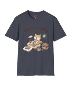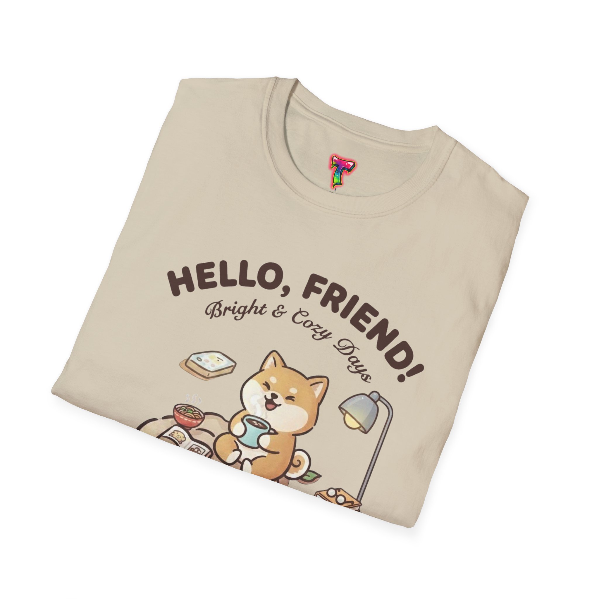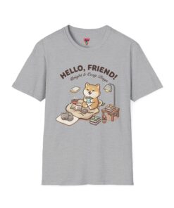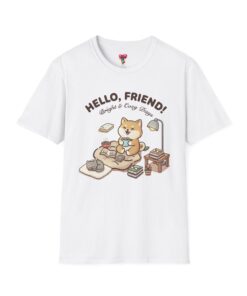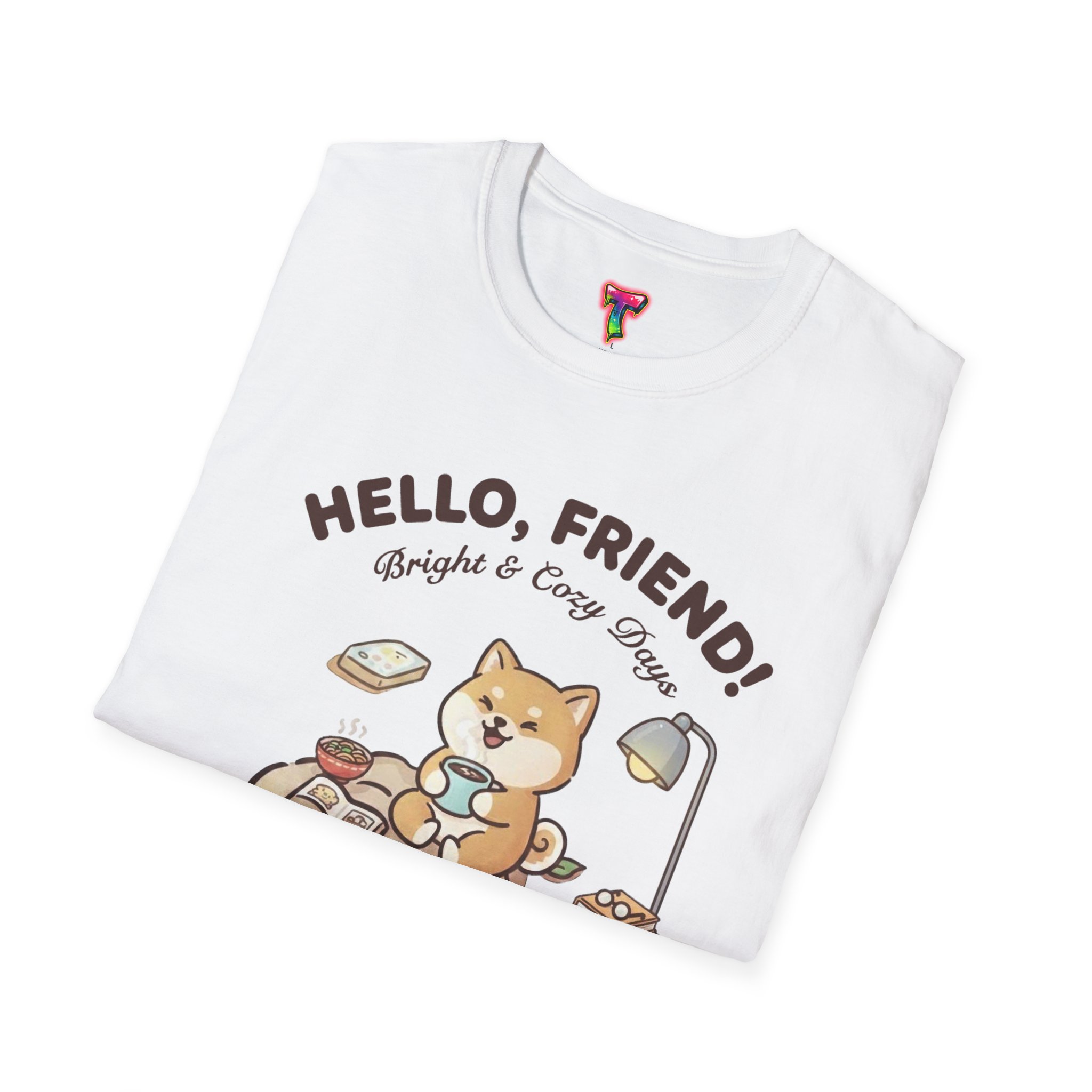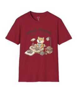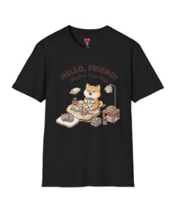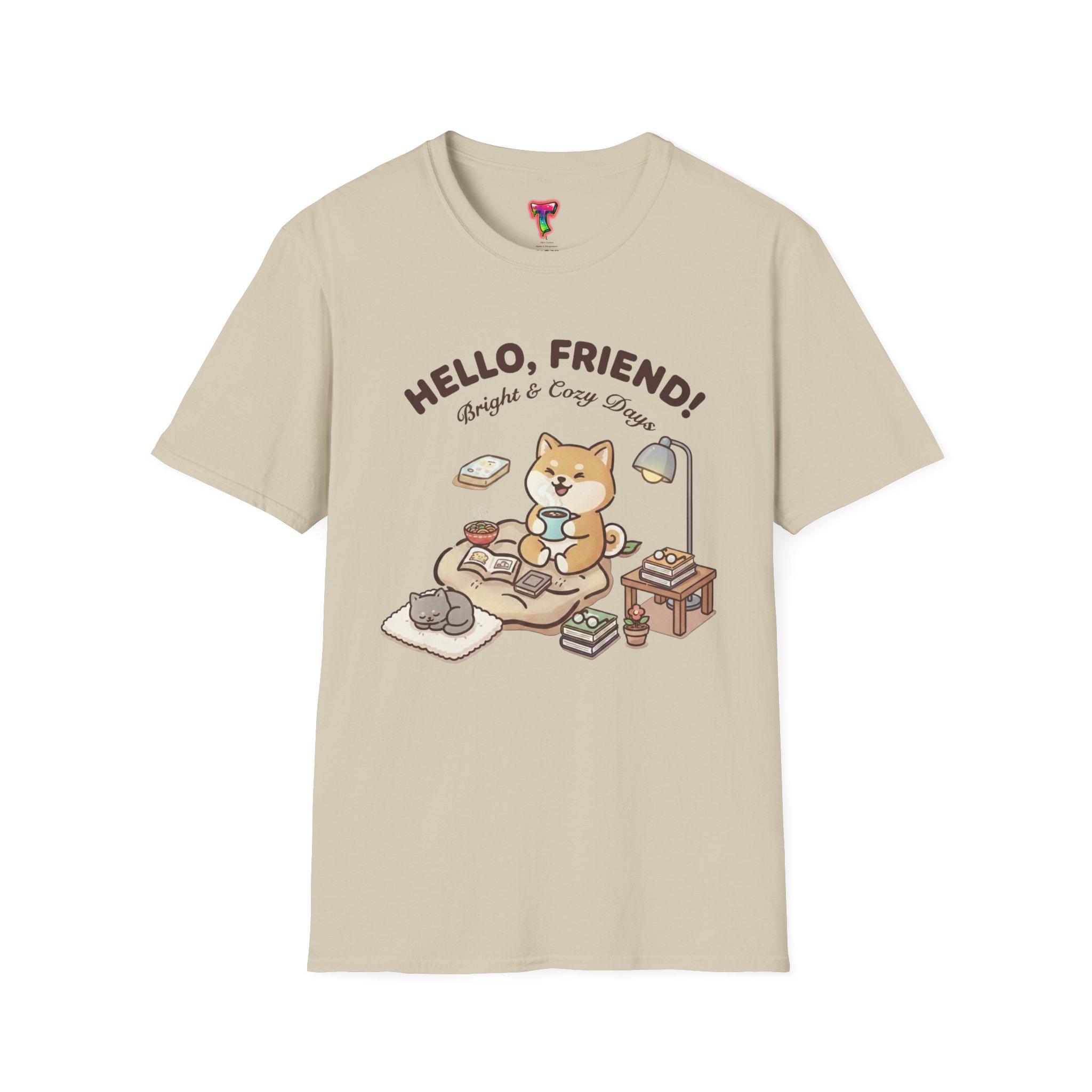 Quiet, cozy, and a little playful — this lightweight cotton tee feels like slipping into your favorite reading nook. A warm olive canvas carries a soft, illustrated scene: a content Shiba curled up with a mug, books stacked close, slippers kicked off. Short, rounded lines and muted earth tones make the design comforting rather than loud. Wear it for slow mornings, library runs, or low-key hangouts; it layers easily under jackets and won’t overpower the rest of your outfit. The smooth, ring-spun cotton keeps the print vivid and comfortable against skin, while the tear-away label and ribbed collar keep things fuss-free. It’s the kind of shirt that settles into your routine and makes quiet days feel deliberate.