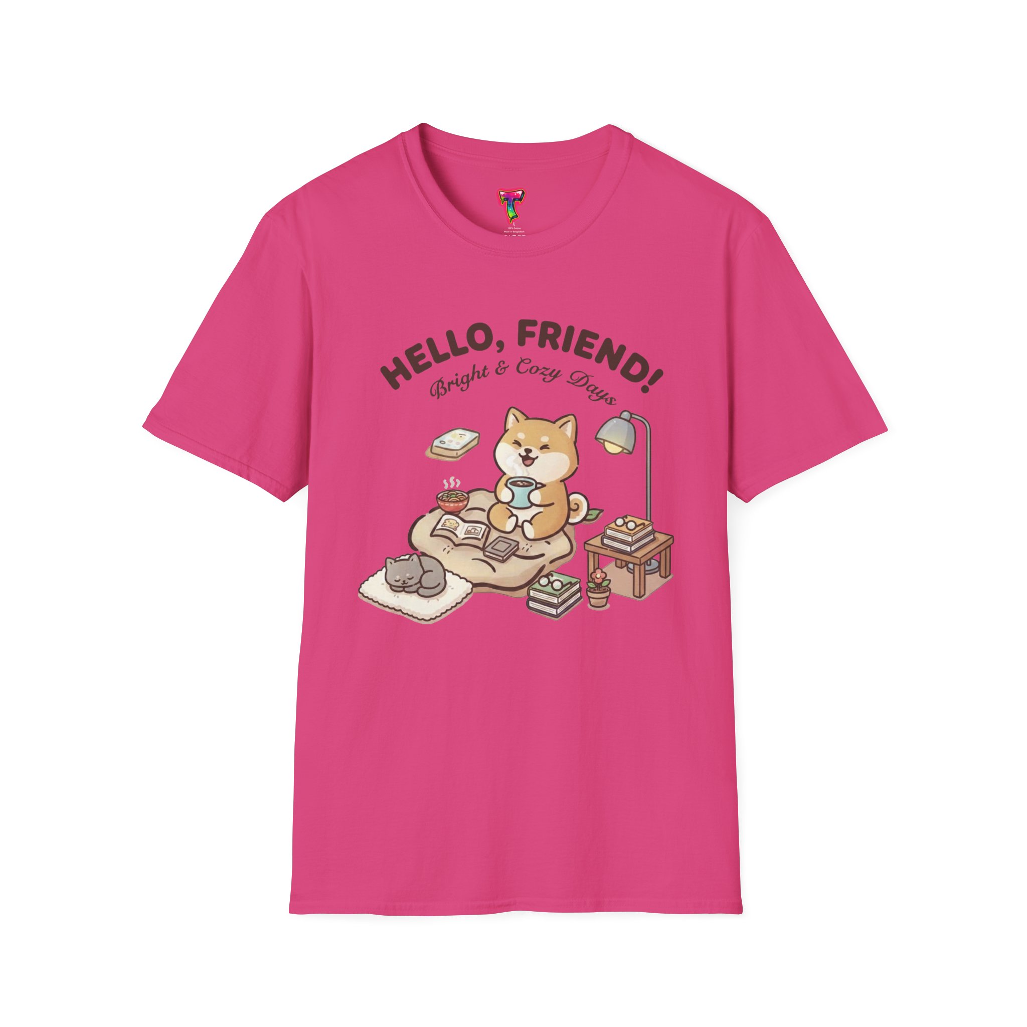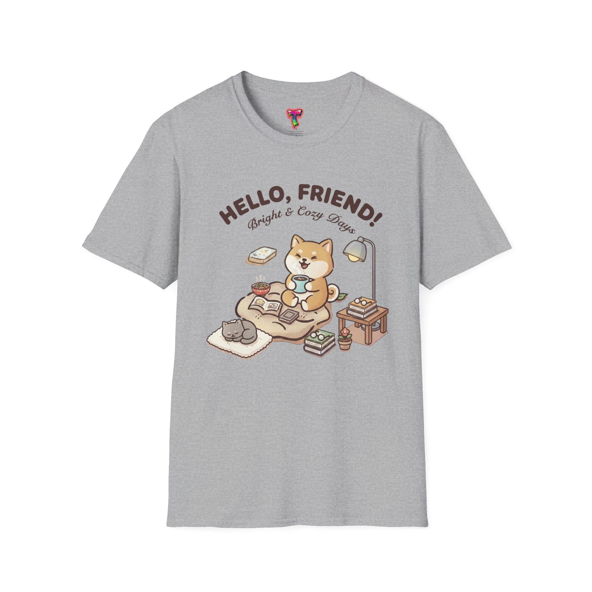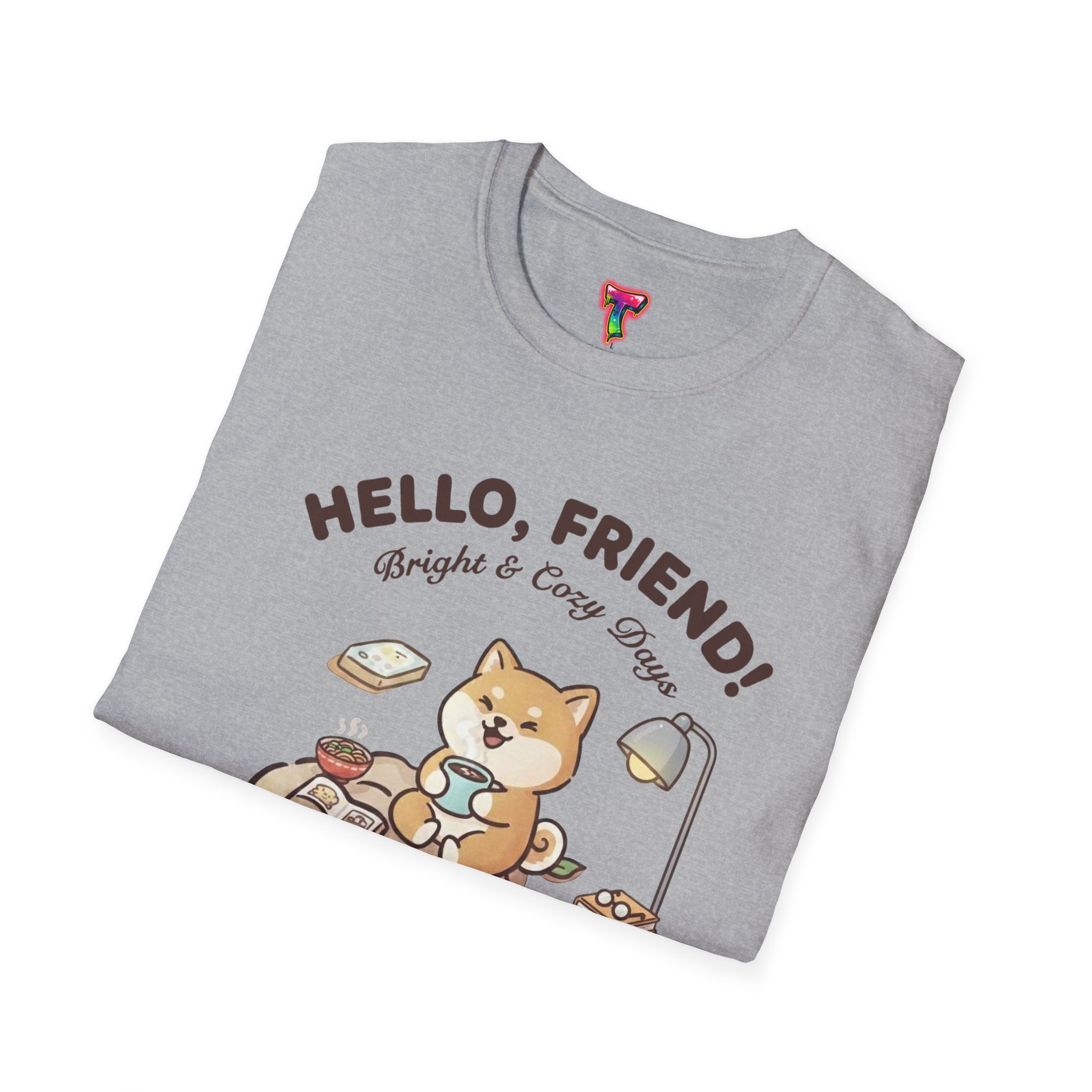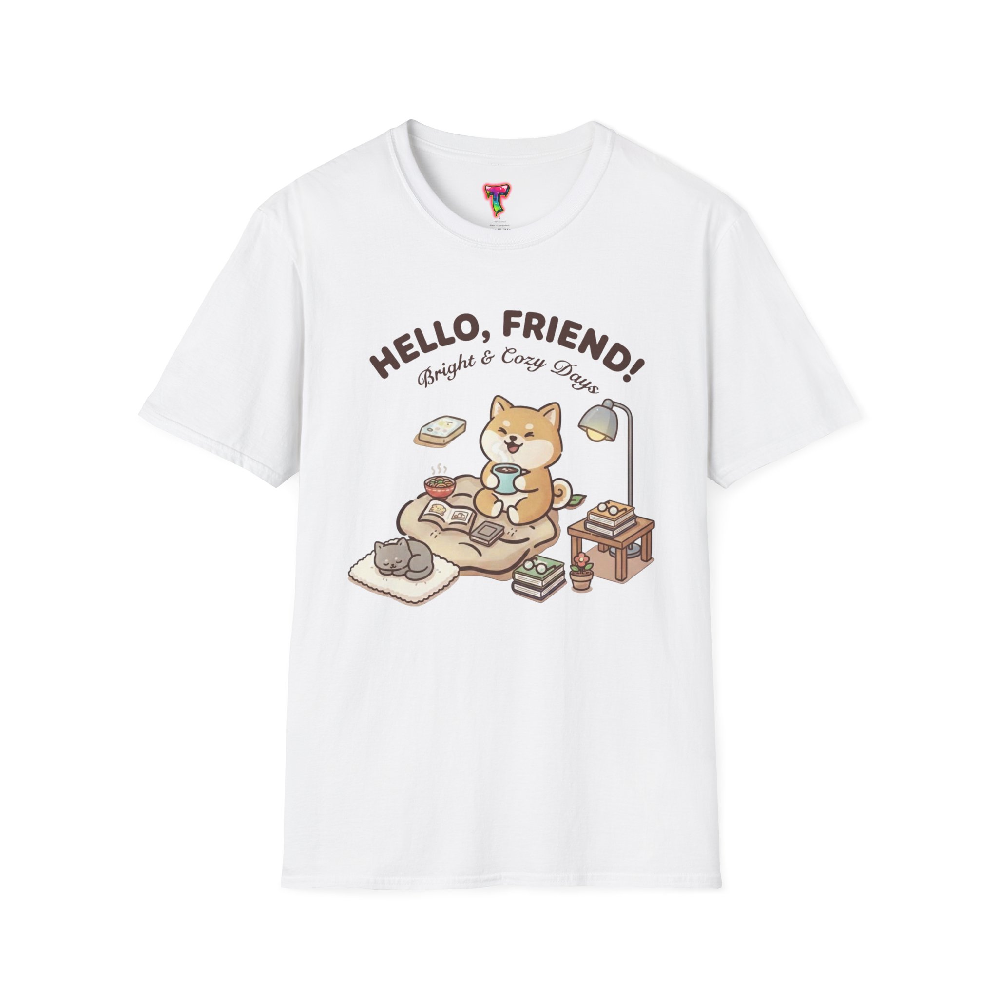 Quiet, cozy, and a little playful — this lightweight cotton tee feels like slipping into your favorite reading nook. A warm olive canvas carries a soft, illustrated scene: a content Shiba curled up with a mug, books stacked close, slippers kicked off. Short, rounded lines and muted earth tones make the design comforting rather than loud. Wear it for slow mornings, library runs, or low-key hangouts; it layers easily under jackets and won’t overpower the rest of your outfit. The smooth, ring-spun cotton keeps the print vivid and comfortable against skin, while the tear-away label and ribbed collar keep things fuss-free. It’s the kind of shirt that settles into your routine and makes quiet days feel deliberate.