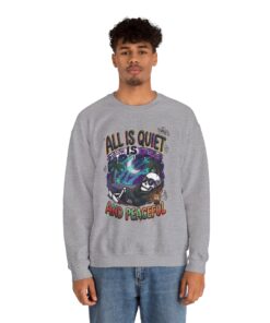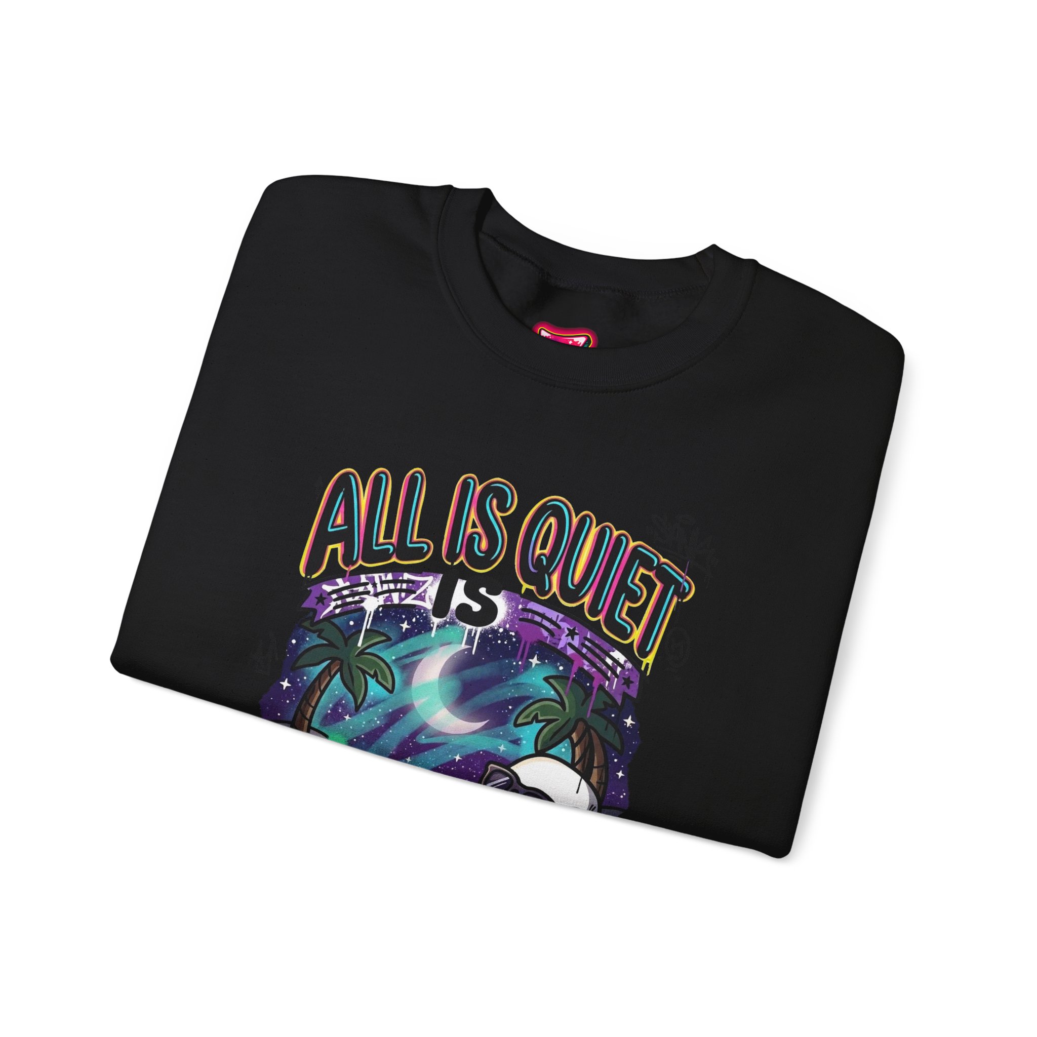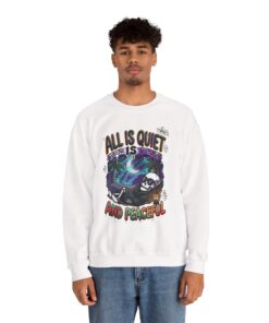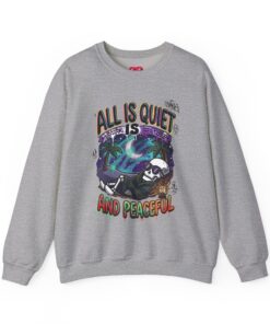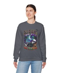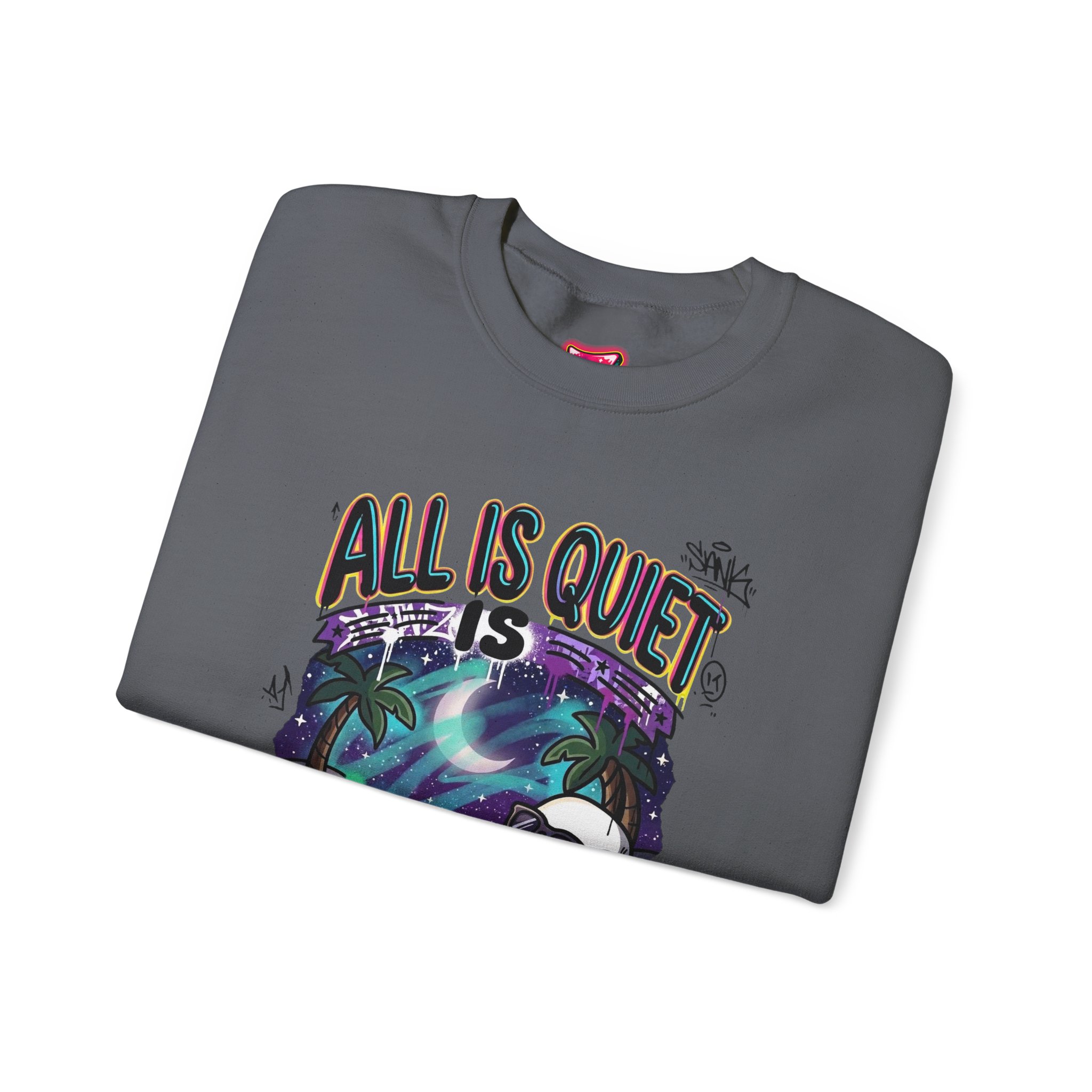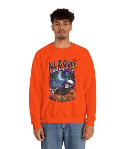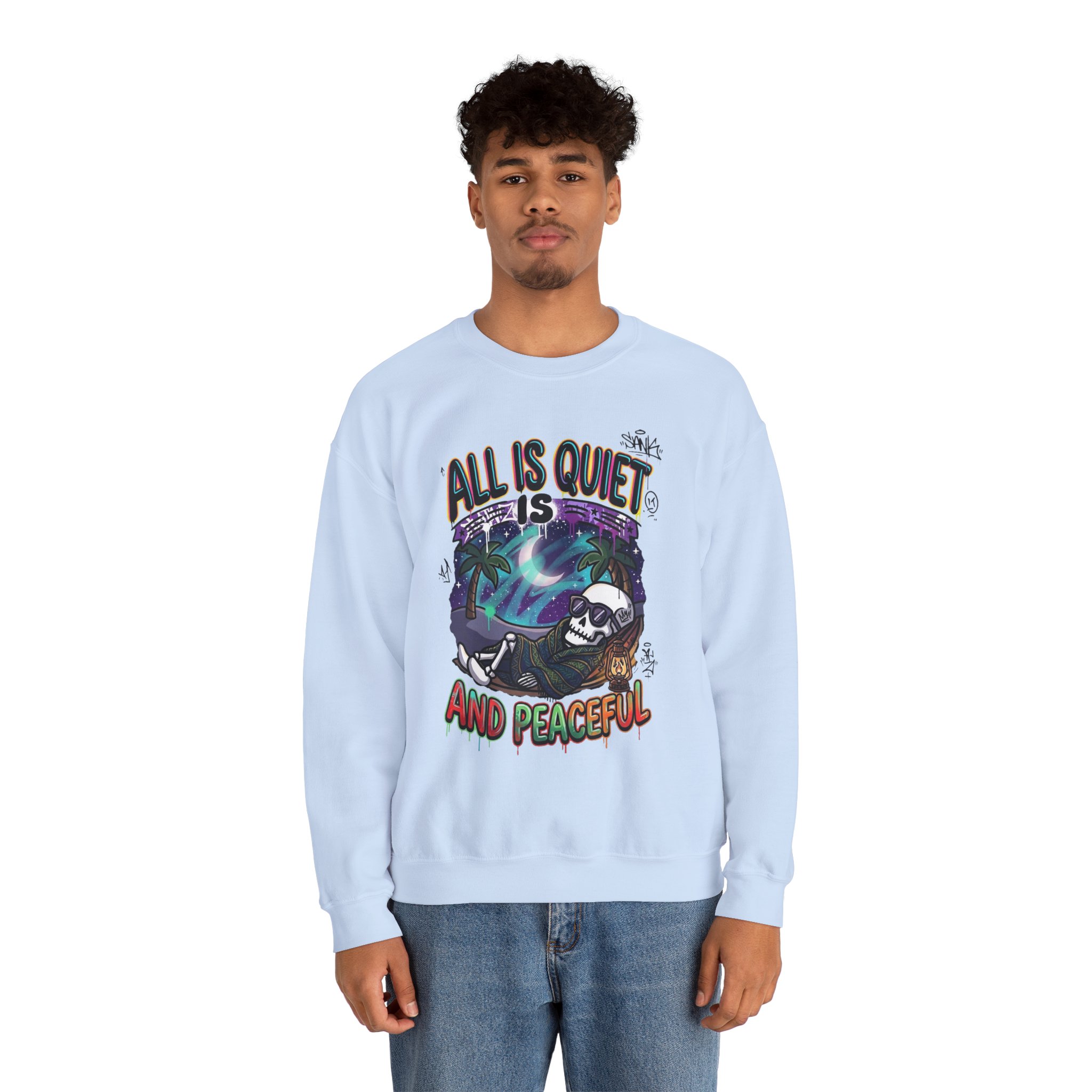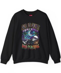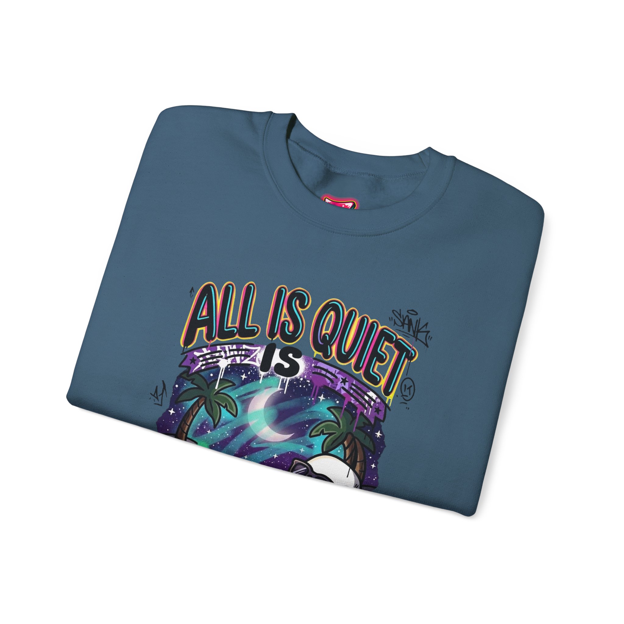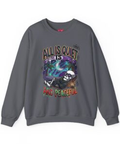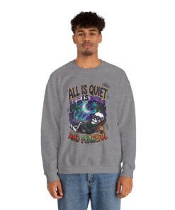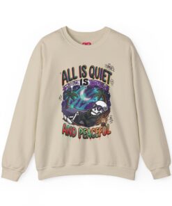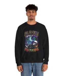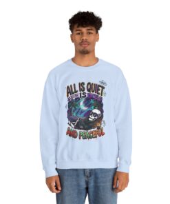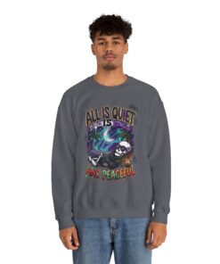 Eye-catching sweatshirt design featuring a mischievous raccoon hiding behind the phrase All Is Quiet and Peaceful. A playful contrast of chaos and calm, combined with graffiti-inspired typography, bold colors, and urban street-art energy. Perfect for animal lovers, streetwear fans, and anyone who enjoys sarcastic humor with standout style. Great for casual wear, gifts, and cozy fashion collections.