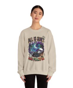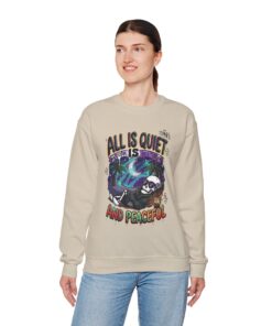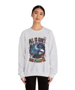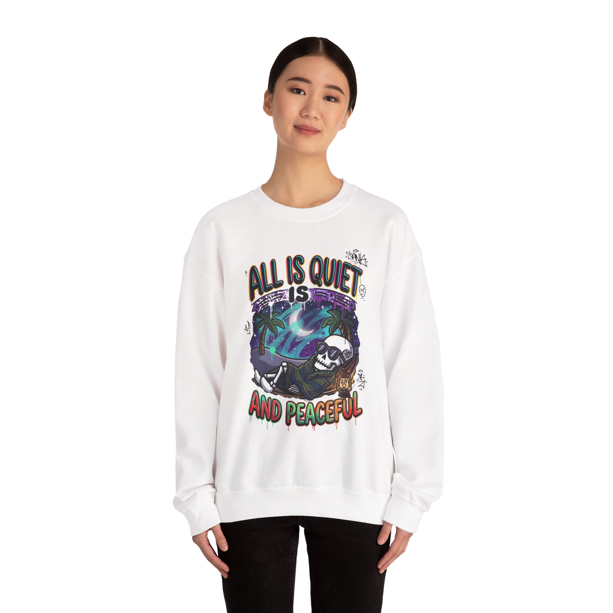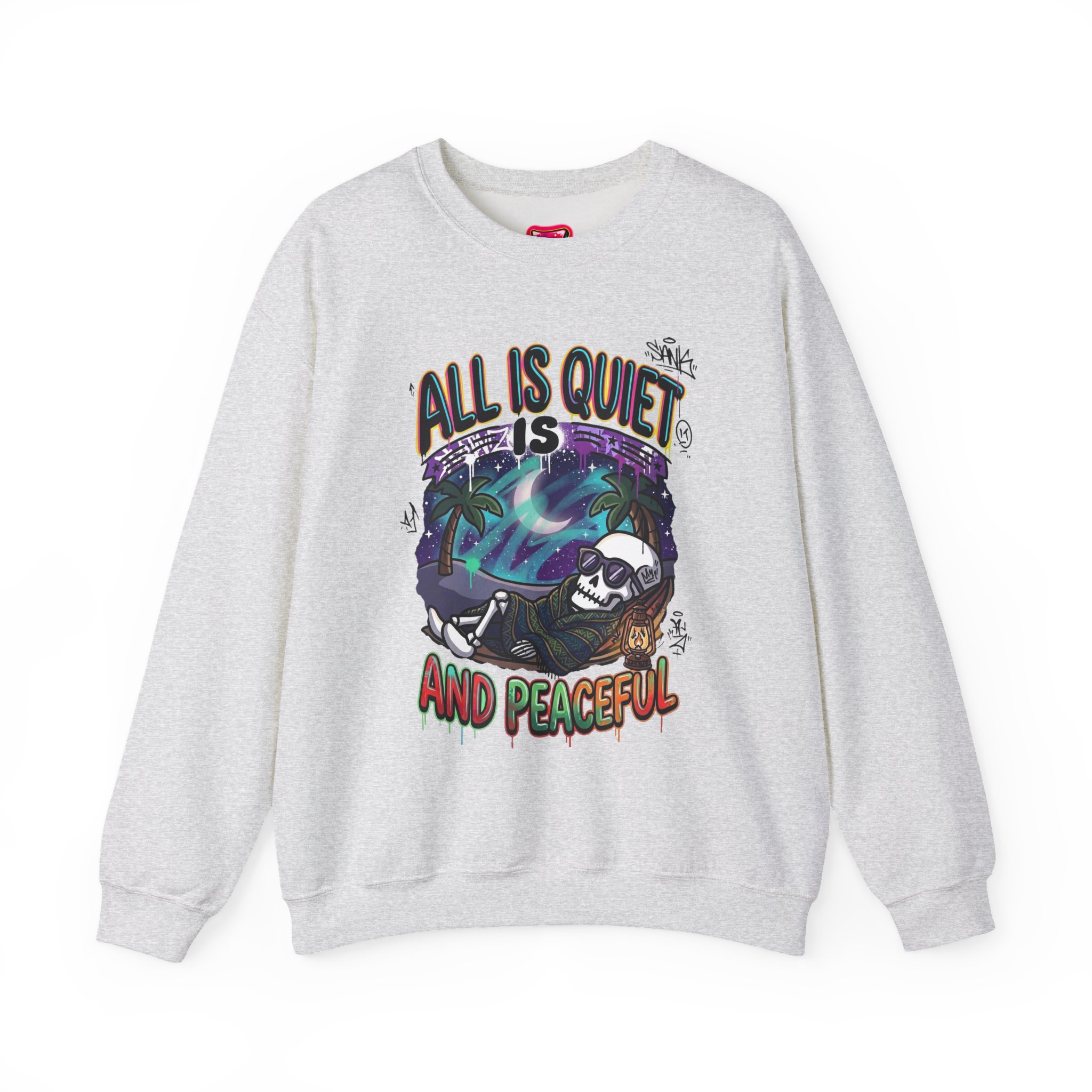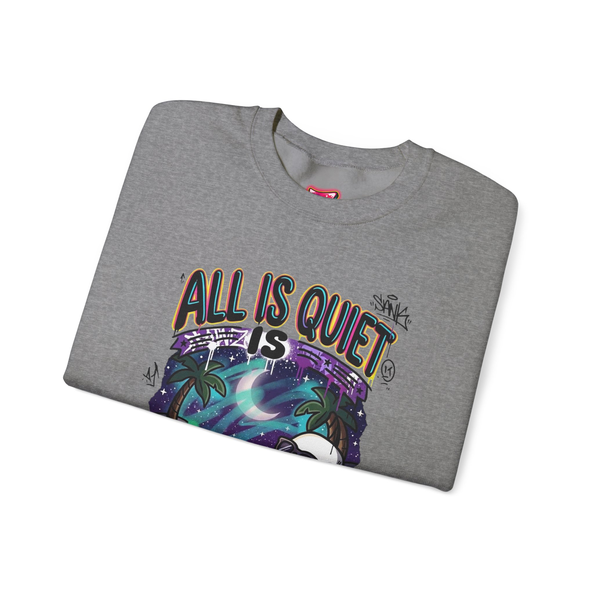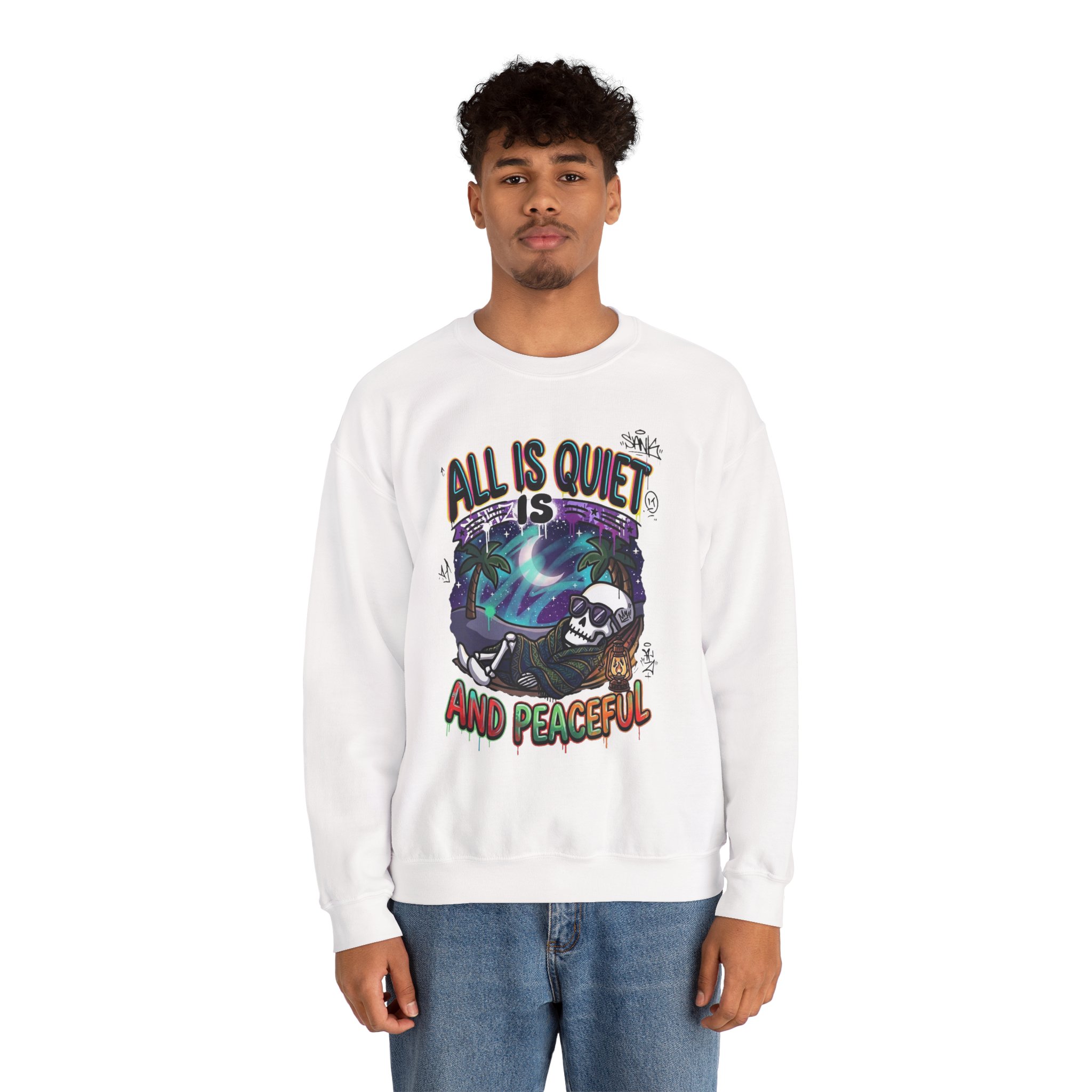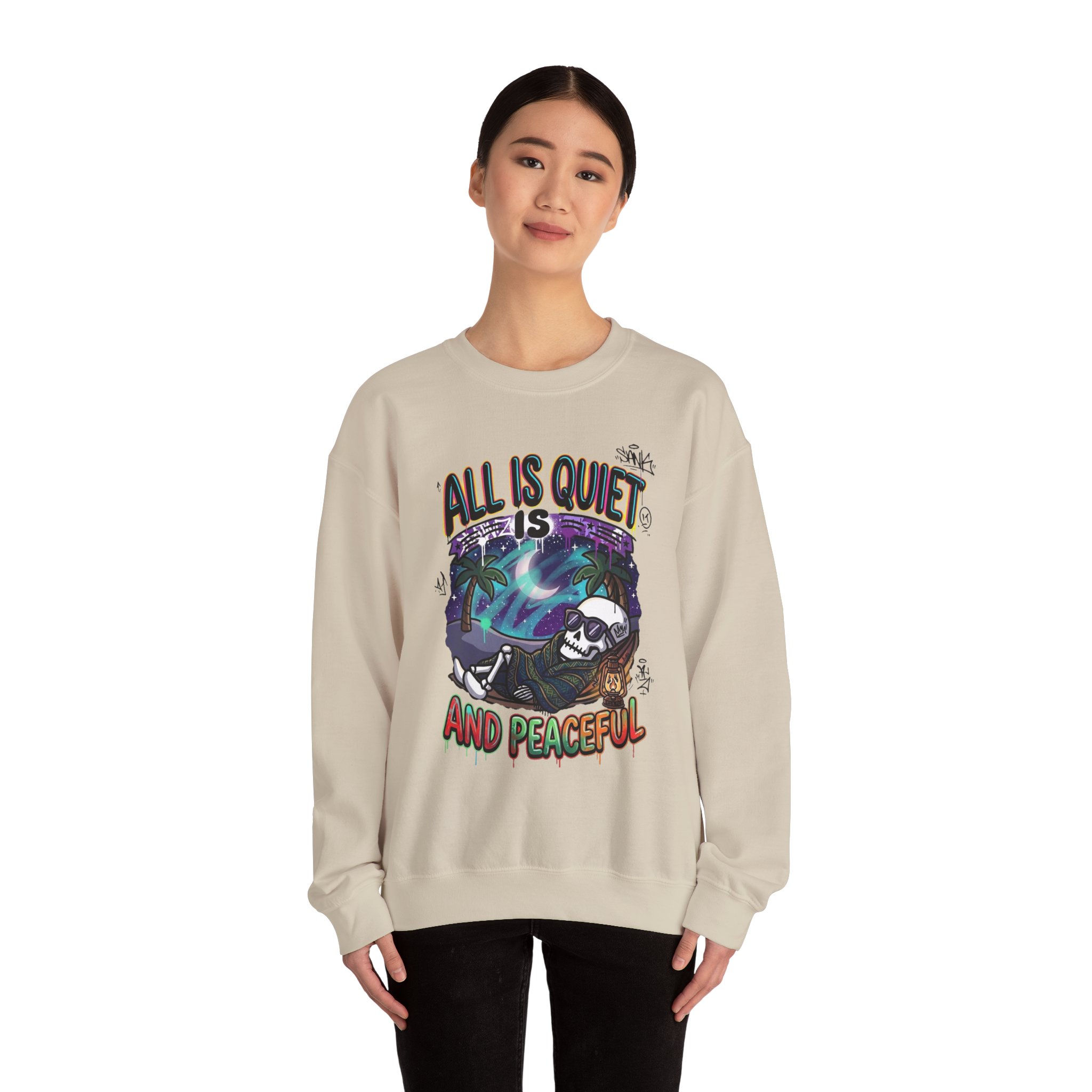Eye-catching sweatshirt design featuring a mischievous raccoon hiding behind the phrase All Is Quiet and Peaceful. A playful contrast of chaos and calm, combined with graffiti-inspired typography, bold colors, and urban street-art energy. Perfect for animal lovers, streetwear fans, and anyone who enjoys sarcastic humor with standout style. Great for casual wear, gifts, and cozy fashion collections.