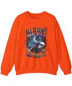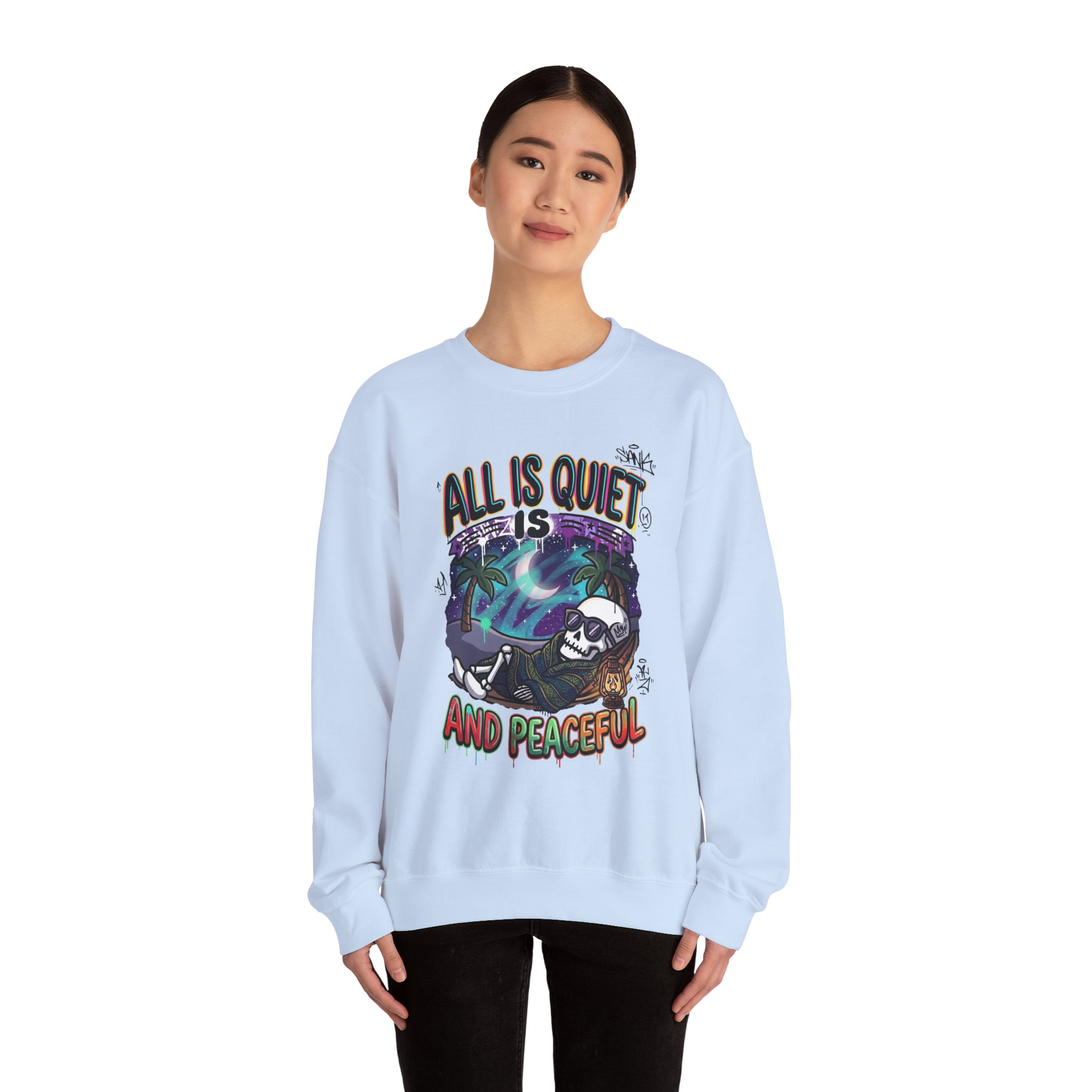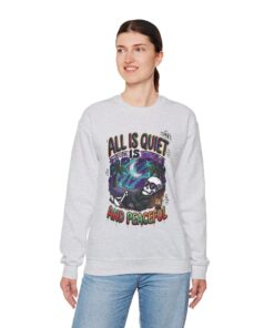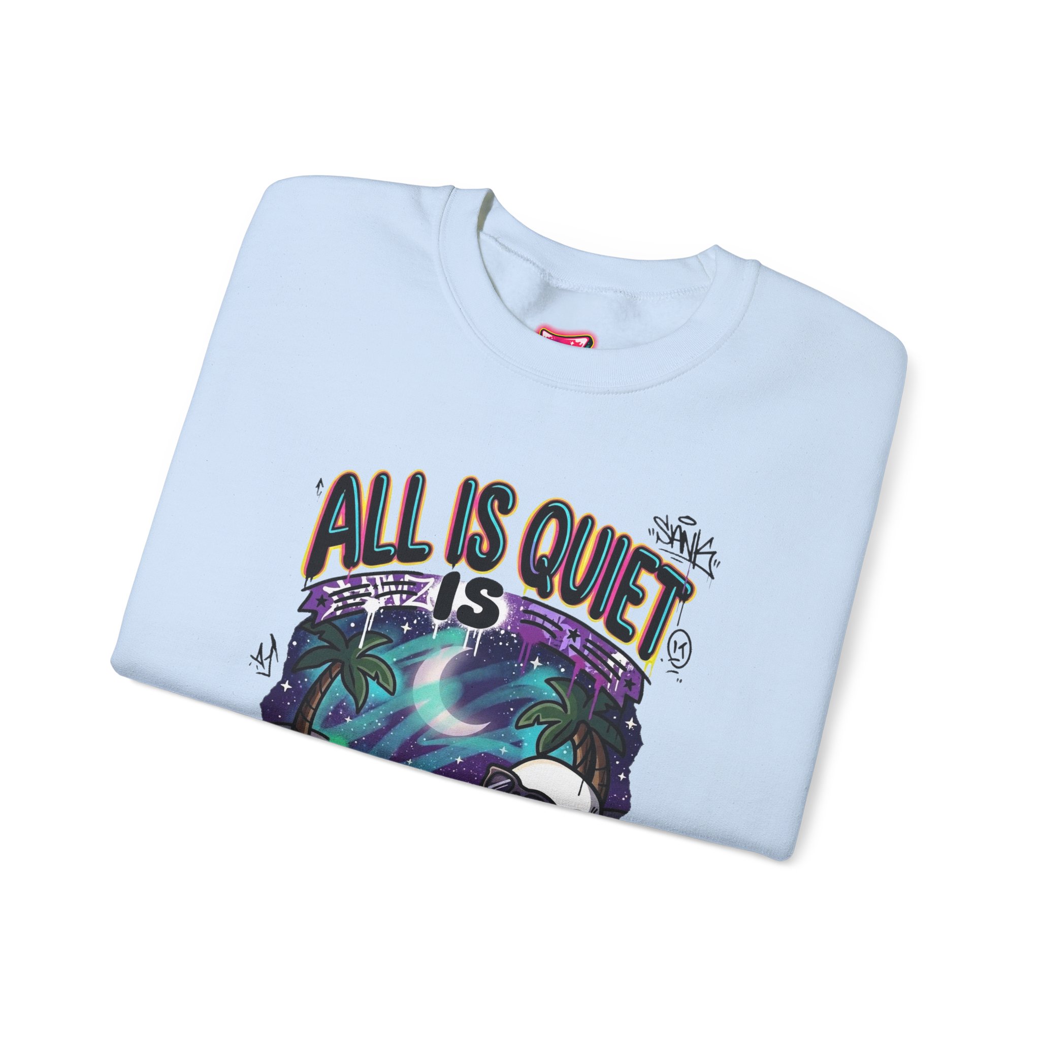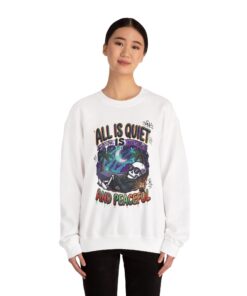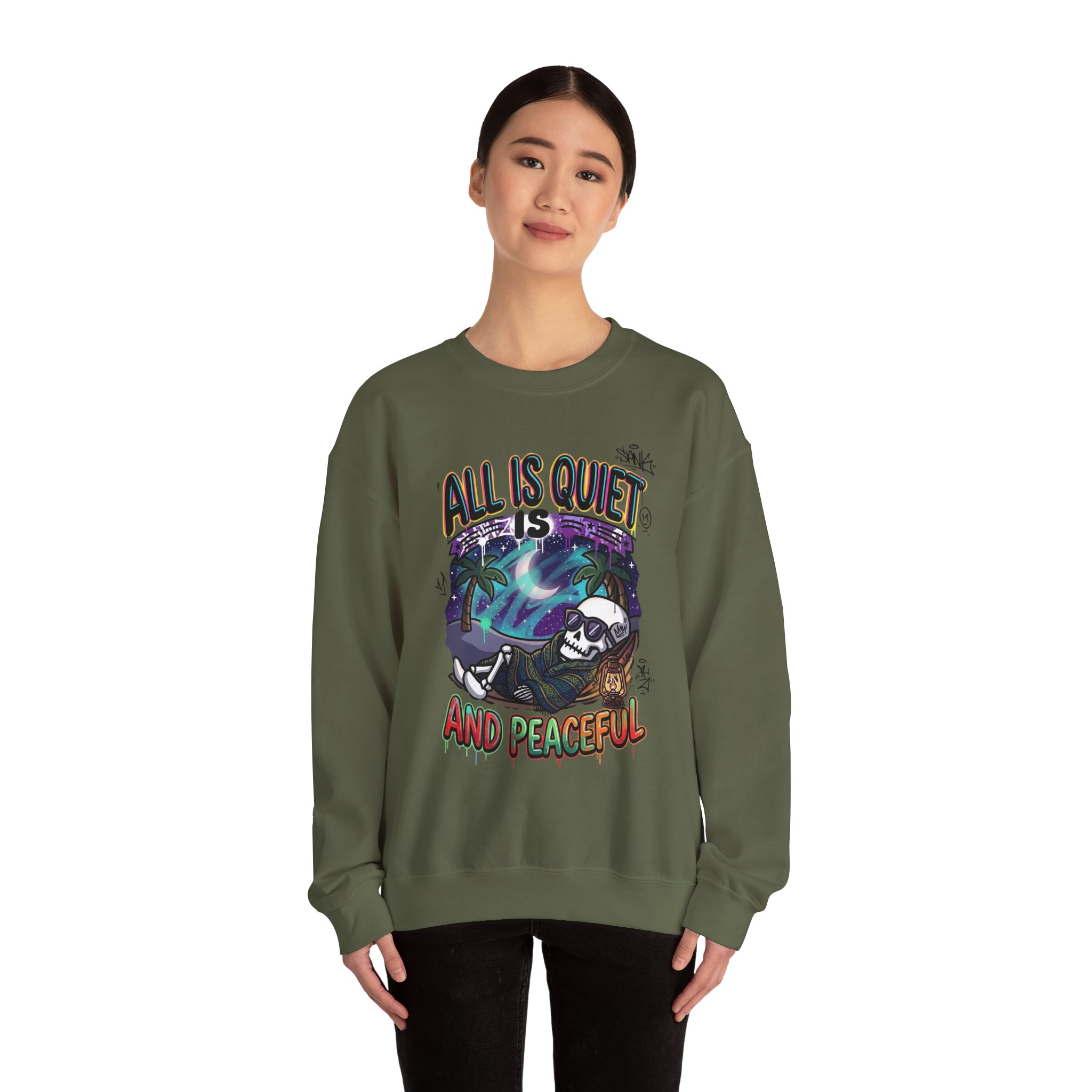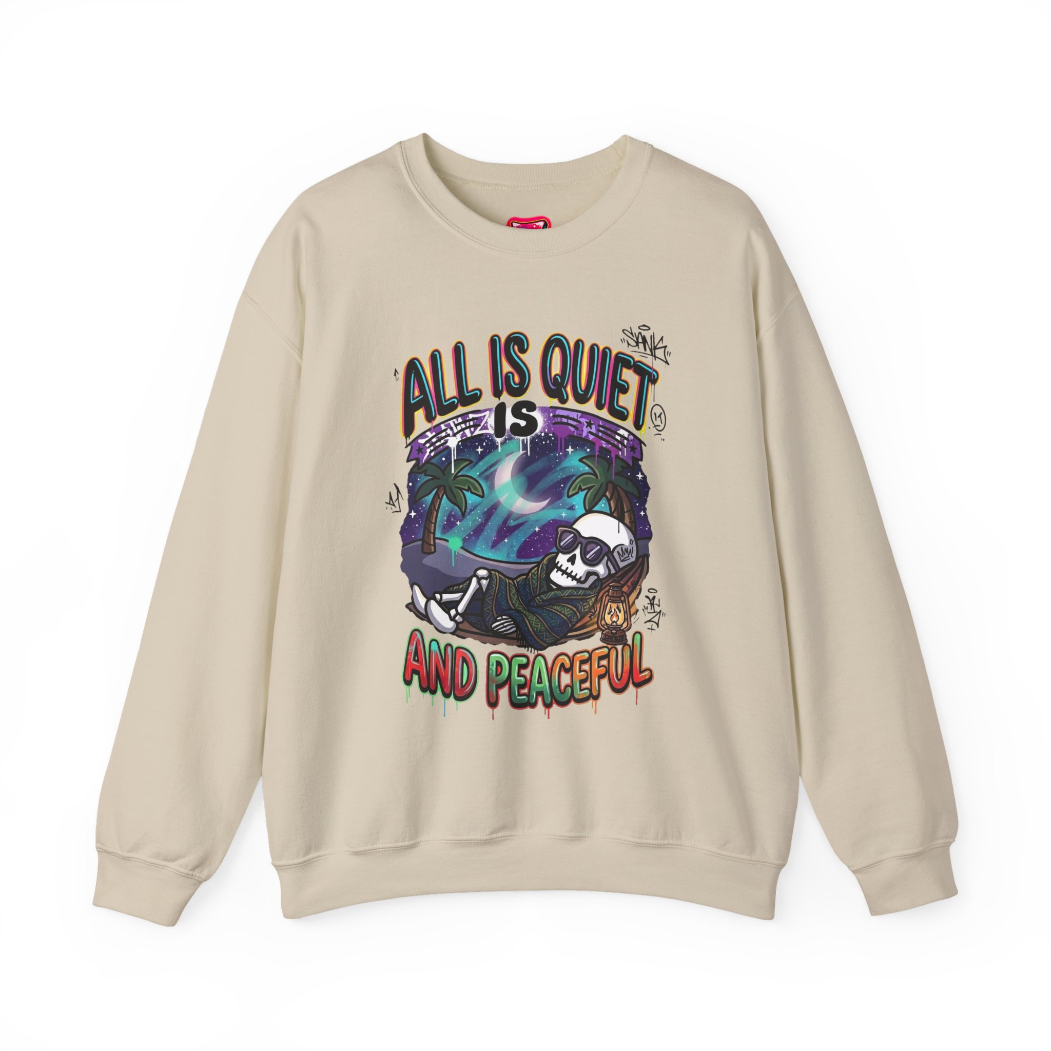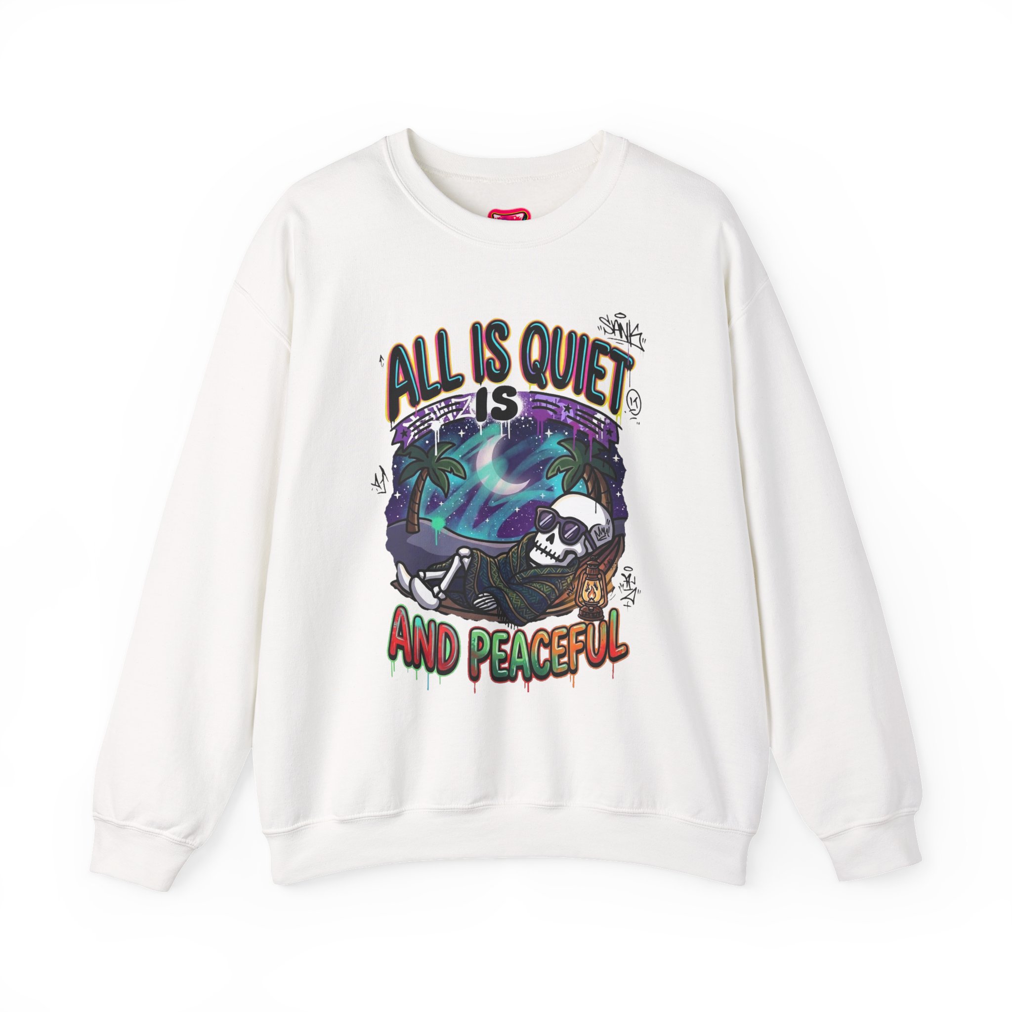 Eye-catching sweatshirt design featuring a mischievous raccoon hiding behind the phrase All Is Quiet and Peaceful. A playful contrast of chaos and calm, combined with graffiti-inspired typography, bold colors, and urban street-art energy. Perfect for animal lovers, streetwear fans, and anyone who enjoys sarcastic humor with standout style. Great for casual wear, gifts, and cozy fashion collections.